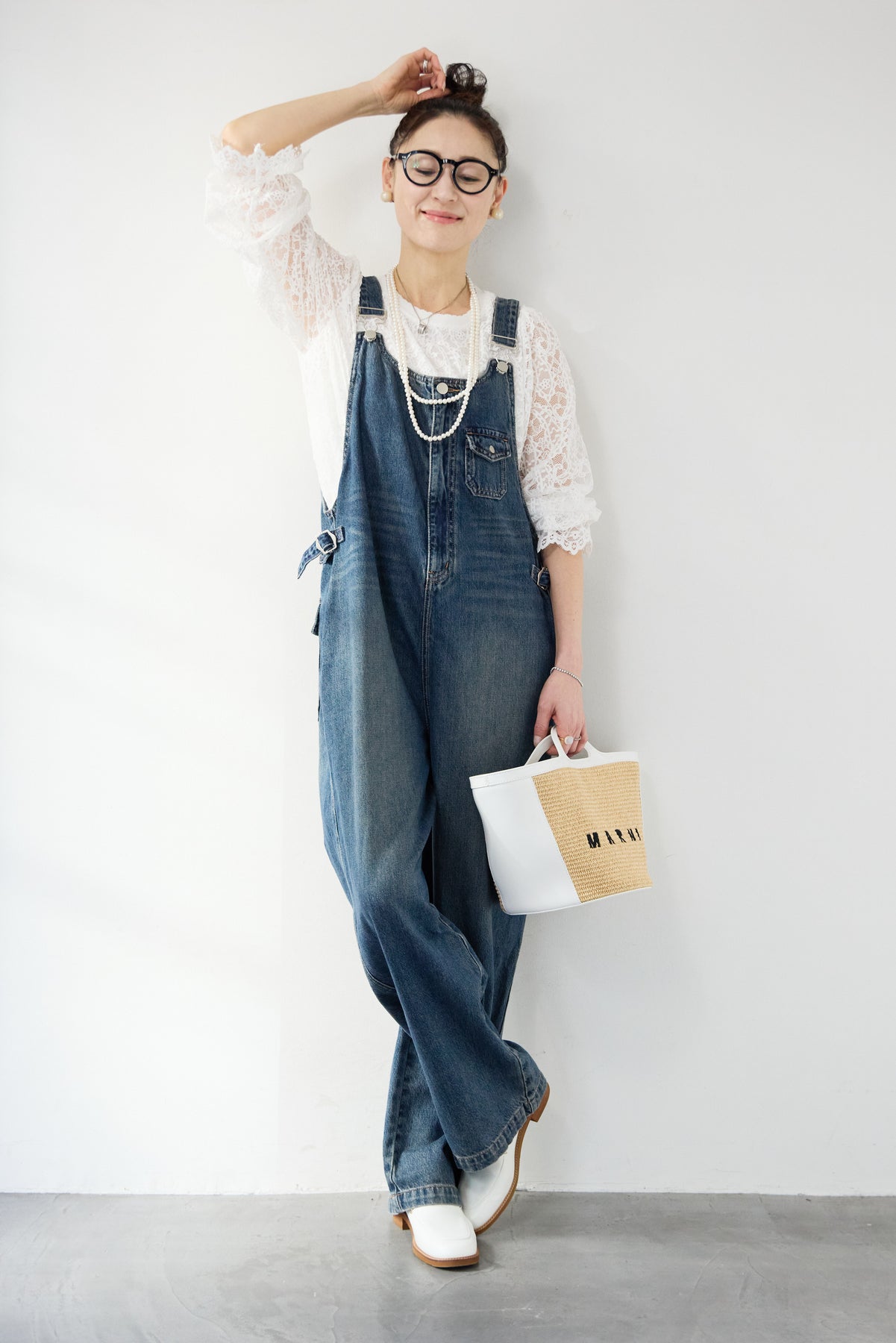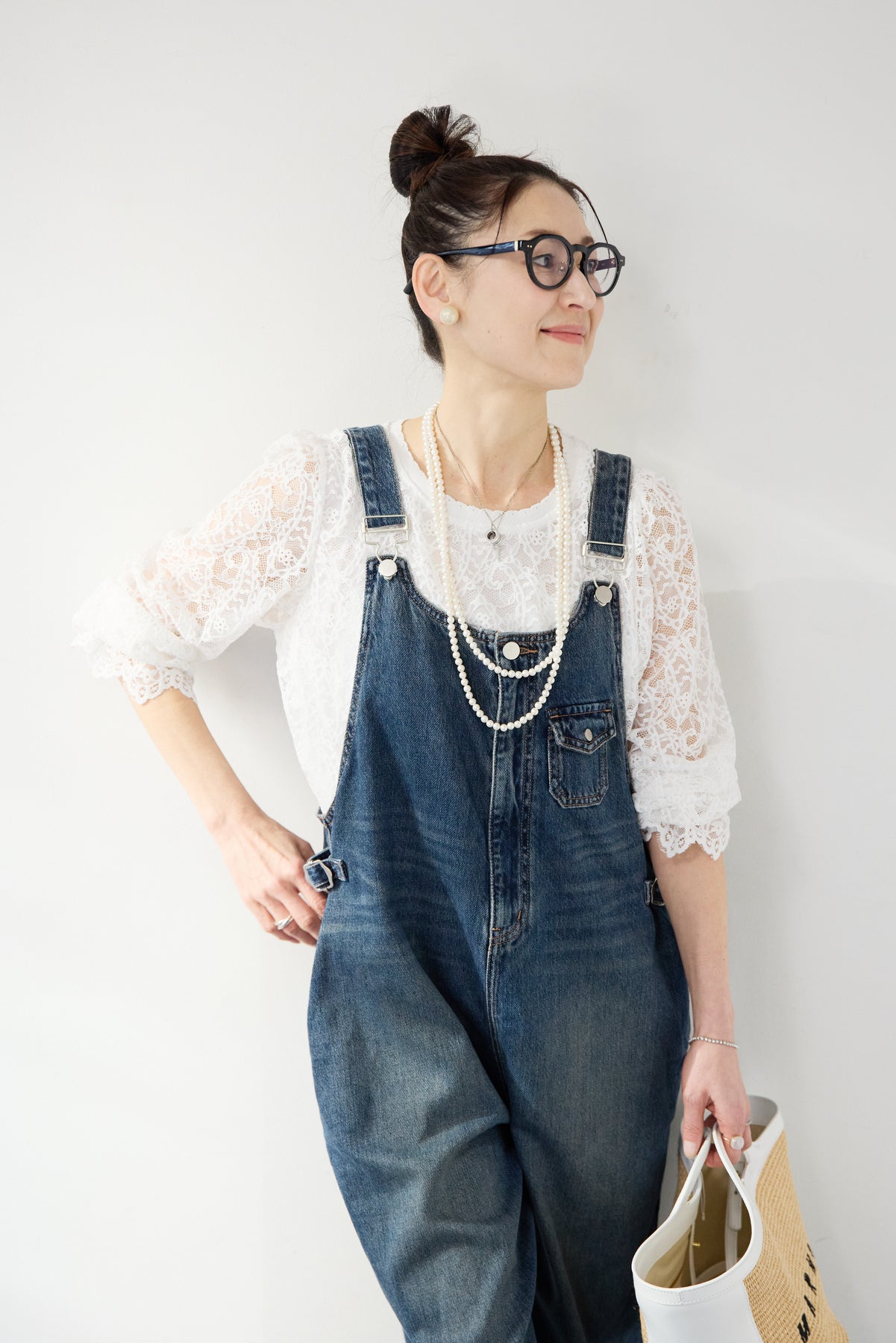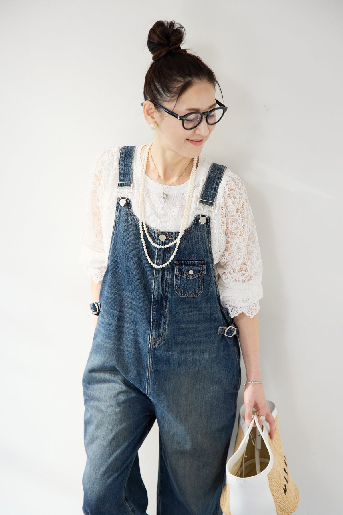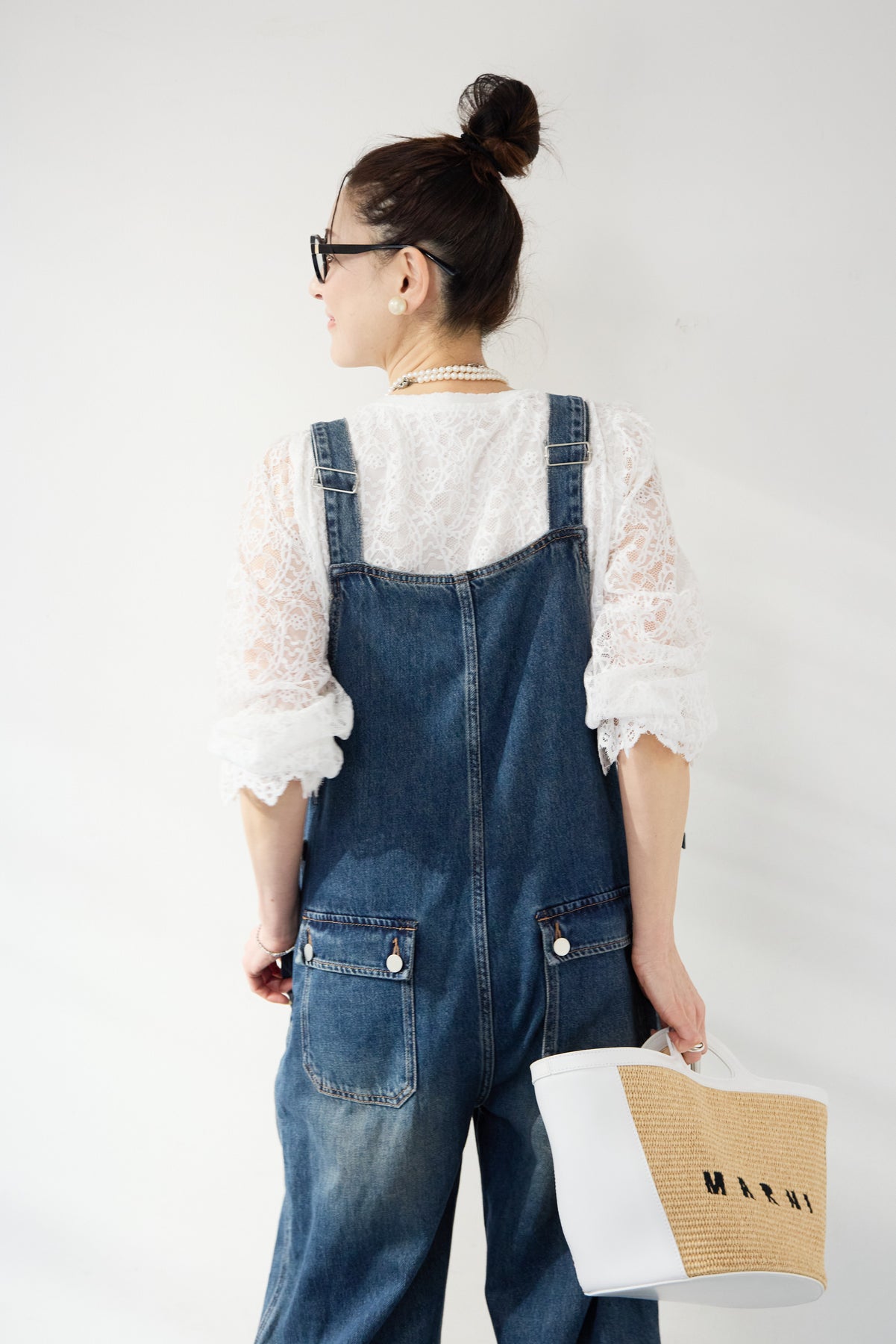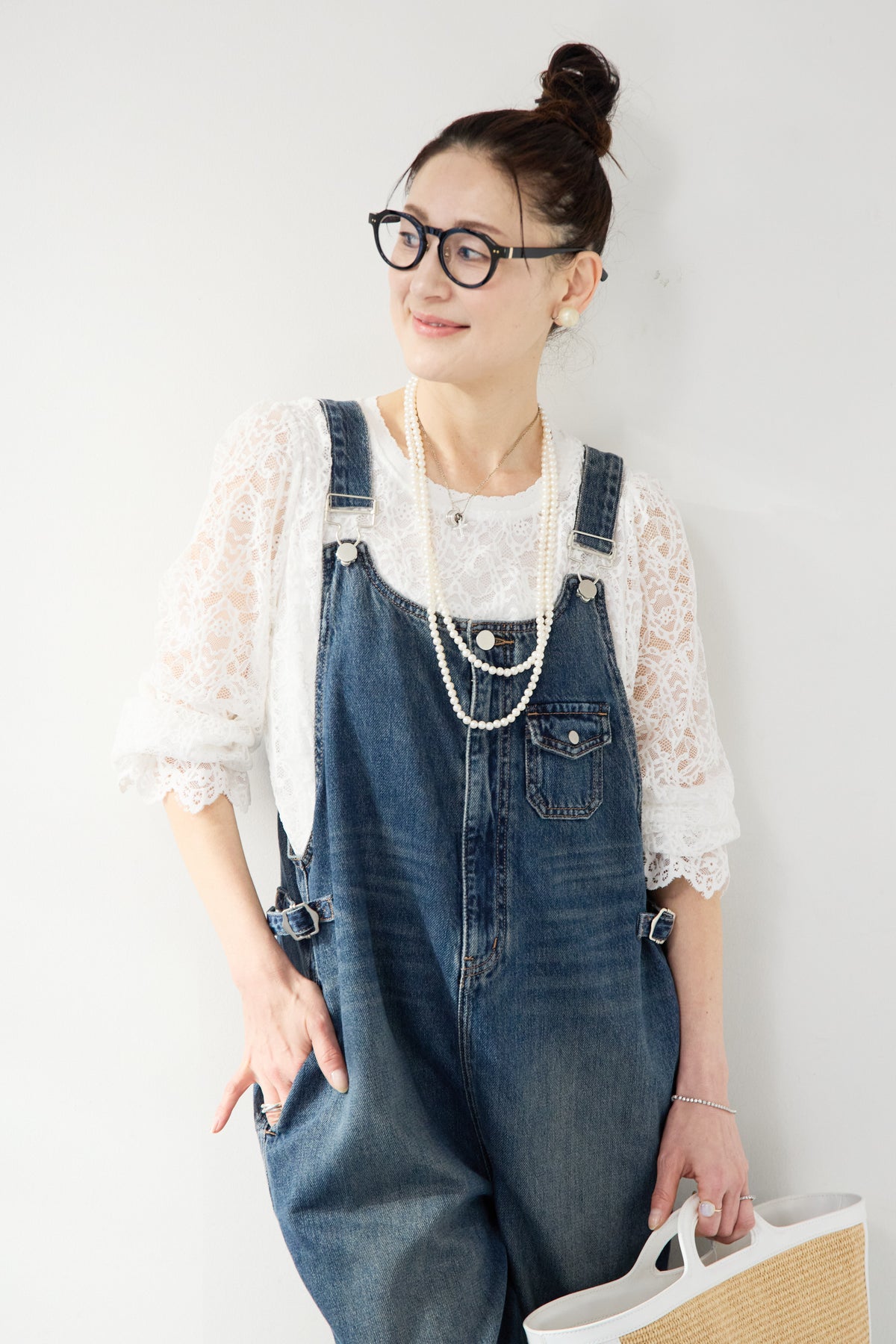 [SET]スカラップヘム レースシアーブラウス+ワークテイストデニムオールインワン(2set)