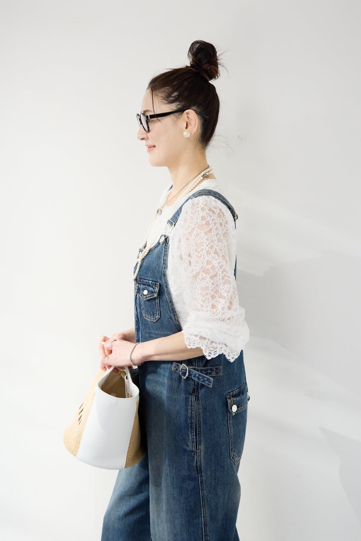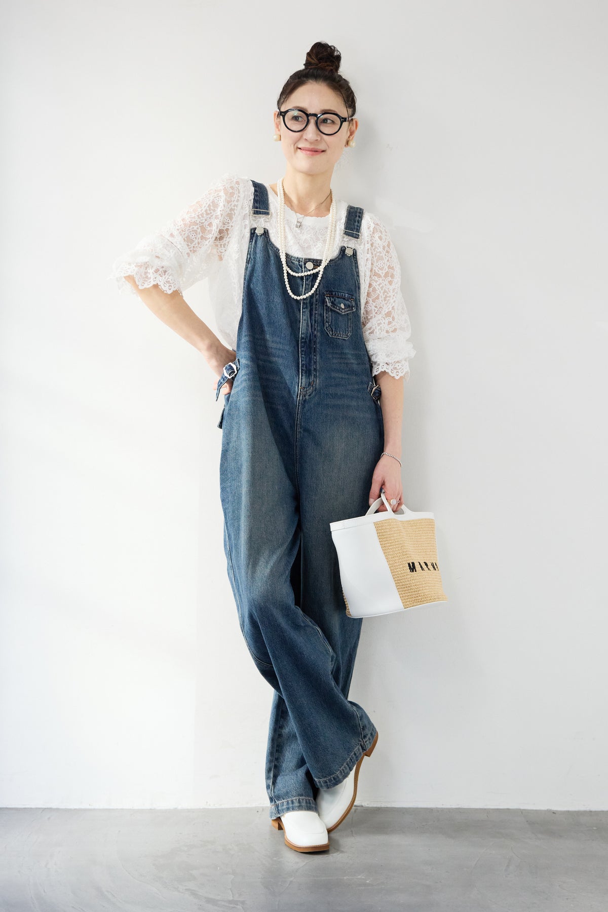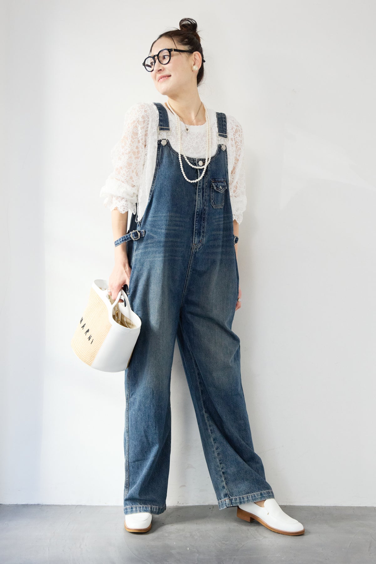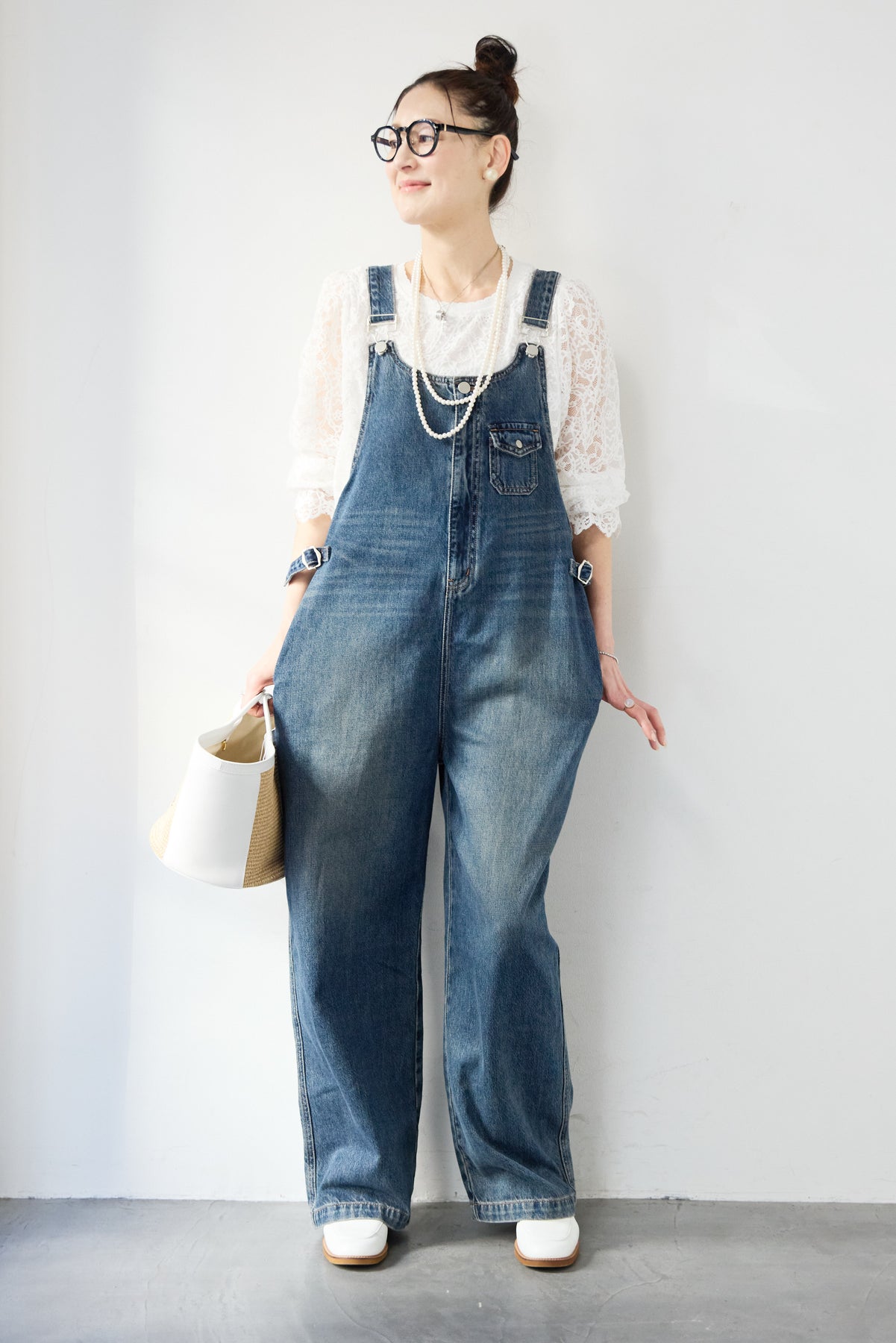 [SET]スカラップヘム レースシアーブラウス+ワークテイストデニムオールインワン(2set)