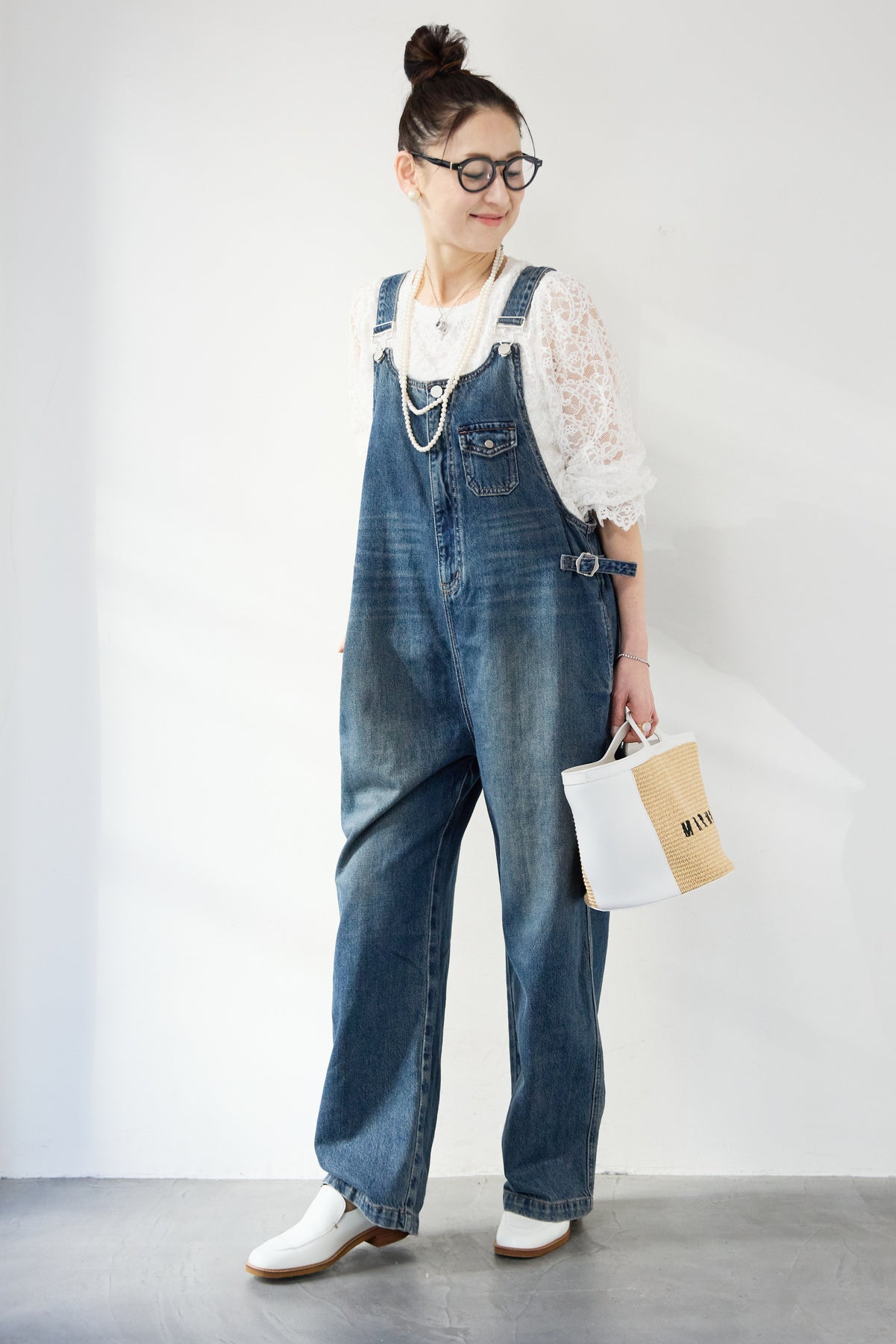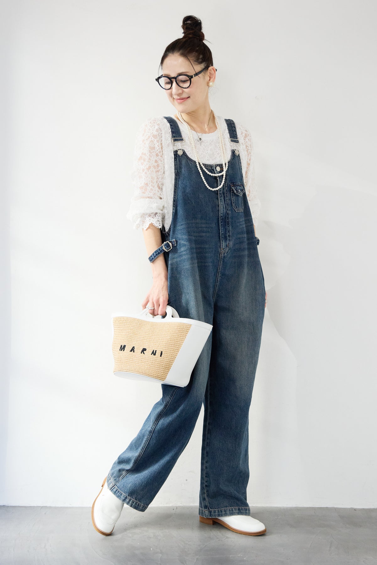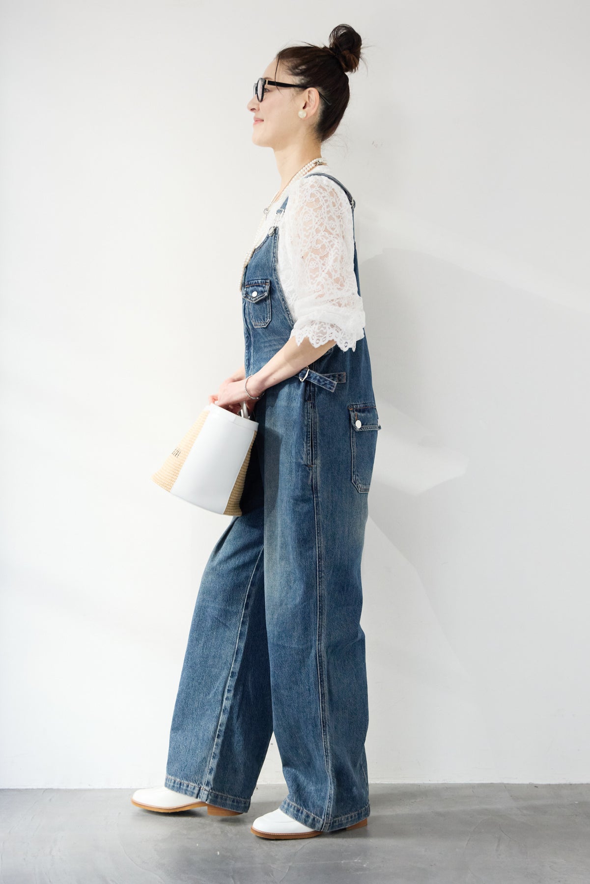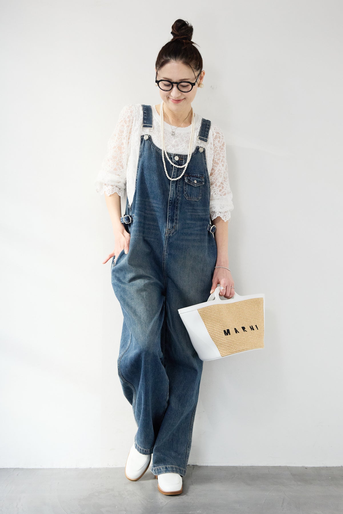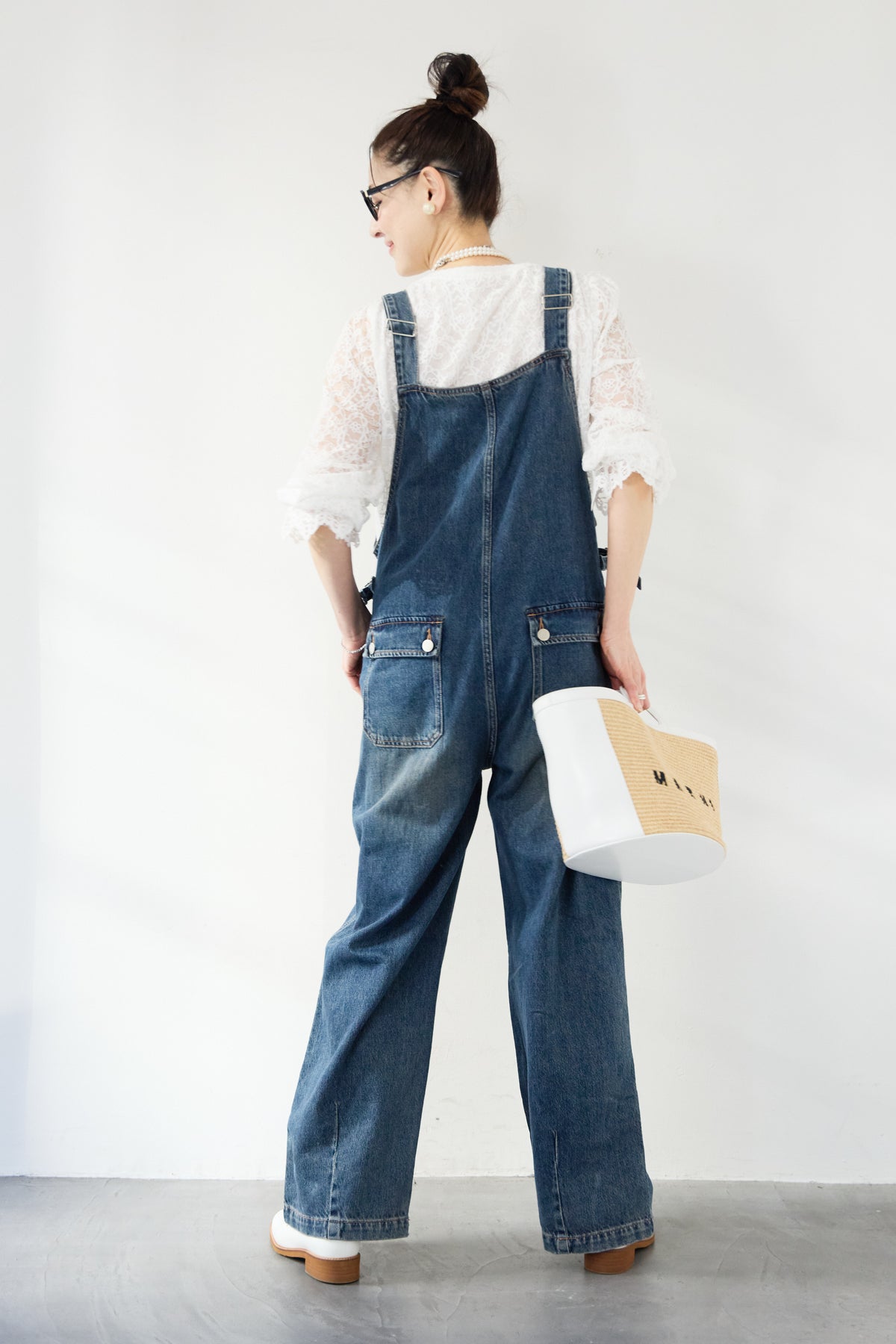 [SET]スカラップヘム レースシアーブラウス+ワークテイストデニムオールインワン(2set)