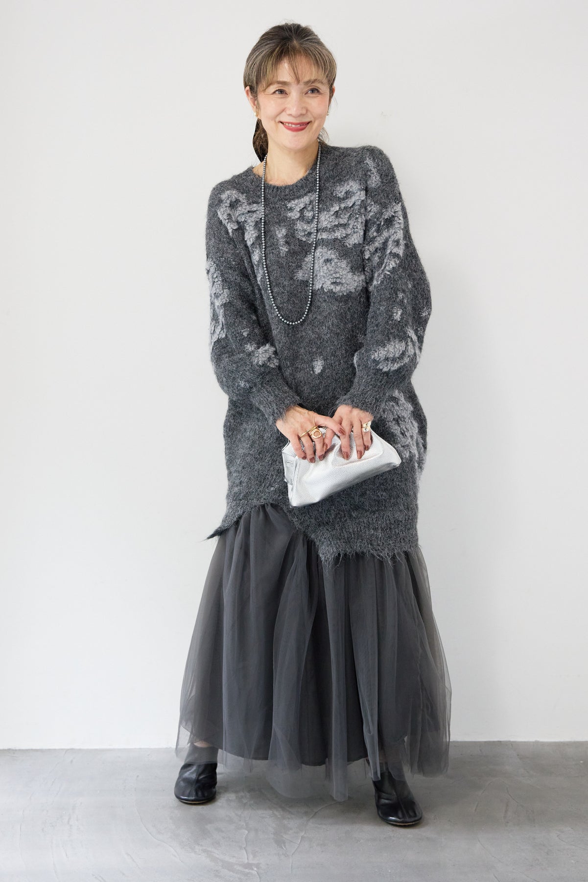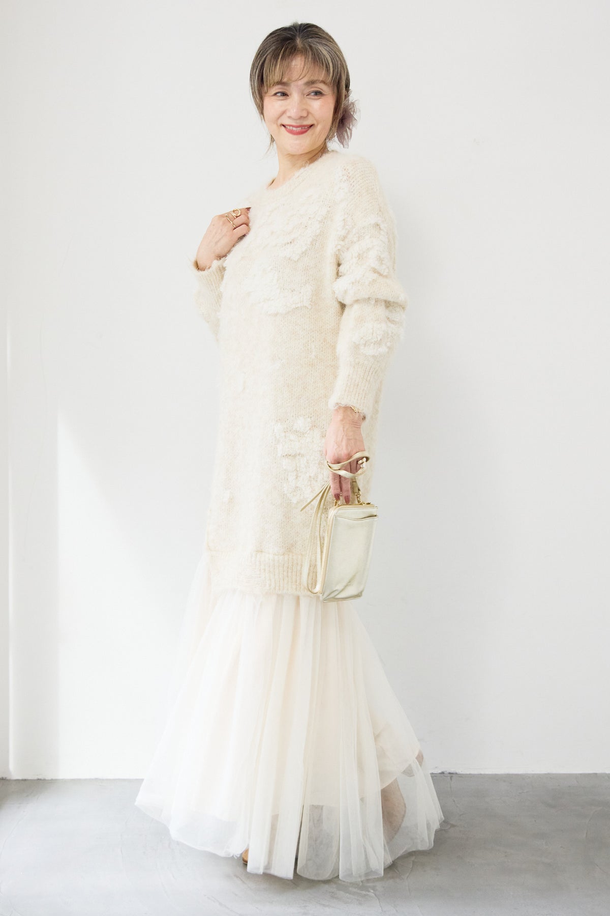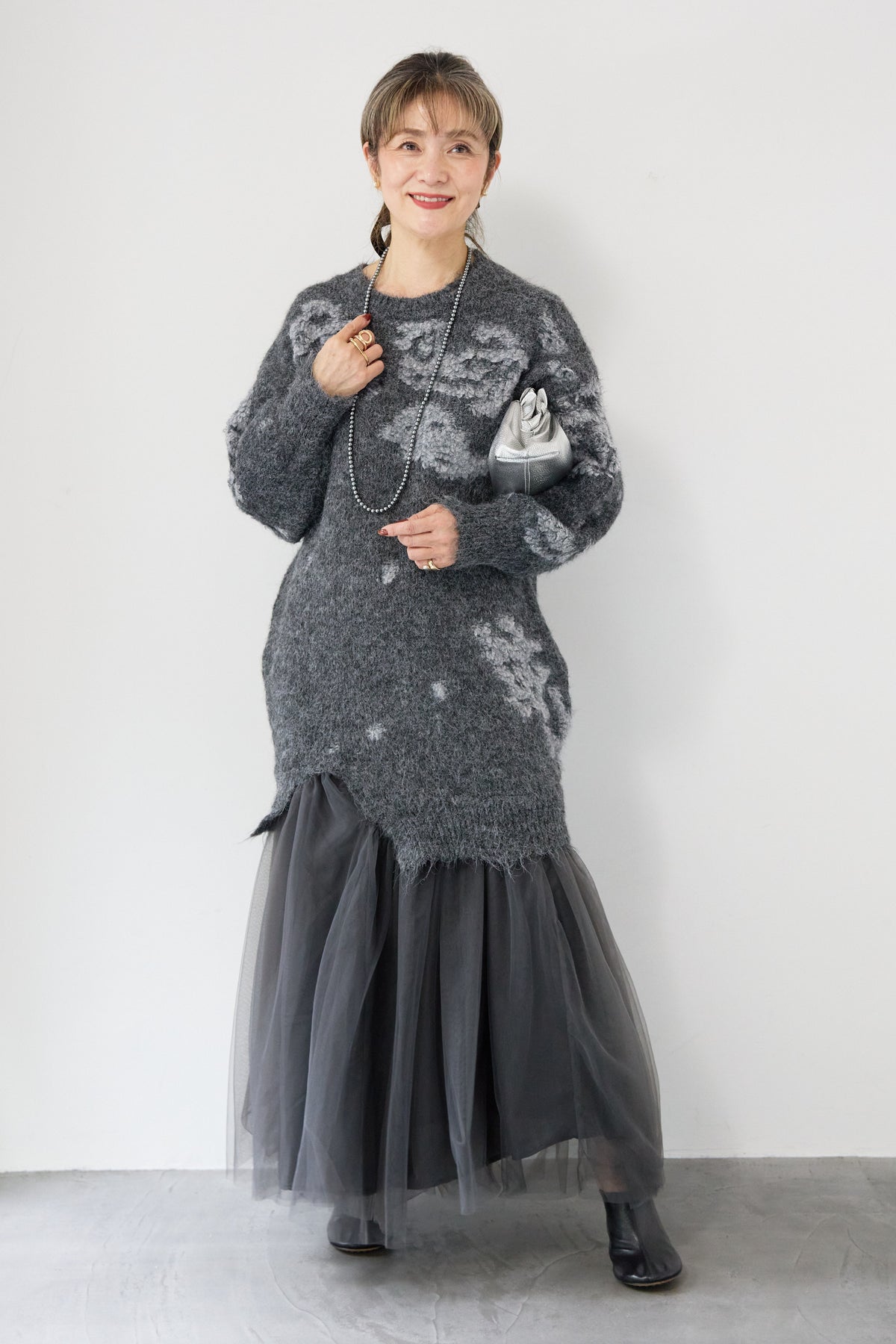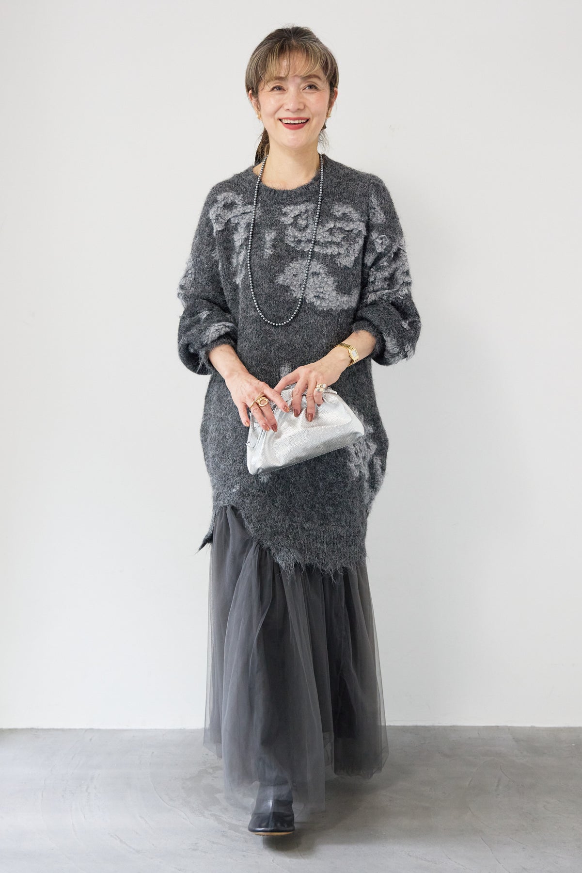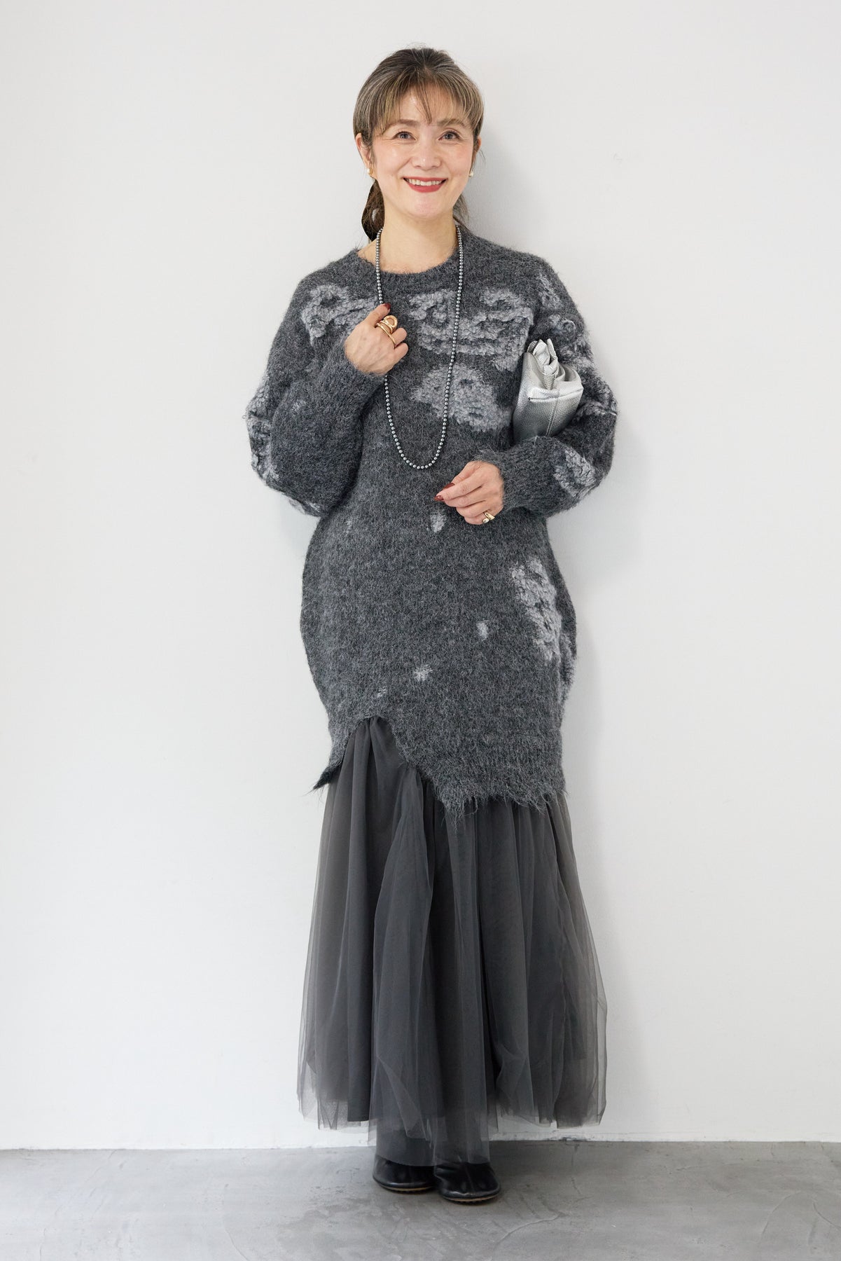 ふんわりとしたシャギーニットと繊細なチュールをドッキングした、存在感のあるワンピース。 異素材の組み合わせが奥行きを生み、立体的なシルエットを描きます。 裾のアシンメトリーカットが動くたびに表情を変え、モードな印象をプラス。 柔らかな着心地と軽やかな揺れ感で、シーズンスタイルを華やかに仕上げてくれます。
