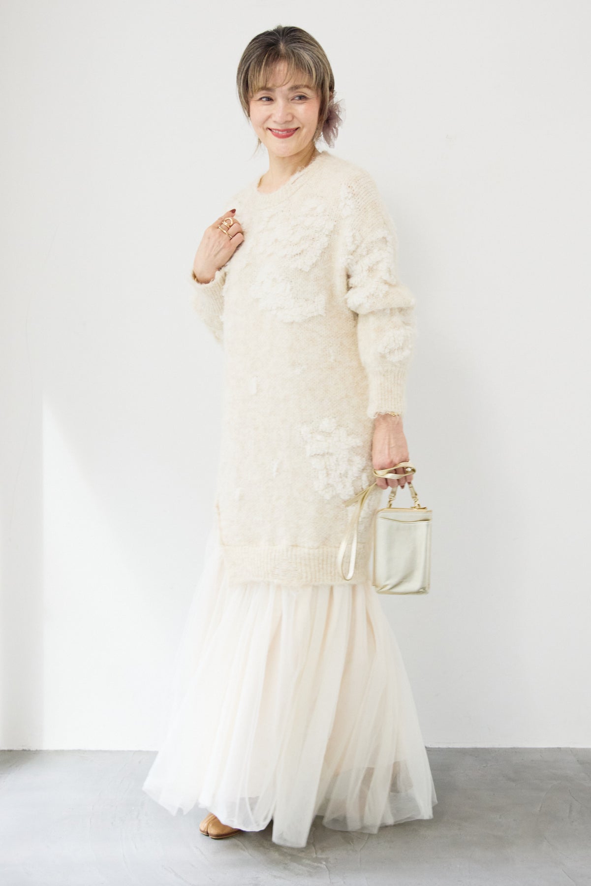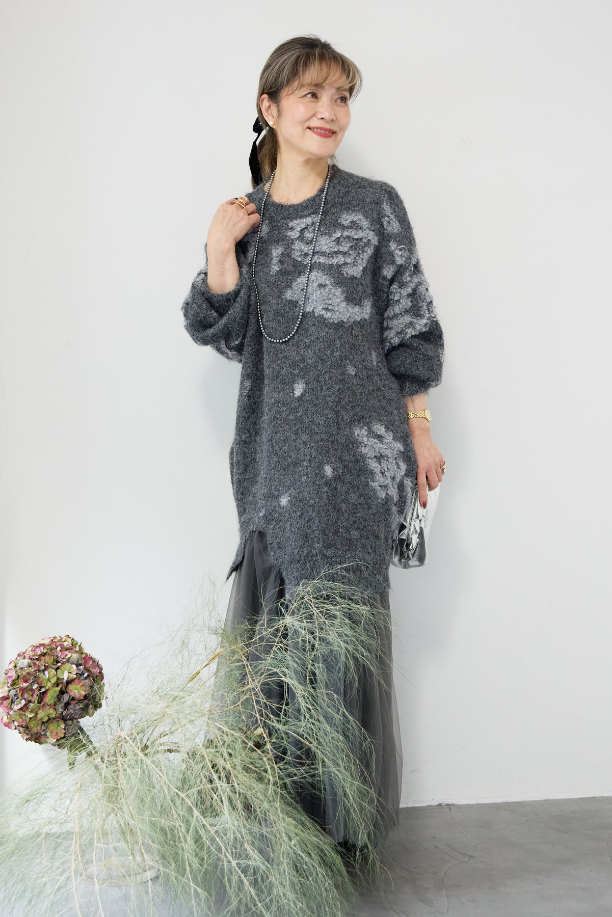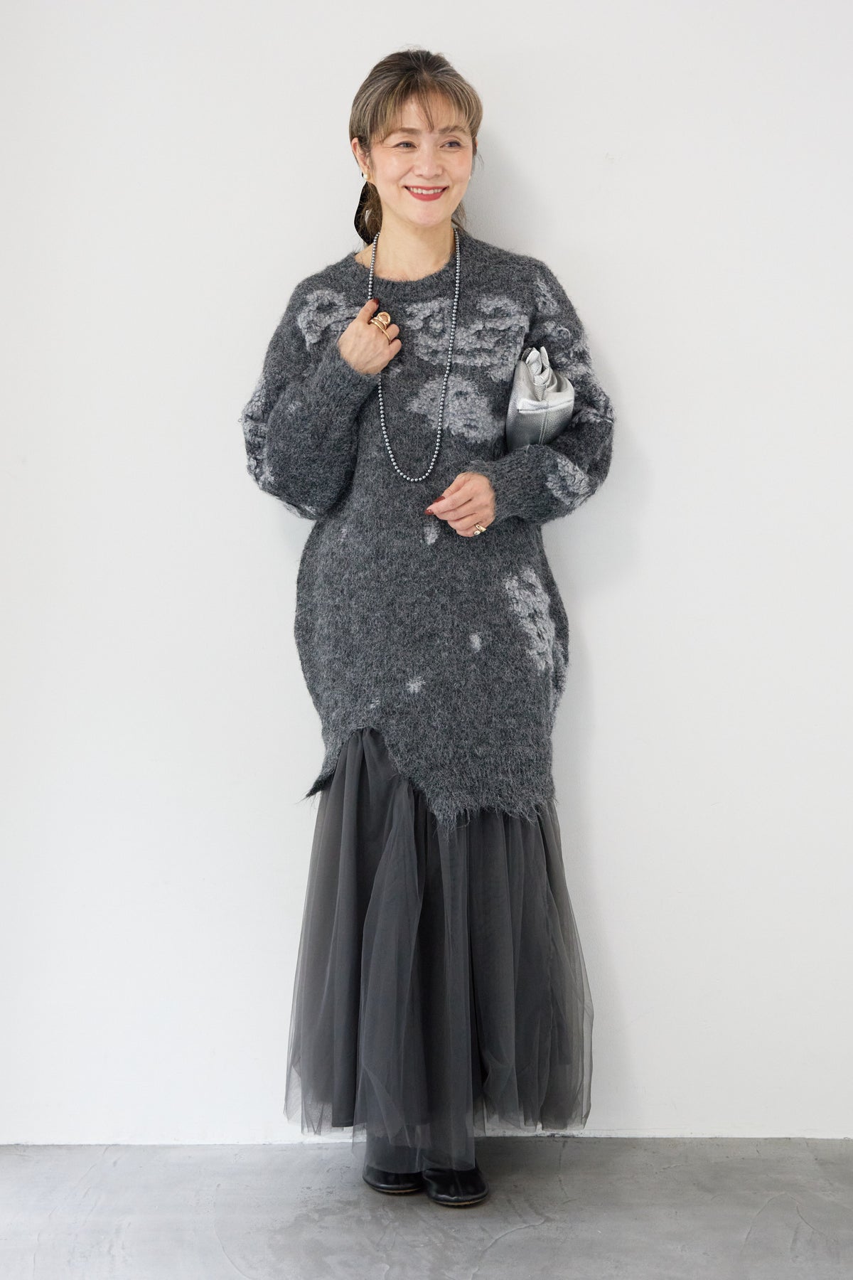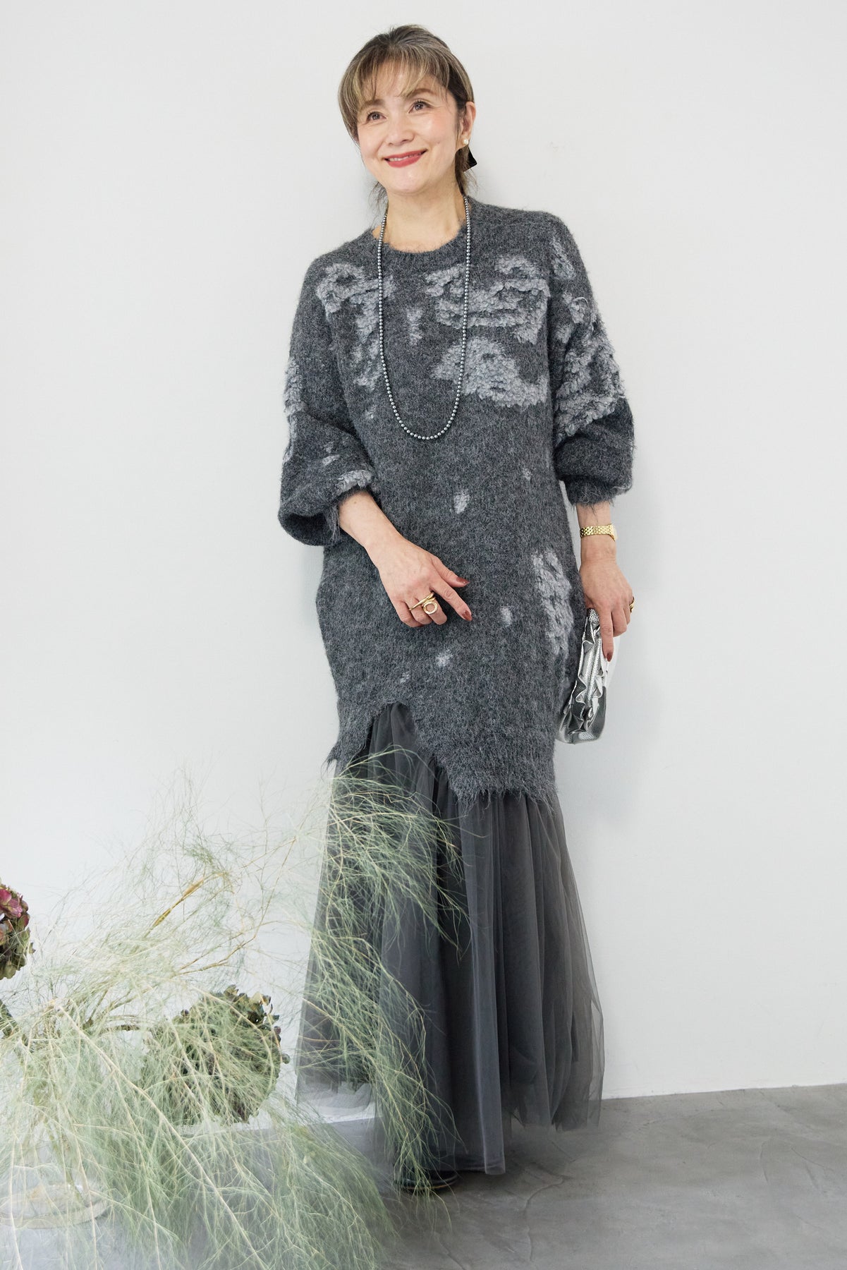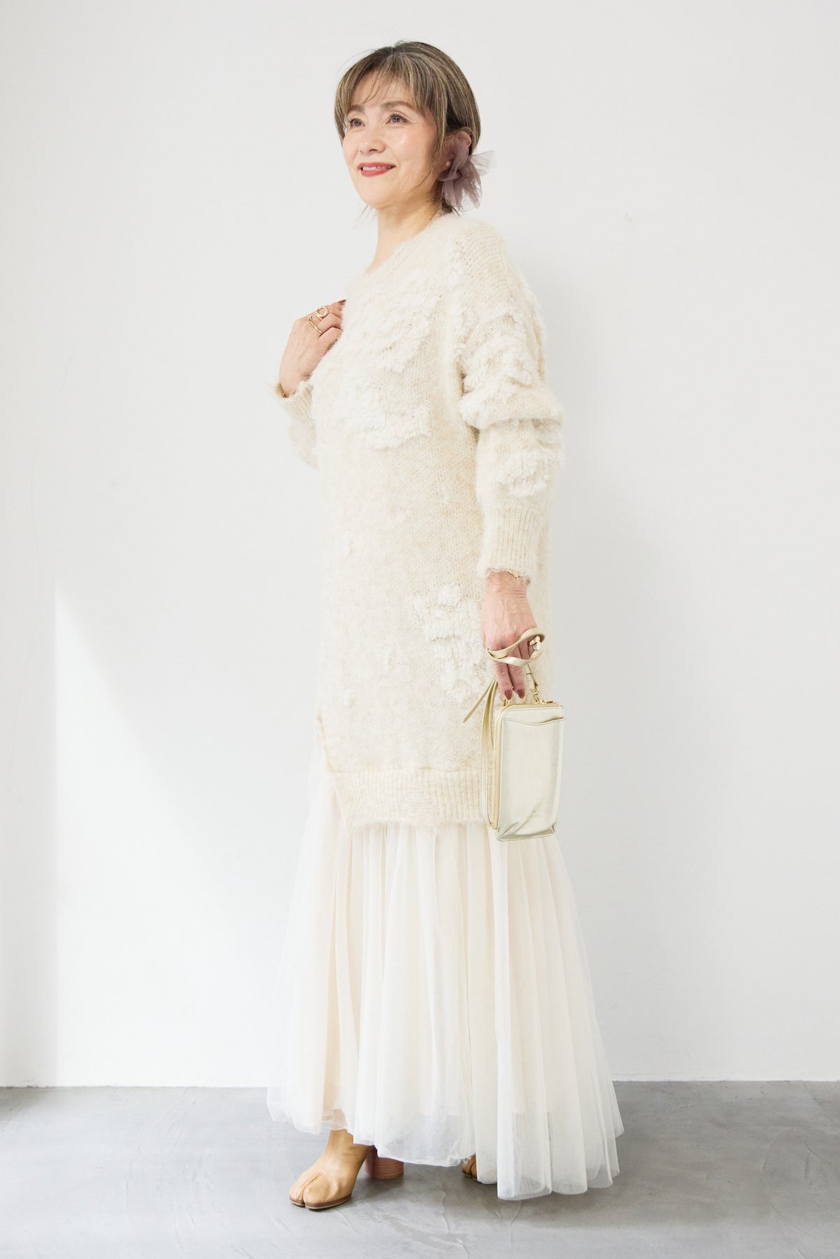 ふんわりとしたシャギーニットと繊細なチュールをドッキングした、存在感のあるワンピース。 異素材の組み合わせが奥行きを生み、立体的なシルエットを描きます。 裾のアシンメトリーカットが動くたびに表情を変え、モードな印象をプラス。 柔らかな着心地と軽やかな揺れ感で、シーズンスタイルを華やかに仕上げてくれます。