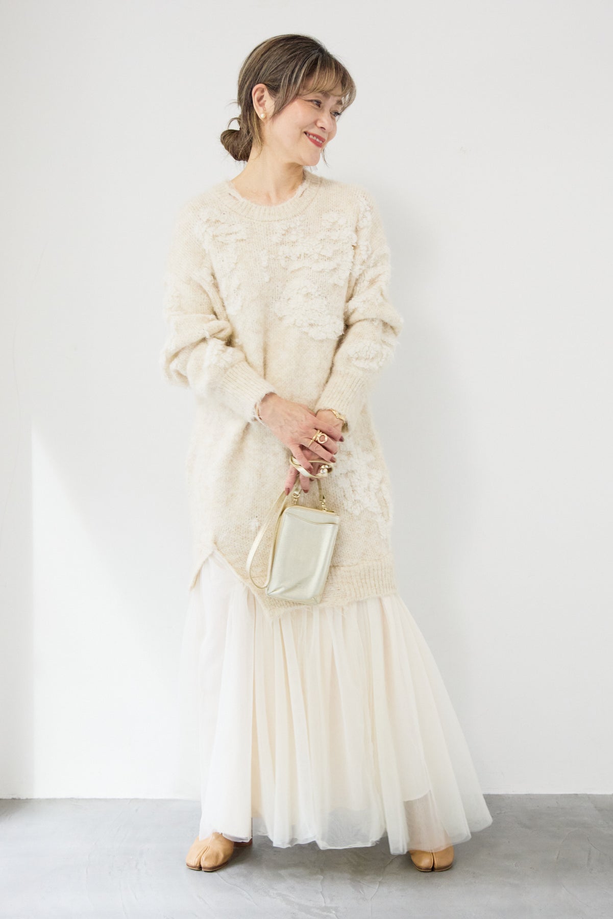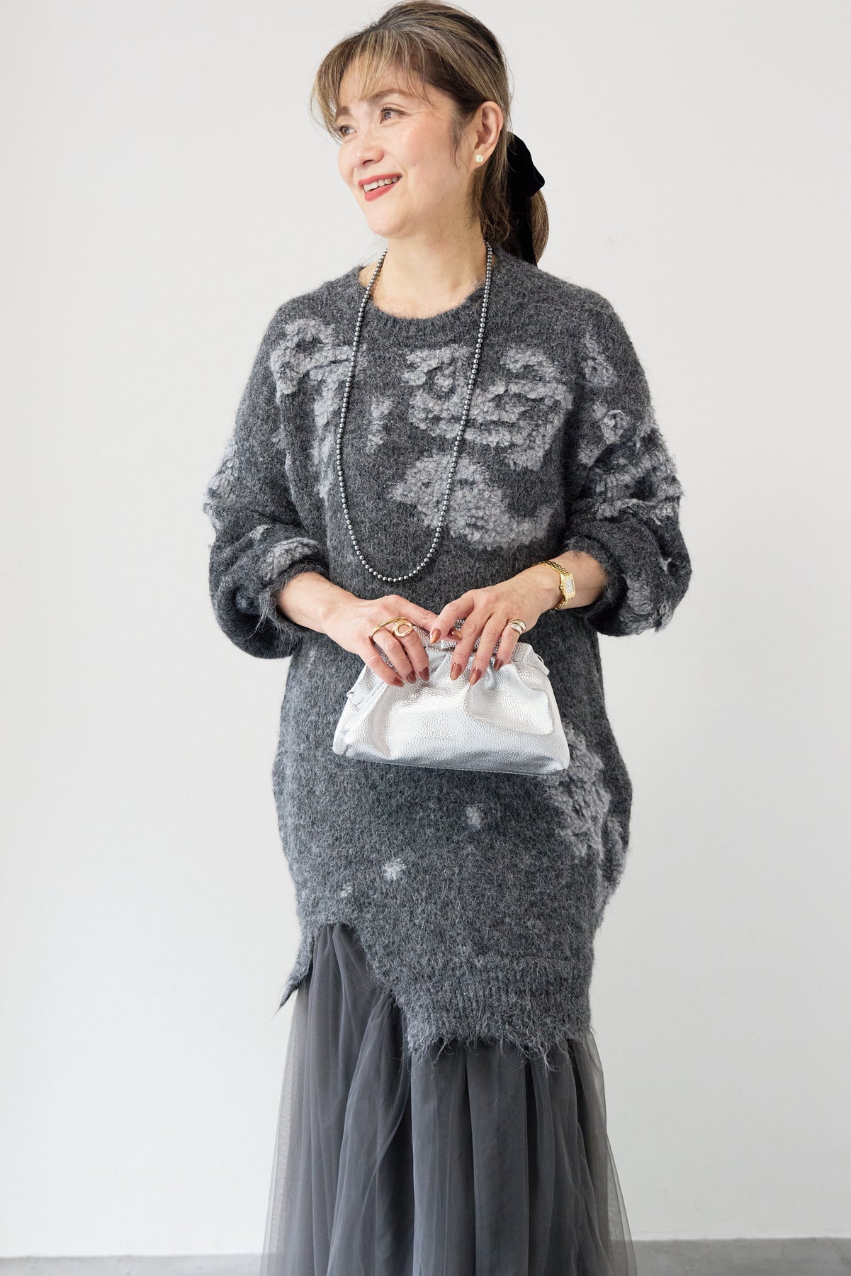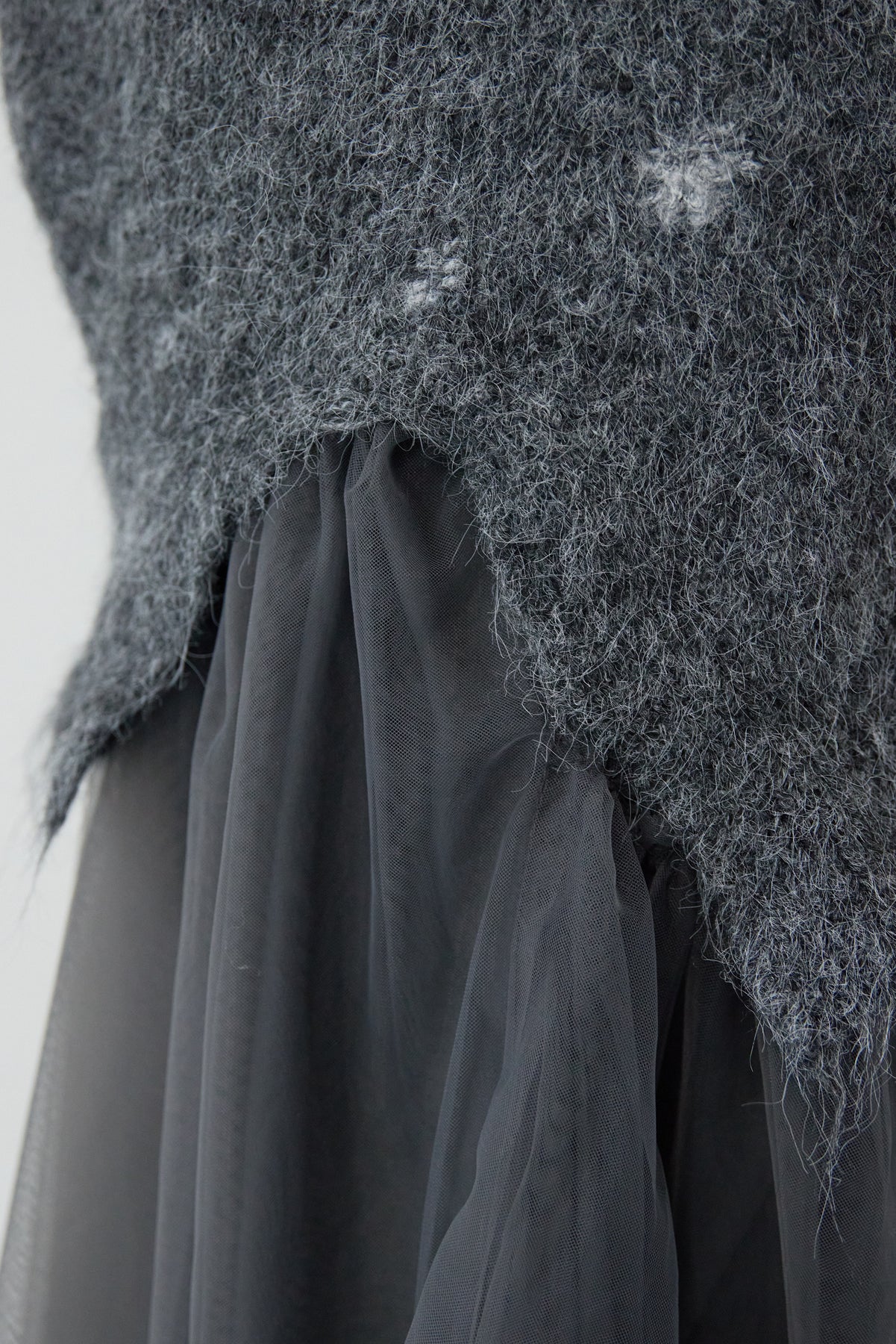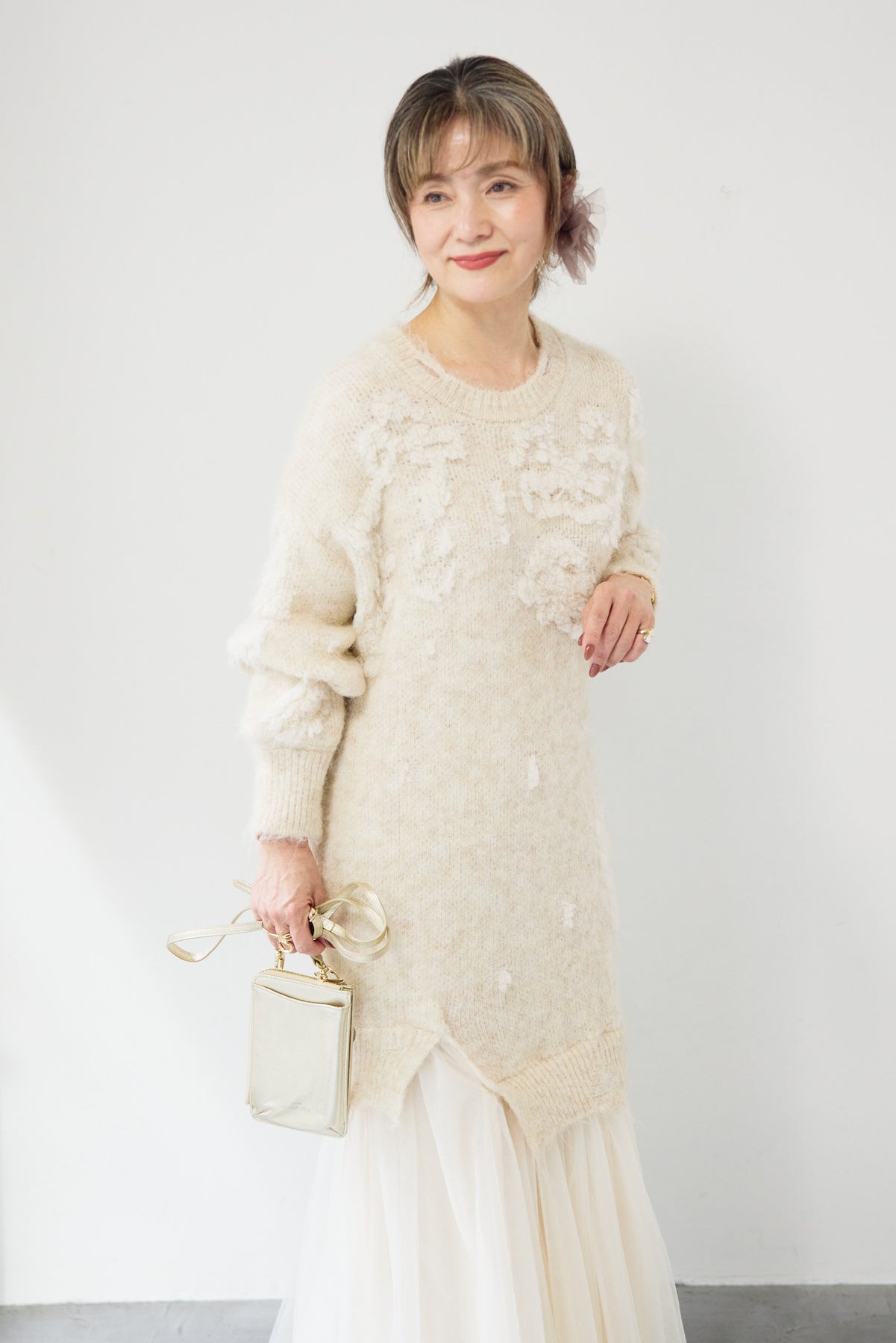 ふんわりとしたシャギーニットと繊細なチュールをドッキングした、存在感のあるワンピース。 異素材の組み合わせが奥行きを生み、立体的なシルエットを描きます。 裾のアシンメトリーカットが動くたびに表情を変え、モードな印象をプラス。 柔らかな着心地と軽やかな揺れ感で、シーズンスタイルを華やかに仕上げてくれます。