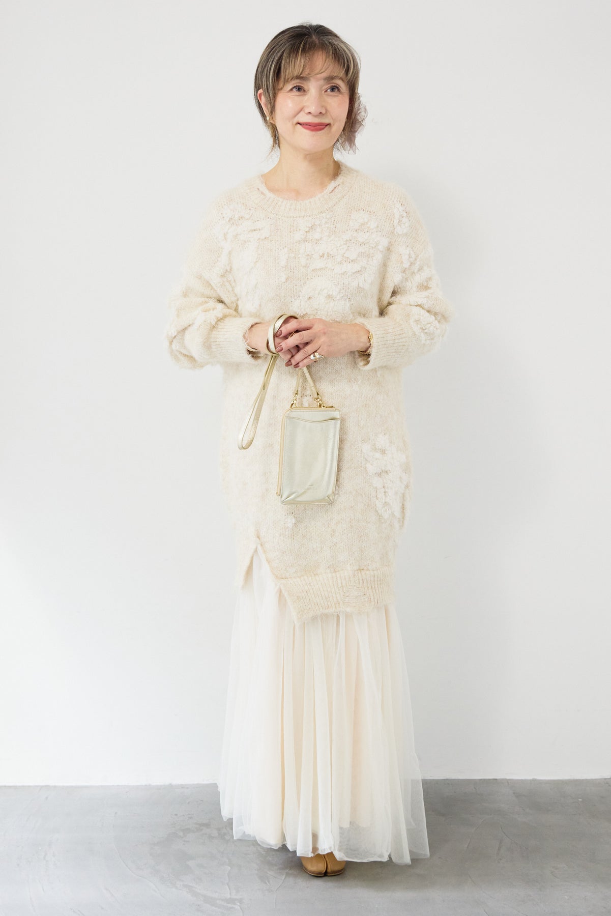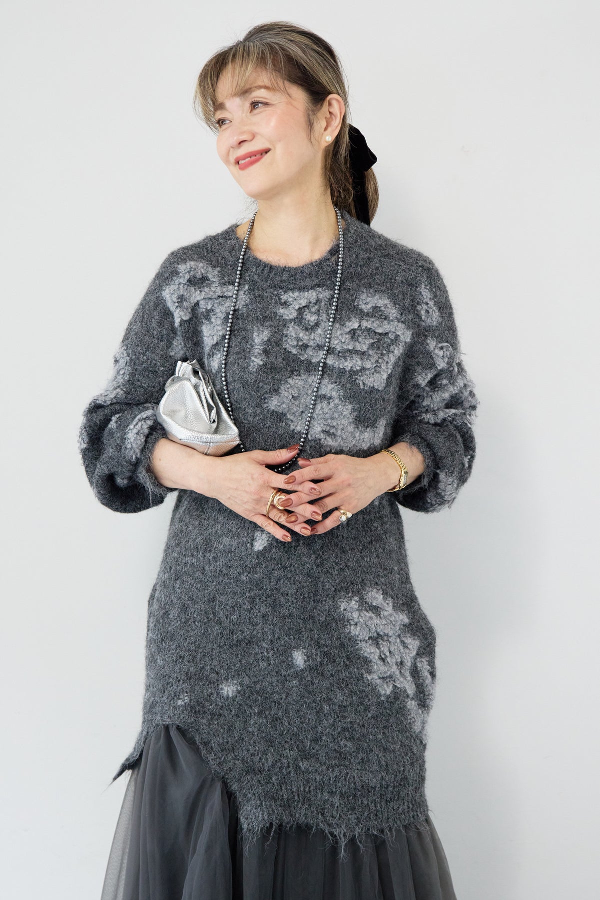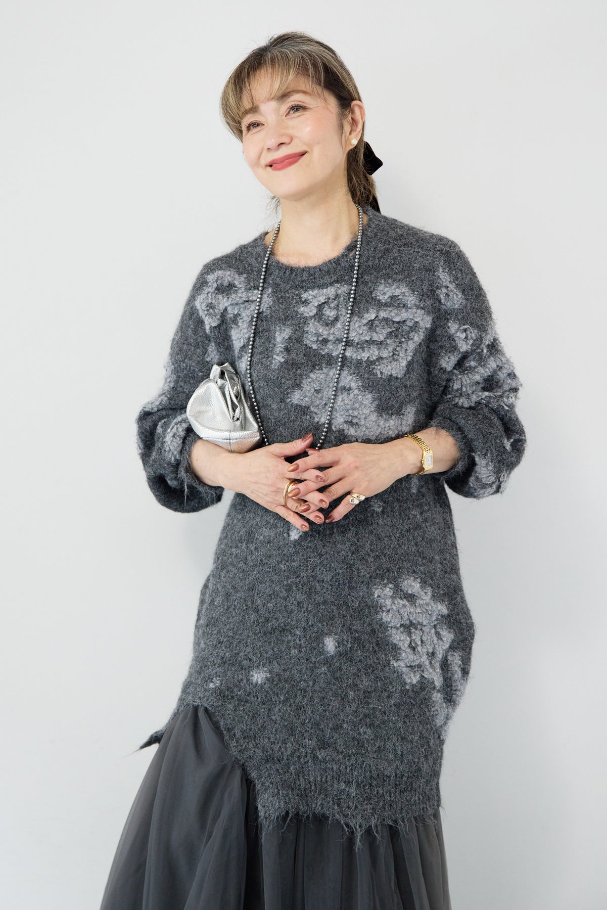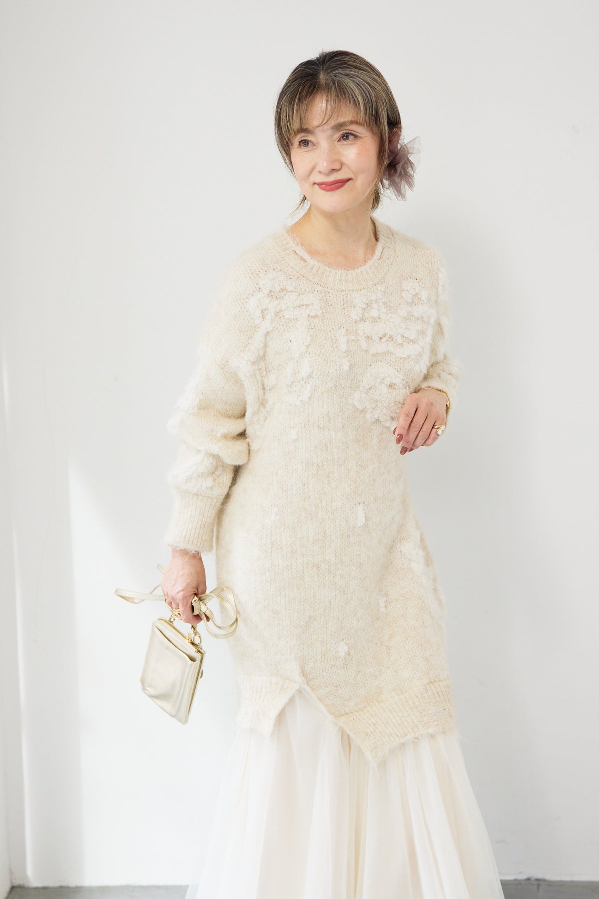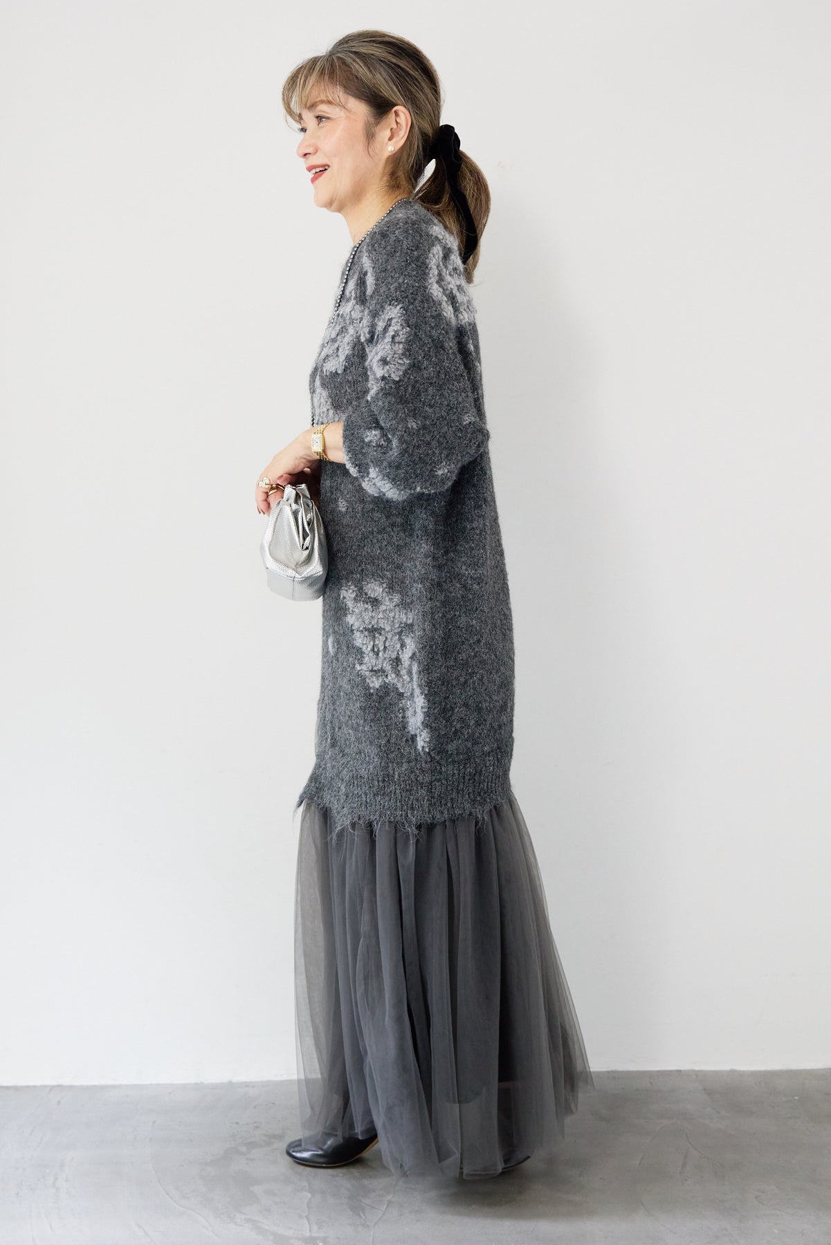 ふんわりとしたシャギーニットと繊細なチュールをドッキングした、存在感のあるワンピース。 異素材の組み合わせが奥行きを生み、立体的なシルエットを描きます。 裾のアシンメトリーカットが動くたびに表情を変え、モードな印象をプラス。 柔らかな着心地と軽やかな揺れ感で、シーズンスタイルを華やかに仕上げてくれます。