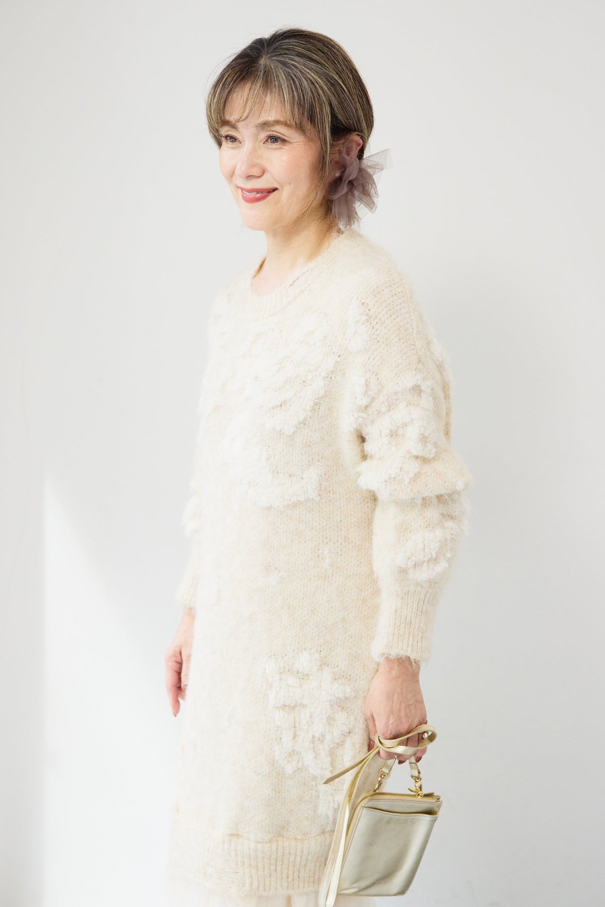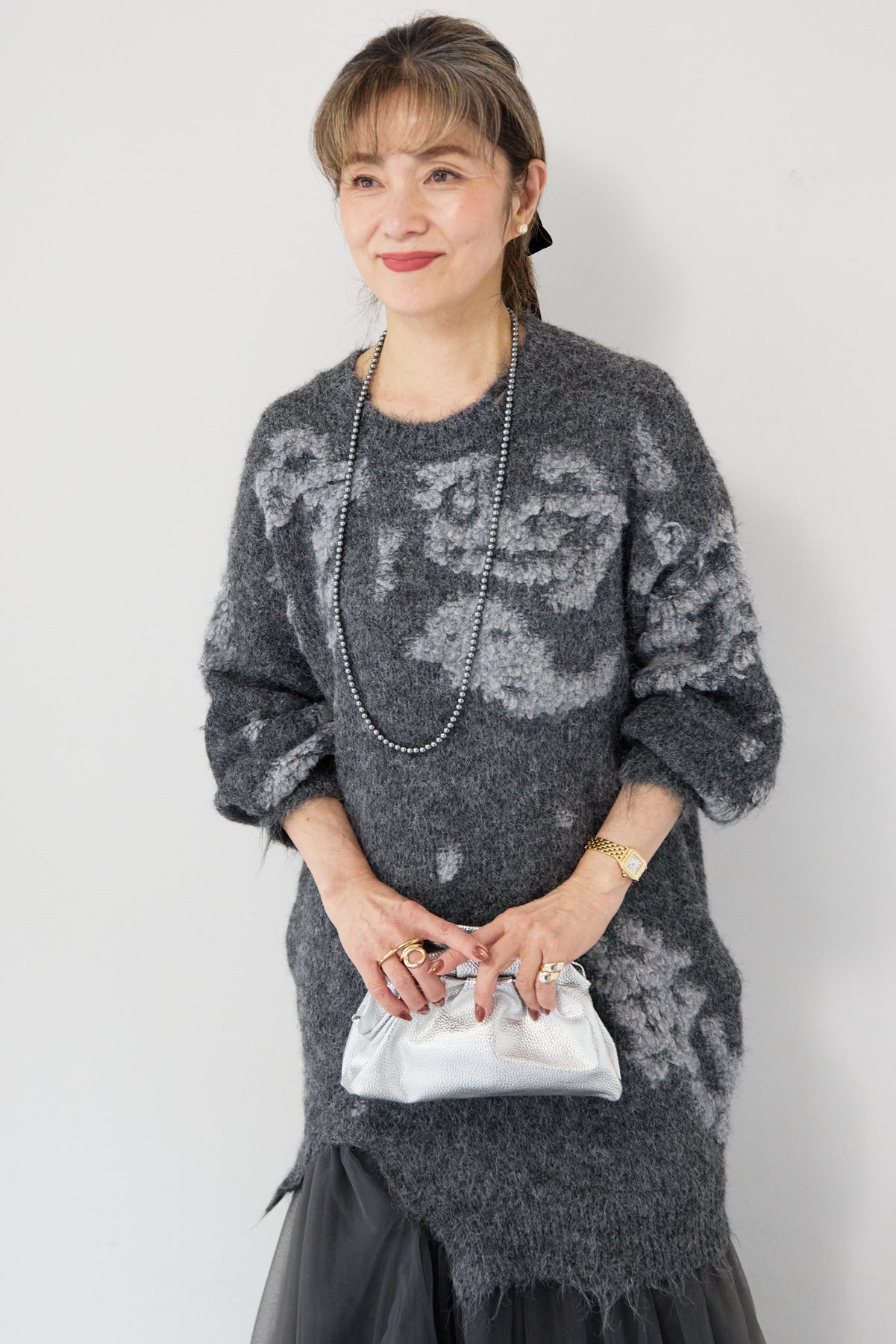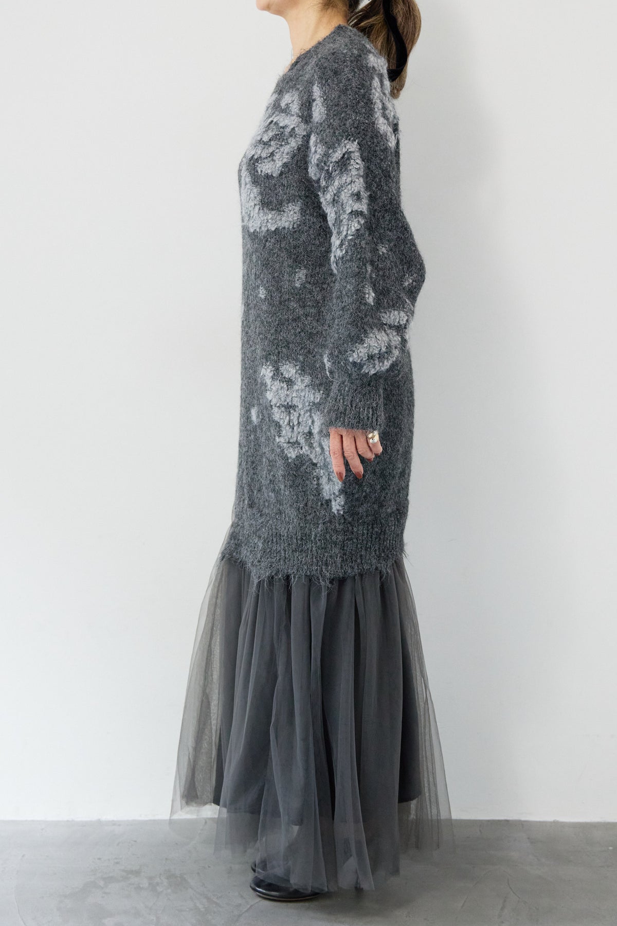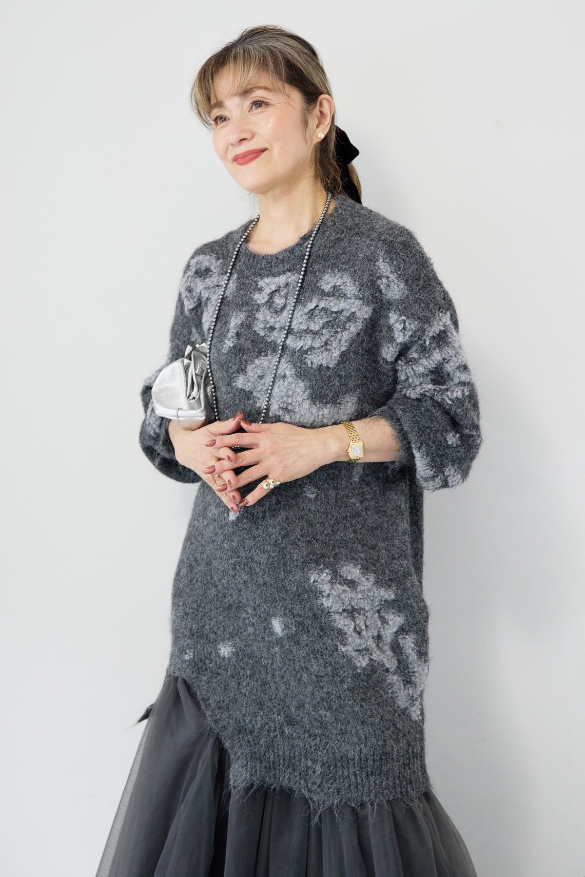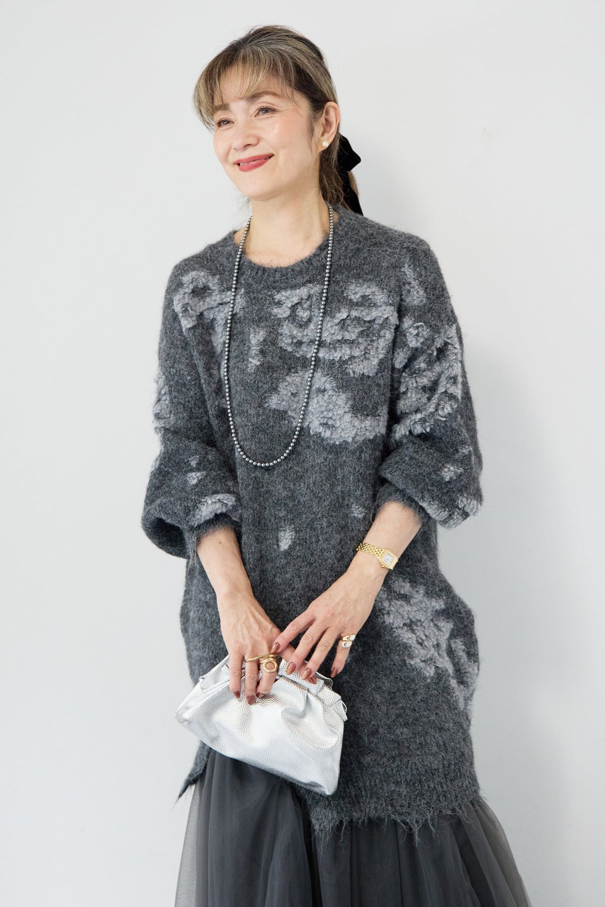 ふんわりとしたシャギーニットと繊細なチュールをドッキングした、存在感のあるワンピース。 異素材の組み合わせが奥行きを生み、立体的なシルエットを描きます。 裾のアシンメトリーカットが動くたびに表情を変え、モードな印象をプラス。 柔らかな着心地と軽やかな揺れ感で、シーズンスタイルを華やかに仕上げてくれます。