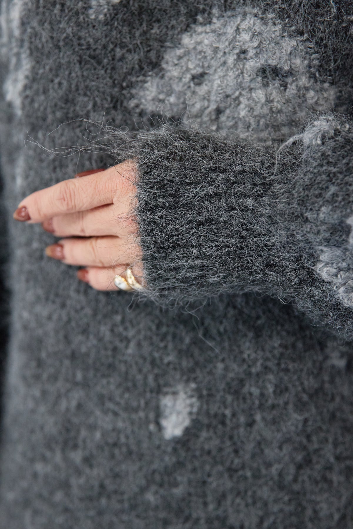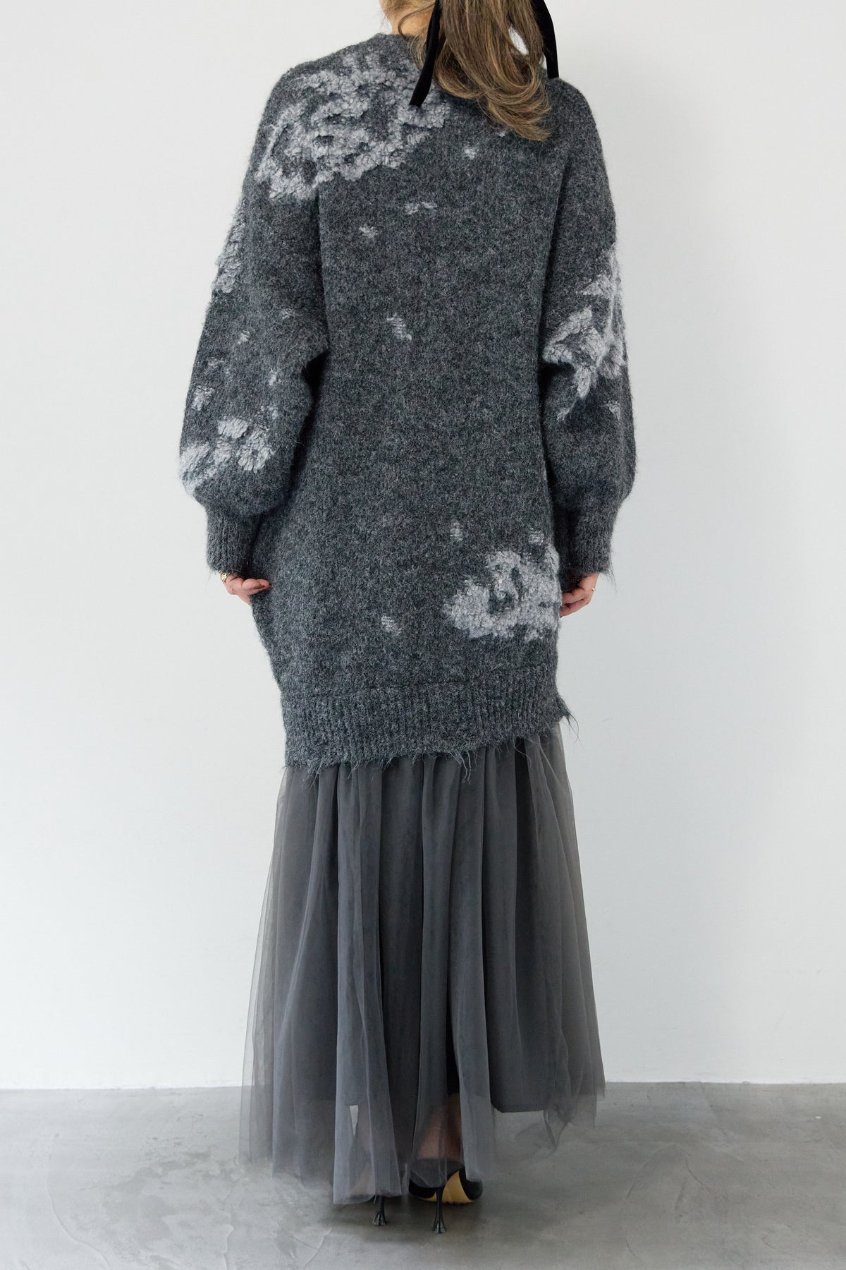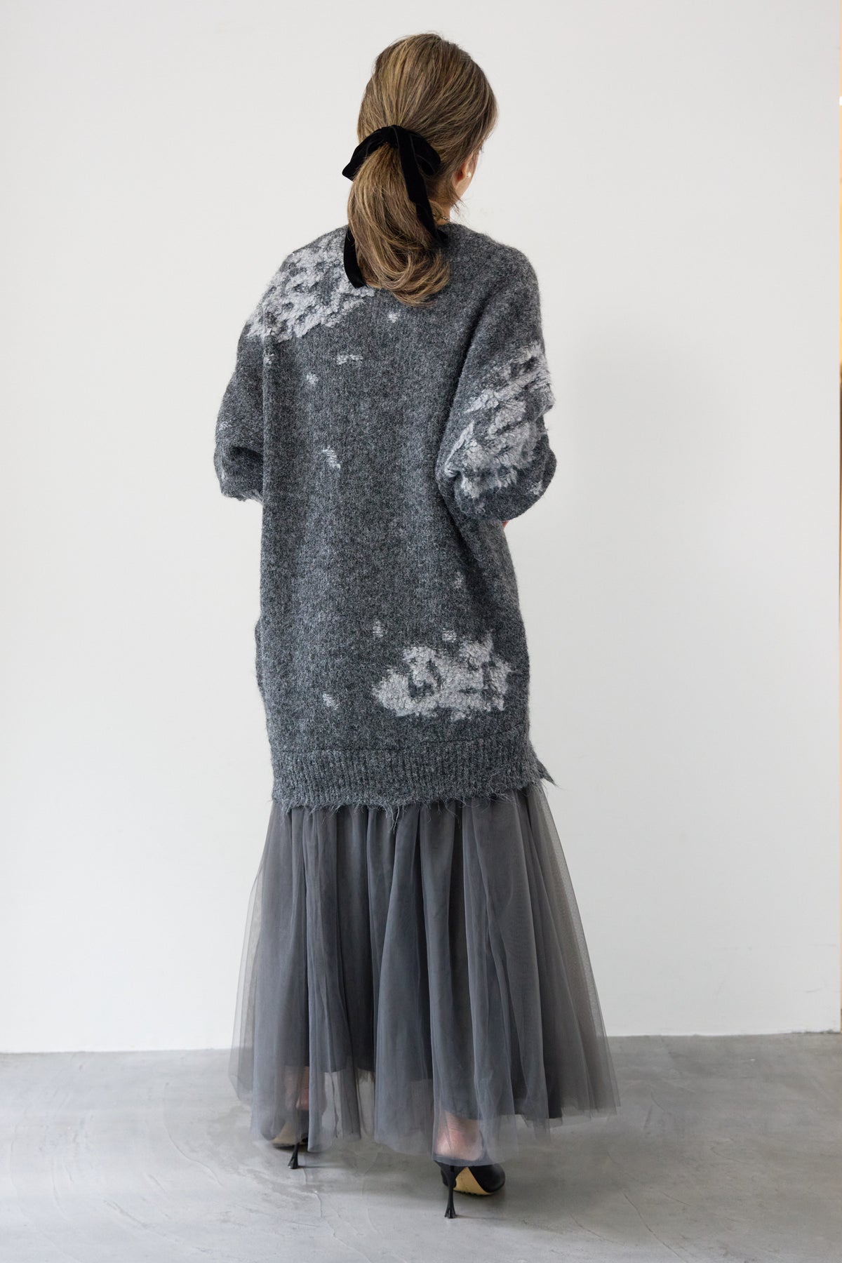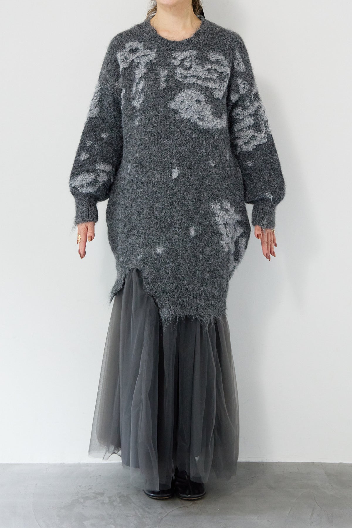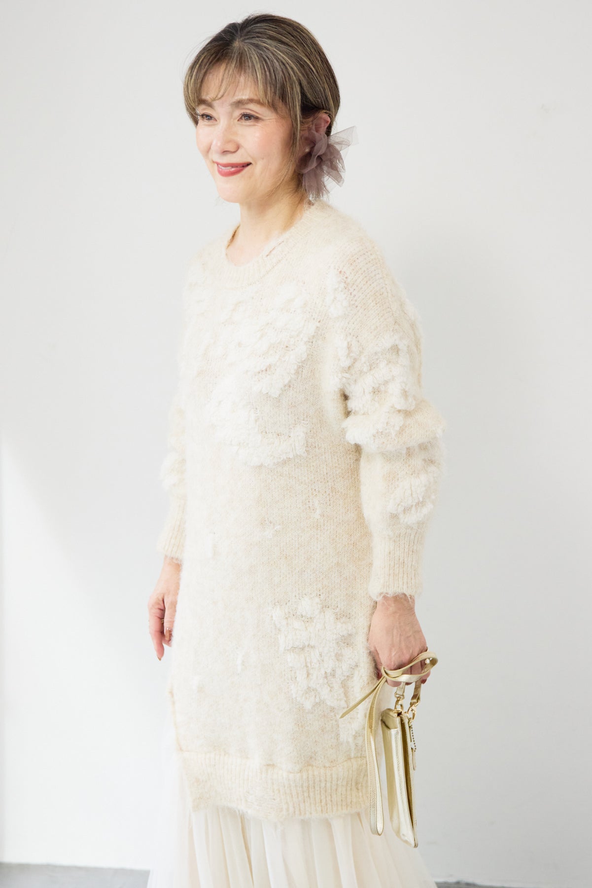 ふんわりとしたシャギーニットと繊細なチュールをドッキングした、存在感のあるワンピース。 異素材の組み合わせが奥行きを生み、立体的なシルエットを描きます。 裾のアシンメトリーカットが動くたびに表情を変え、モードな印象をプラス。 柔らかな着心地と軽やかな揺れ感で、シーズンスタイルを華やかに仕上げてくれます。