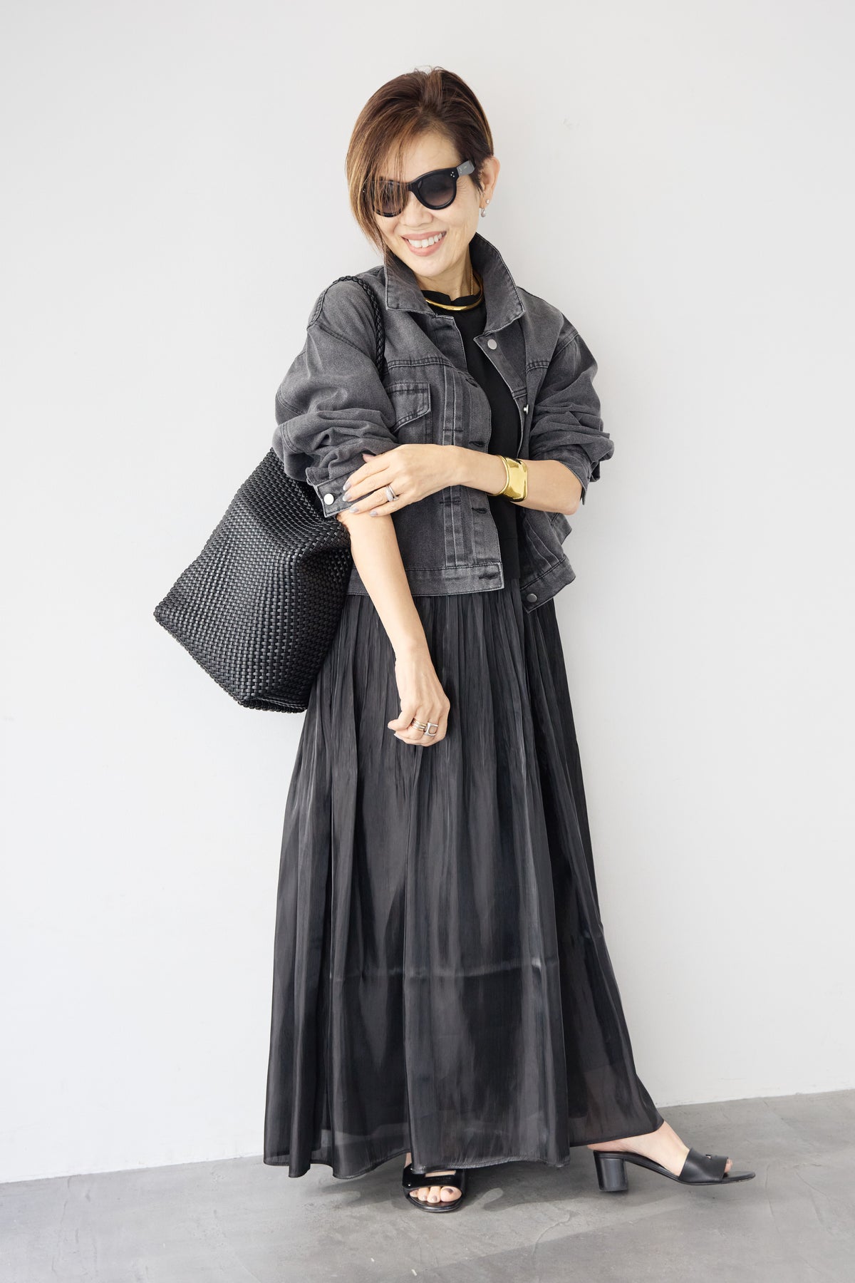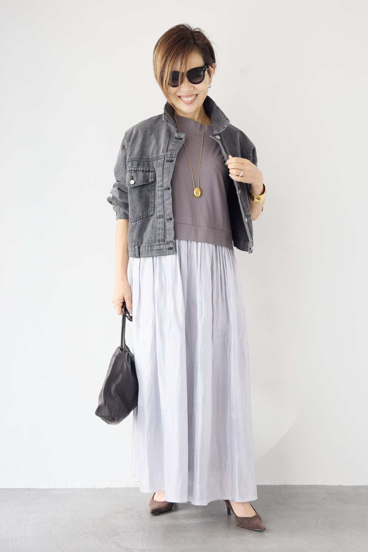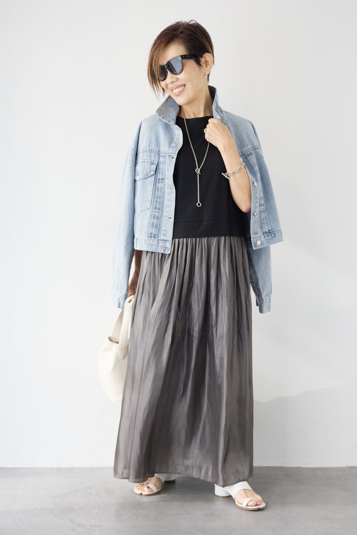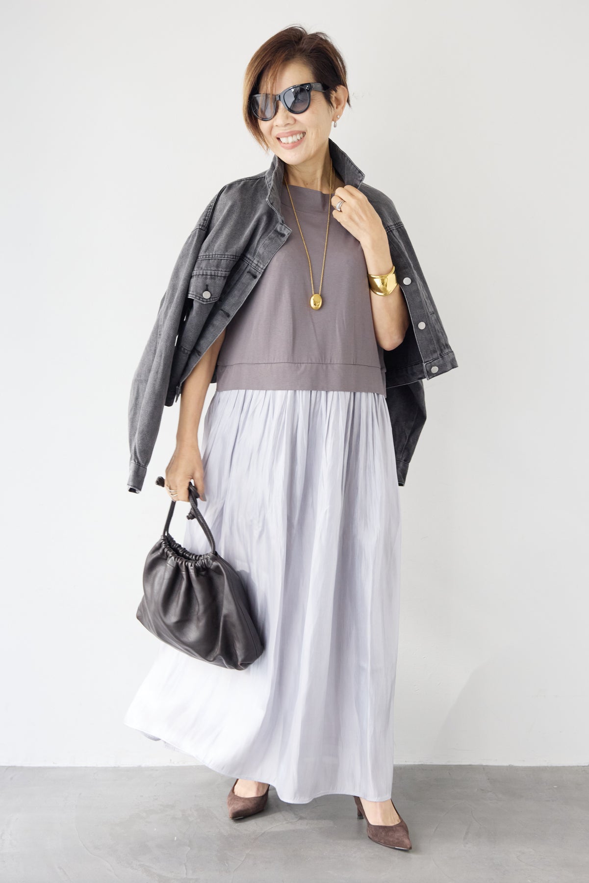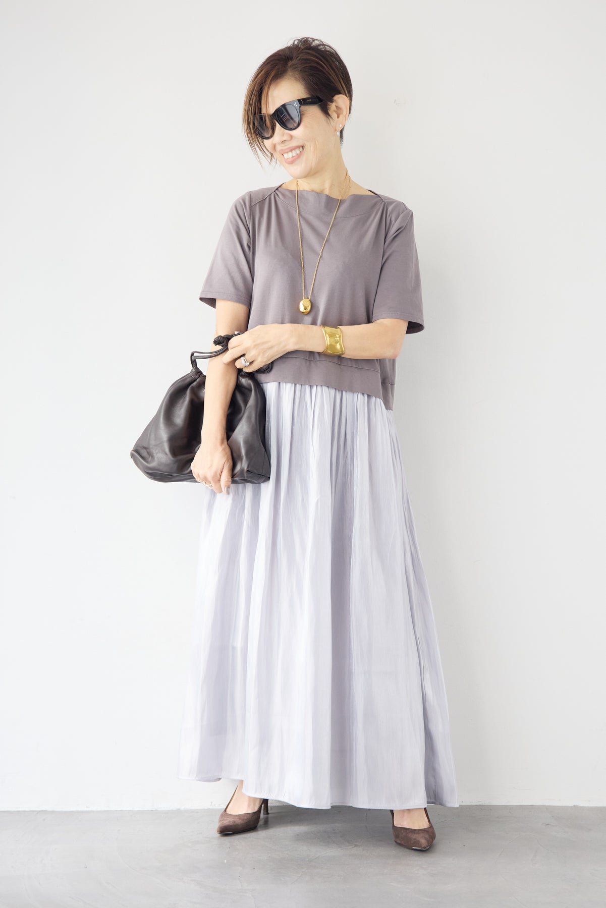 異素材のコントラストが際立つ、大人モードなドッキングワンピース。上身頃はなめらかで落ち感のあるカットソー素材、スカート部分は軽やかな透け感のシアー素材を贅沢に使用し、1枚で奥行きのあるスタイリングが完成します。ウエスト切替からたっぷりと寄せたギャザーが、動くたびに揺れるエアリーなシルエットを演出。すっきりとしたボートネックと程よい袖丈が、気になる肩や腕まわりをカバーしつつ上品な印象に導きます。透け感のあるロング丈スカートは軽やかで涼しげ。シンプルながら存在感があり、デイリーからお出かけまで幅広く活躍する1着です。