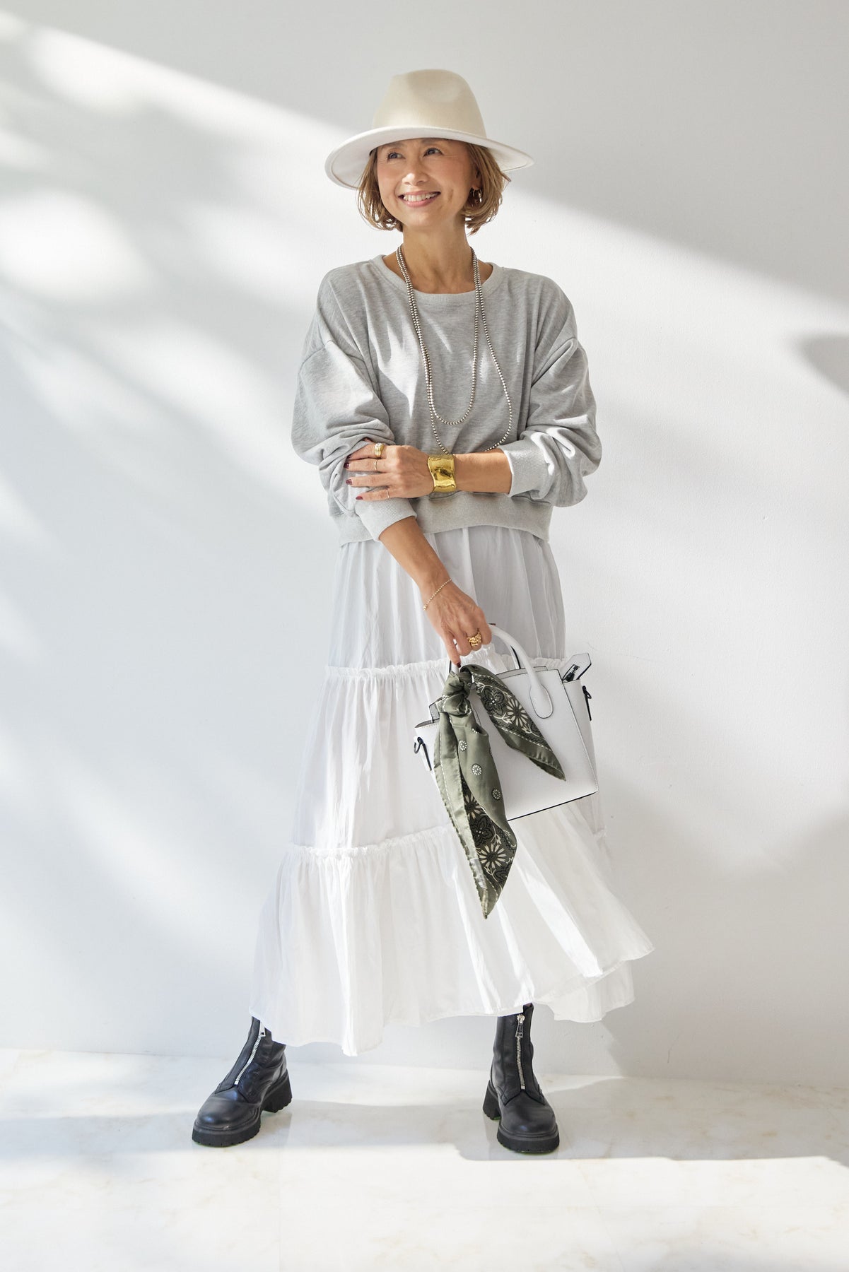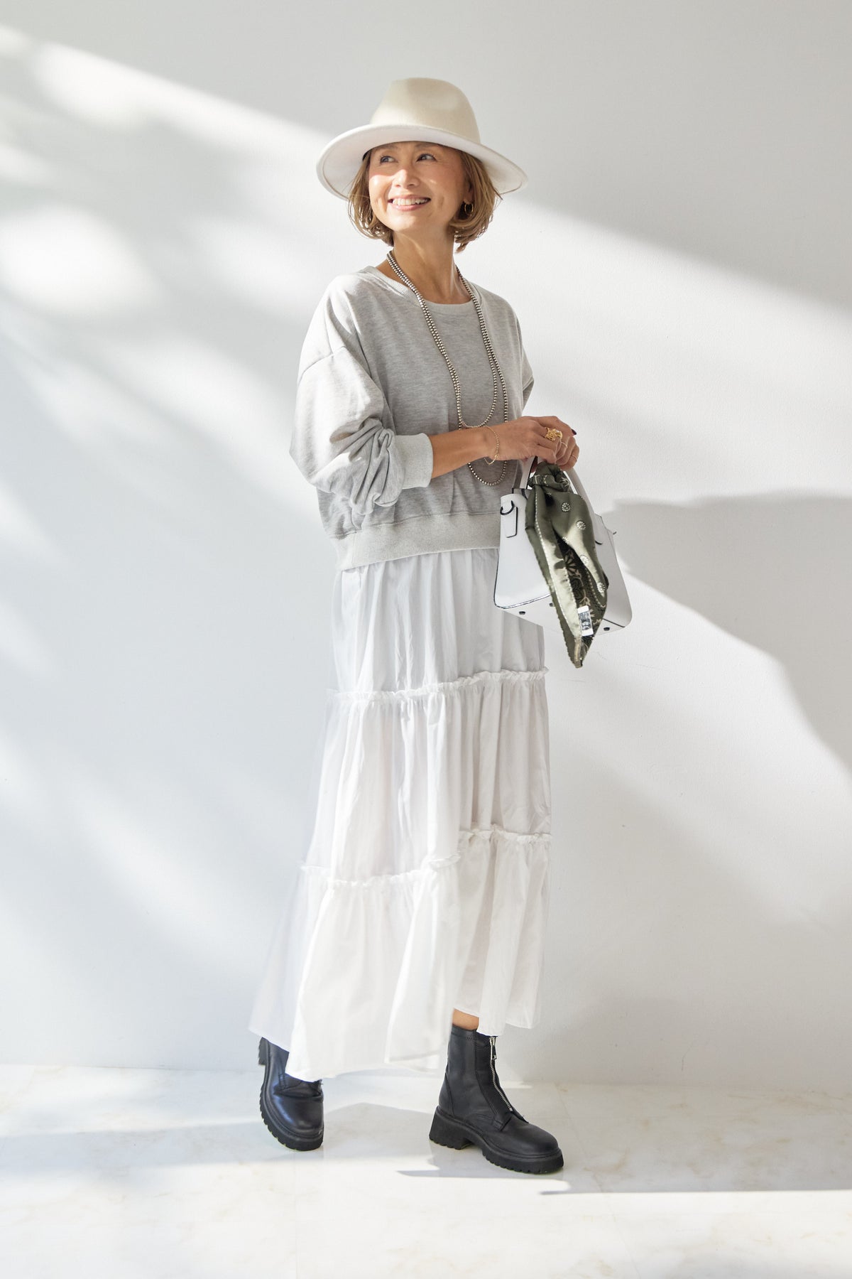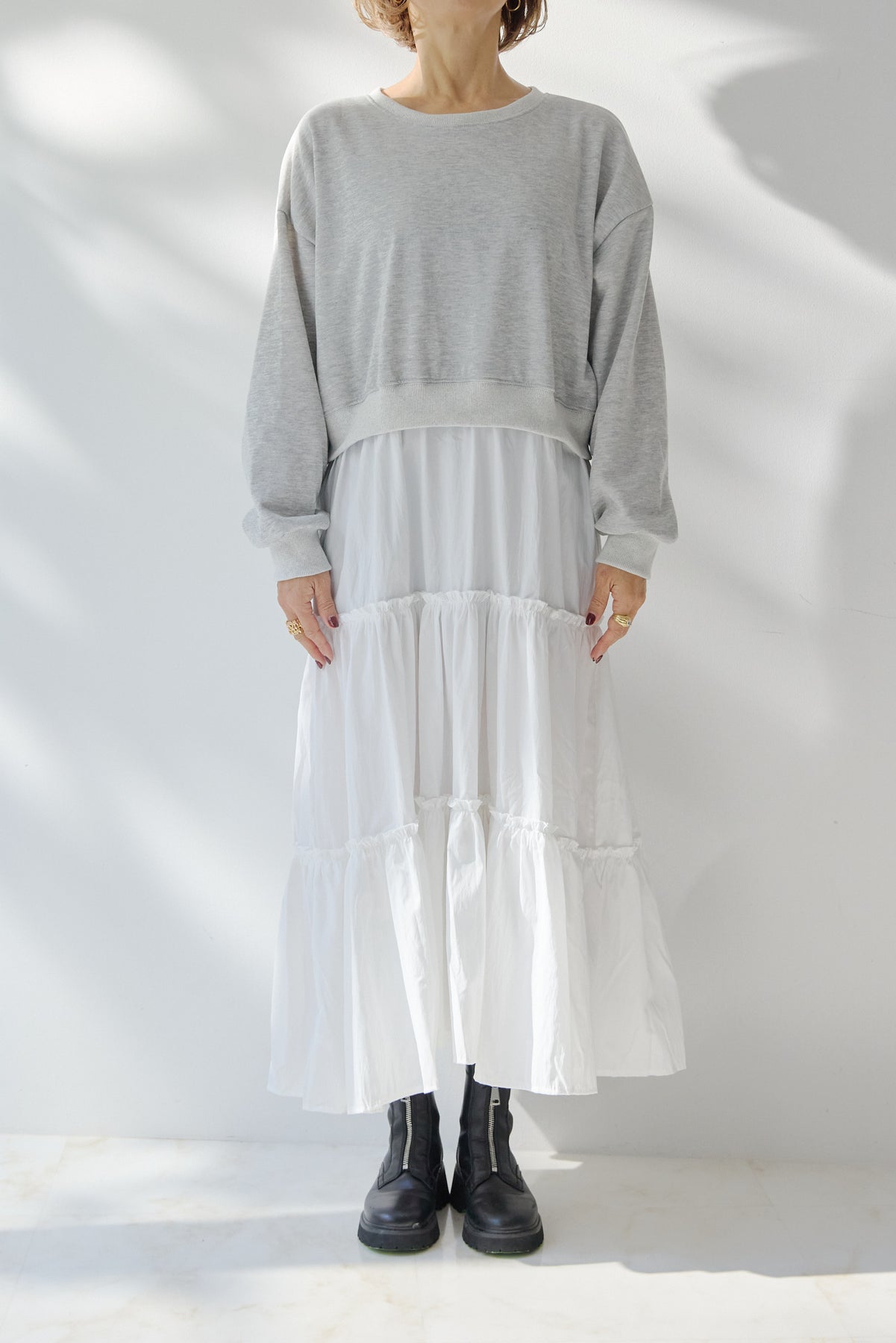 カジュアルとフェミニンを絶妙に掛け合わせた、大人のためのドッキングワンピース。上身頃は柔らかなスウェット素材を使用し、リラックス感のある着心地に。程よくゆとりのあるシルエットとドロップショルダーが、抜け感のある印象を演出します。スカート部分には、軽やかで透け感のあるティアードデザインを採用。歩くたびにふんわりと揺れ、女性らしさを引き立てます。異素材の切り替え位置をやや高めに設定することで、スタイルアップ効果も◎。1枚でコーディネートが完成し、ブーツやスニーカーなど合わせる小物次第で印象チェンジも自在。デイリー使いはもちろん、ちょっとしたお出かけにも活躍する、着映えワンピースです。