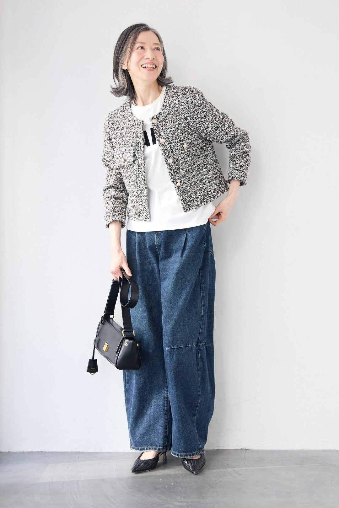 ラメ混ツイード編み ビジューボタン ニットカーディガン