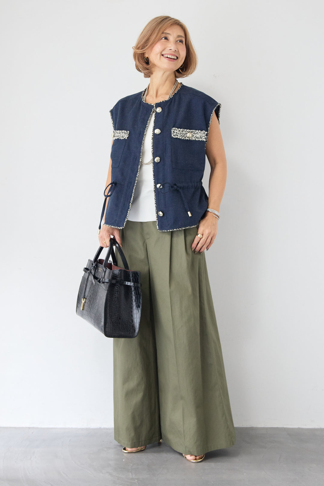 配色ツイードトリミング デニム調ニットジレ
