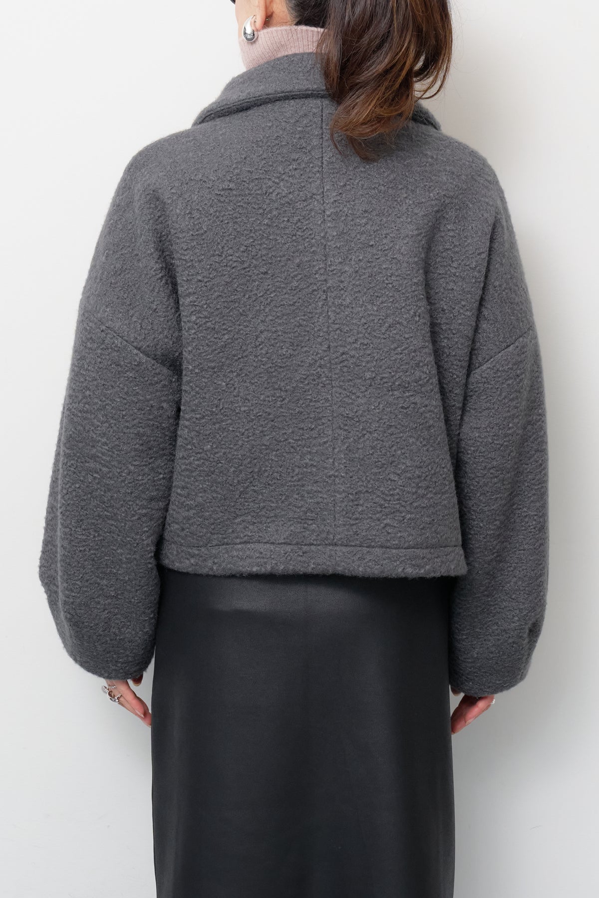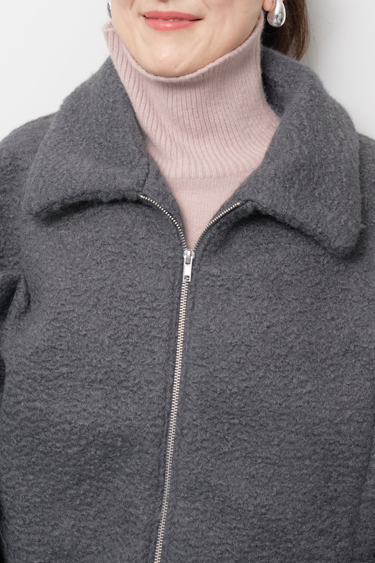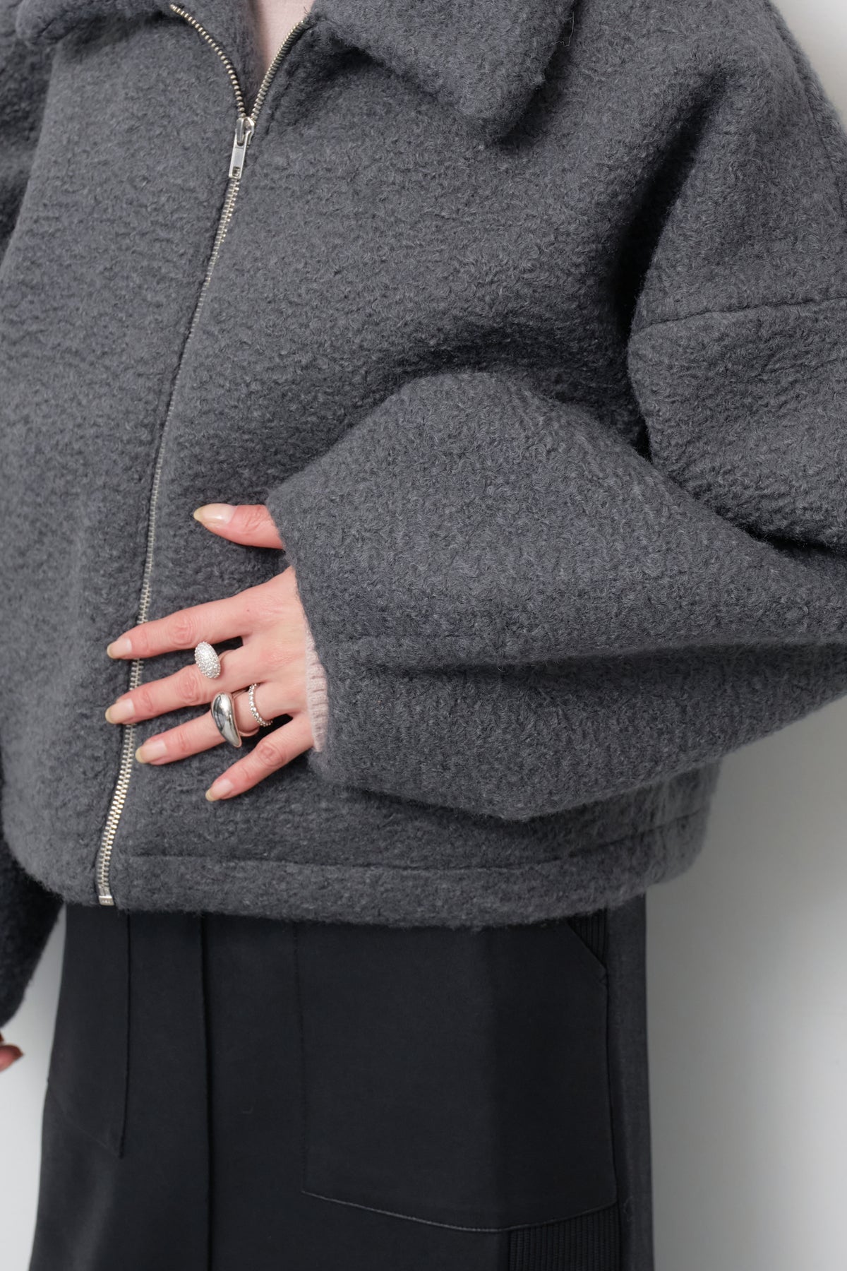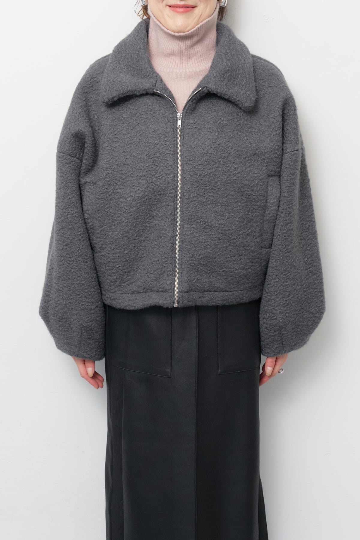 ふんわりとしたシープボア素材が目を惹く、季節感たっぷりのボリュームスリーブジャケット。柔らかく暖かな風合いで、肌寒い季節も心地よく包み込んでくれます。ゆったりと落ちるドロップショルダーと丸みのあるスリーブが、抜け感のある女性らしいシルエットを演出。ショート丈のバランスがスタイルアップ効果をもたらし、どんなボトムスとも相性よく着こなせます。フロントは使いやすいフルジップ仕様。襟は立てても寝かせても様になり、カジュアルからきれいめまで幅広いコーディネートに活躍します。裏地付きで滑りが良く、ニットの上からもストレスなく羽織れるのも嬉しいポイント。デイリー使いはもちろん、洗練されたデザインでお出かけシーンにもおすすめの一着です。