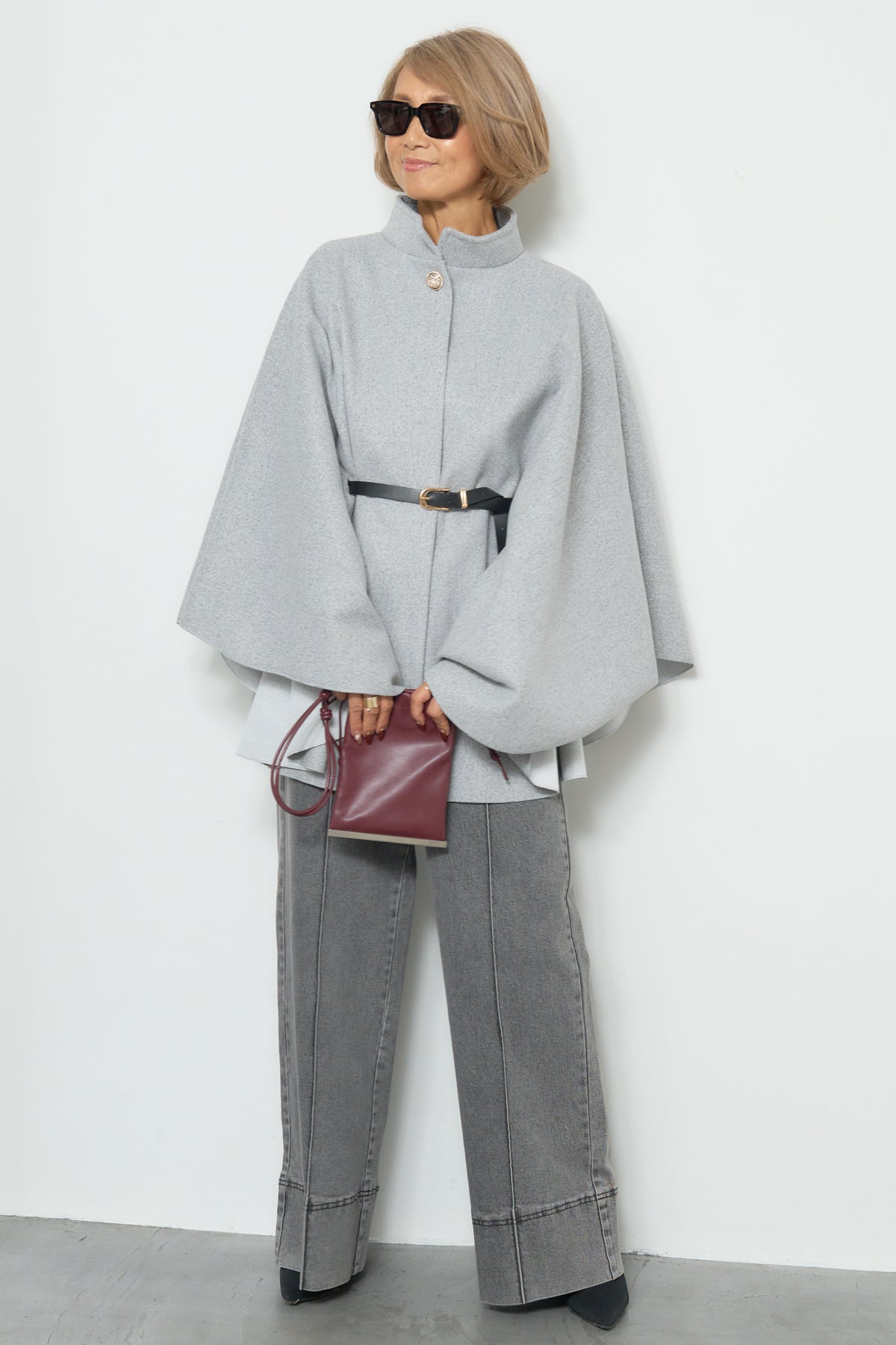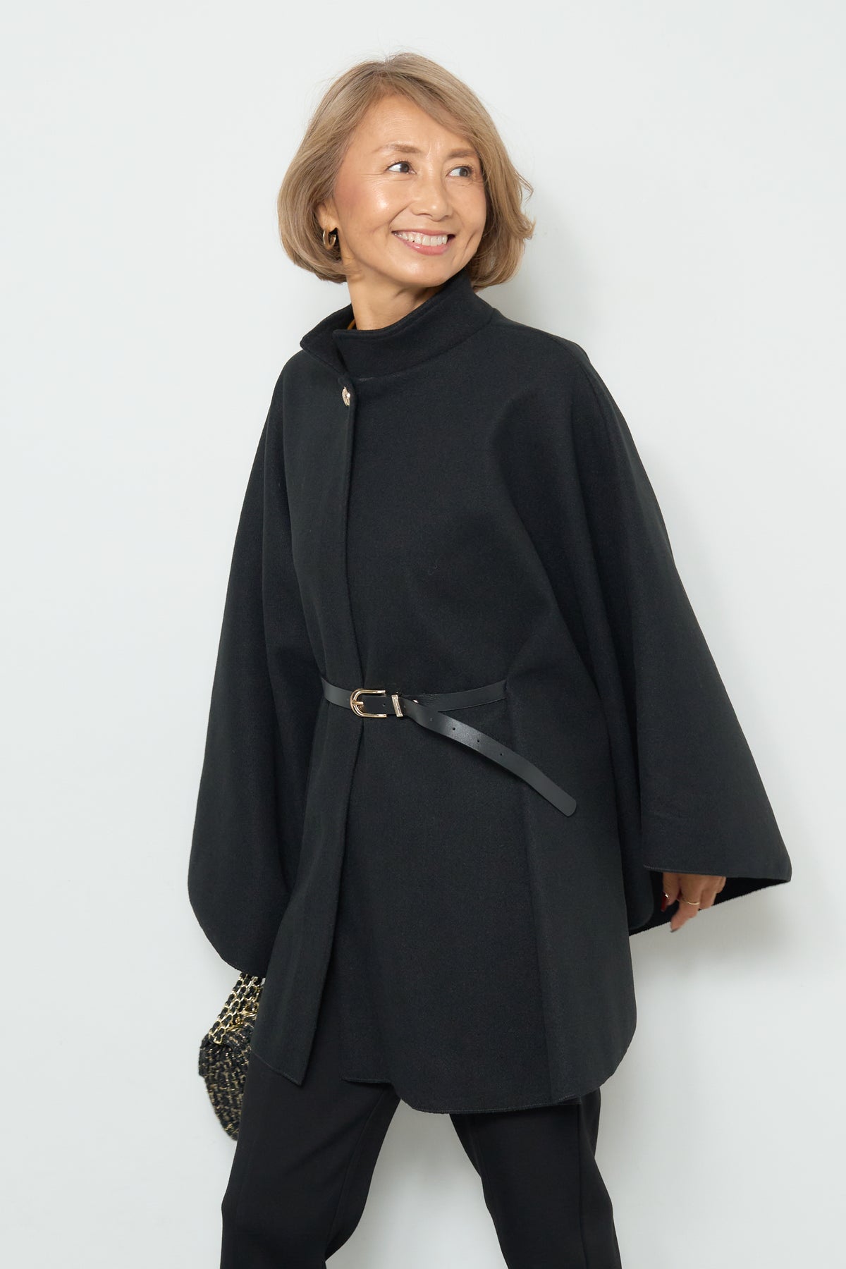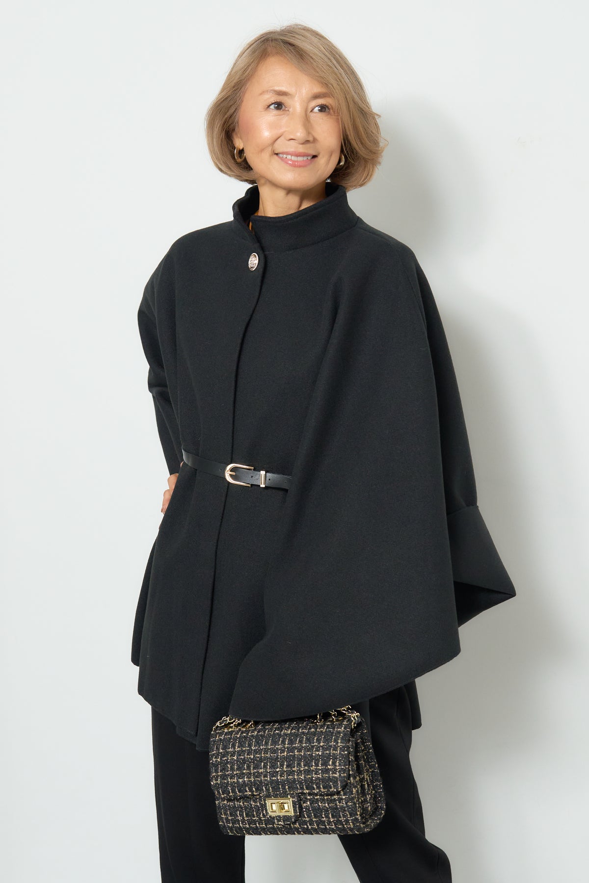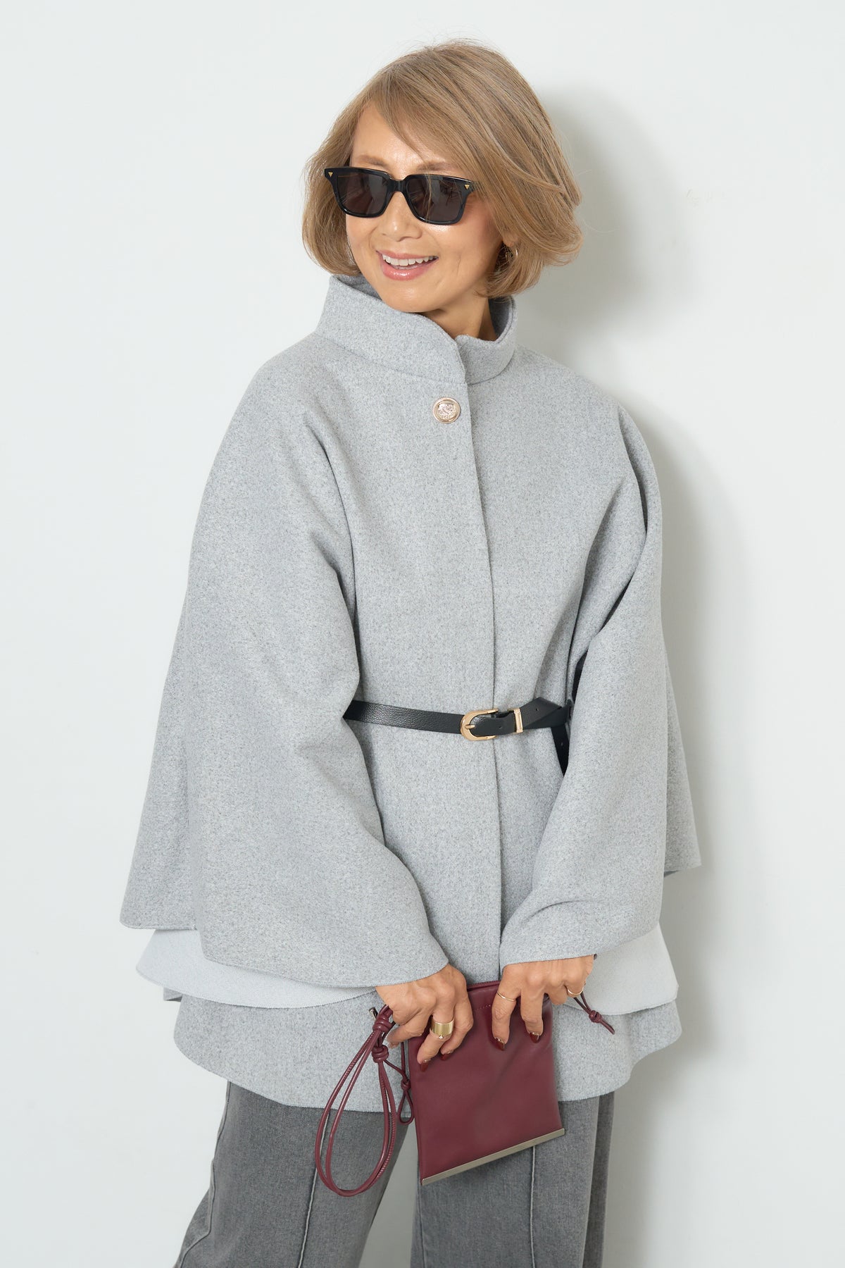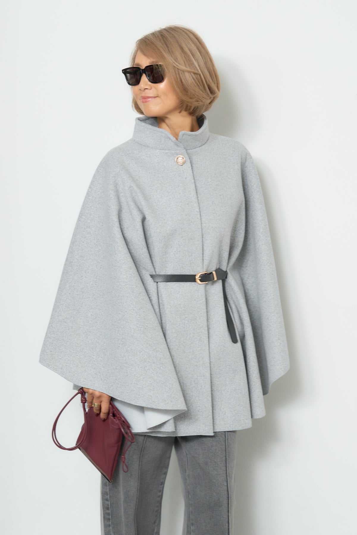 上品なスタンドカラーが印象的なケープコート。ゆったりと広がるシルエットで、羽織るだけで洗練された雰囲気を纏えます。フロントのボタンと華奢なウエストベルトが程よいアクセントとなり、シルエットに変化をつけて着用可能。柔らかく滑らかな素材感で快適な着心地を叶えつつ、軽やかに仕上げられているため、デイリーから特別なお出かけまで幅広く活躍します。