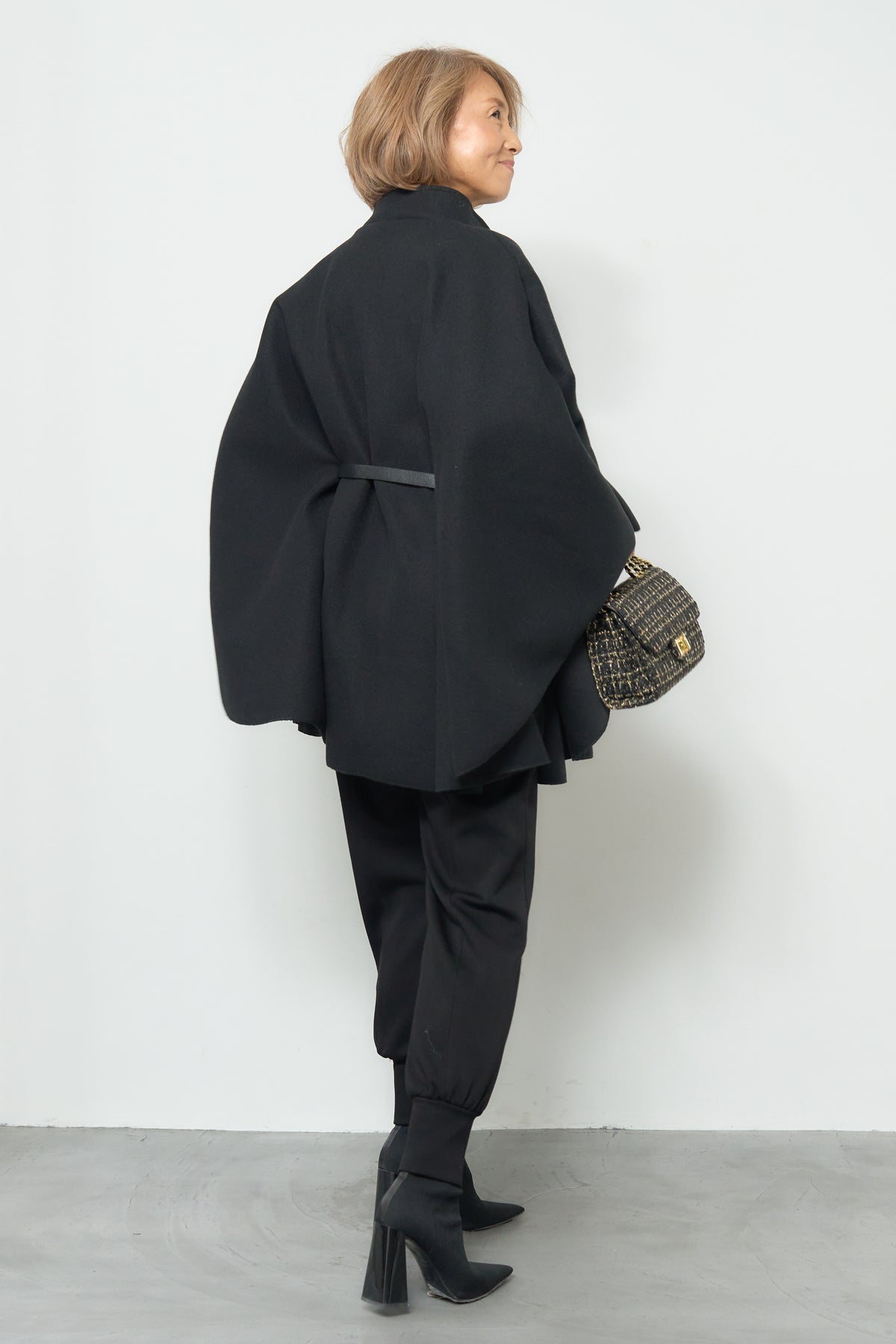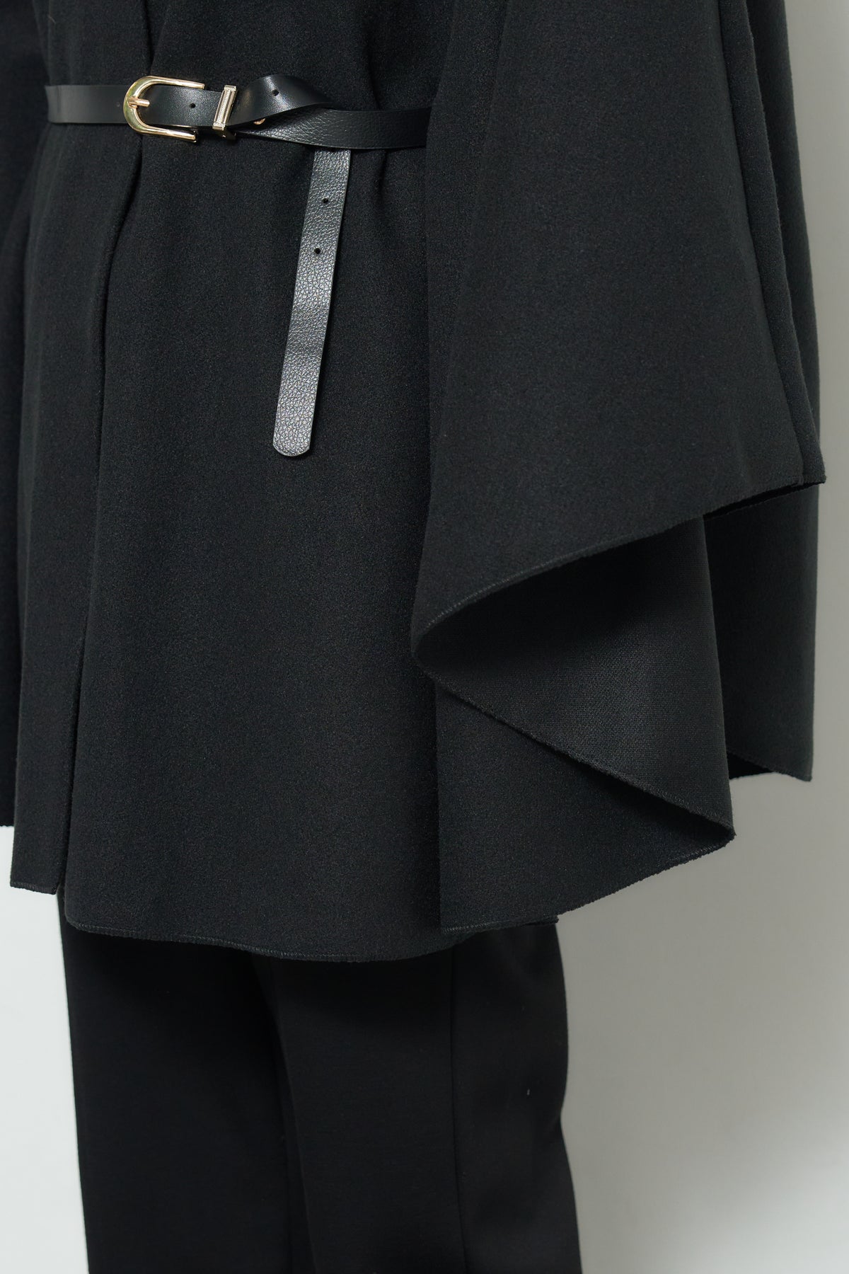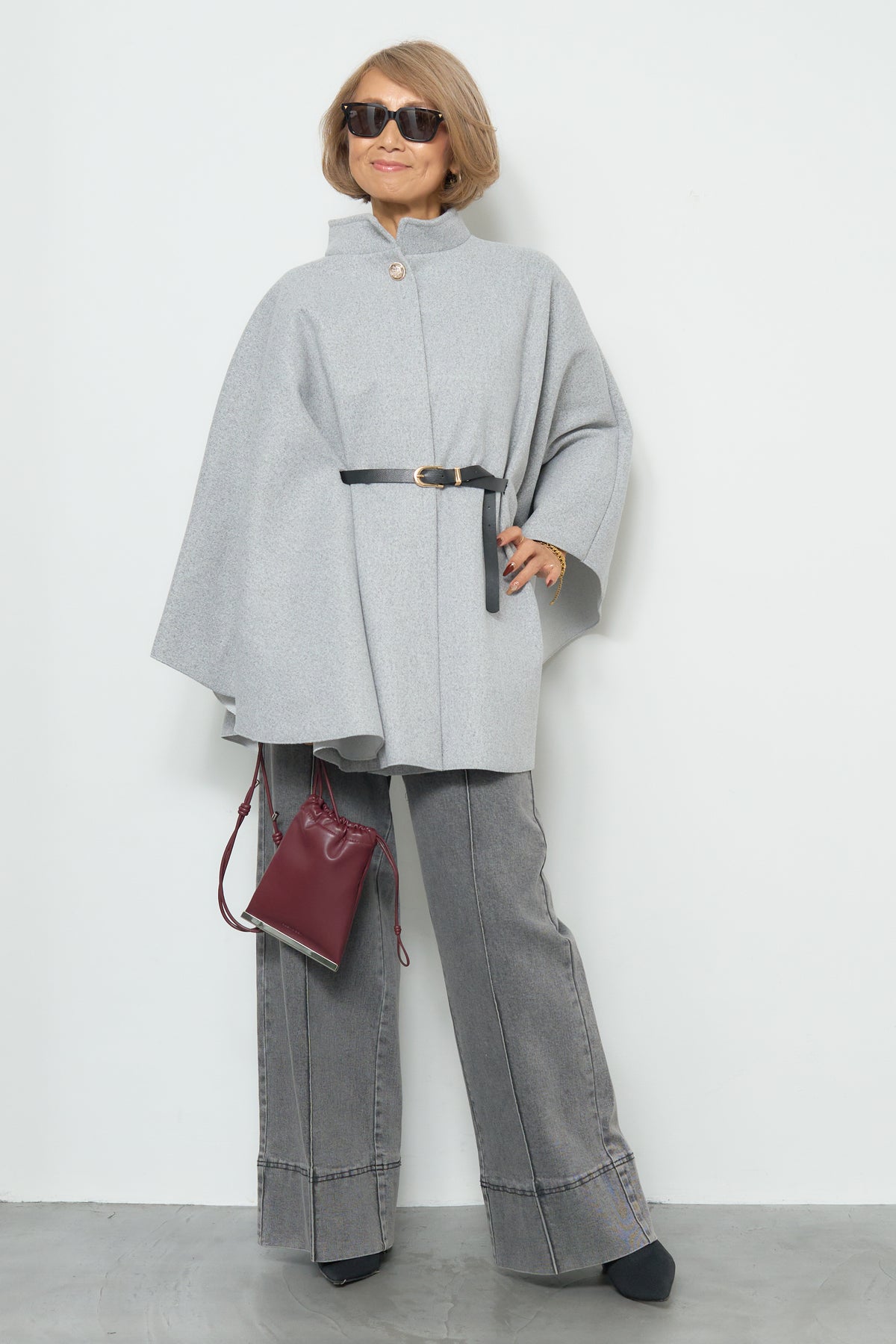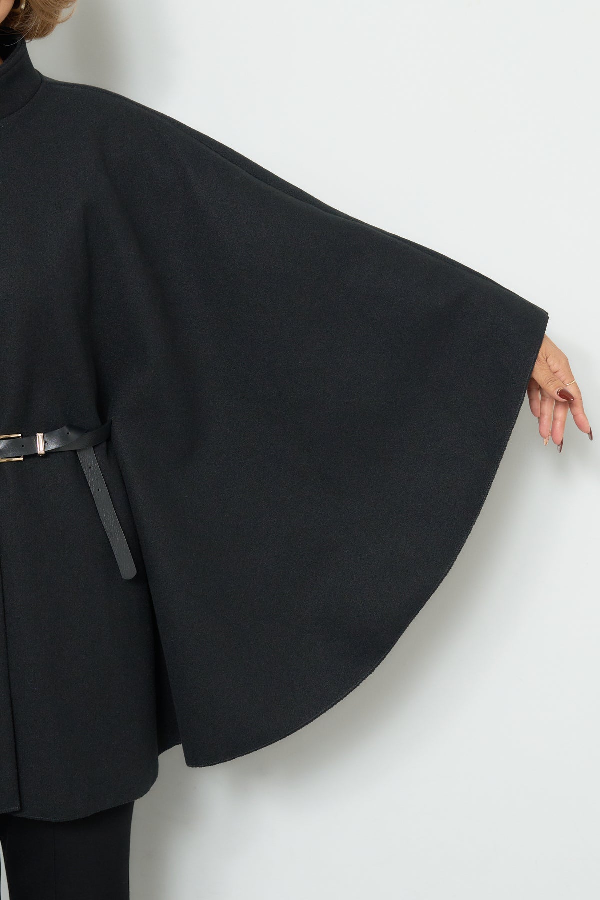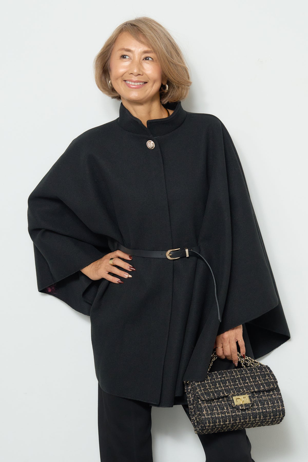 上品なスタンドカラーが印象的なケープコート。ゆったりと広がるシルエットで、羽織るだけで洗練された雰囲気を纏えます。フロントのボタンと華奢なウエストベルトが程よいアクセントとなり、シルエットに変化をつけて着用可能。柔らかく滑らかな素材感で快適な着心地を叶えつつ、軽やかに仕上げられているため、デイリーから特別なお出かけまで幅広く活躍します。