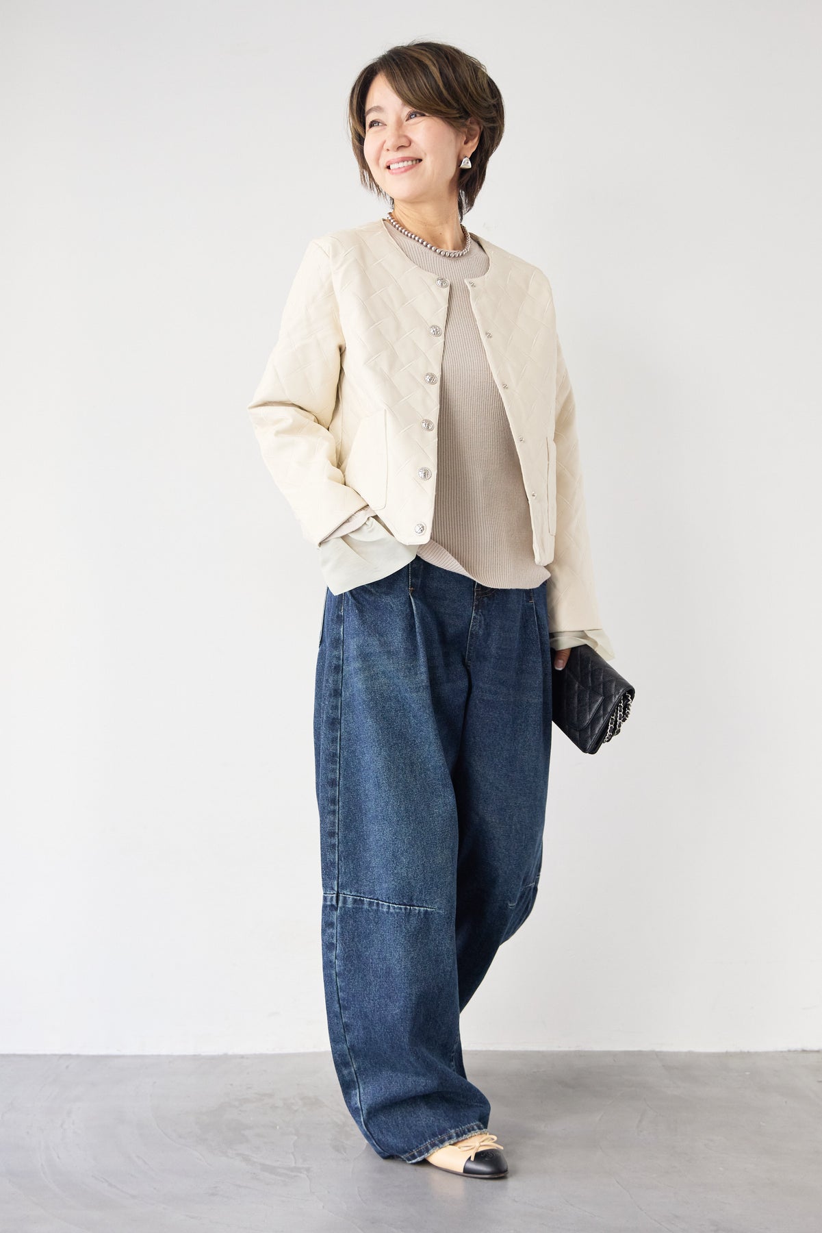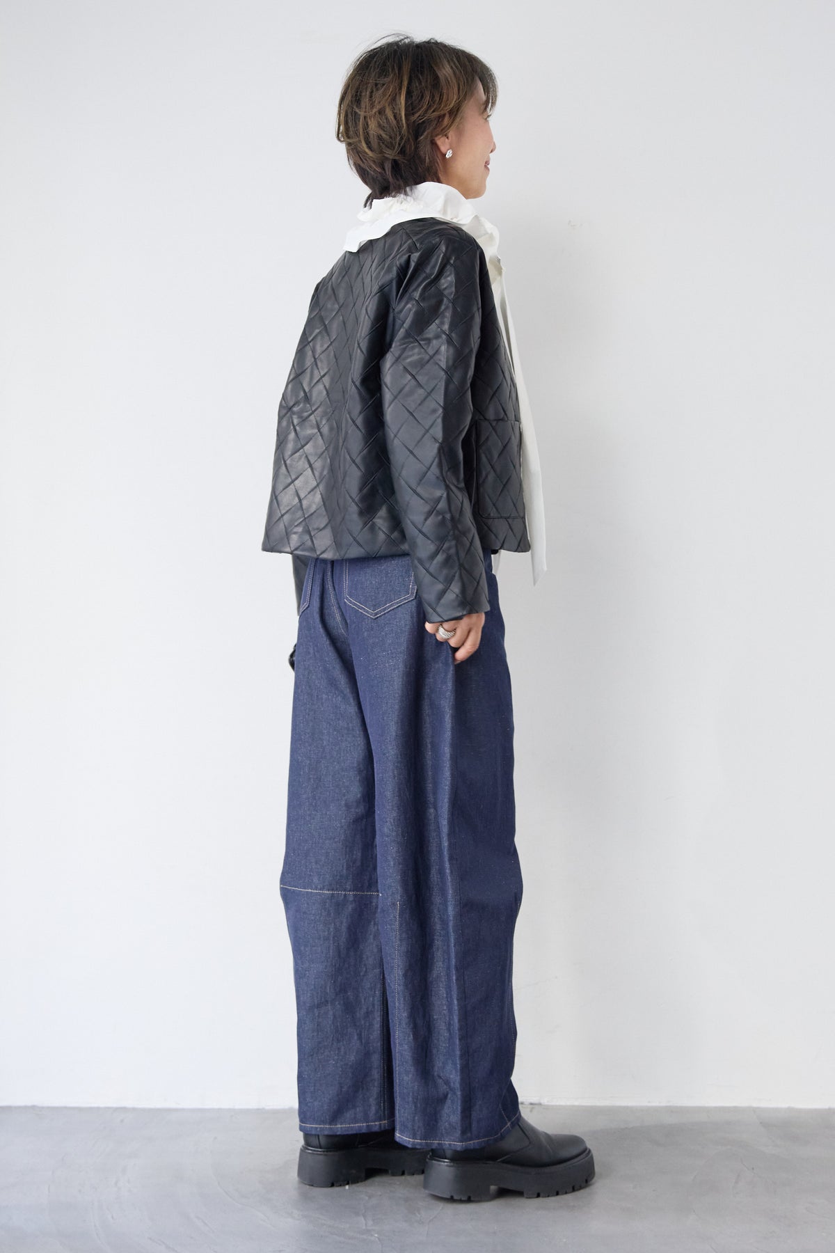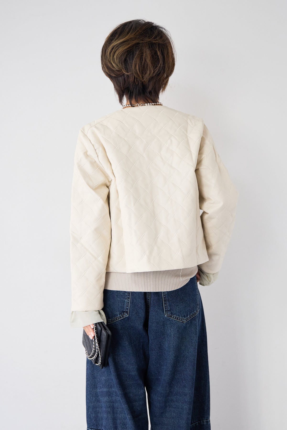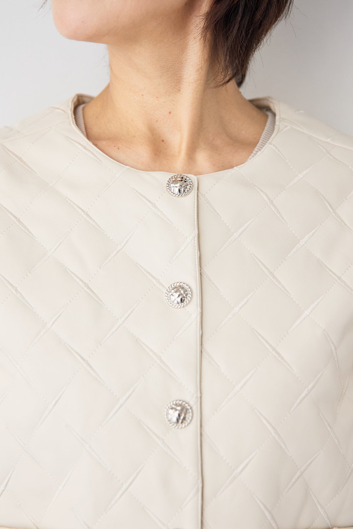 上品さとカジュアル感を兼ね備えた、大人のためのキルティングフェイクレザージャケット。ダイヤ柄のキルティング加工が施されたフェイクレザー素材は、程よい艶感と立体感があり、コーディネートにさりげない高級感をプラスします。ノーカラーデザインですっきりとした印象に仕上げており、インナーを選ばず着回しやすいのも魅力。フロントには存在感のあるメタルボタンをあしらい、シンプルながらもアクセントの効いたデザインに。コンパクトすぎない程よいシルエットで、パンツにもスカートにもバランス良く合わせていただけます。裏地付きで着脱しやすく、軽やかな着心地もポイント。季節の変わり目や、さっと羽織りたいシーンに活躍する一着です。