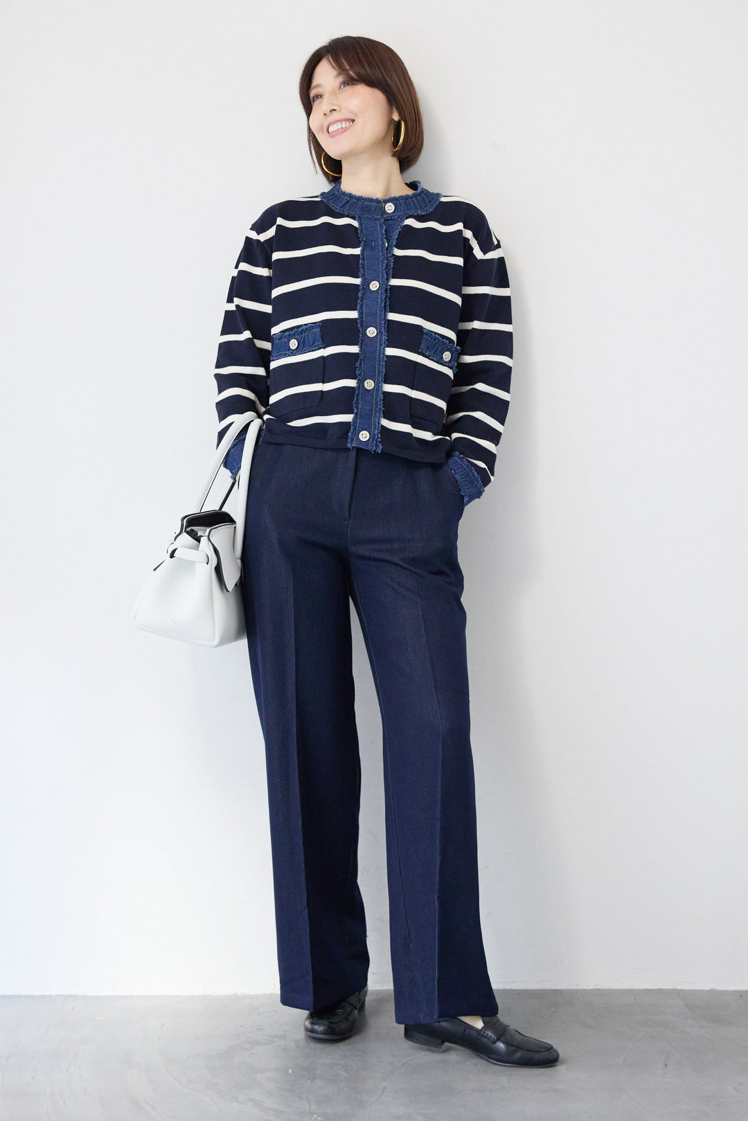 [SET]フリンジデニムライン ボーダーカーディガン+ダンガリーセンタープレスパンツ(2set)