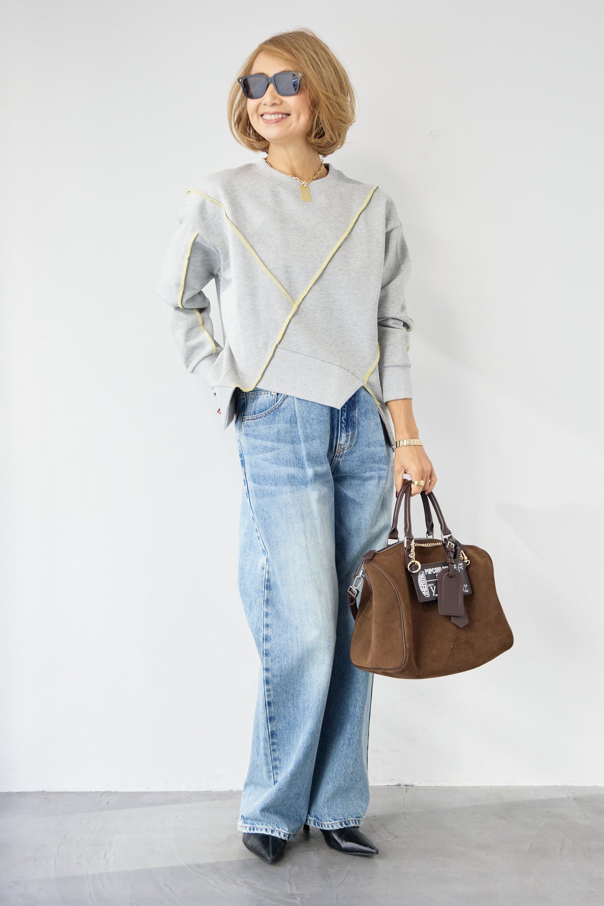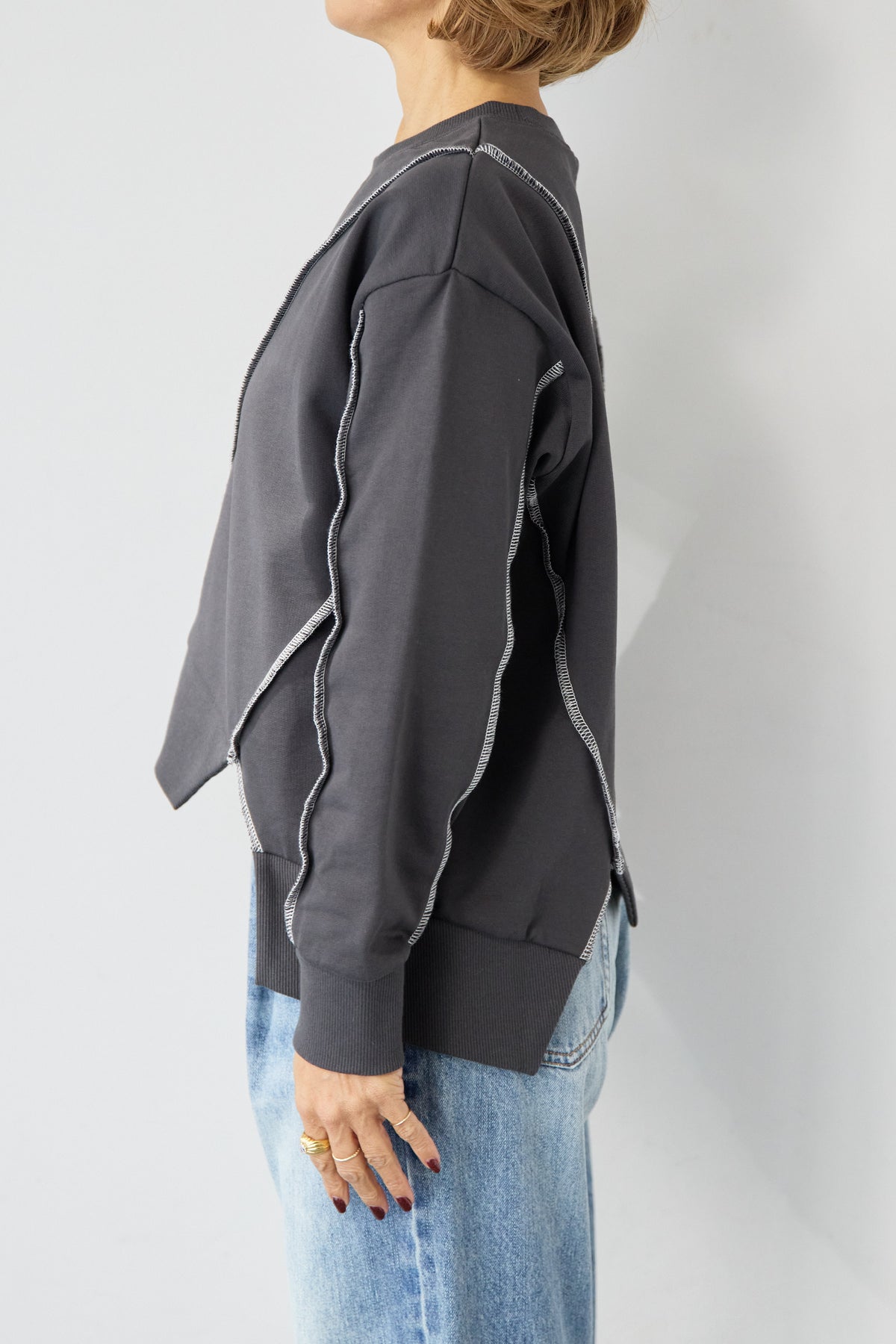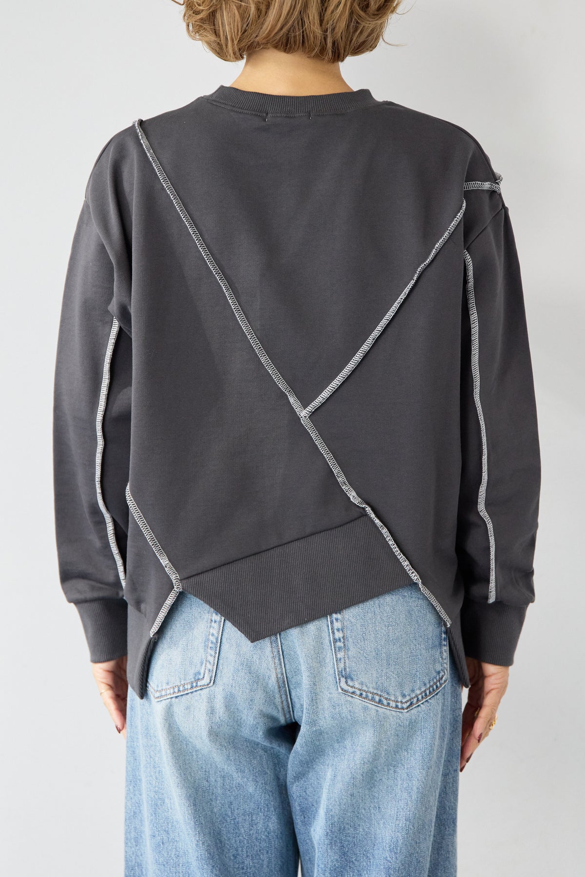 遊び心のあるデザインが目を惹く、アウトシーム・配色ステッチプルオーバー。あえて縫い代を外側に出した「アウトシーム」デザインと、コントラストの効いた配色ステッチが、単調になりがちなスウェットスタイルにモダンでエッジの効いたアクセントを添えます。フロントやバックに大胆に施されたアシンメトリーなステッチラインが、視覚的な変化を生み出し、どの角度から見ても洗練された印象に。