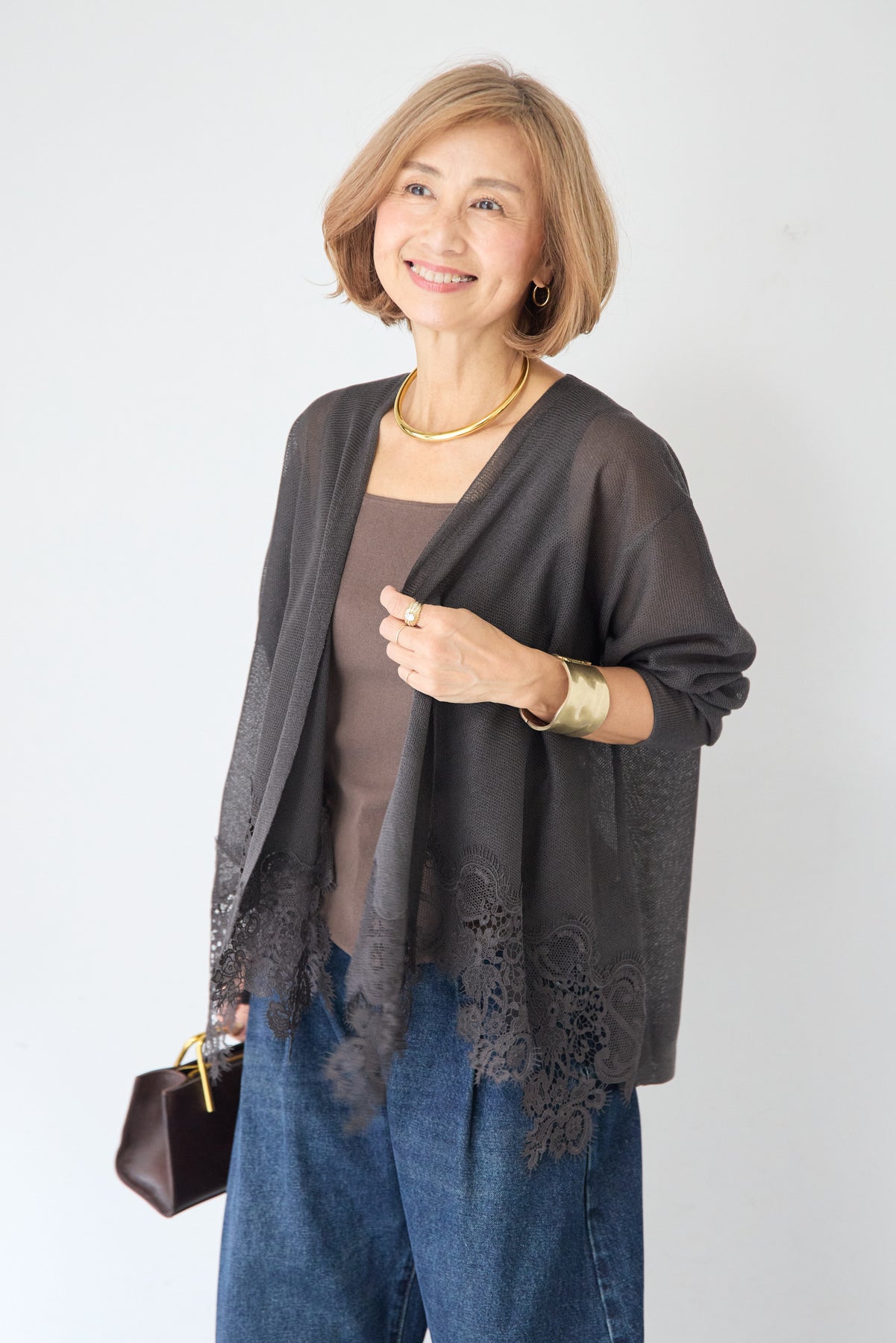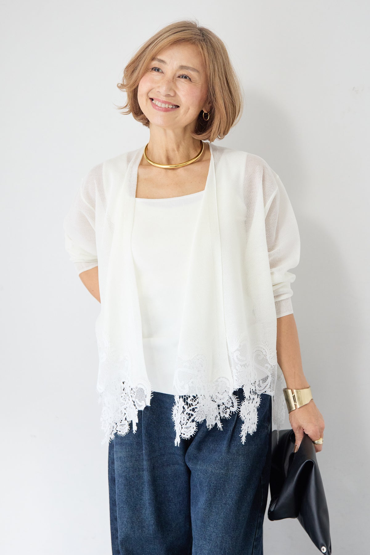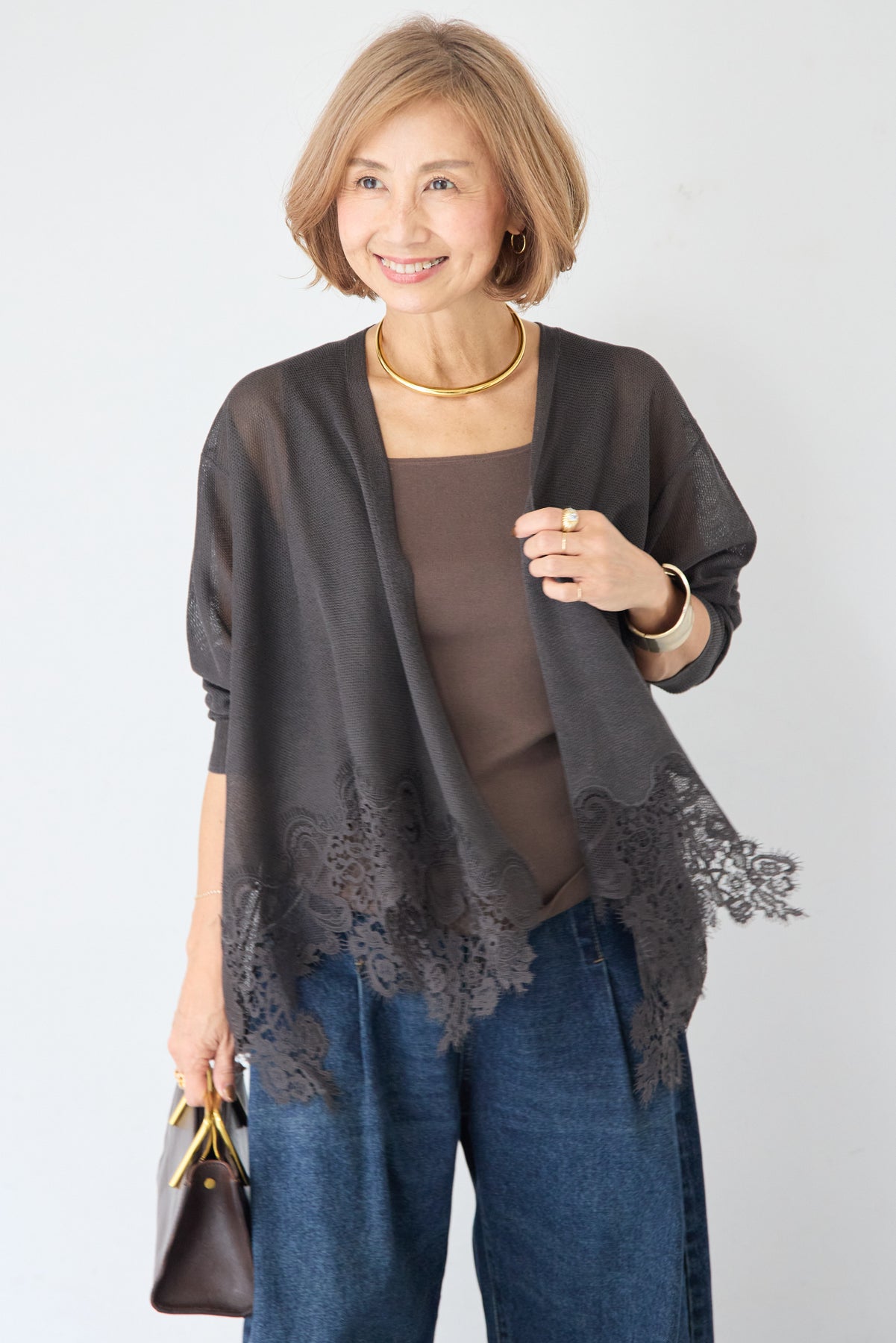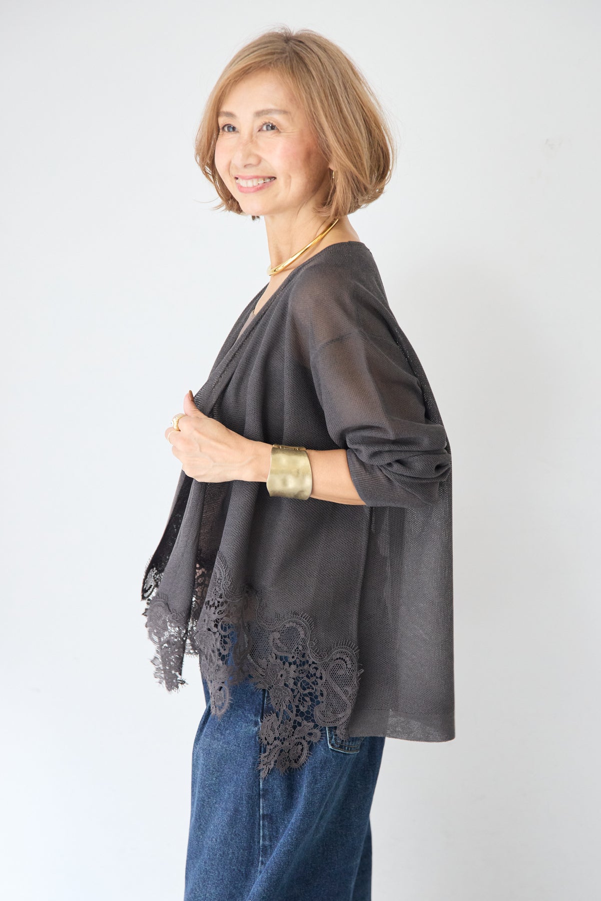 さらりと羽織るだけで縦のラインを強調し、スタイルアップ効果も期待できます。デニムでカジュアルダウンしたり、ワンピースに合わせてフォーマルなシーンに活用したりと、幅広い着こなしにマッチする一着です。
