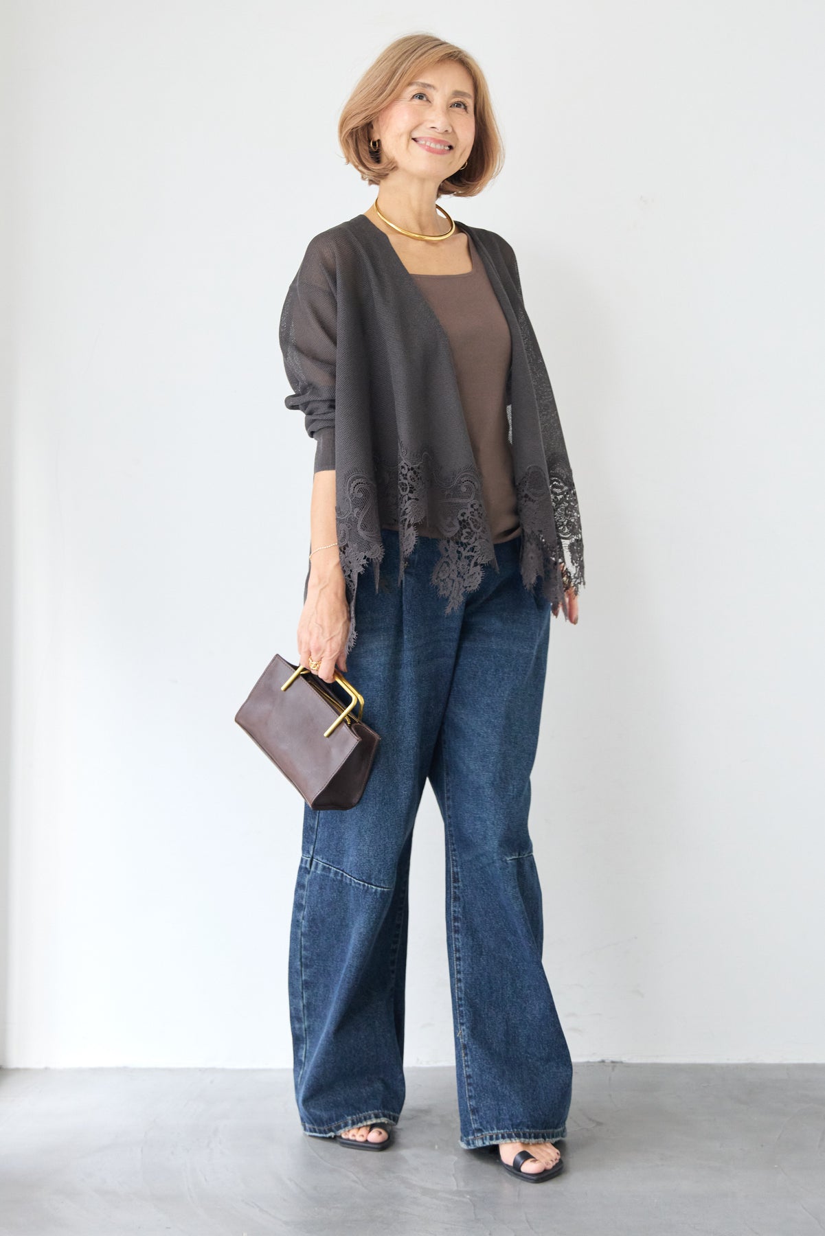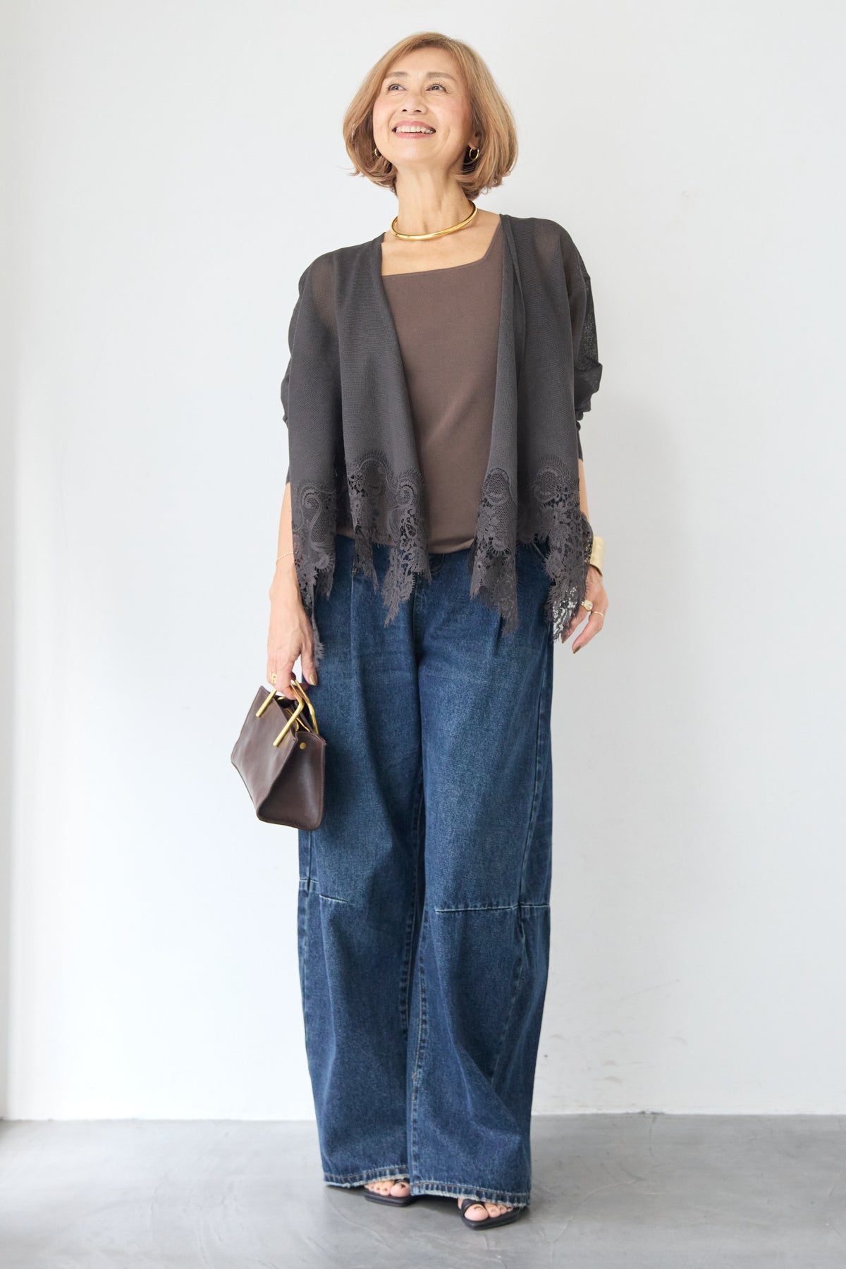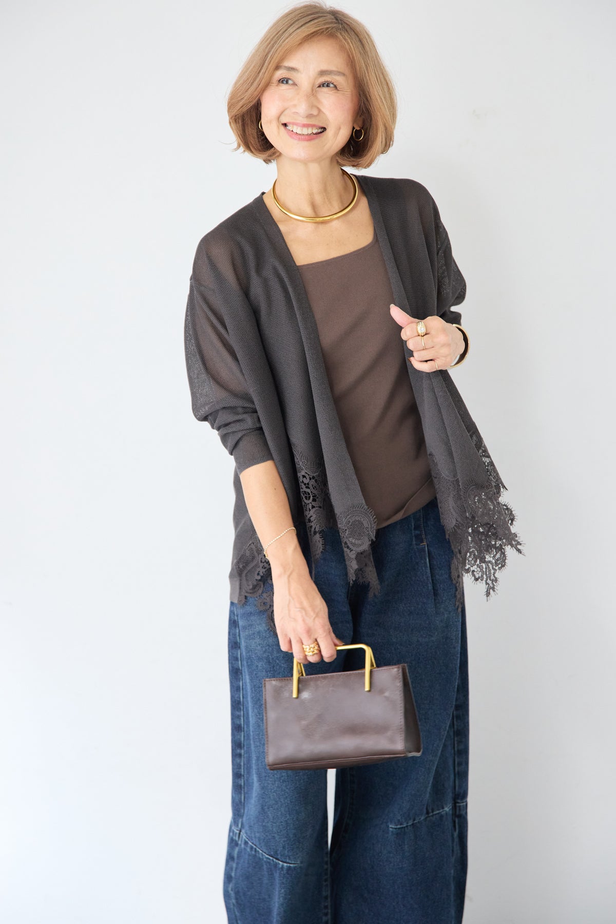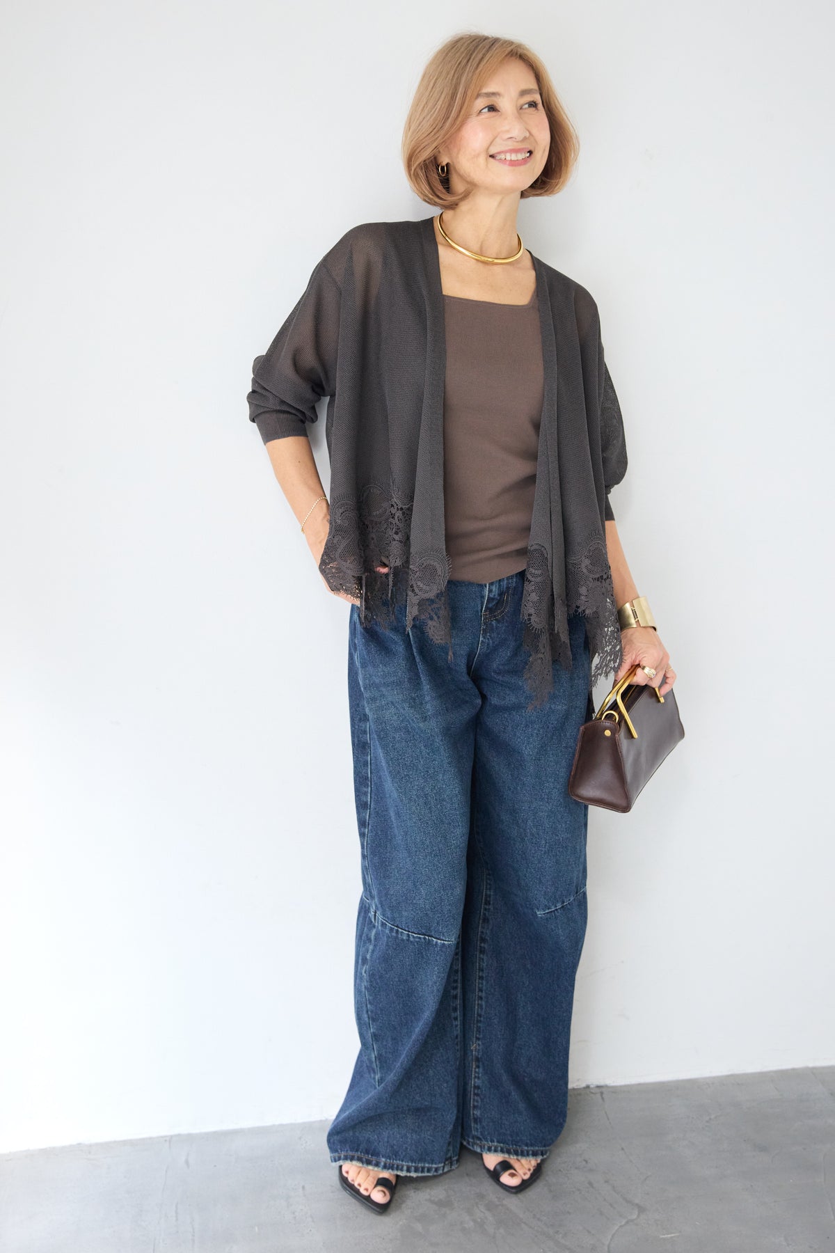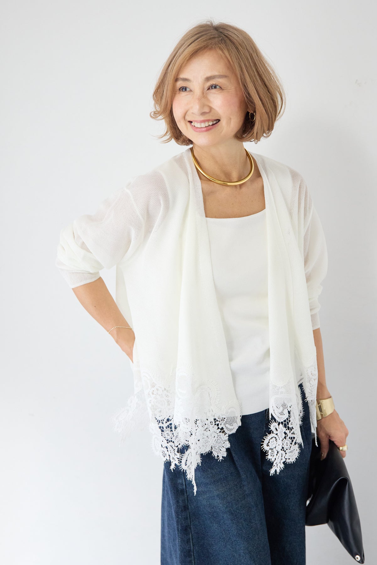 さらりと羽織るだけで縦のラインを強調し、スタイルアップ効果も期待できます。デニムでカジュアルダウンしたり、ワンピースに合わせてフォーマルなシーンに活用したりと、幅広い着こなしにマッチする一着です。