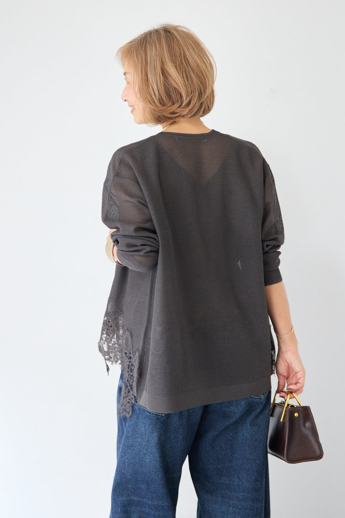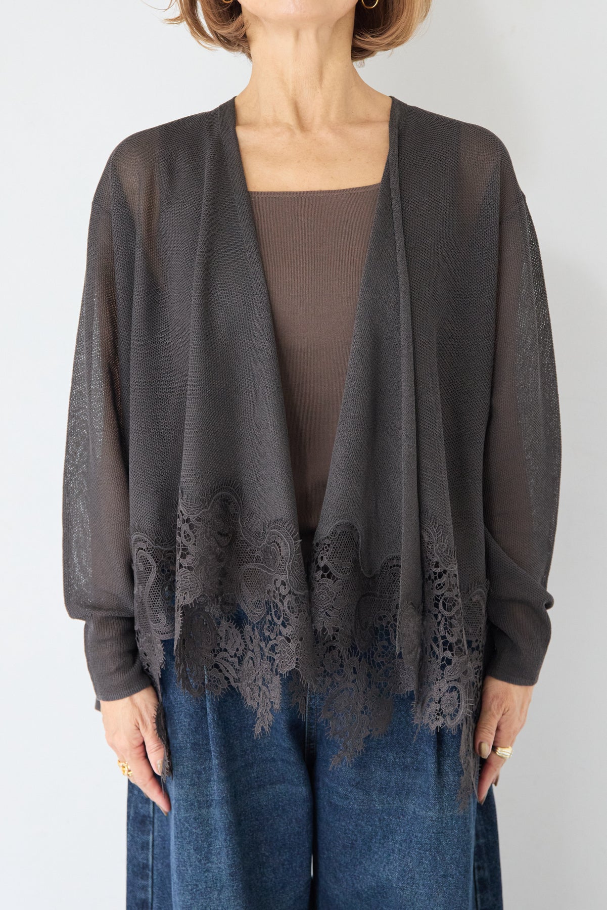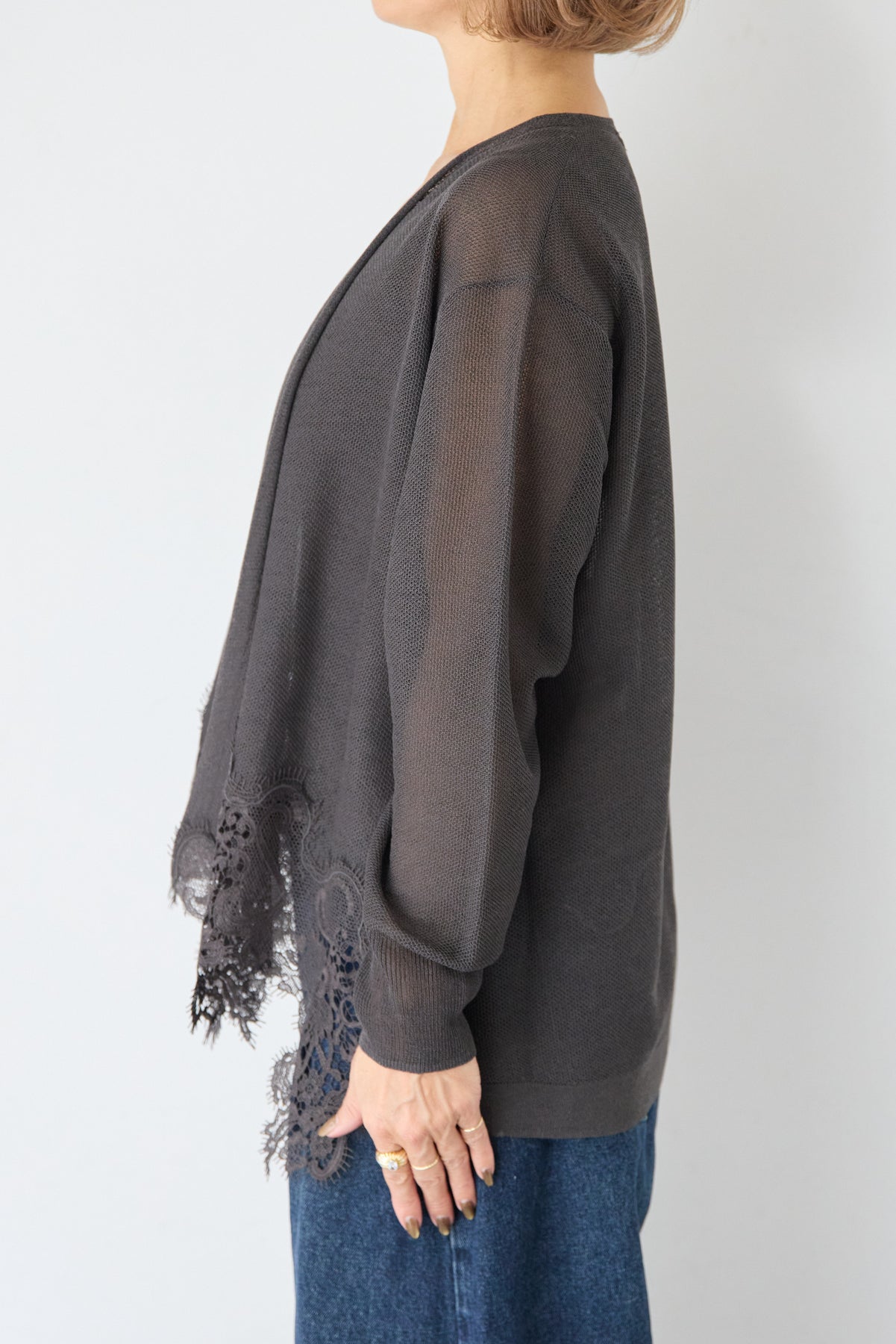 裾リバーレース切り替え シアーニットカーディガン