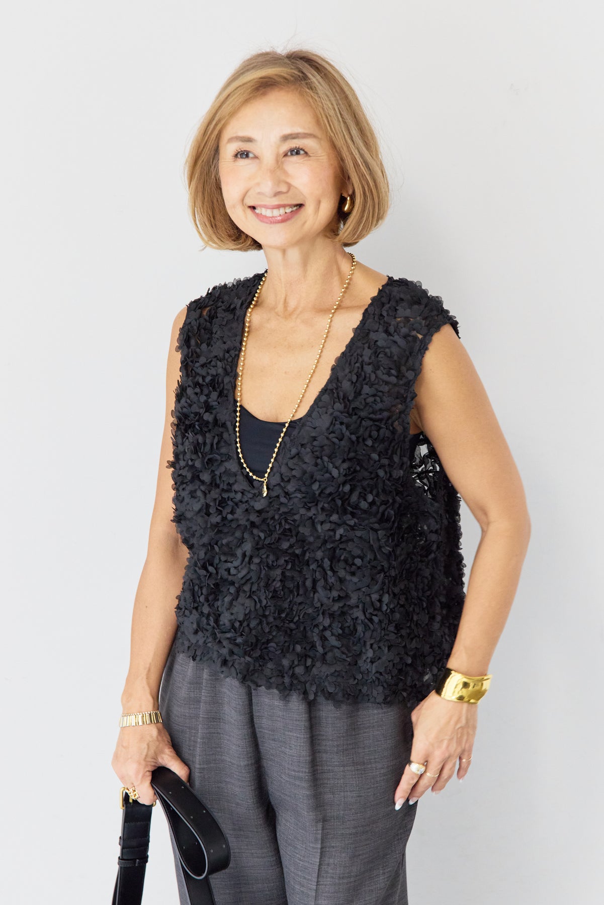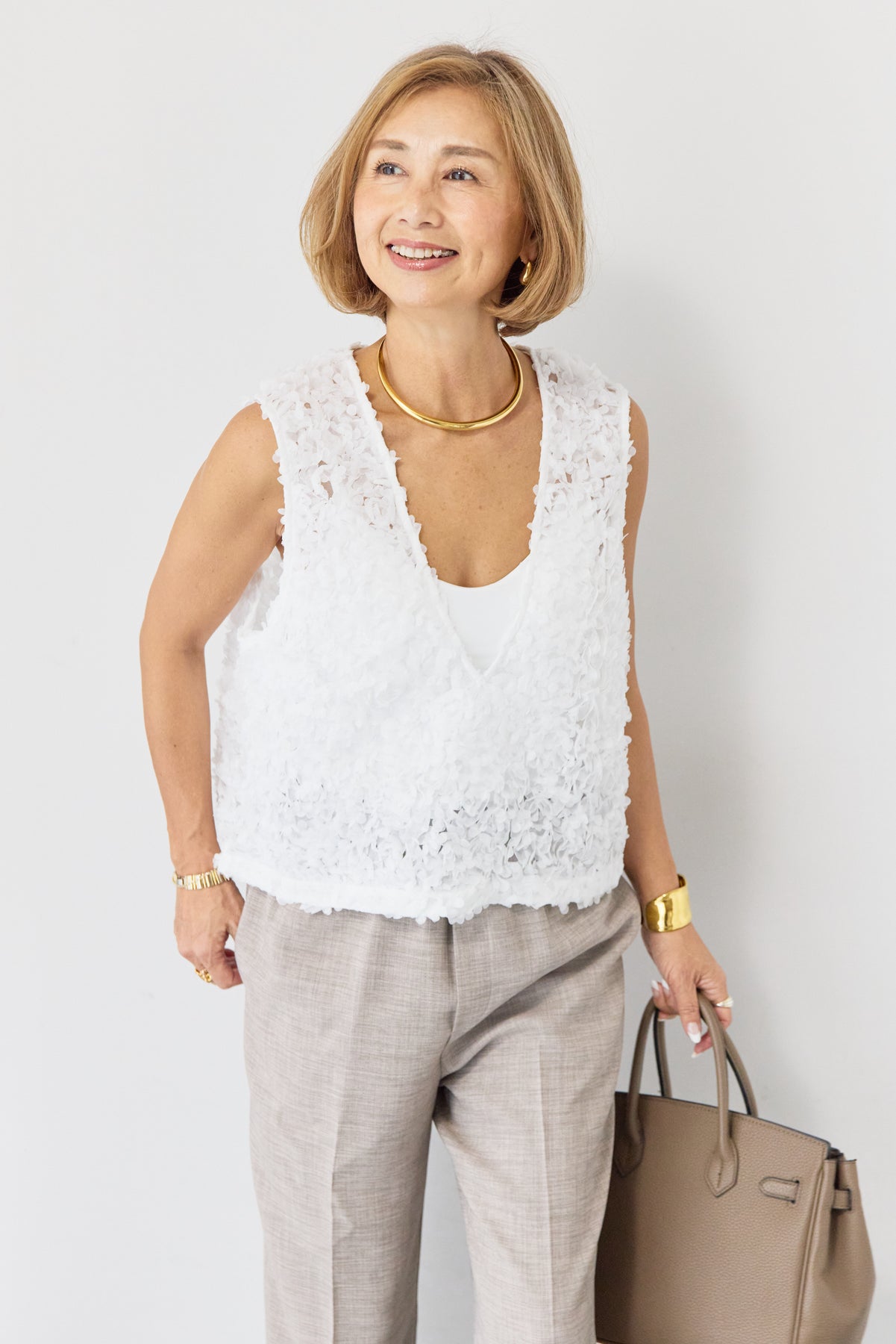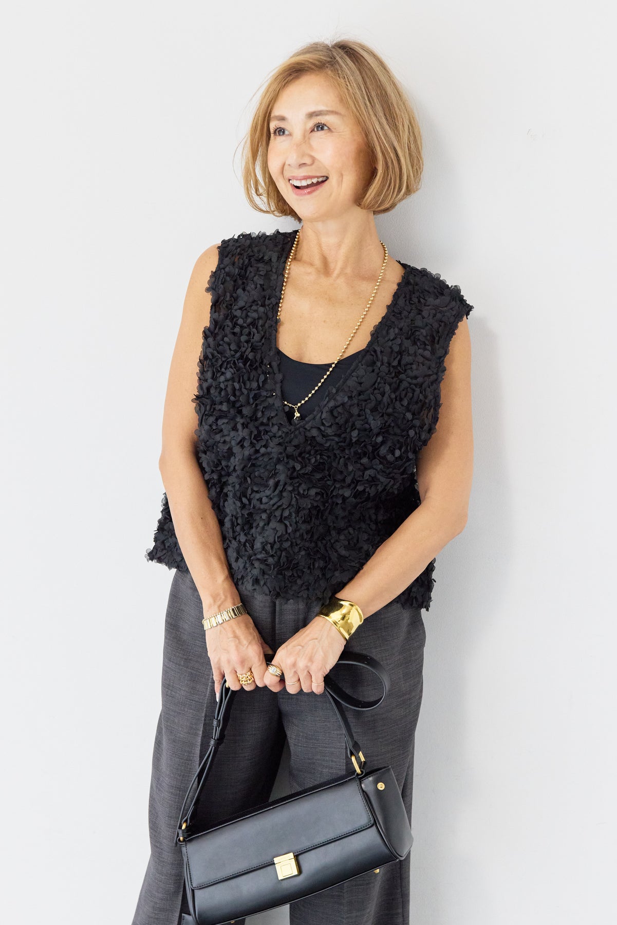 繊細なメッシュ生地に、花びらのような立体的なモチーフを贅沢にあしらったデザインベストです。 シンプルになりがちなカットソーやブラウスに重ねるだけで、奥行きのある洗練されたスタイリングが完成します。