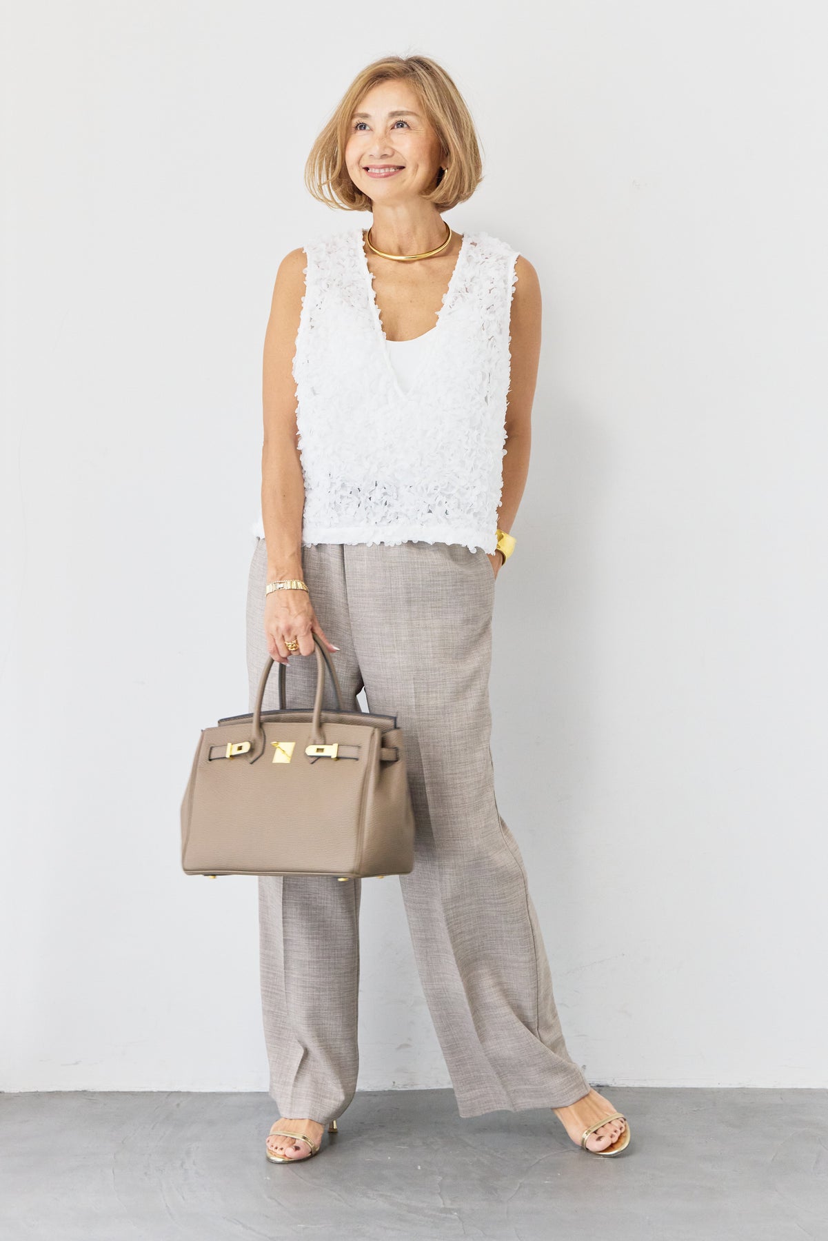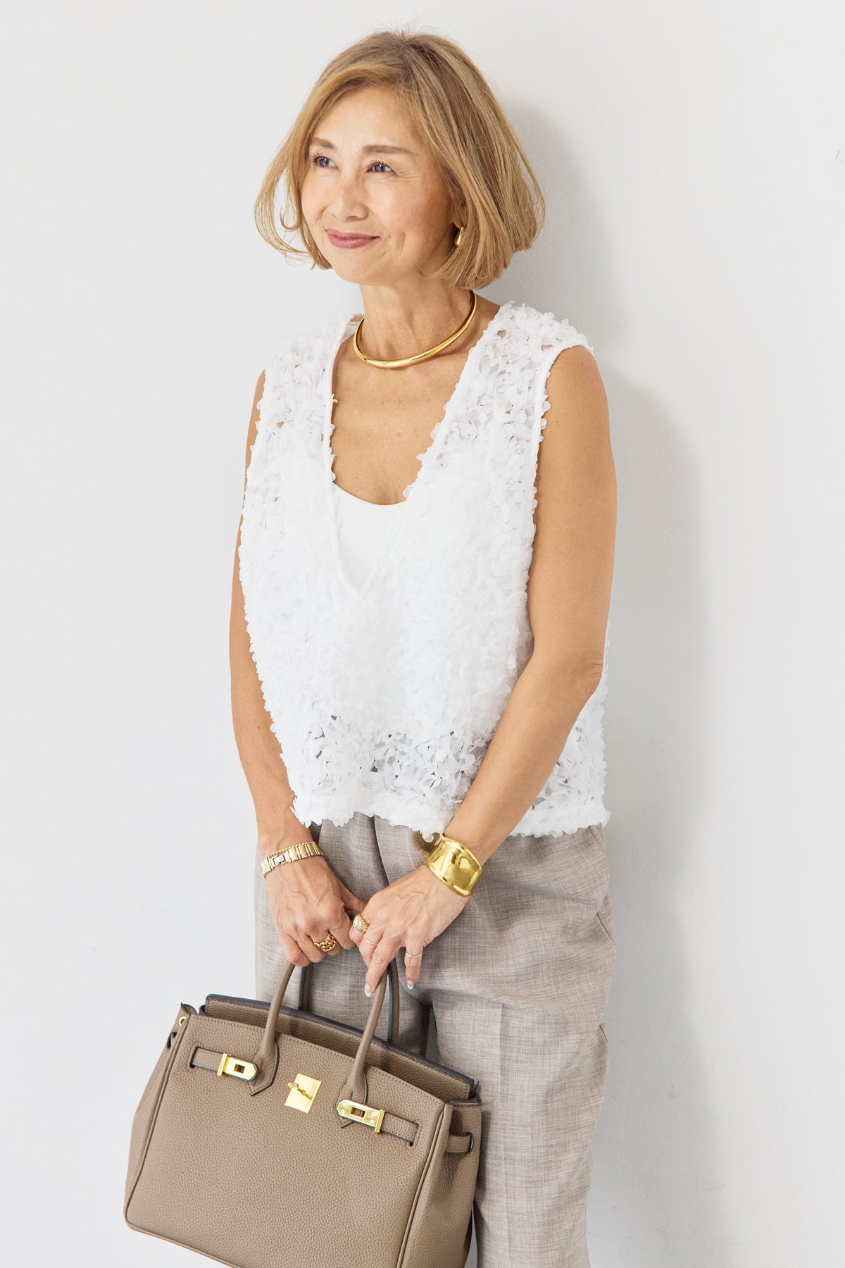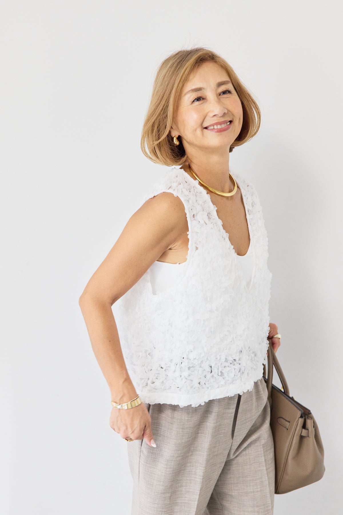 繊細なメッシュ生地に、花びらのような立体的なモチーフを贅沢にあしらったデザインベストです。 シンプルになりがちなカットソーやブラウスに重ねるだけで、奥行きのある洗練されたスタイリングが完成します。