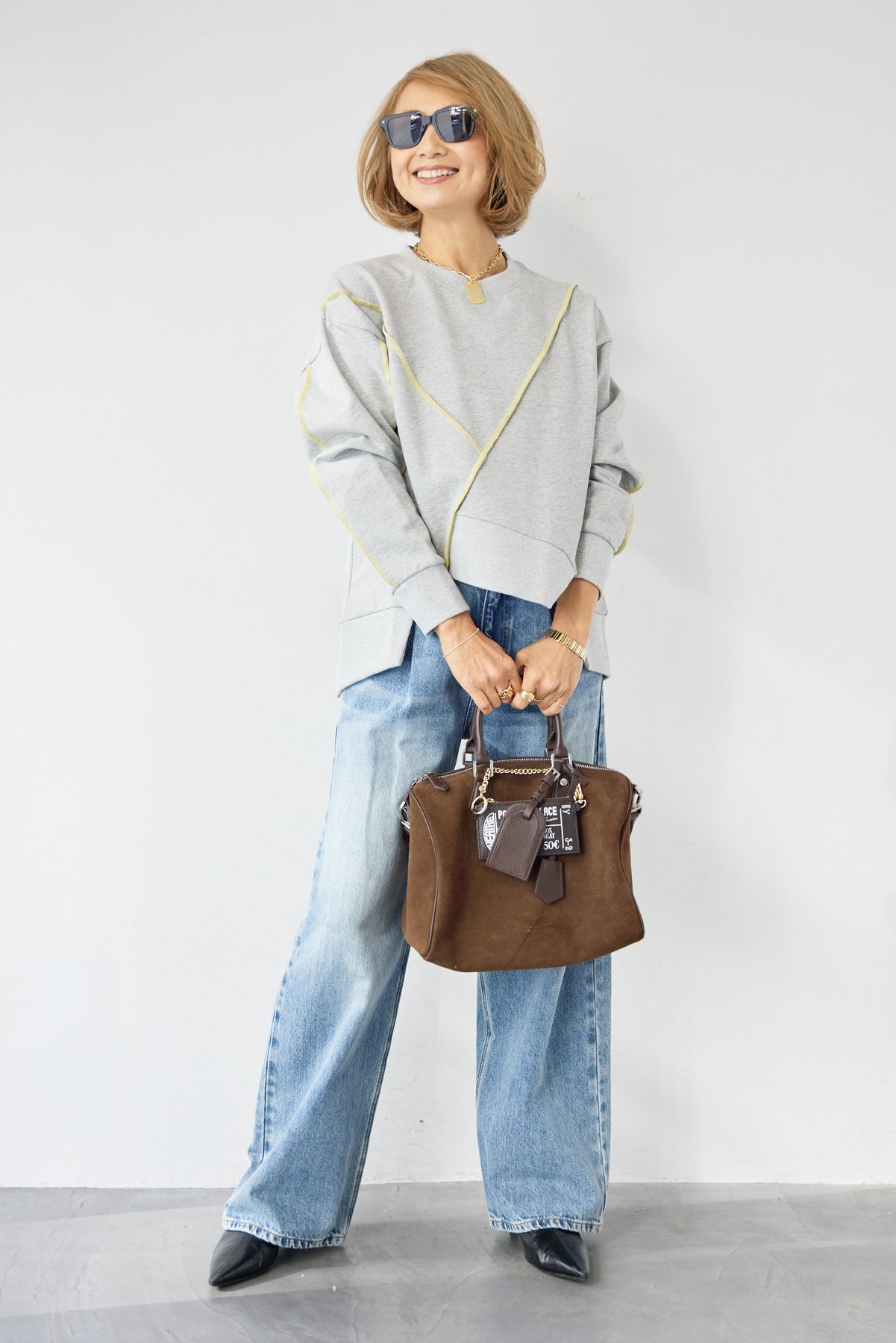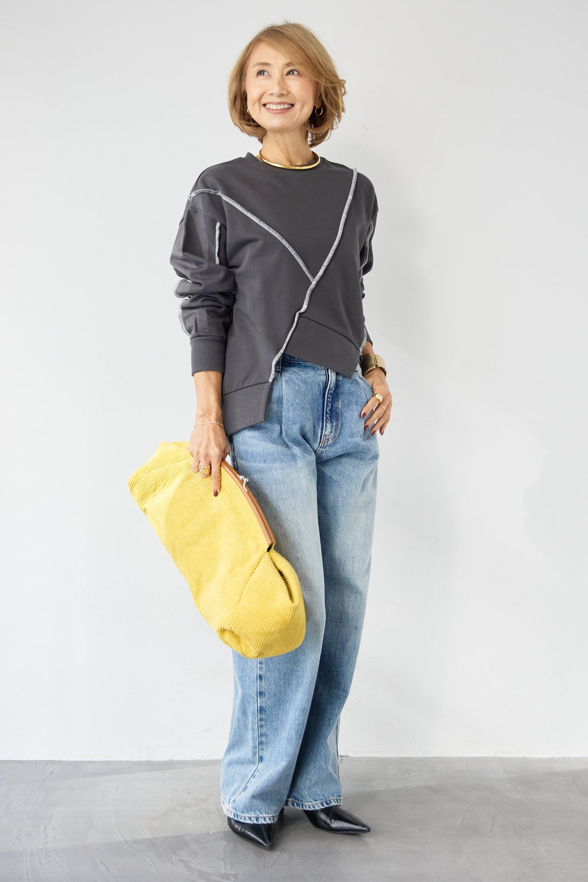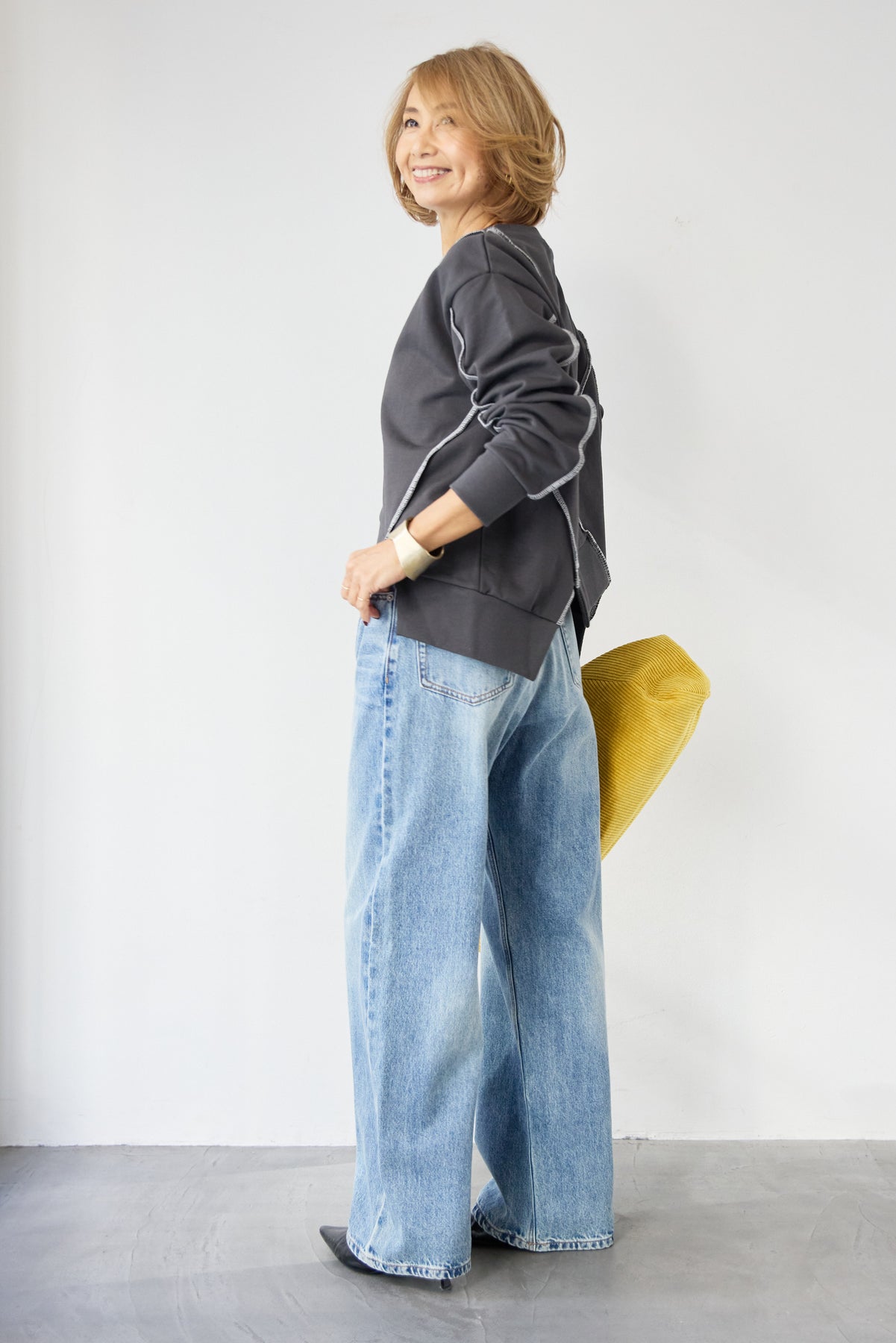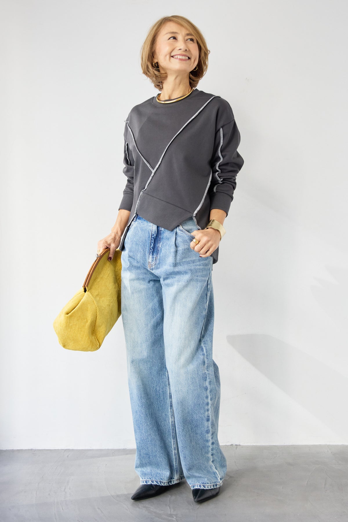 [SET]アウトシーム・配色ステッチプルオーバー+ウォッシャブルコクーンデニムパンツ(2set)