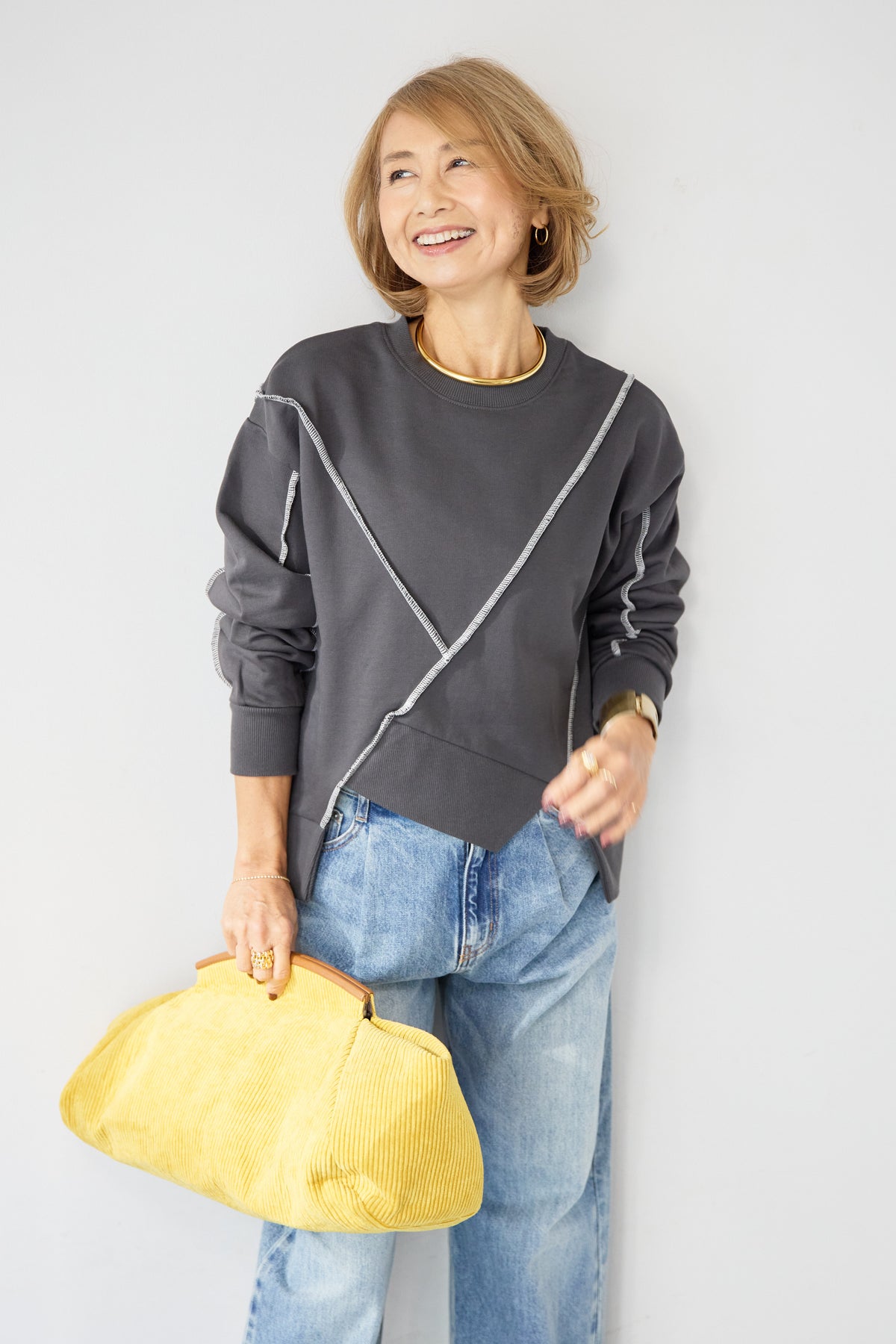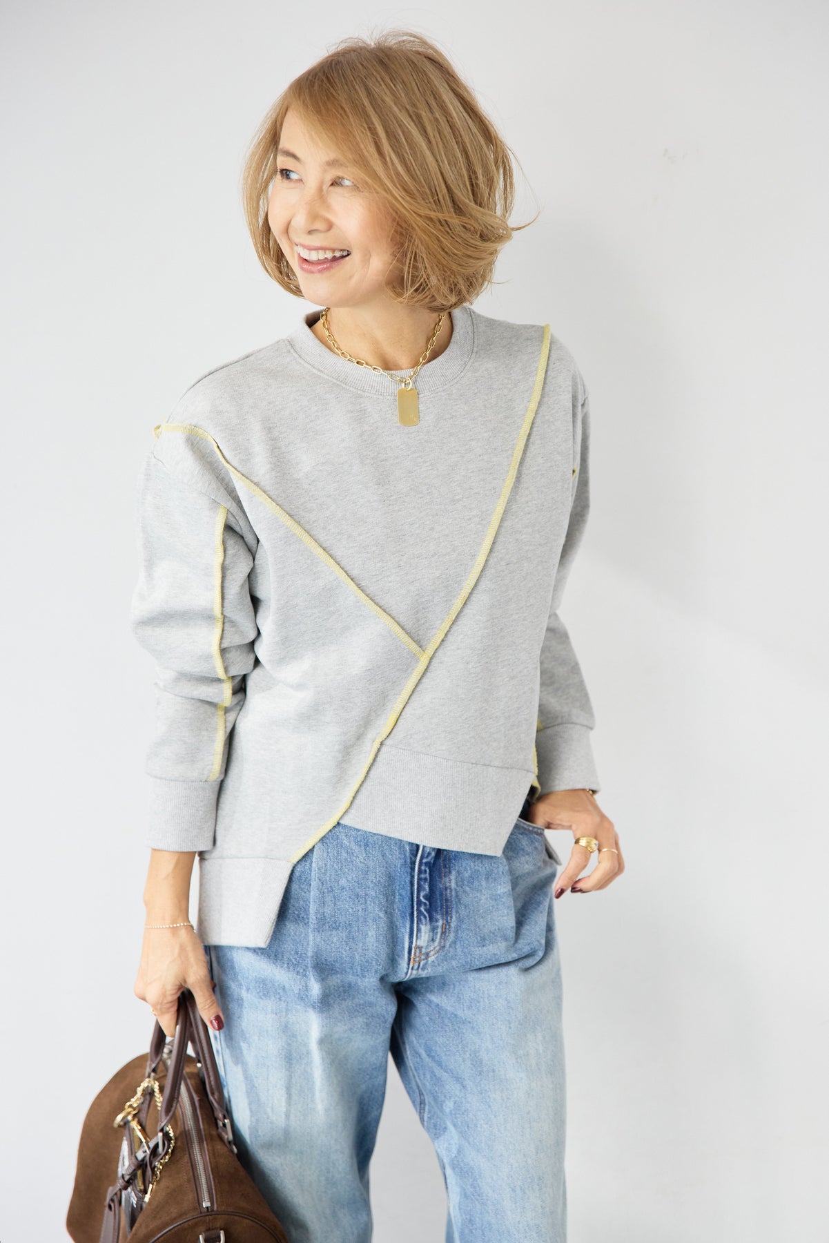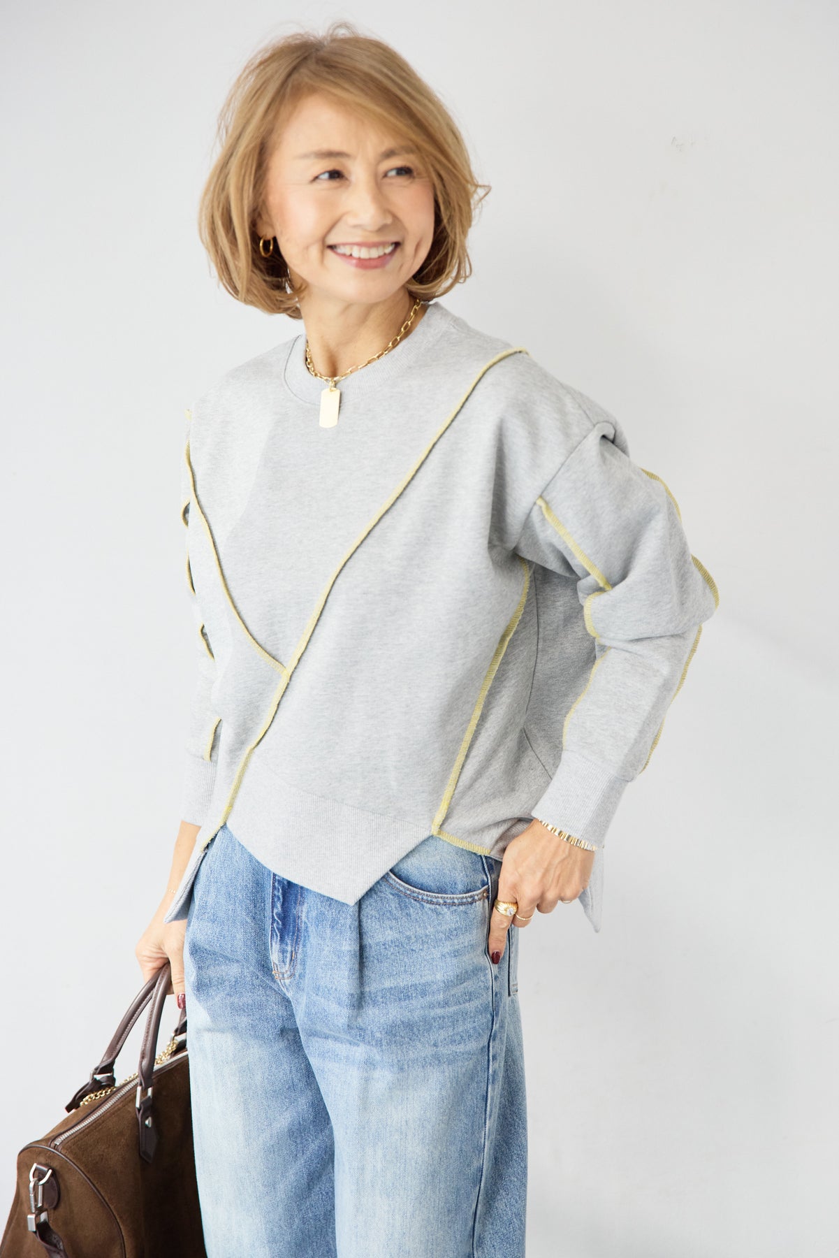 [SET]アウトシーム・配色ステッチプルオーバー+ウォッシャブルコクーンデニムパンツ(2set)