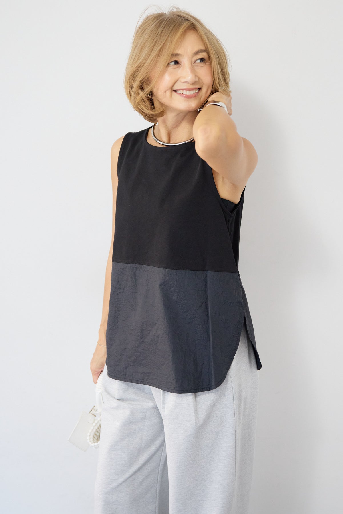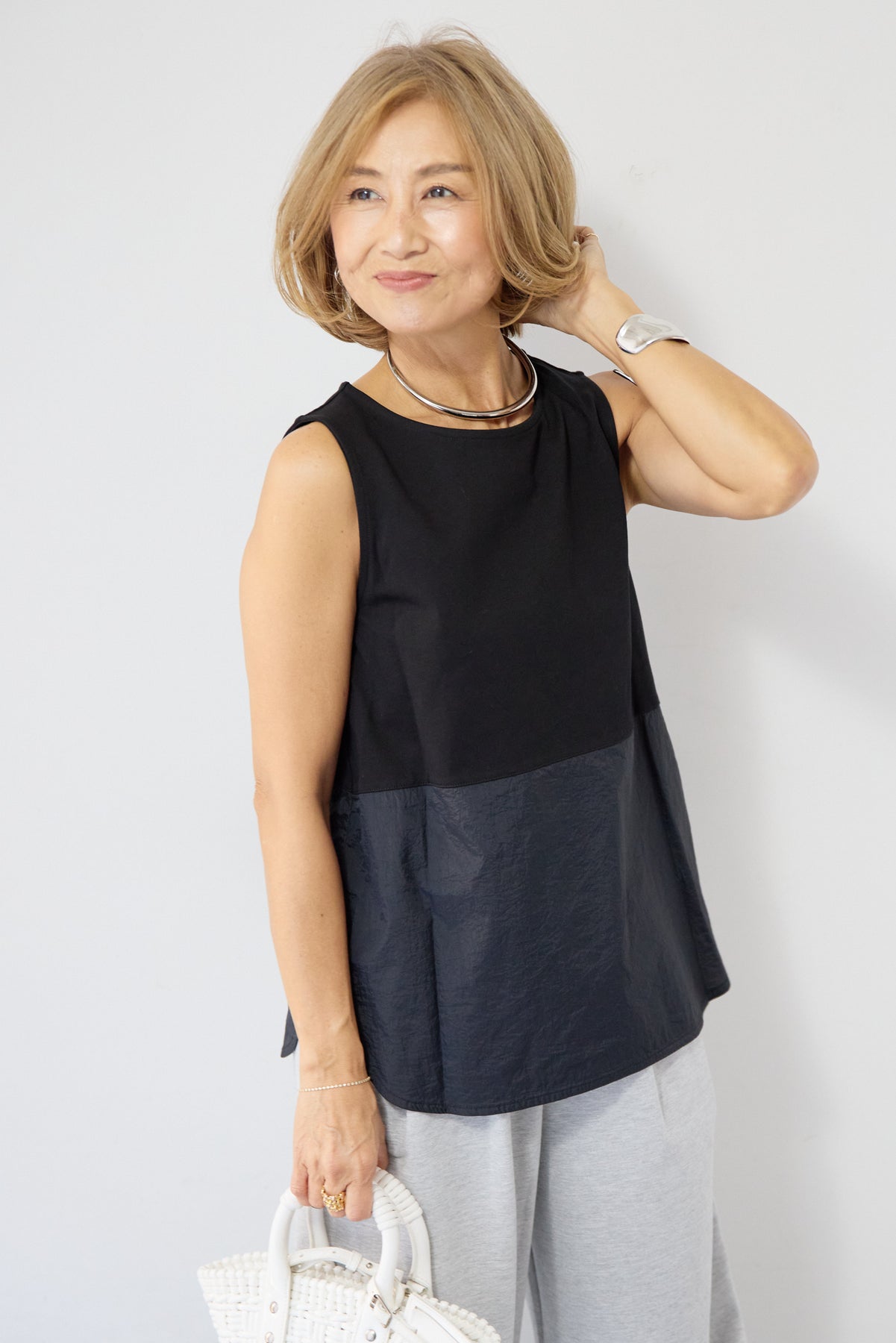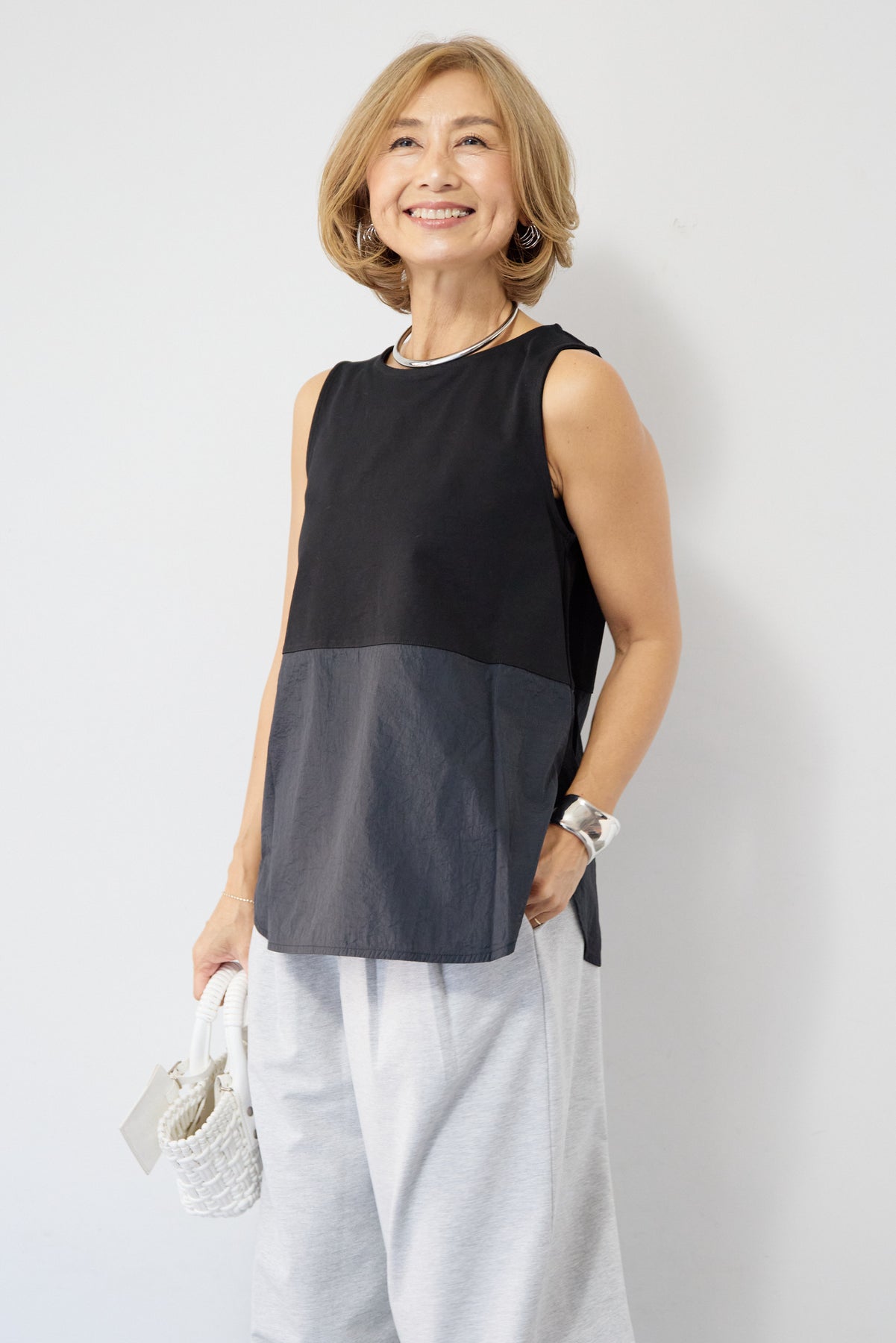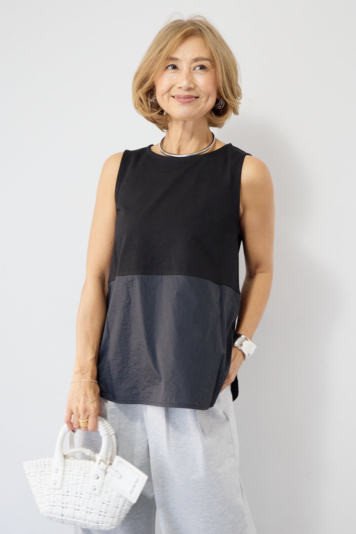 一枚で洗練されたレイヤード風スタイルが完成する、異素材コンビ・ノースリーブプルオーバー。上部には柔らかなカットソー素材、裾部分には軽やかなシャツ生地を組み合わせ、同系色のトーンでまとめながらも奥行きのある表情に仕上げました。体のラインを拾いすぎない程よいAラインシルエットが、気になる腰回りを自然にカバー。サイドに施された深めのラウンドスリットが、ボトムスとのバランスを整え、横顔にも軽やかな抜け感を演出します。詰まりすぎない絶妙なクルーネックデザインは、アクセサリーとの相性も抜群。シンプルなパンツ合わせでも手抜き感のない、大人のこなれスタイルを叶えてくれる一着です。インナーとしても、メインのトップスとしても、ロングシーズン着回しの利く万能アイテムです。