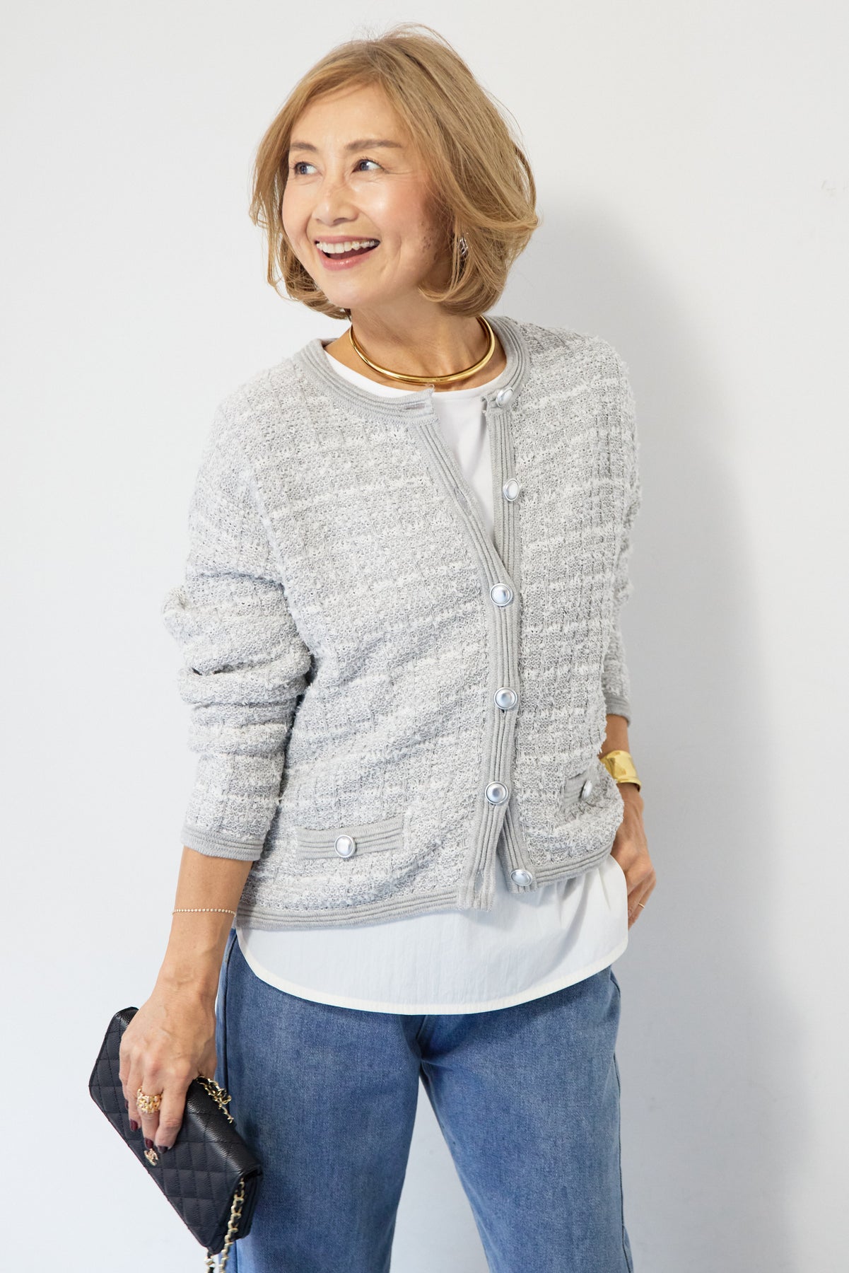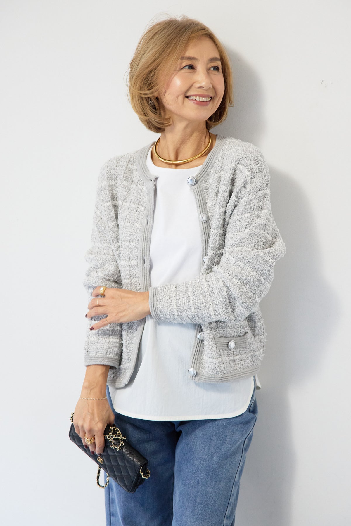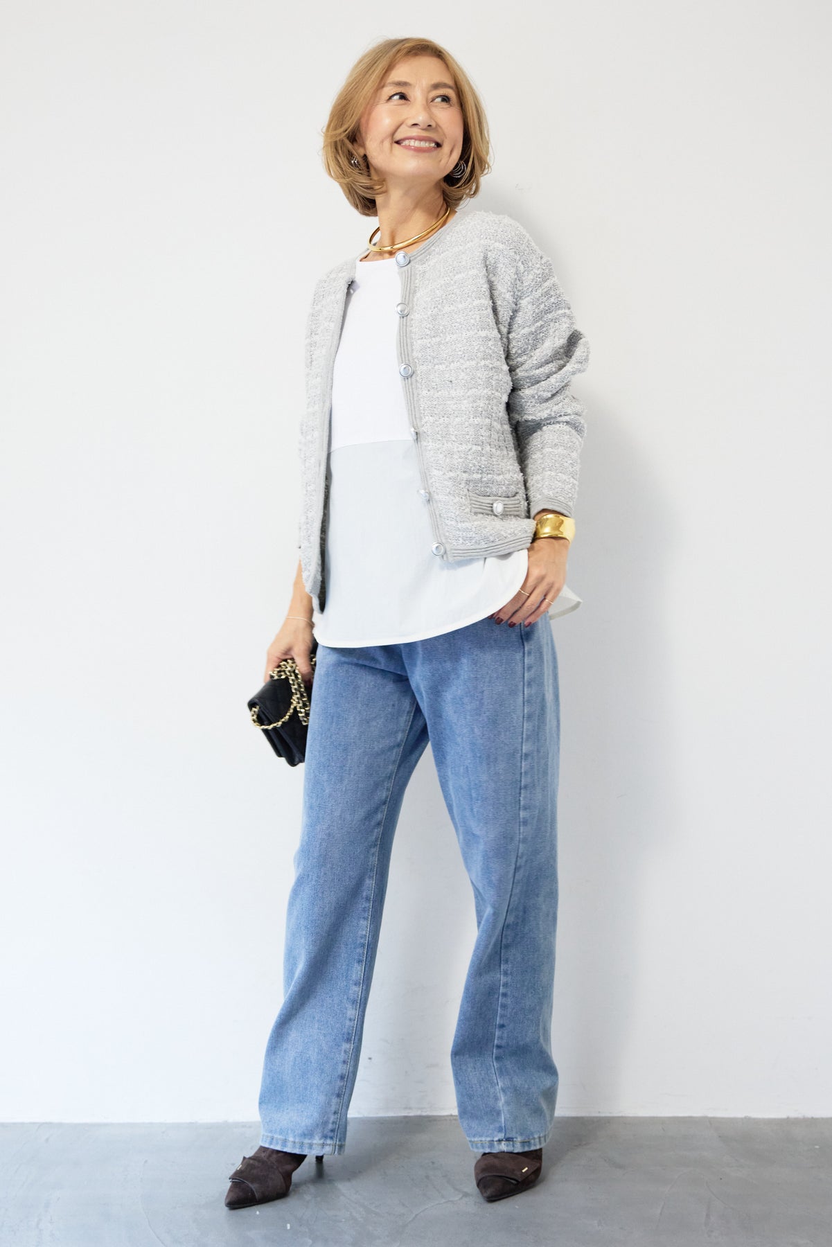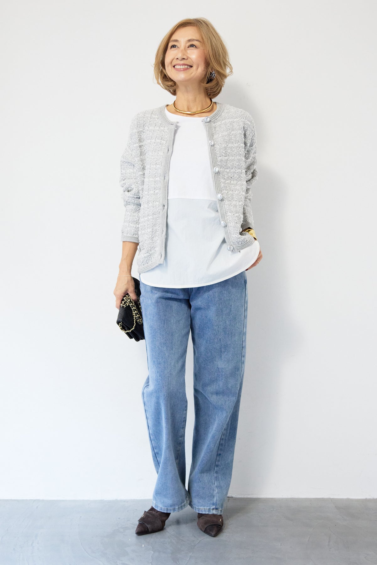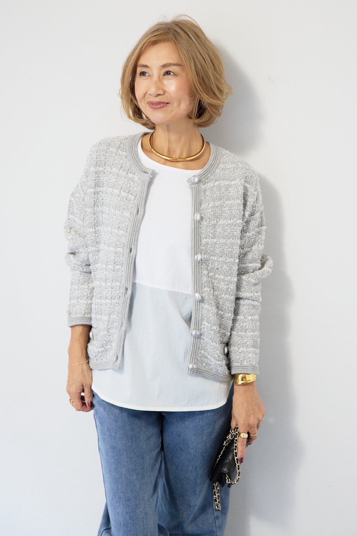 一枚で洗練されたレイヤード風スタイルが完成する、異素材コンビ・ノースリーブプルオーバー。上部には柔らかなカットソー素材、裾部分には軽やかなシャツ生地を組み合わせ、同系色のトーンでまとめながらも奥行きのある表情に仕上げました。体のラインを拾いすぎない程よいAラインシルエットが、気になる腰回りを自然にカバー。サイドに施された深めのラウンドスリットが、ボトムスとのバランスを整え、横顔にも軽やかな抜け感を演出します。詰まりすぎない絶妙なクルーネックデザインは、アクセサリーとの相性も抜群。シンプルなパンツ合わせでも手抜き感のない、大人のこなれスタイルを叶えてくれる一着です。インナーとしても、メインのトップスとしても、ロングシーズン着回しの利く万能アイテムです。