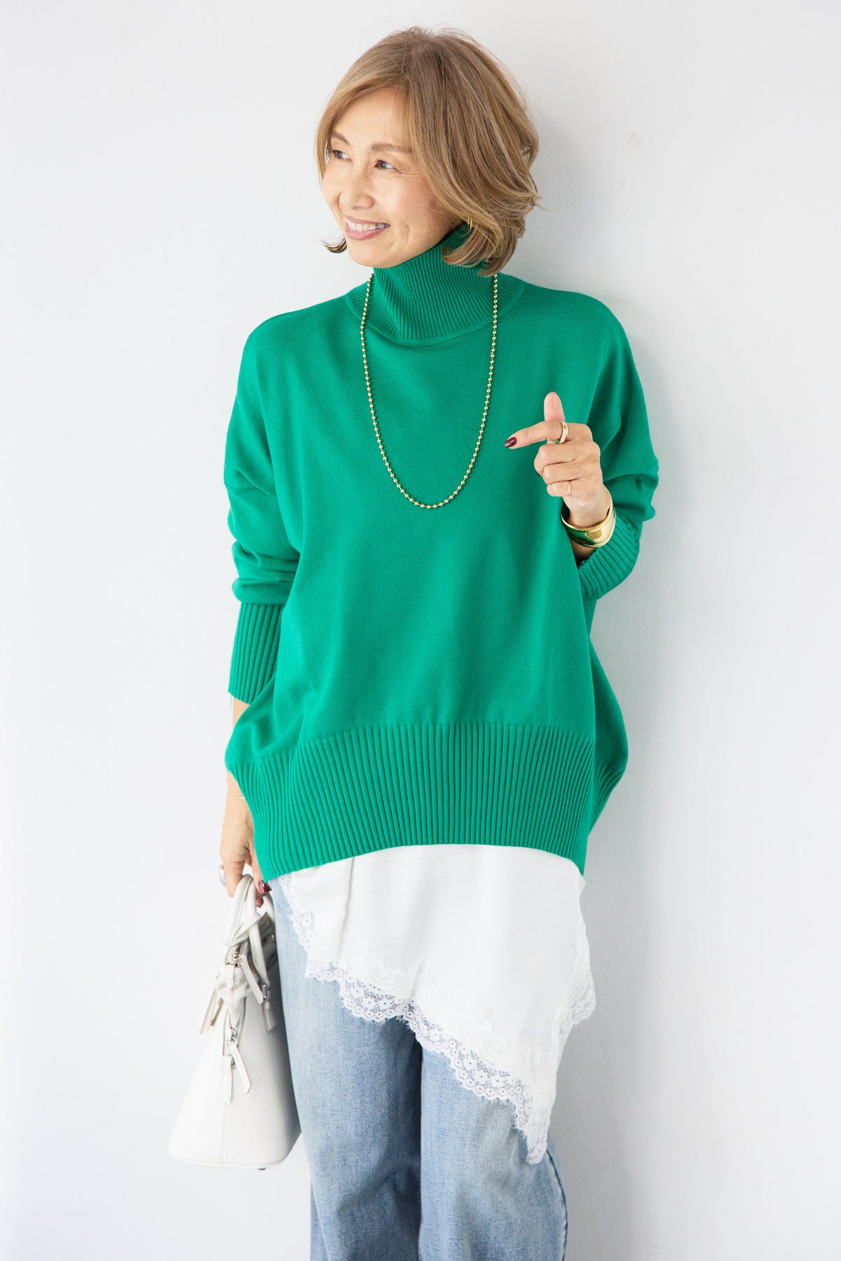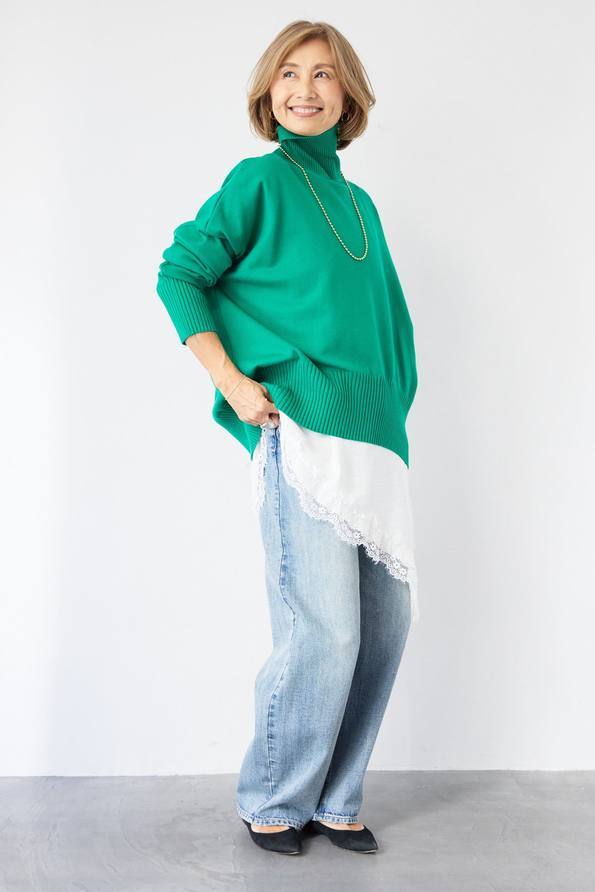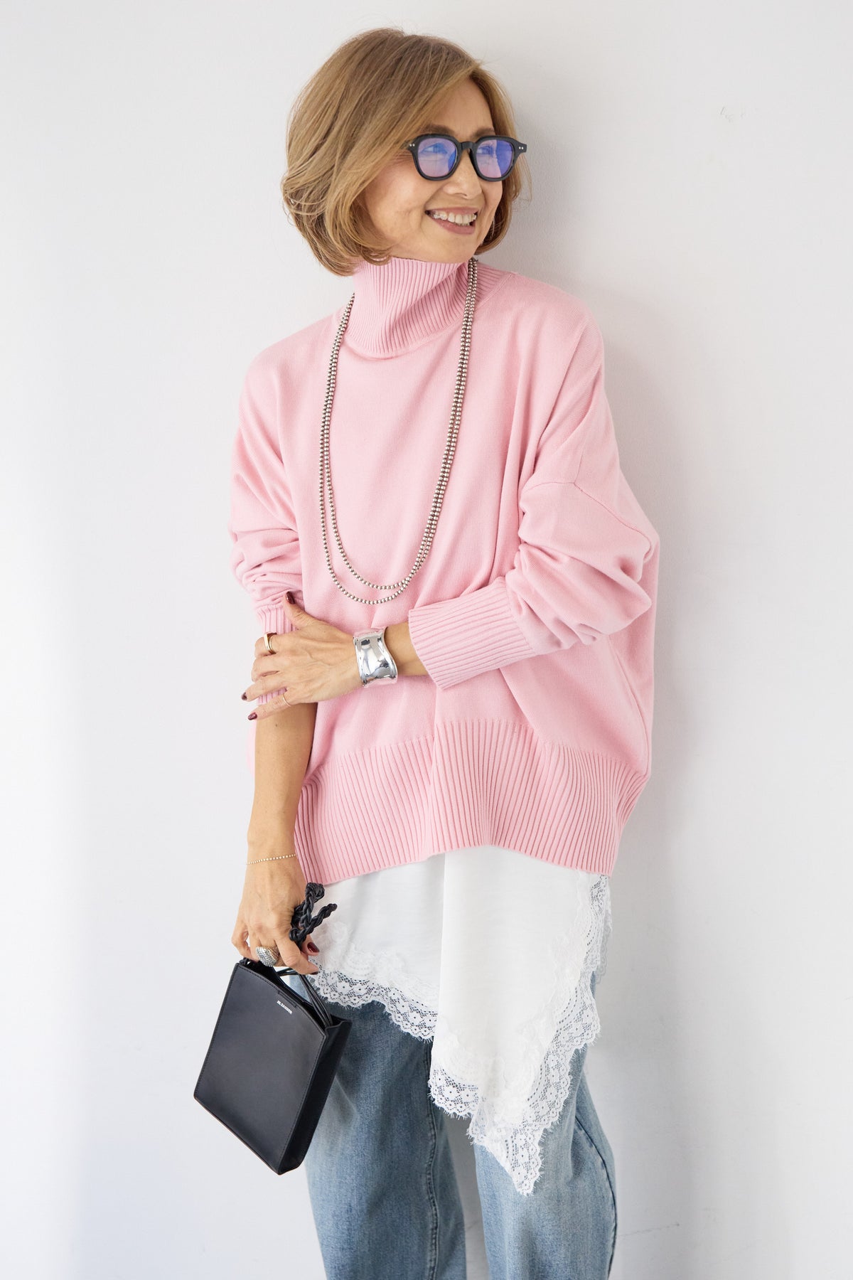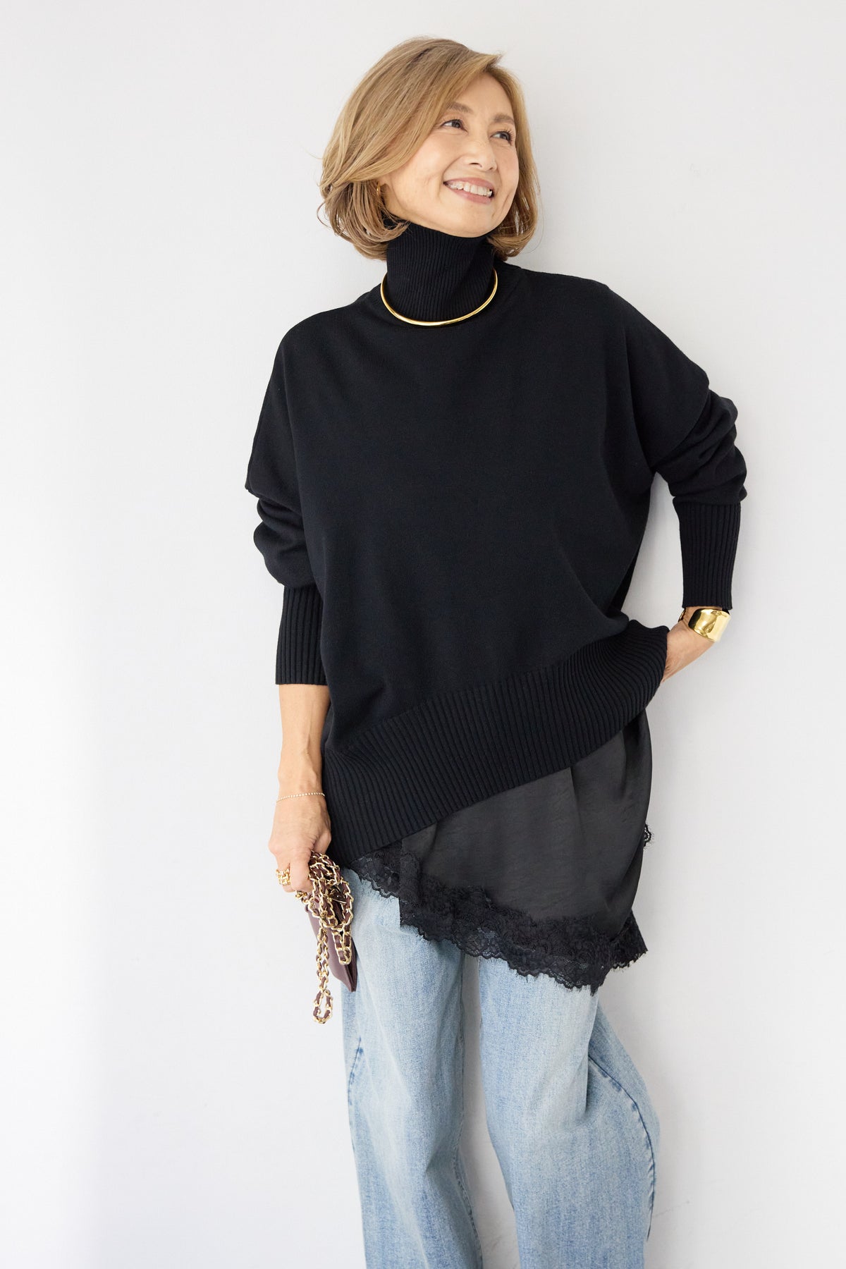 大人の余裕を纏う、リラクシーな着心地のタートルネックニット。程よくゆとりのあるシルエットが体のラインを拾わず、自然な抜け感を演出します。首元は締め付け感の少ないタートルネック仕様で、顔まわりをやさしく包み込みつつ、上品な印象に。袖口と裾はリブ編みでメリハリをつけ、ルーズになりすぎないバランスに仕上げました。シャツやレースアイテムとのレイヤードも楽しめ、デニムからきれいめボトムまで幅広くマッチ。一枚でサマになり、デイリーからお出かけまで活躍する大人のための万能ニットです。