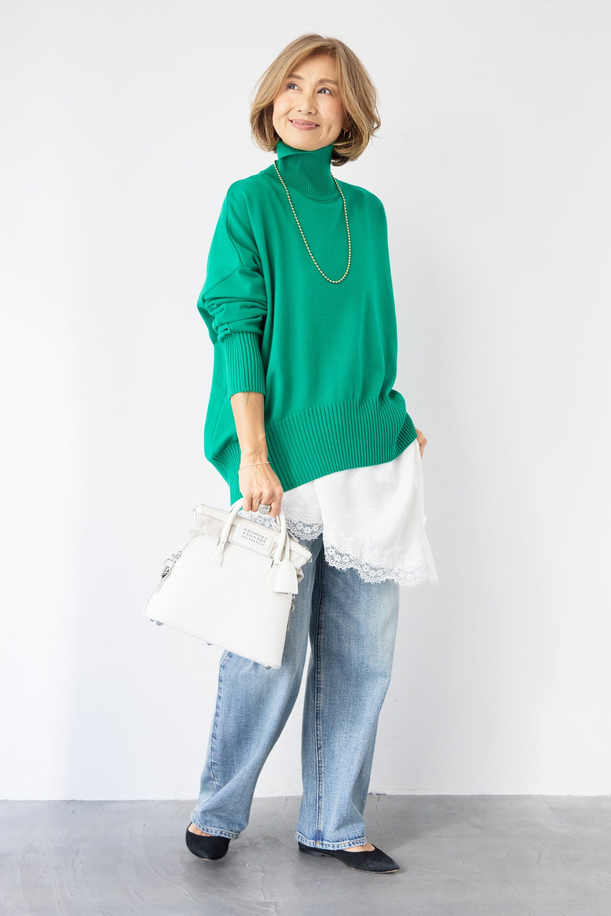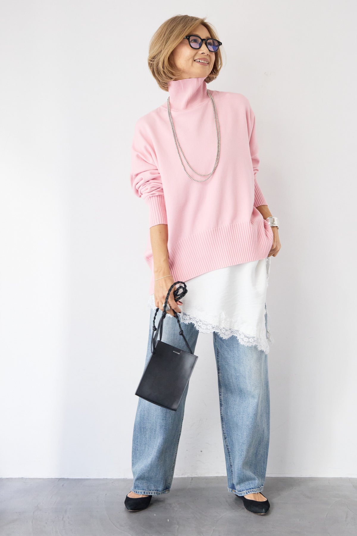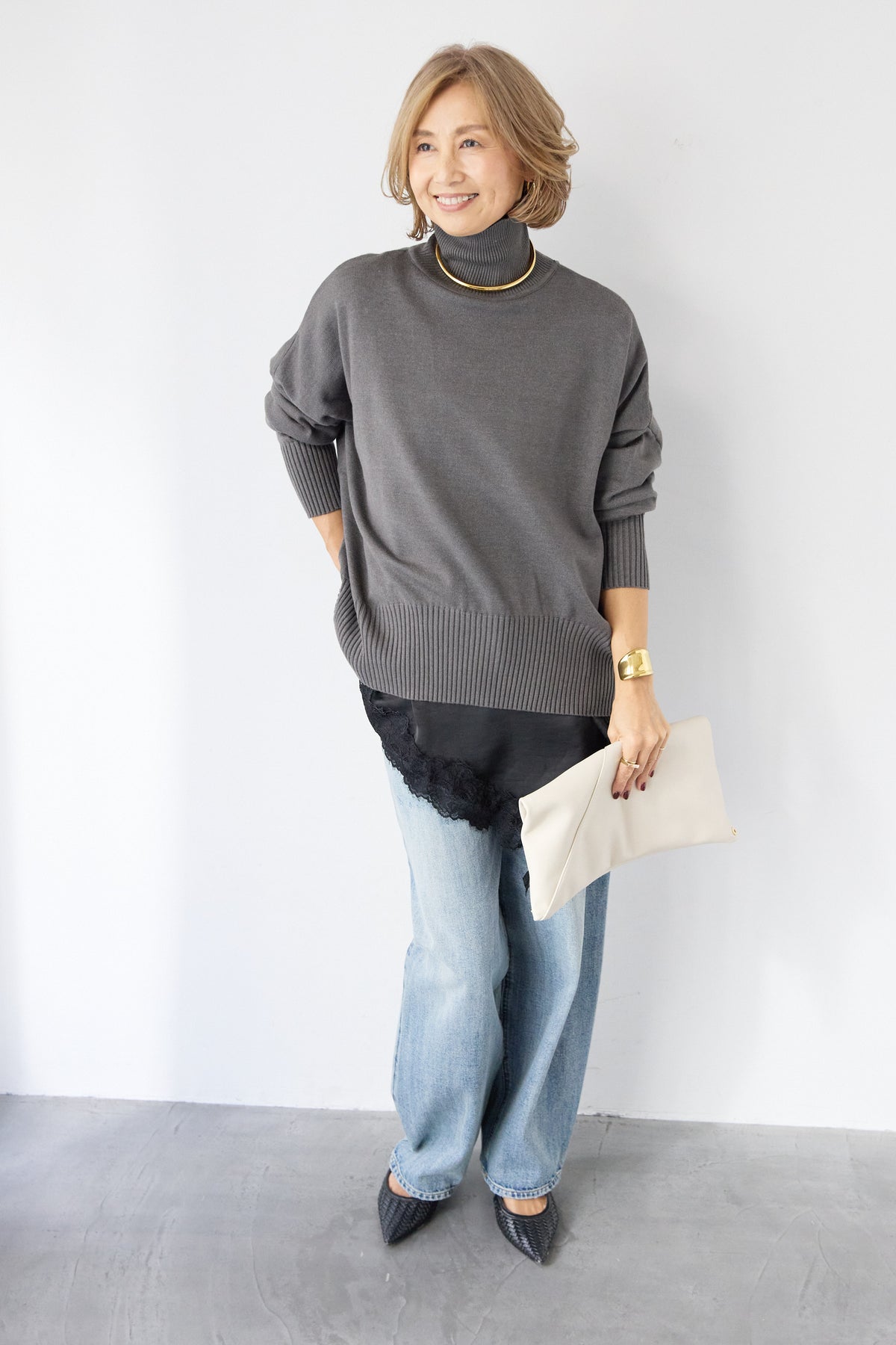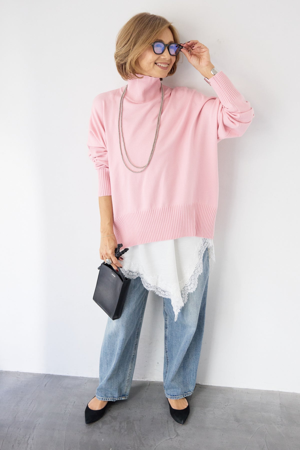 大人の余裕を纏う、リラクシーな着心地のタートルネックニット。程よくゆとりのあるシルエットが体のラインを拾わず、自然な抜け感を演出します。首元は締め付け感の少ないタートルネック仕様で、顔まわりをやさしく包み込みつつ、上品な印象に。袖口と裾はリブ編みでメリハリをつけ、ルーズになりすぎないバランスに仕上げました。シャツやレースアイテムとのレイヤードも楽しめ、デニムからきれいめボトムまで幅広くマッチ。一枚でサマになり、デイリーからお出かけまで活躍する大人のための万能ニットです。