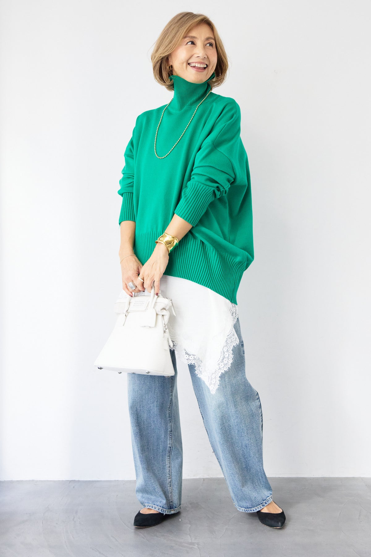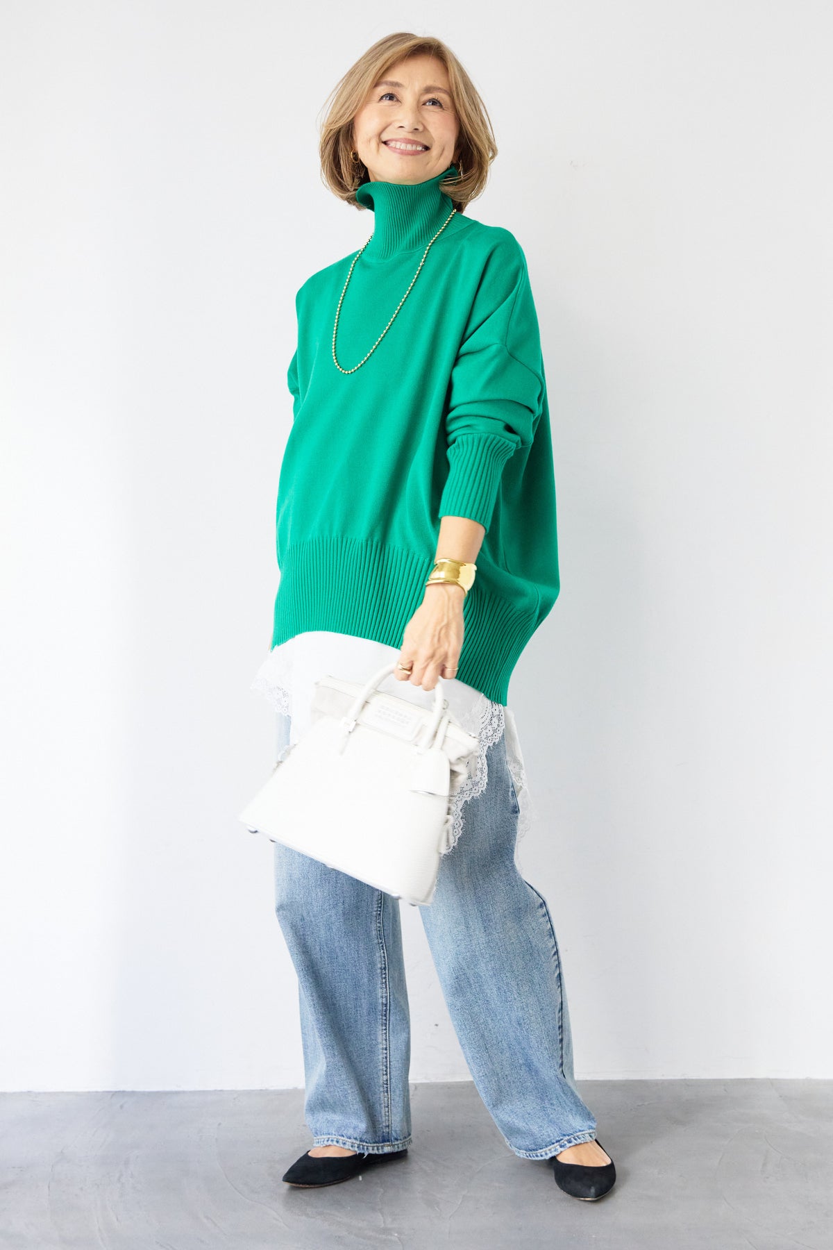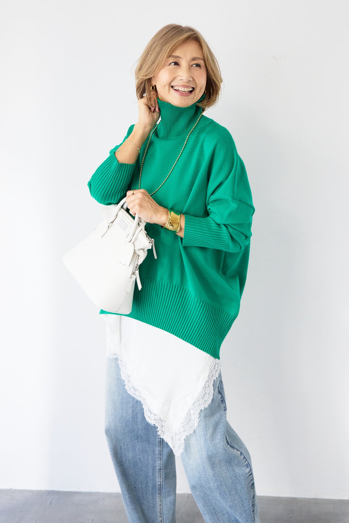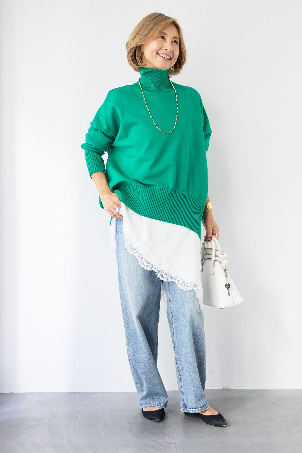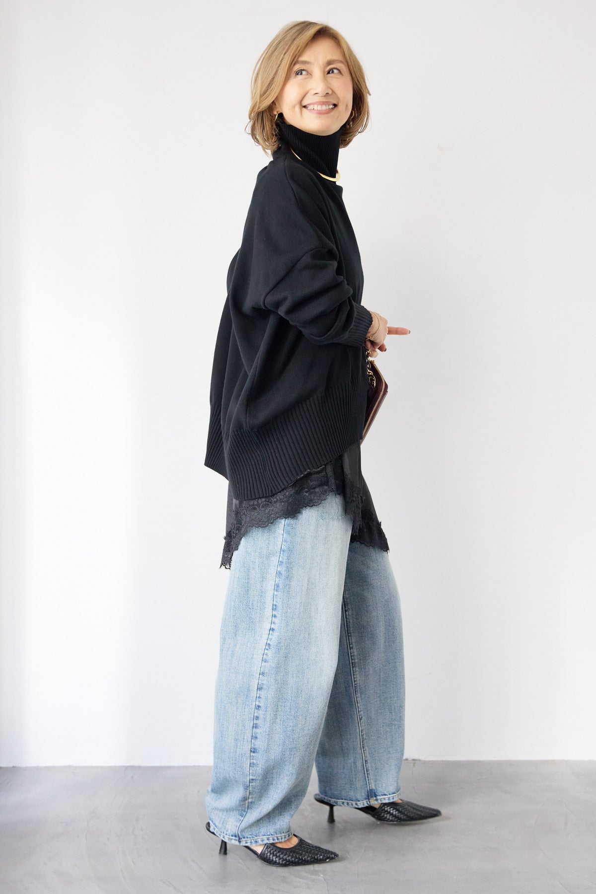 大人の余裕を纏う、リラクシーな着心地のタートルネックニット。程よくゆとりのあるシルエットが体のラインを拾わず、自然な抜け感を演出します。首元は締め付け感の少ないタートルネック仕様で、顔まわりをやさしく包み込みつつ、上品な印象に。袖口と裾はリブ編みでメリハリをつけ、ルーズになりすぎないバランスに仕上げました。シャツやレースアイテムとのレイヤードも楽しめ、デニムからきれいめボトムまで幅広くマッチ。一枚でサマになり、デイリーからお出かけまで活躍する大人のための万能ニットです。