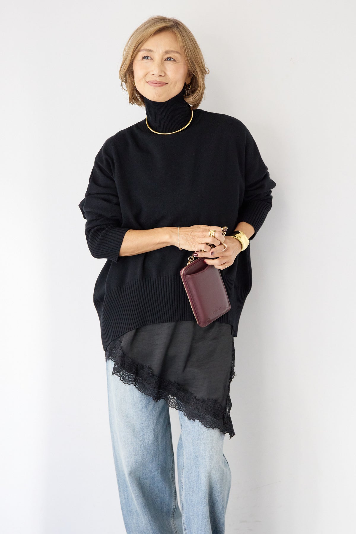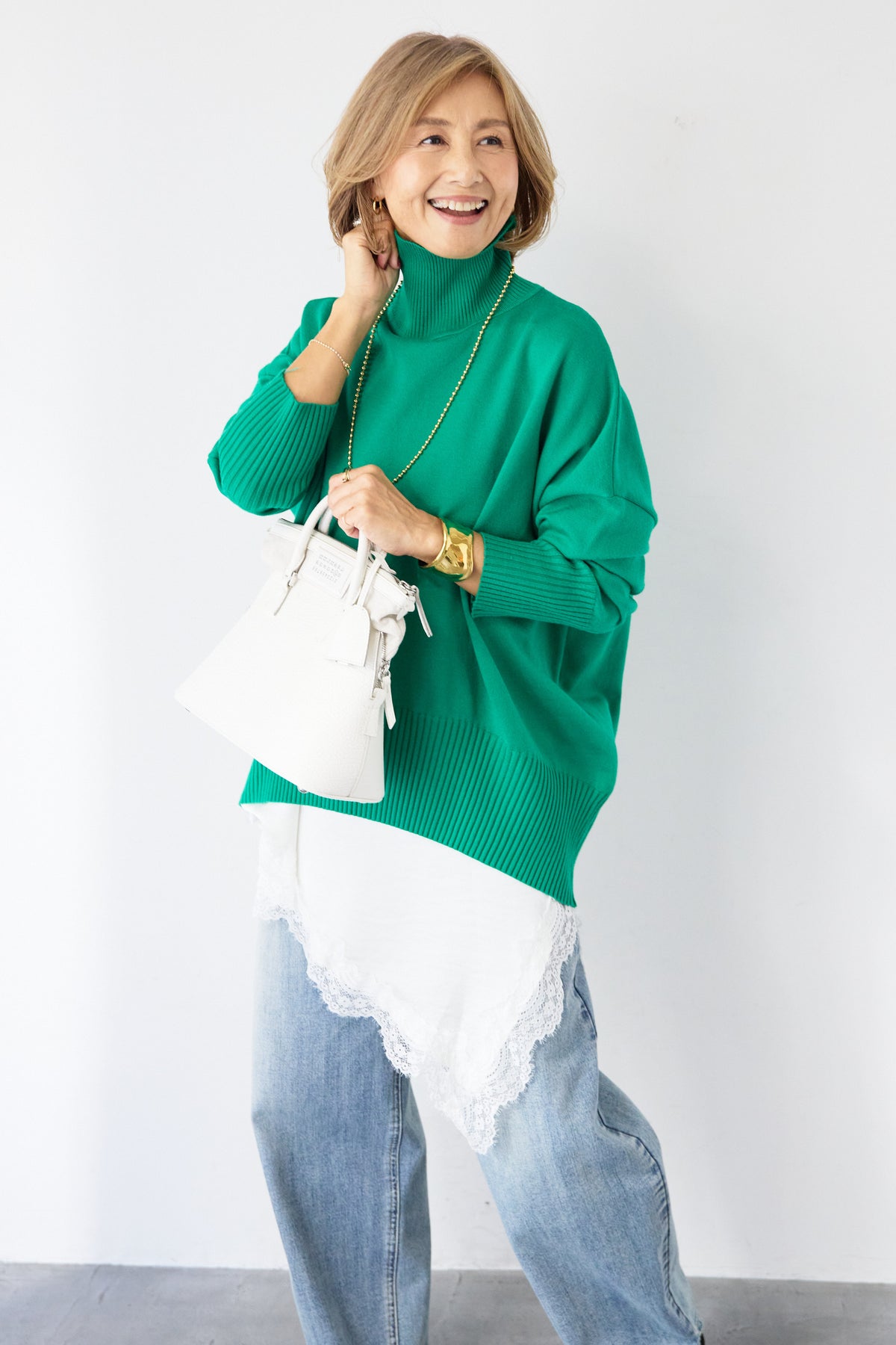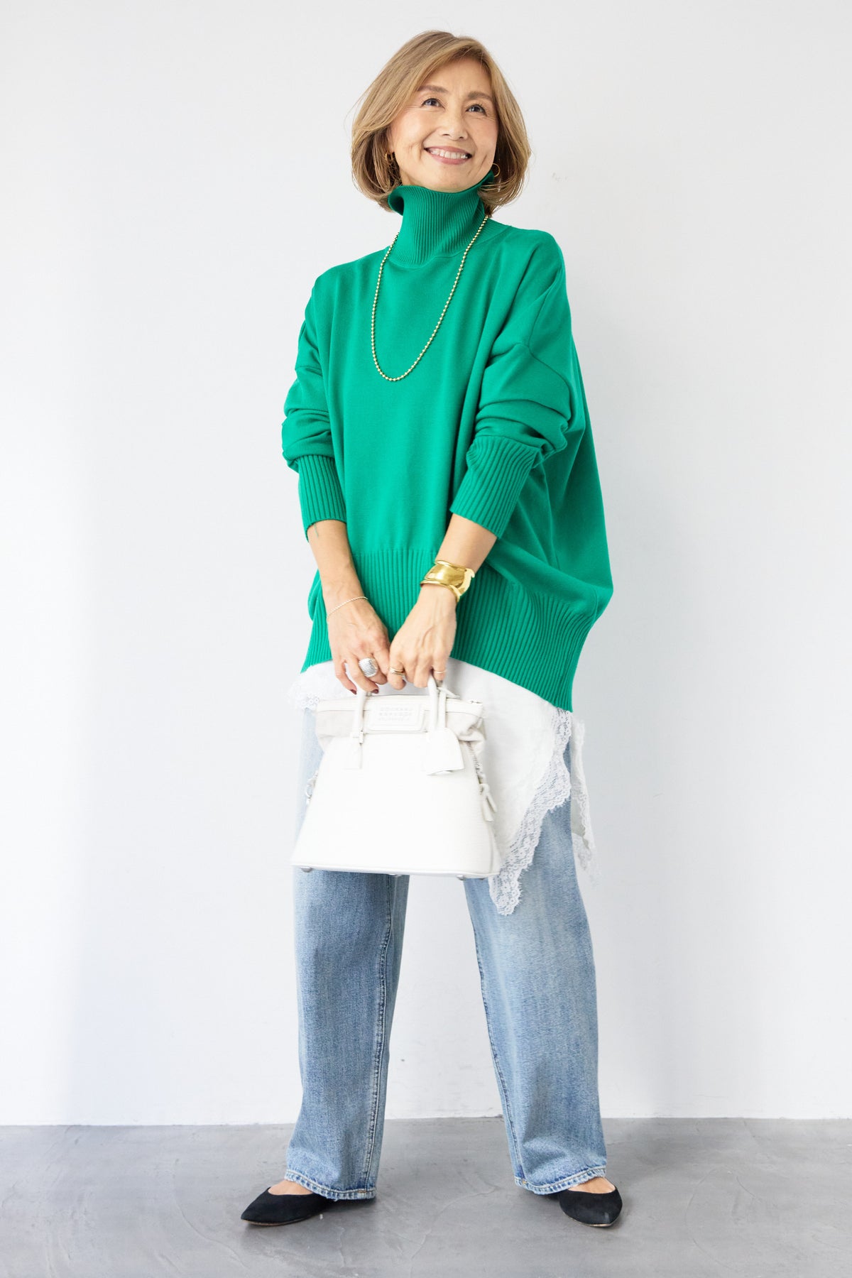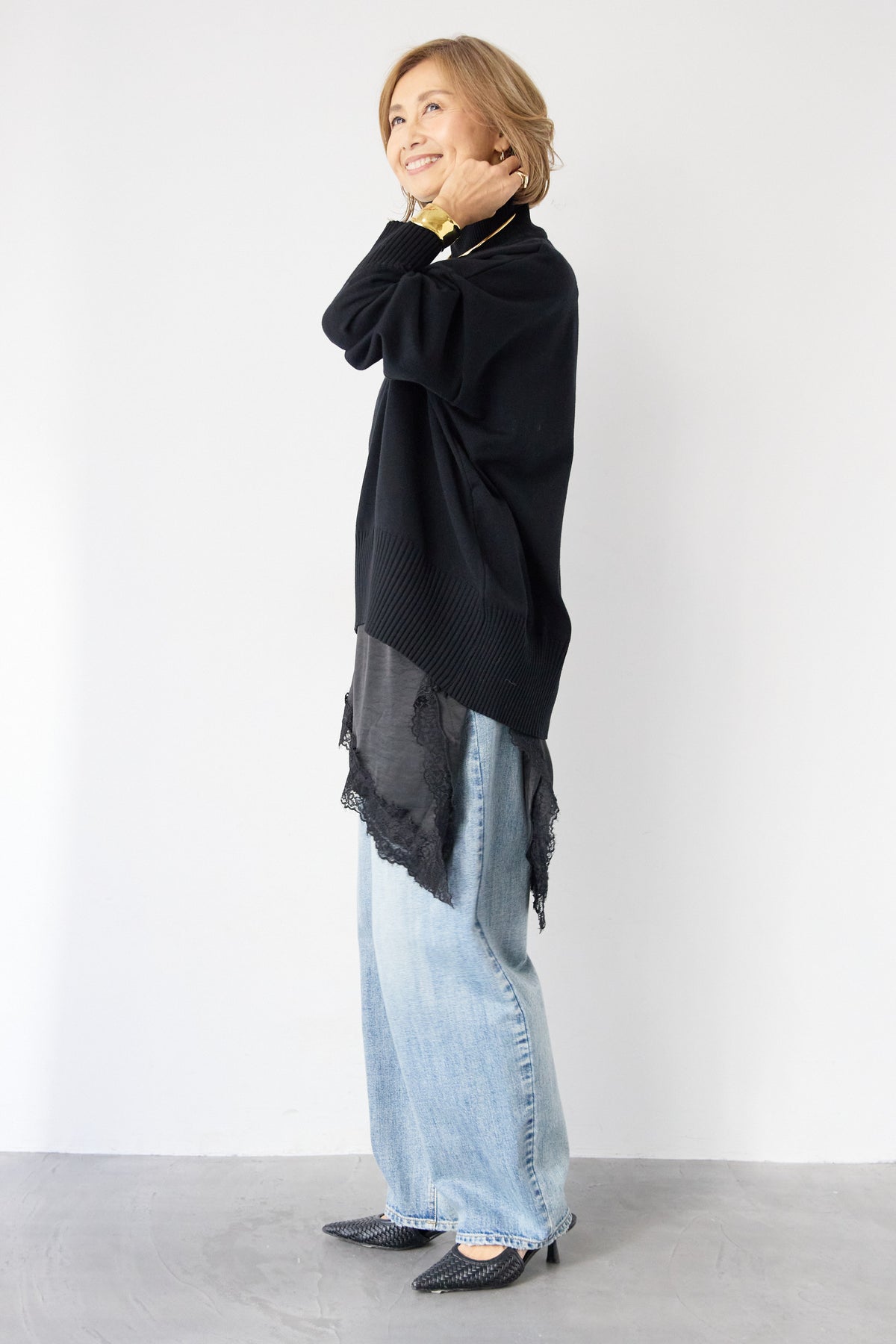大人の余裕を纏う、リラクシーな着心地のタートルネックニット。程よくゆとりのあるシルエットが体のラインを拾わず、自然な抜け感を演出します。首元は締め付け感の少ないタートルネック仕様で、顔まわりをやさしく包み込みつつ、上品な印象に。袖口と裾はリブ編みでメリハリをつけ、ルーズになりすぎないバランスに仕上げました。シャツやレースアイテムとのレイヤードも楽しめ、デニムからきれいめボトムまで幅広くマッチ。一枚でサマになり、デイリーからお出かけまで活躍する大人のための万能ニットです。