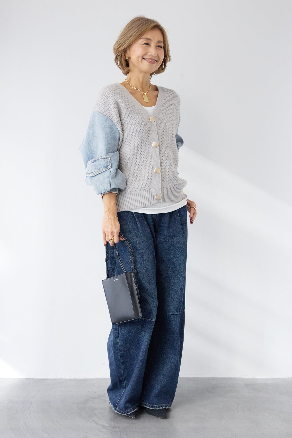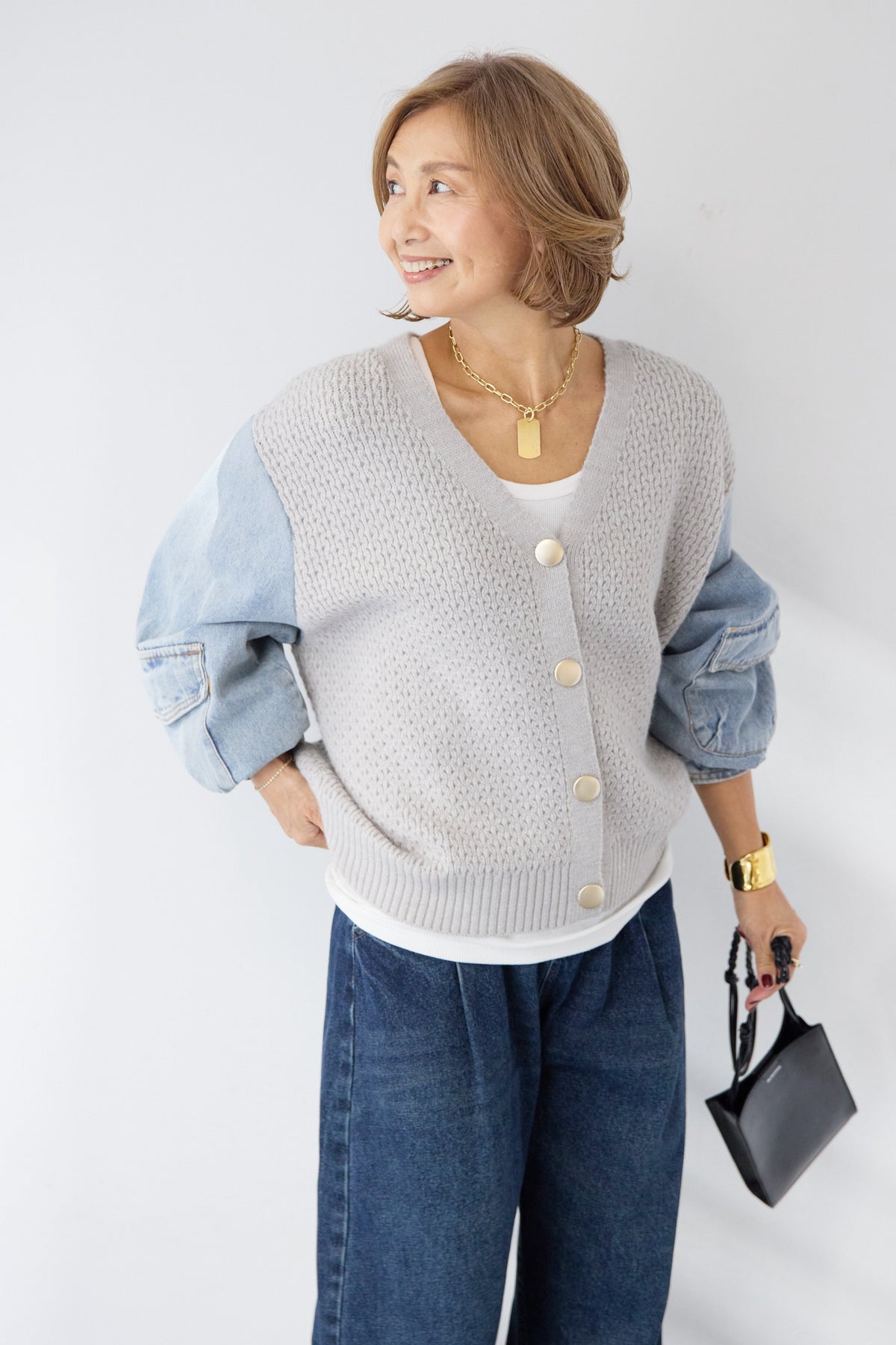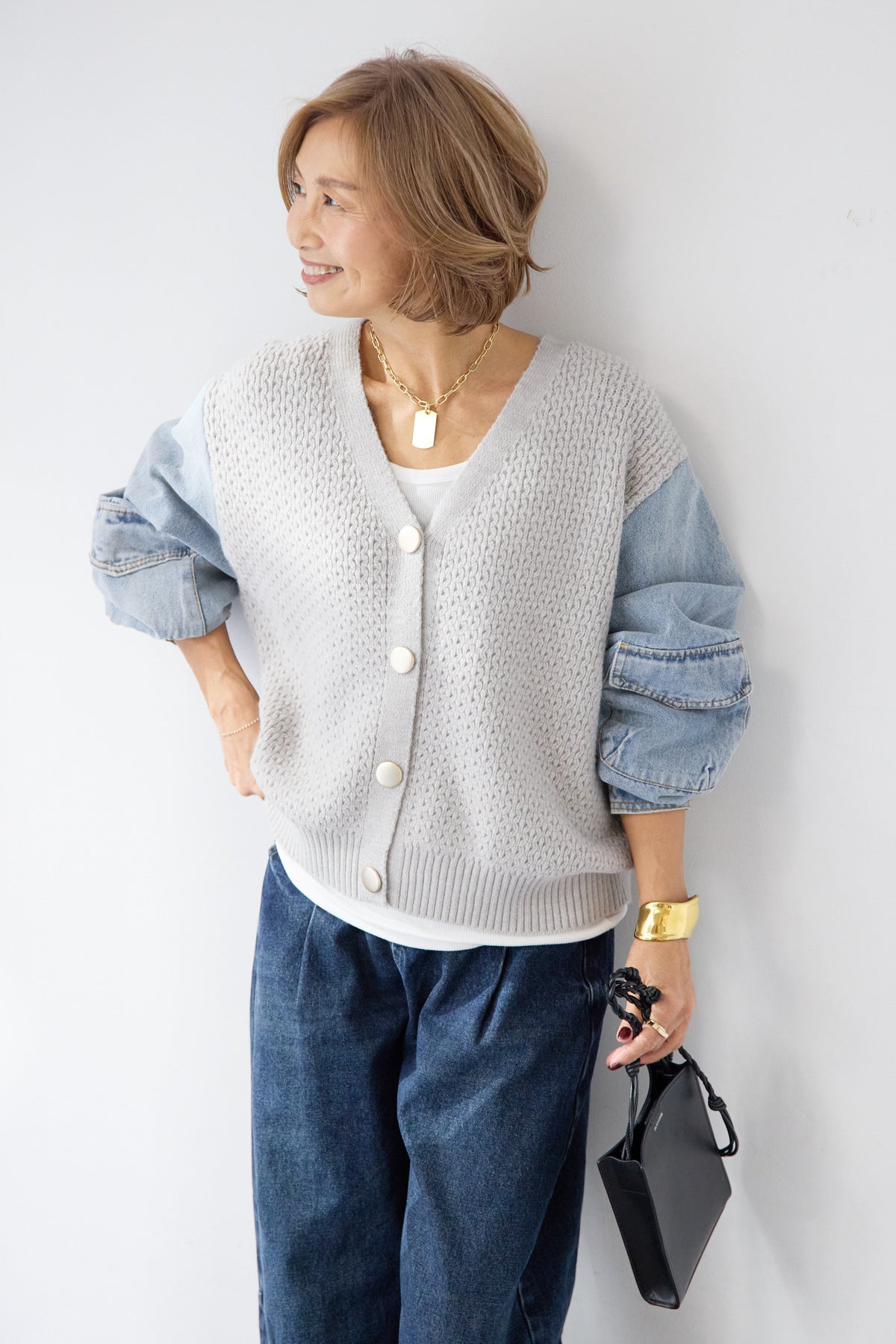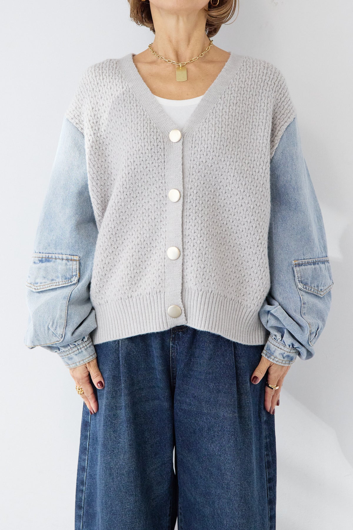 異素材ミックスが目を惹く、大人カジュアルな主役カーディガン。身頃には立体感のあるケーブル調ニットを使用し、袖には柔らかなデニム素材をドッキング。ニットの温もりとデニムの程よいカジュアル感が絶妙に融合した、他にはない一枚です。フロントはVネック仕様で、インナーとのレイヤードもすっきり。丸みのあるボタンがやさしいアクセントになり、上品さをプラスします。デニムスリーブは程よくボリュームがあり、手元にニュアンスを出してくれるため、シンプルなコーディネートでもこなれた印象に。パンツにもスカートにも合わせやすい丈感で、デイリーからお出かけまで幅広く活躍。一枚でスタイリングが完成する、遊び心と大人らしさを兼ね備えたカーディガンです。