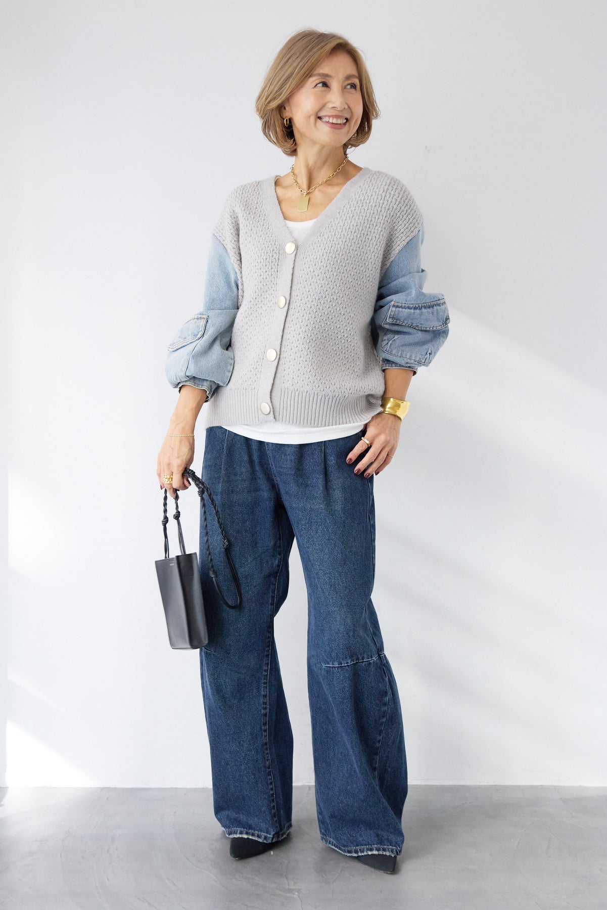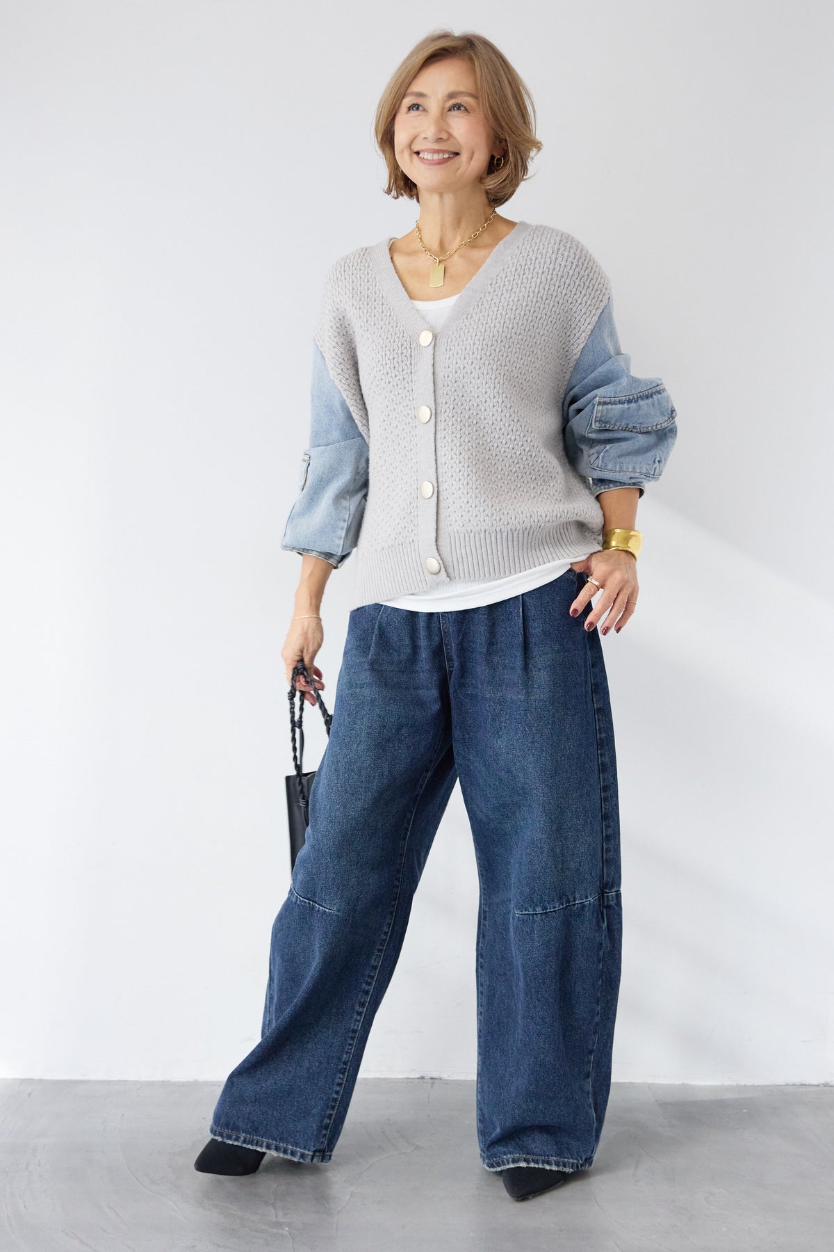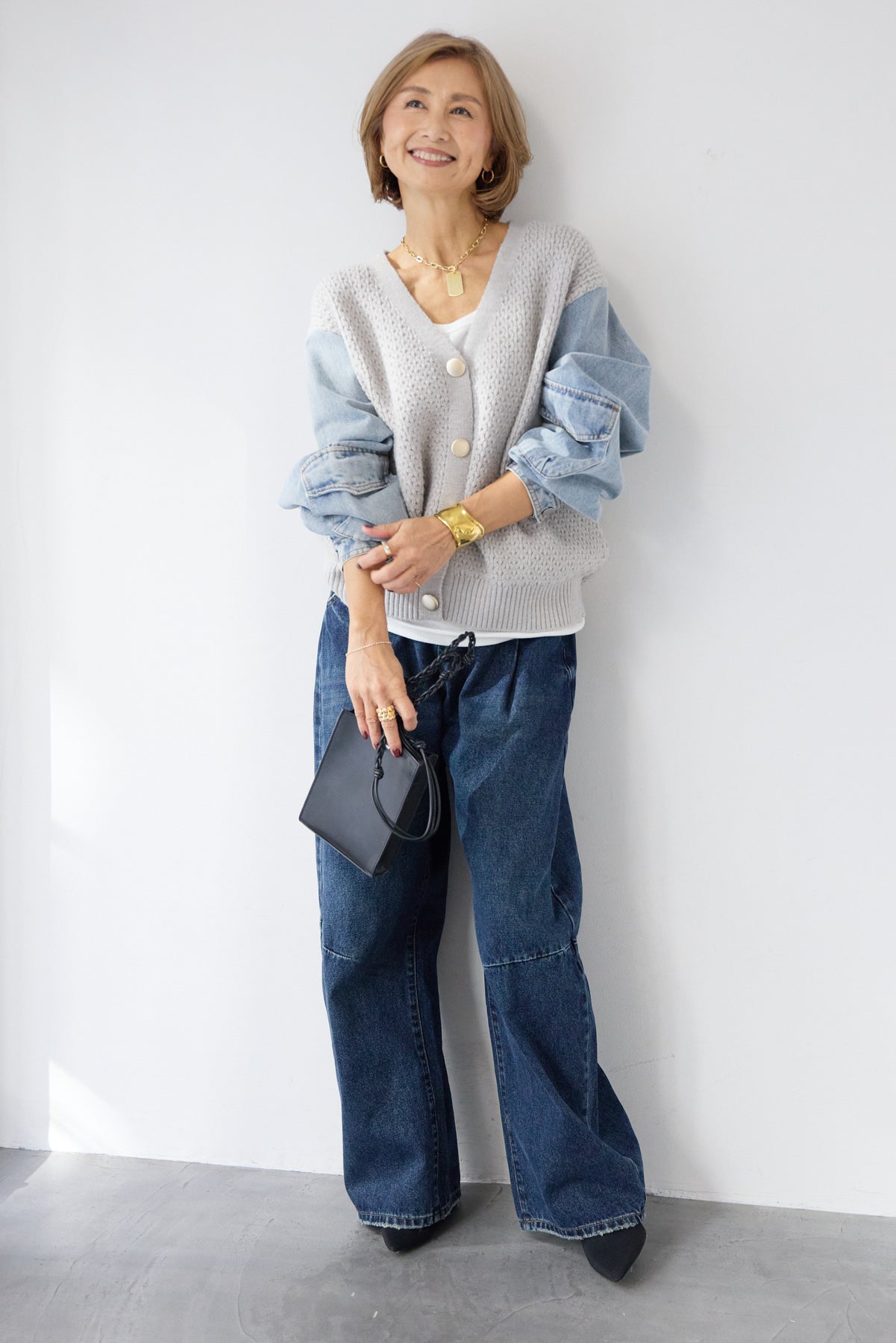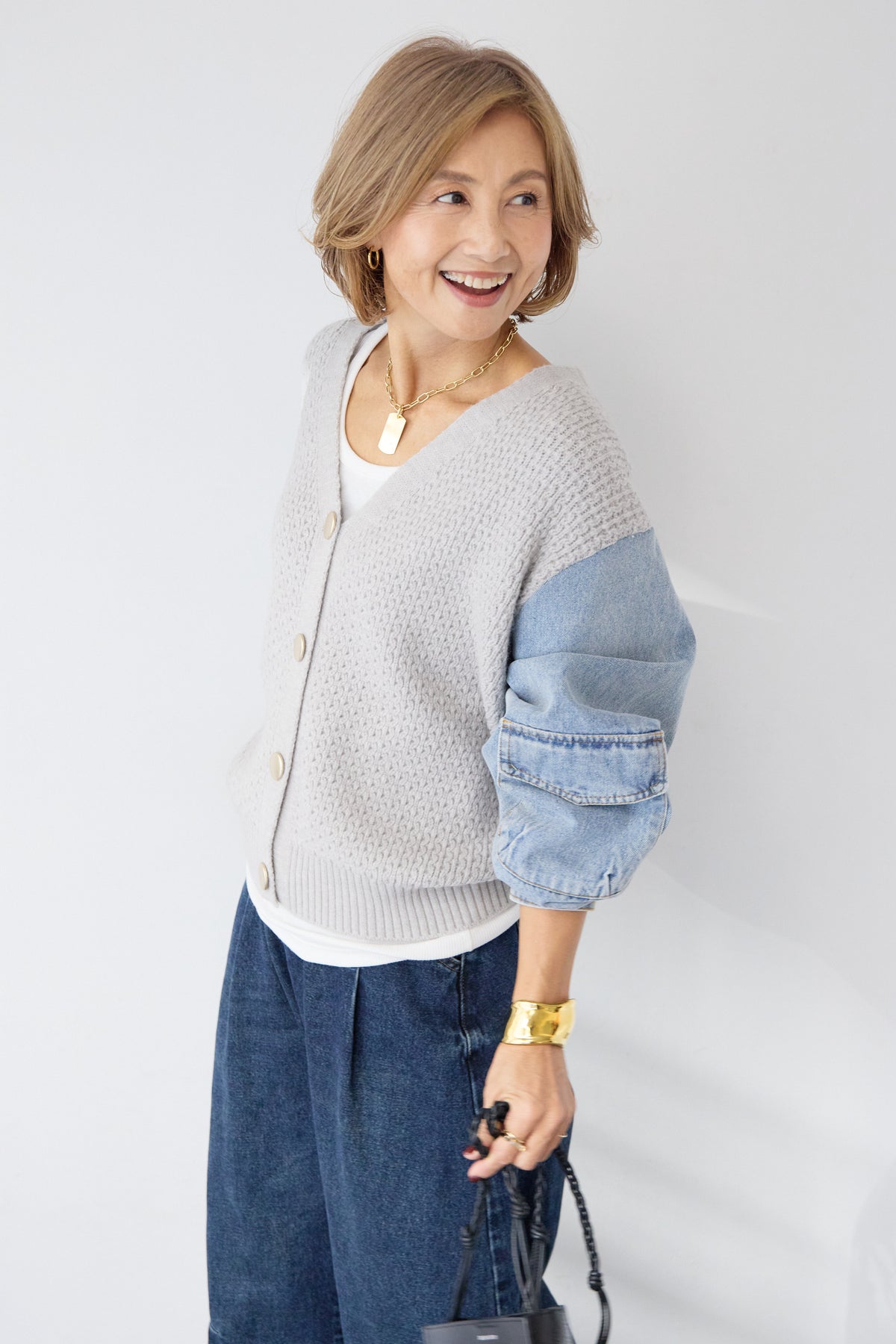 異素材ミックスが目を惹く、大人カジュアルな主役カーディガン。身頃には立体感のあるケーブル調ニットを使用し、袖には柔らかなデニム素材をドッキング。ニットの温もりとデニムの程よいカジュアル感が絶妙に融合した、他にはない一枚です。フロントはVネック仕様で、インナーとのレイヤードもすっきり。丸みのあるボタンがやさしいアクセントになり、上品さをプラスします。デニムスリーブは程よくボリュームがあり、手元にニュアンスを出してくれるため、シンプルなコーディネートでもこなれた印象に。パンツにもスカートにも合わせやすい丈感で、デイリーからお出かけまで幅広く活躍。一枚でスタイリングが完成する、遊び心と大人らしさを兼ね備えたカーディガンです。