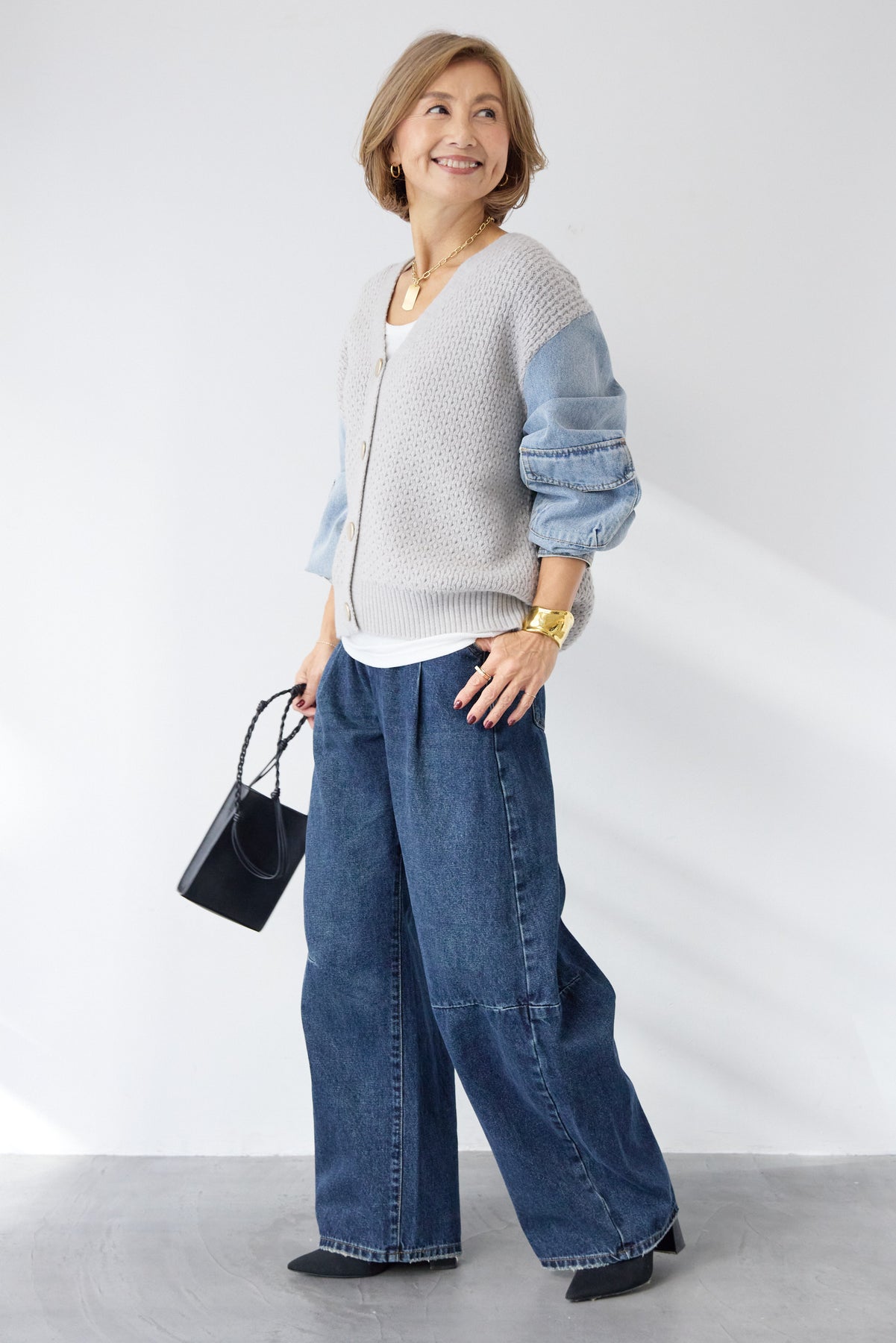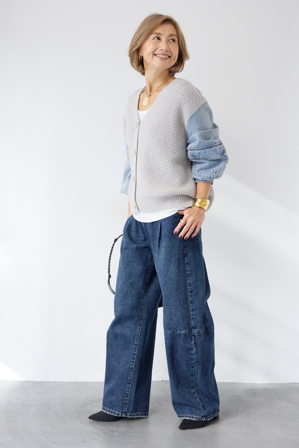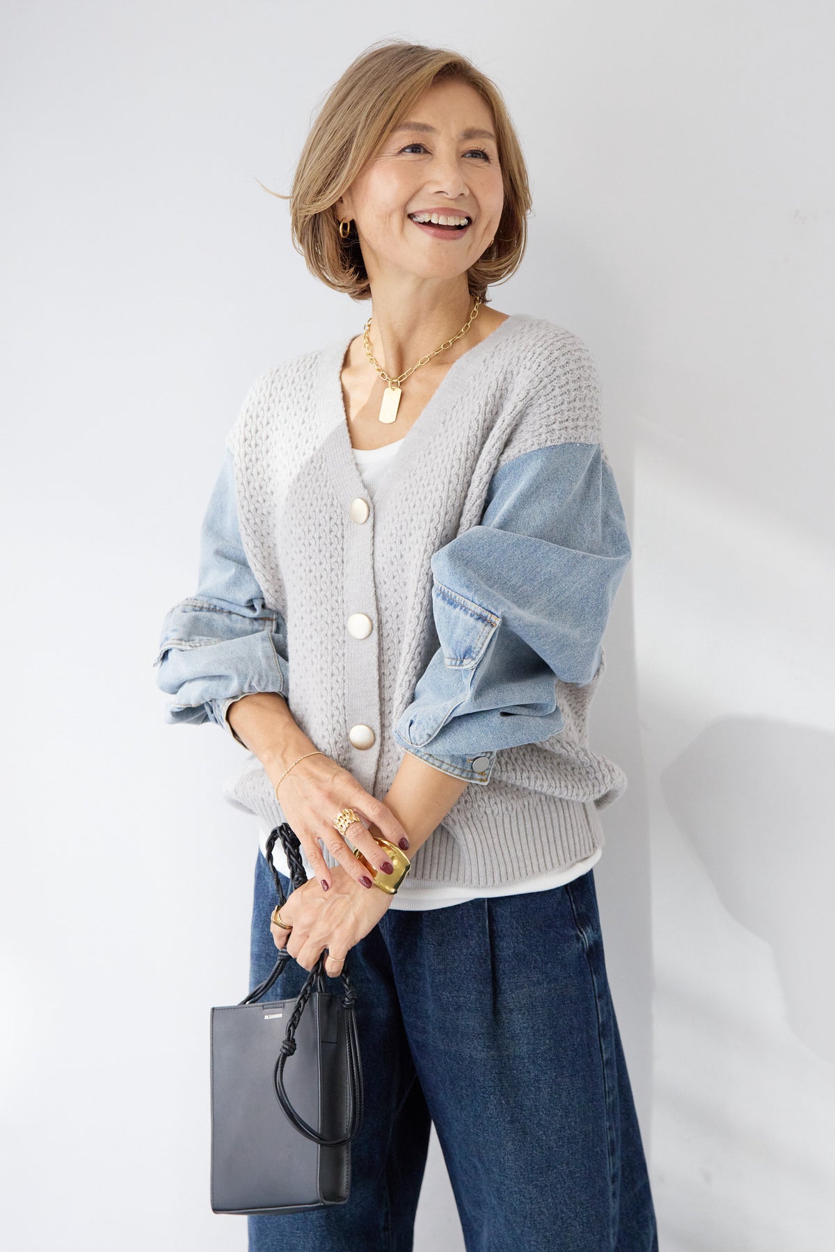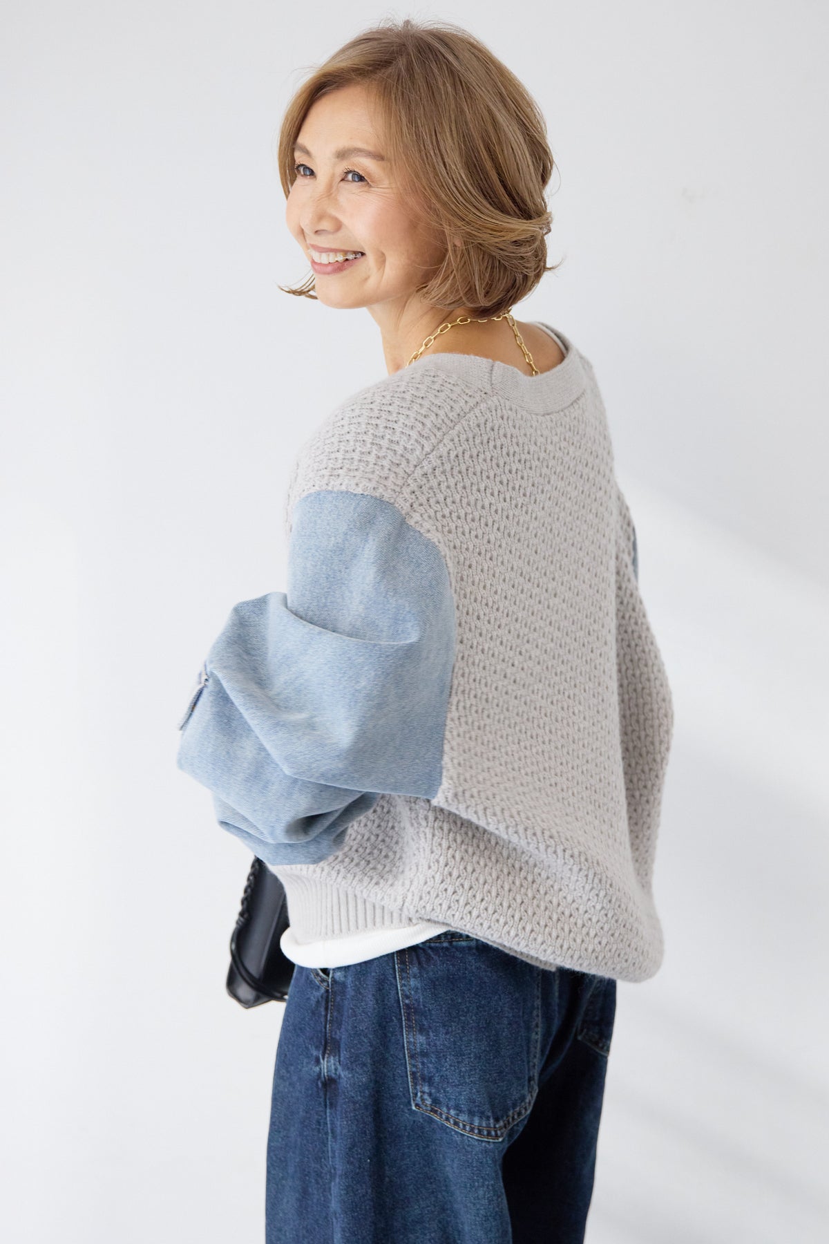 異素材ミックスが目を惹く、大人カジュアルな主役カーディガン。身頃には立体感のあるケーブル調ニットを使用し、袖には柔らかなデニム素材をドッキング。ニットの温もりとデニムの程よいカジュアル感が絶妙に融合した、他にはない一枚です。フロントはVネック仕様で、インナーとのレイヤードもすっきり。丸みのあるボタンがやさしいアクセントになり、上品さをプラスします。デニムスリーブは程よくボリュームがあり、手元にニュアンスを出してくれるため、シンプルなコーディネートでもこなれた印象に。パンツにもスカートにも合わせやすい丈感で、デイリーからお出かけまで幅広く活躍。一枚でスタイリングが完成する、遊び心と大人らしさを兼ね備えたカーディガンです。