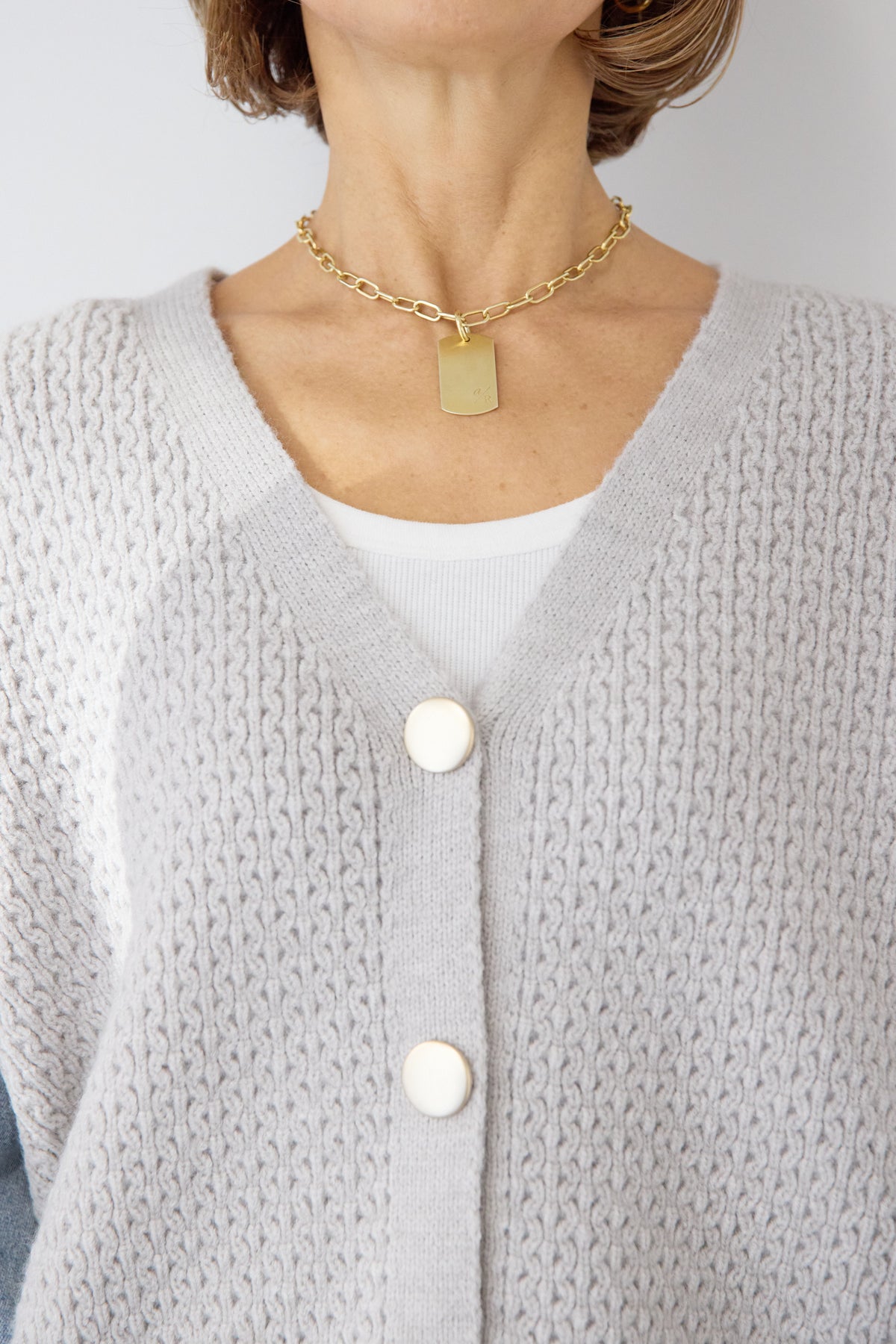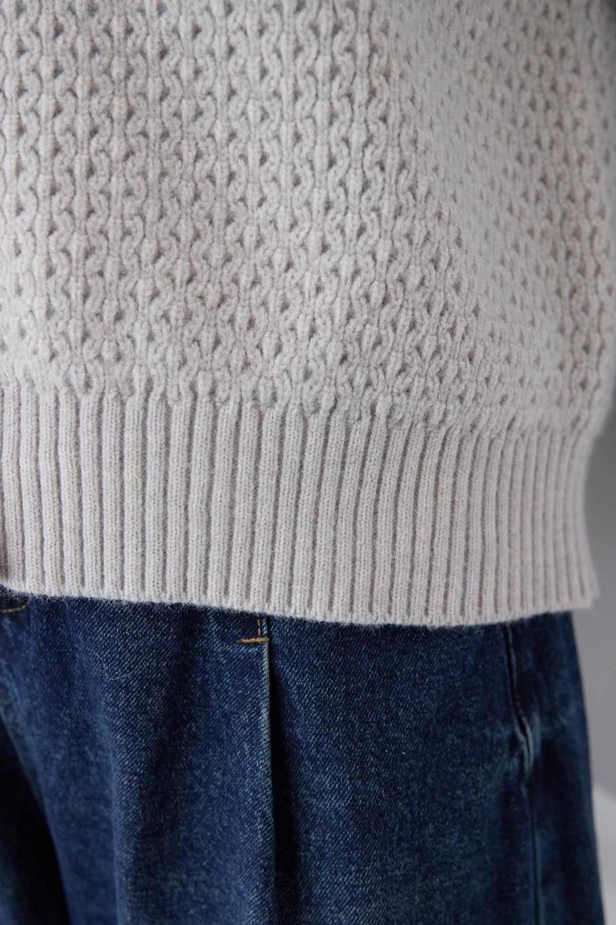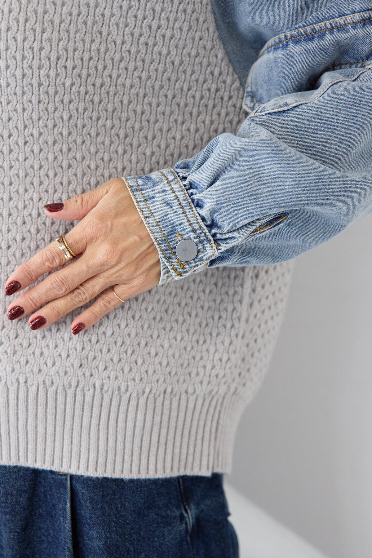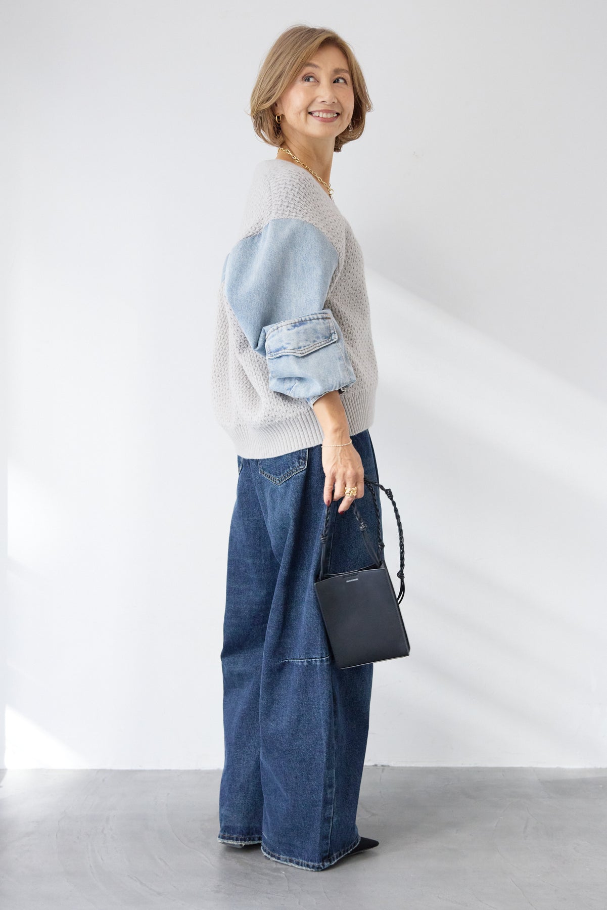 異素材ミックスが目を惹く、大人カジュアルな主役カーディガン。身頃には立体感のあるケーブル調ニットを使用し、袖には柔らかなデニム素材をドッキング。ニットの温もりとデニムの程よいカジュアル感が絶妙に融合した、他にはない一枚です。フロントはVネック仕様で、インナーとのレイヤードもすっきり。丸みのあるボタンがやさしいアクセントになり、上品さをプラスします。デニムスリーブは程よくボリュームがあり、手元にニュアンスを出してくれるため、シンプルなコーディネートでもこなれた印象に。パンツにもスカートにも合わせやすい丈感で、デイリーからお出かけまで幅広く活躍。一枚でスタイリングが完成する、遊び心と大人らしさを兼ね備えたカーディガンです。