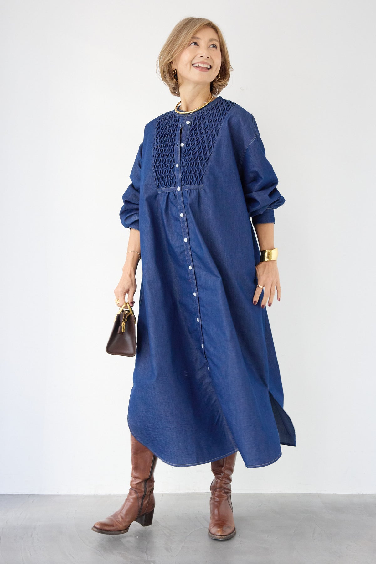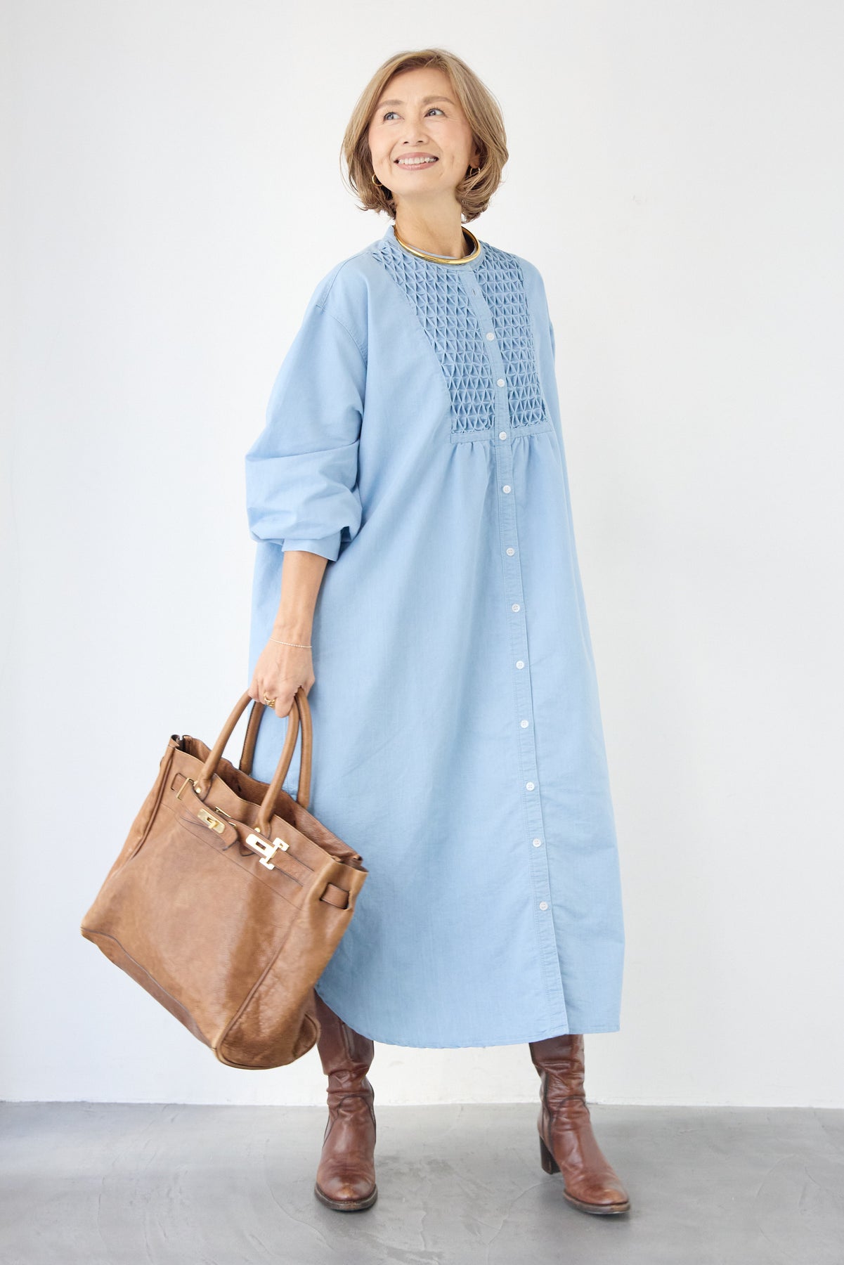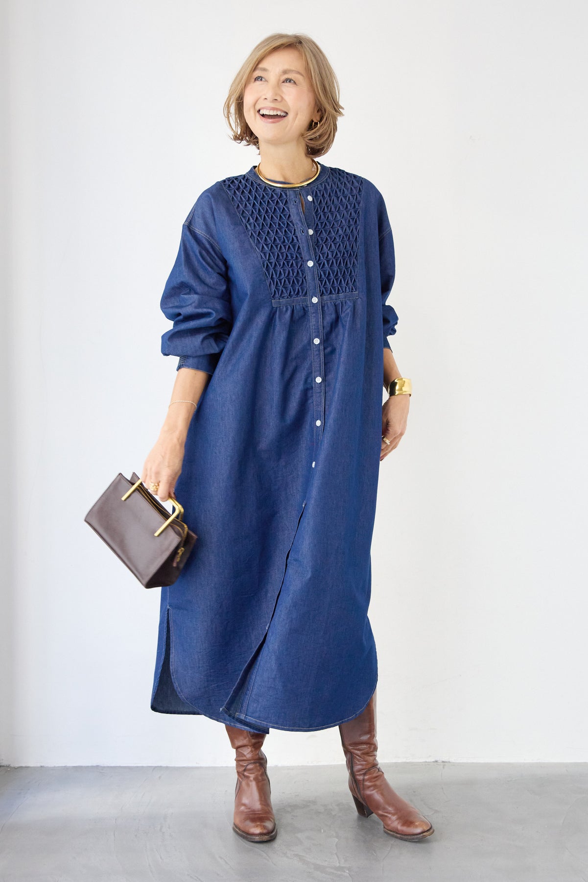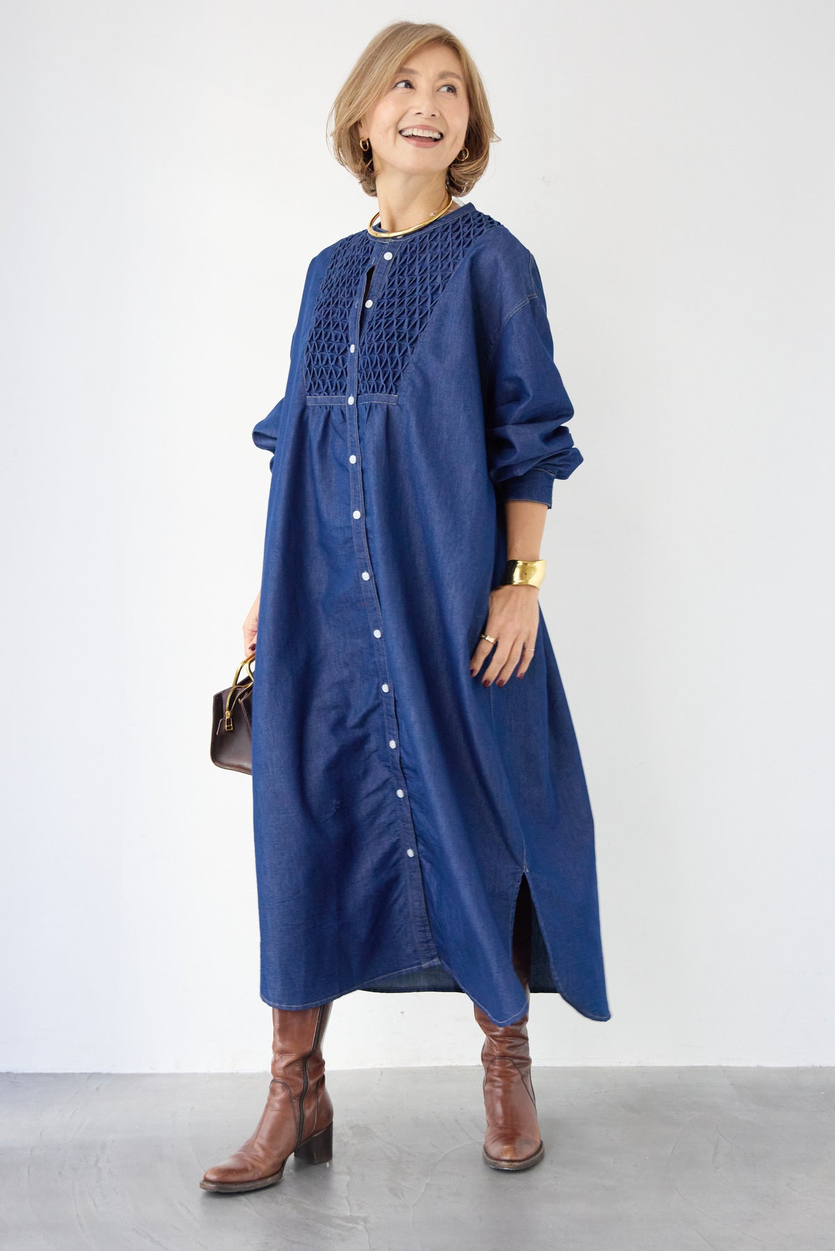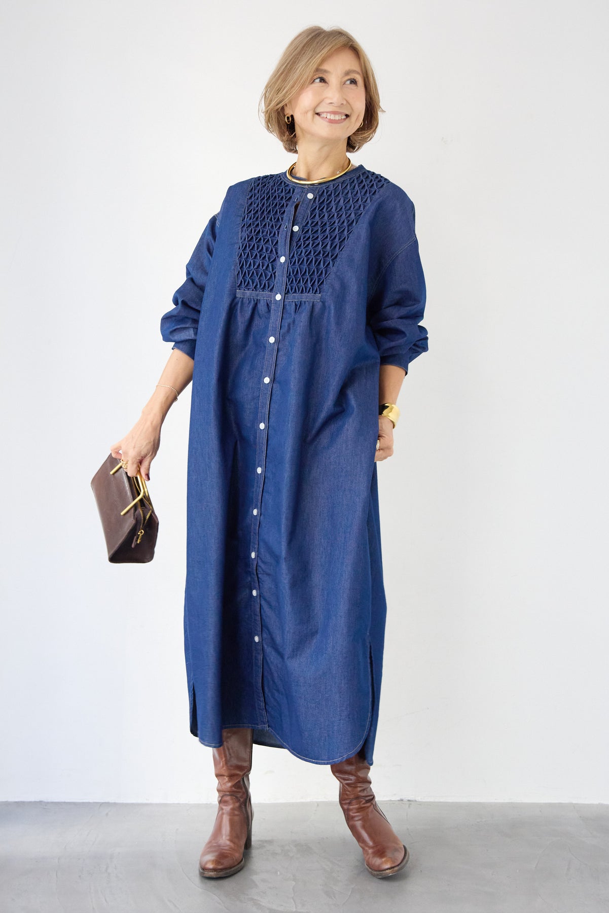繊細な手仕事が映える、大人のためのデニムワンピース。胸元に施したハンドスモッキングが、シンプルなデニム素材に立体感と表情をプラスします。やや落ち感のあるデニム生地を使用し、身体のラインを拾いにくいゆったりとしたシルエットに。前開き仕様のため、ワンピースとしてはもちろん、軽い羽織としても着用可能です。袖口にはギャザーを入れ、さりげないボリューム感で女性らしさを演出。両サイドにはポケット付きで実用性も◎。ブーツやフラットシューズと合わせて、季節を問わず幅広いスタイリングを楽しめる一着です。