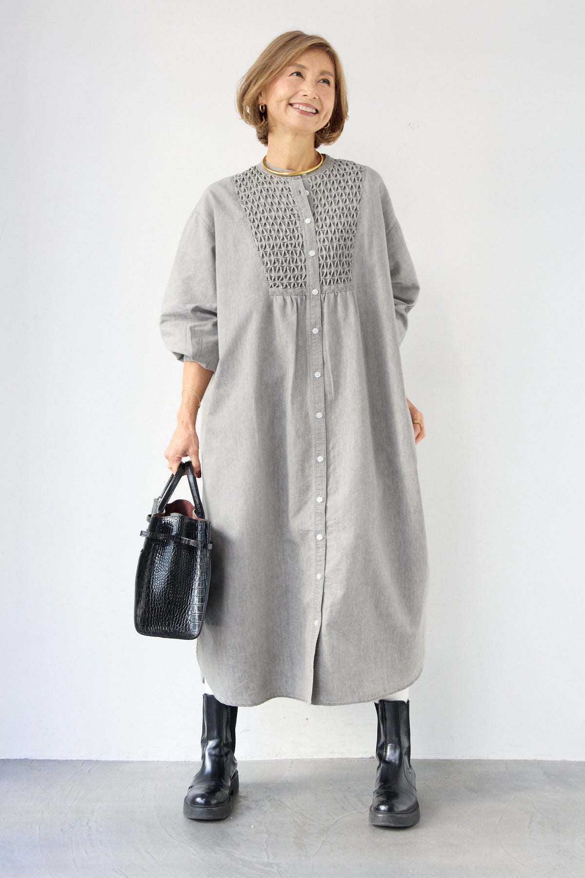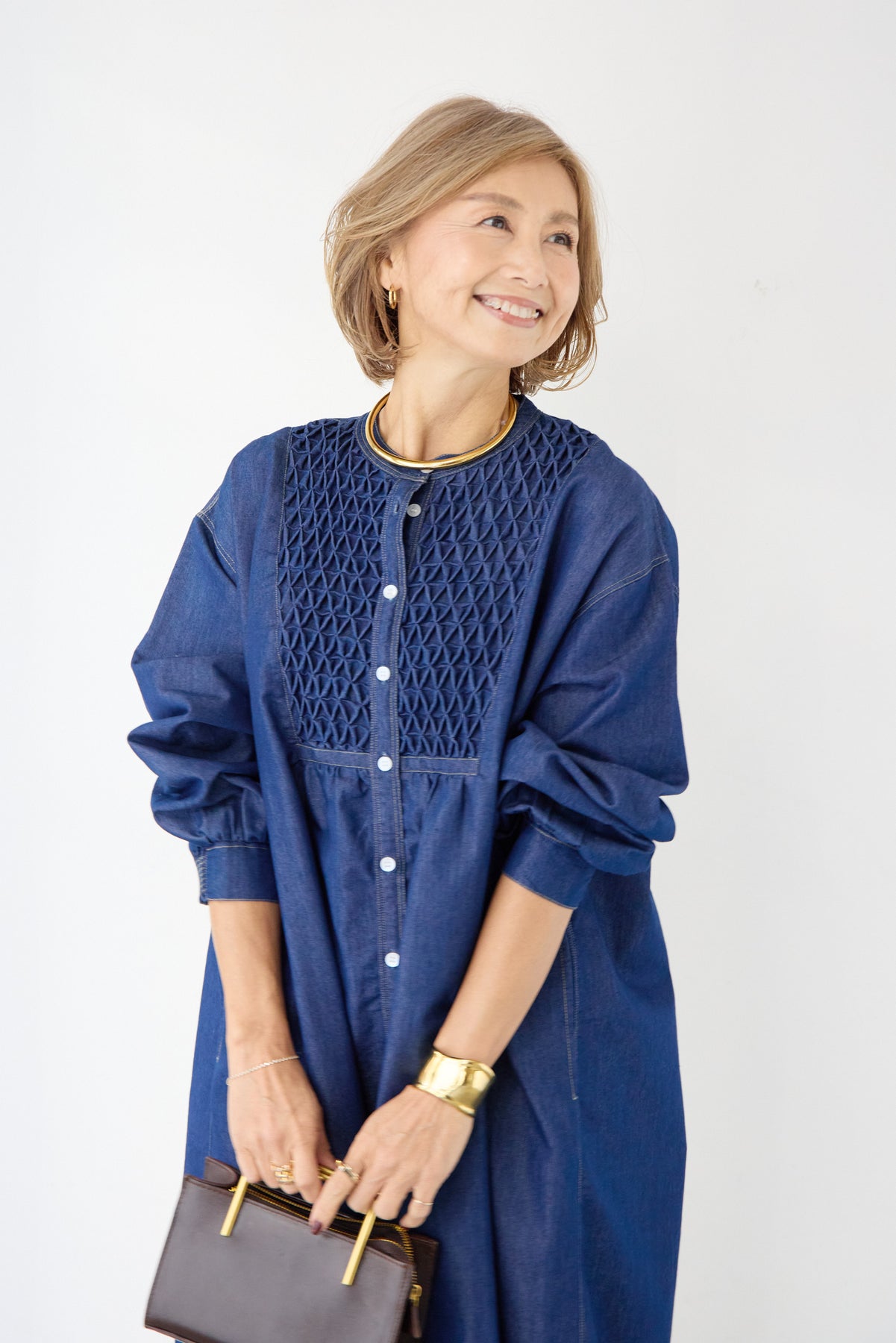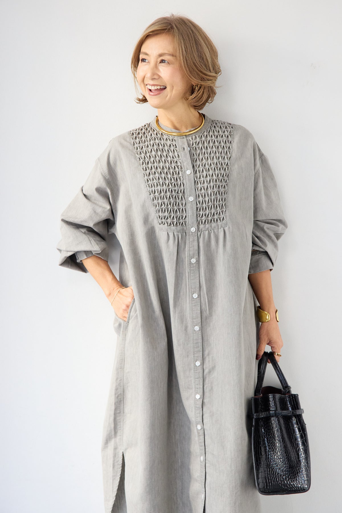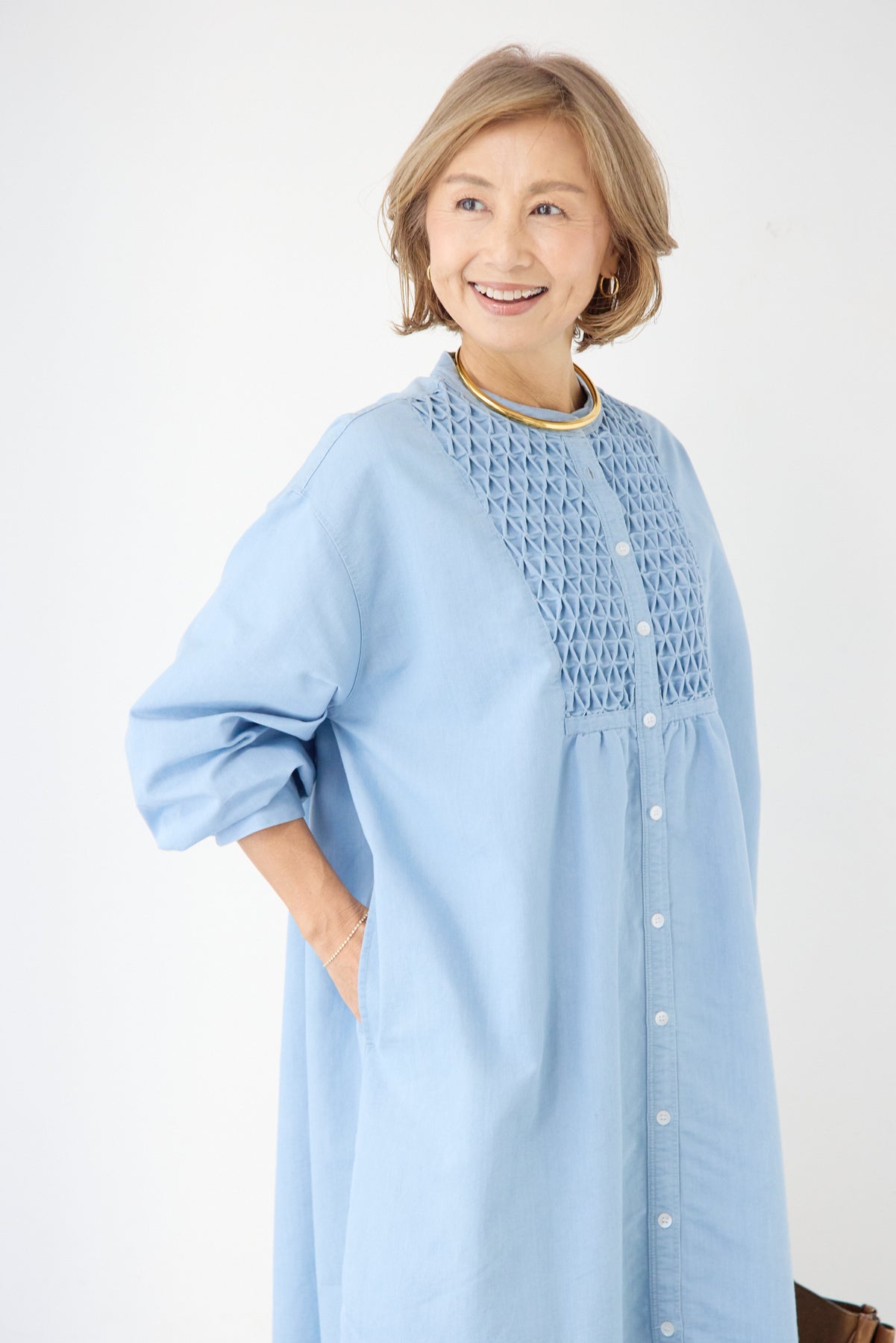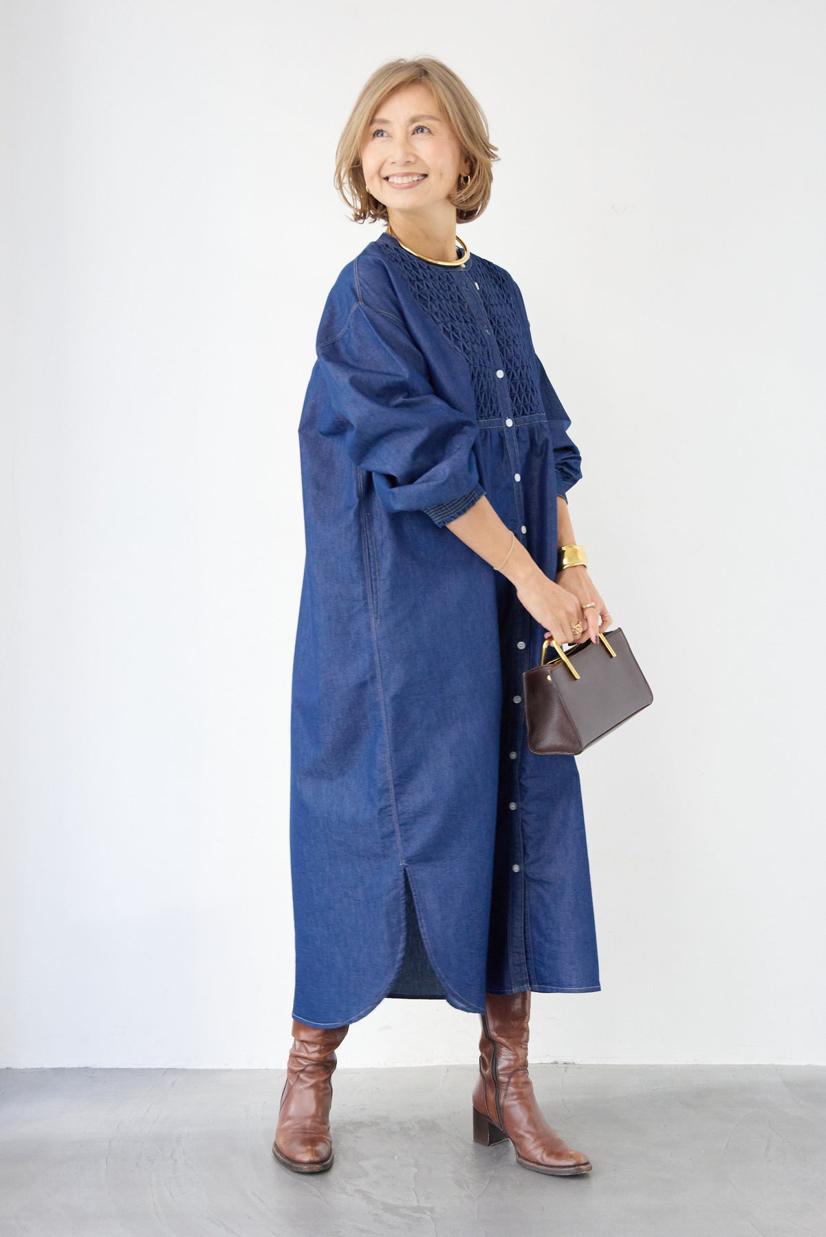 繊細な手仕事が映える、大人のためのデニムワンピース。胸元に施したハンドスモッキングが、シンプルなデニム素材に立体感と表情をプラスします。やや落ち感のあるデニム生地を使用し、身体のラインを拾いにくいゆったりとしたシルエットに。前開き仕様のため、ワンピースとしてはもちろん、軽い羽織としても着用可能です。袖口にはギャザーを入れ、さりげないボリューム感で女性らしさを演出。両サイドにはポケット付きで実用性も◎。ブーツやフラットシューズと合わせて、季節を問わず幅広いスタイリングを楽しめる一着です。