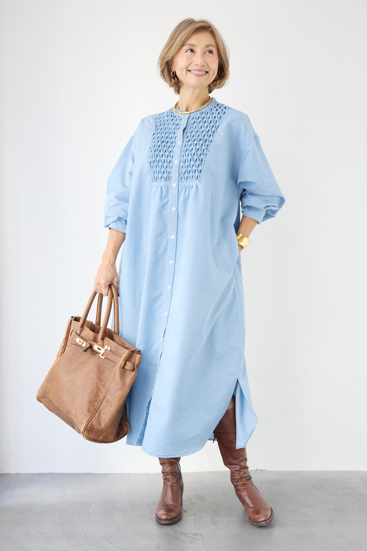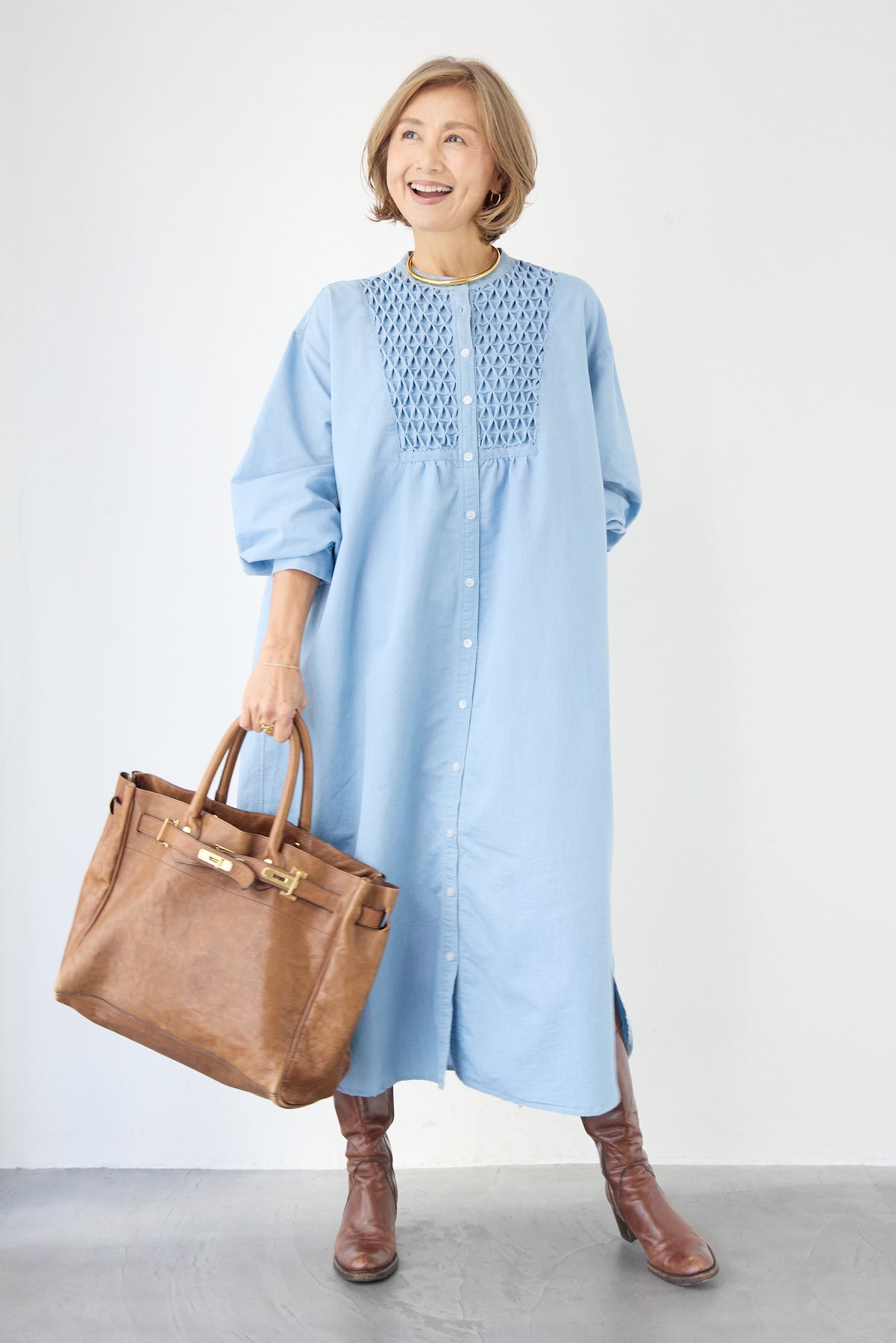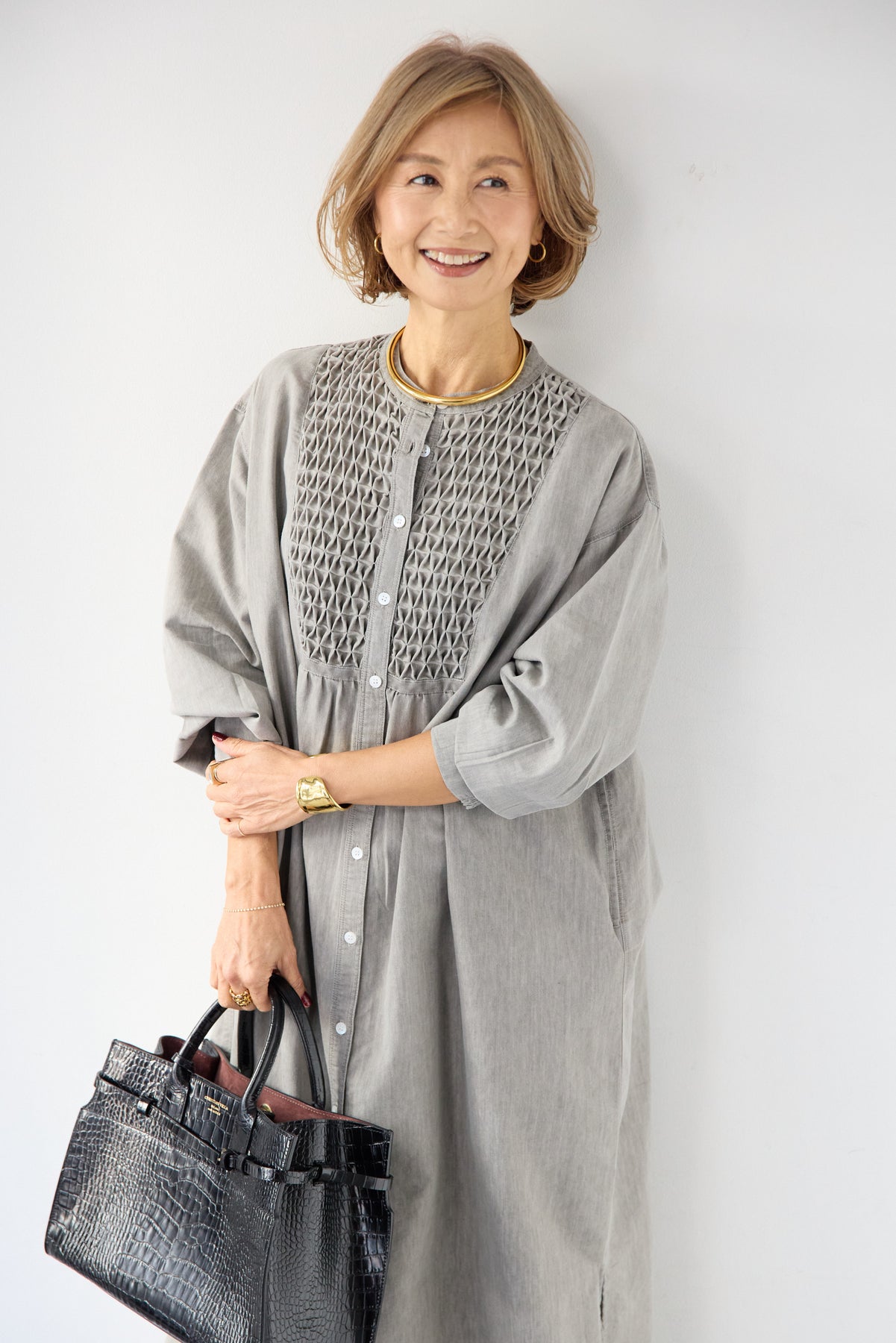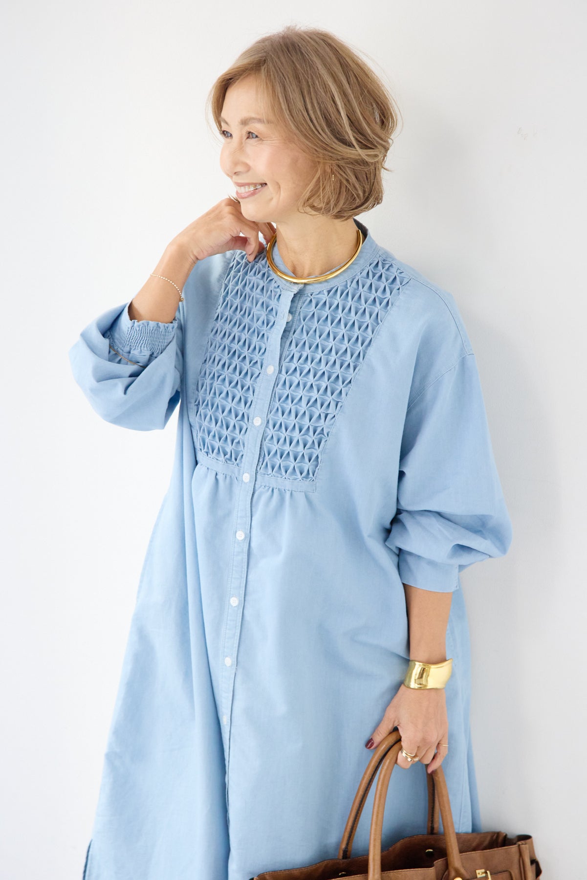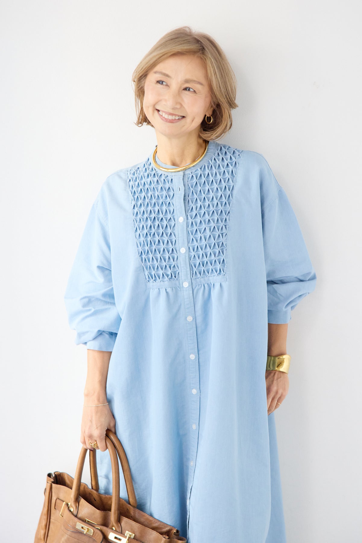繊細な手仕事が映える、大人のためのデニムワンピース。胸元に施したハンドスモッキングが、シンプルなデニム素材に立体感と表情をプラスします。やや落ち感のあるデニム生地を使用し、身体のラインを拾いにくいゆったりとしたシルエットに。前開き仕様のため、ワンピースとしてはもちろん、軽い羽織としても着用可能です。袖口にはギャザーを入れ、さりげないボリューム感で女性らしさを演出。両サイドにはポケット付きで実用性も◎。ブーツやフラットシューズと合わせて、季節を問わず幅広いスタイリングを楽しめる一着です。