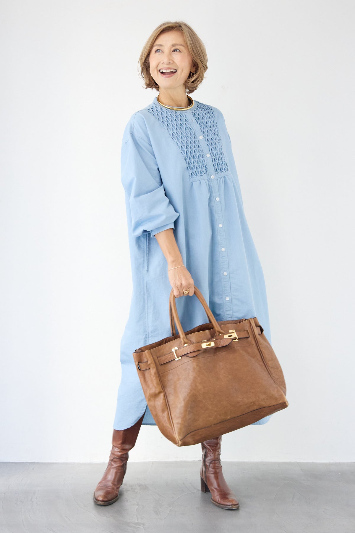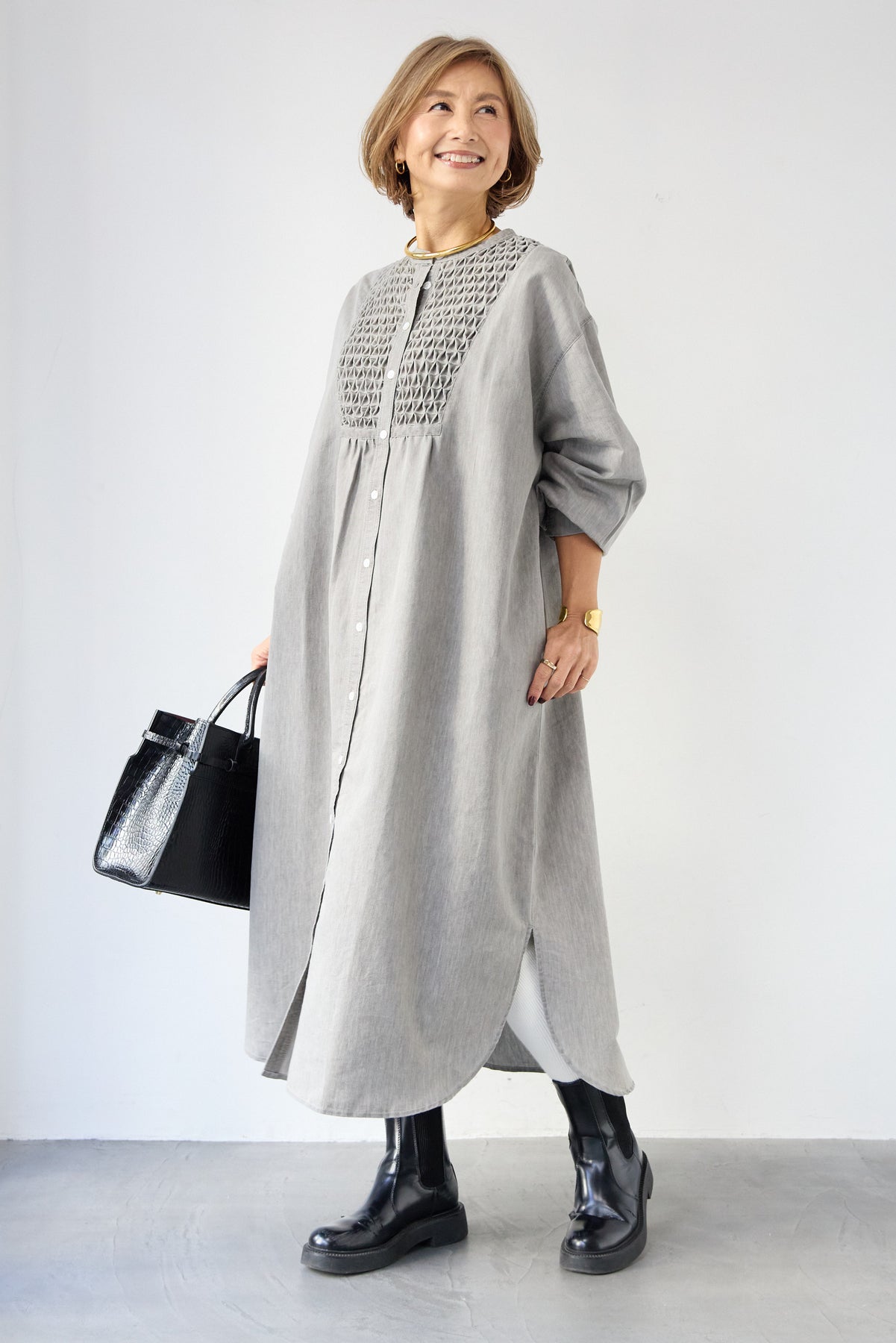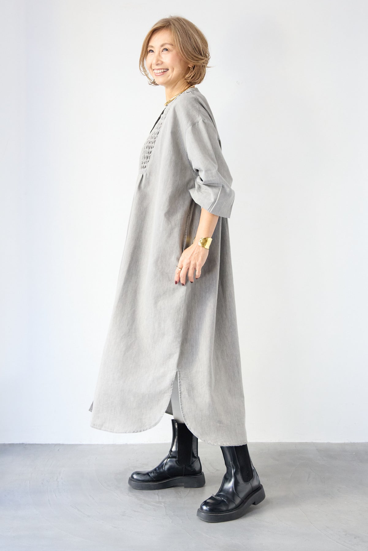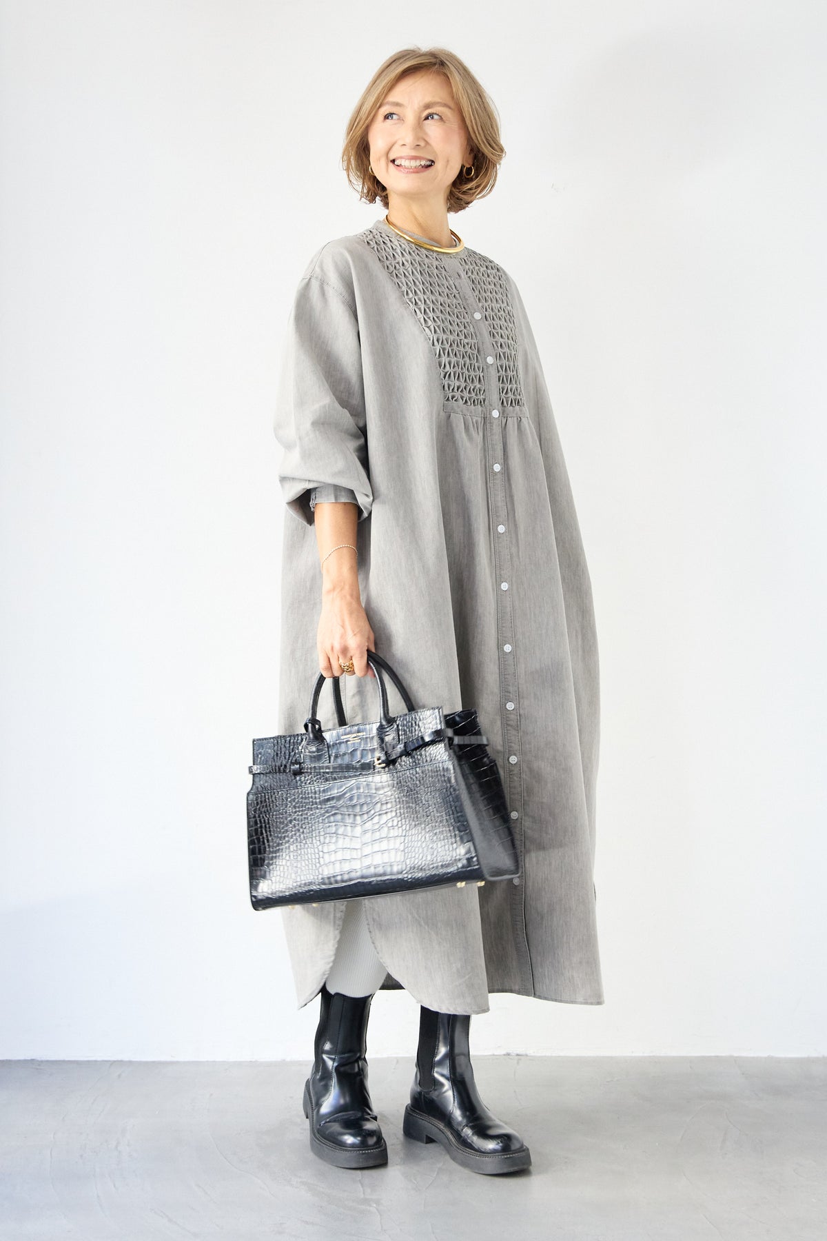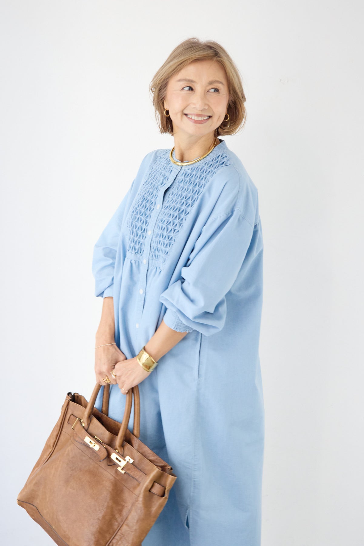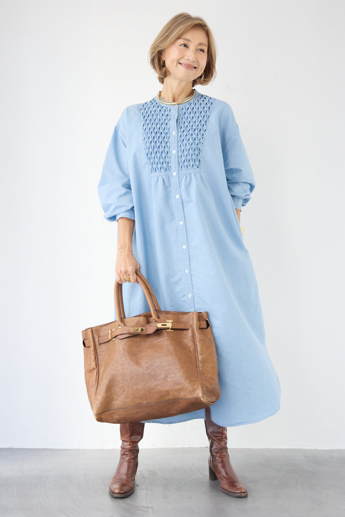 繊細な手仕事が映える、大人のためのデニムワンピース。胸元に施したハンドスモッキングが、シンプルなデニム素材に立体感と表情をプラスします。やや落ち感のあるデニム生地を使用し、身体のラインを拾いにくいゆったりとしたシルエットに。前開き仕様のため、ワンピースとしてはもちろん、軽い羽織としても着用可能です。袖口にはギャザーを入れ、さりげないボリューム感で女性らしさを演出。両サイドにはポケット付きで実用性も◎。ブーツやフラットシューズと合わせて、季節を問わず幅広いスタイリングを楽しめる一着です。
