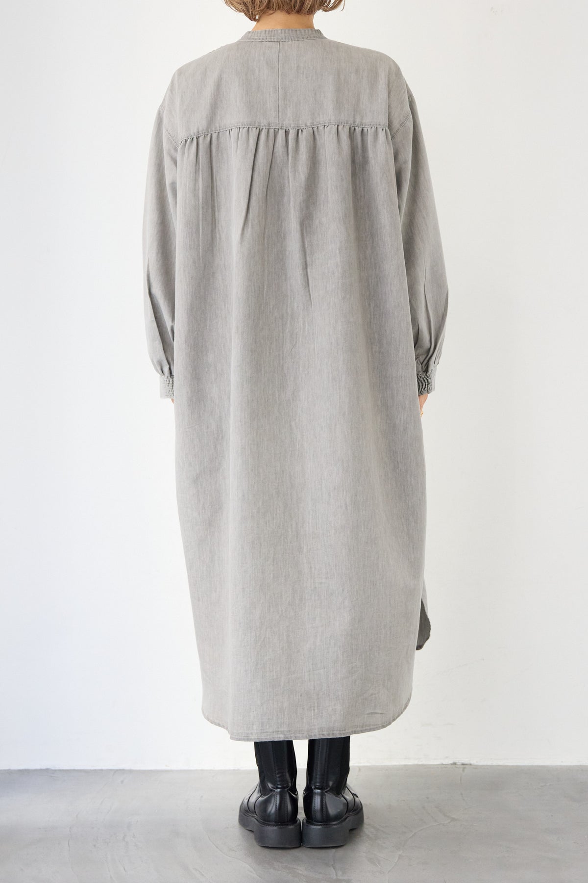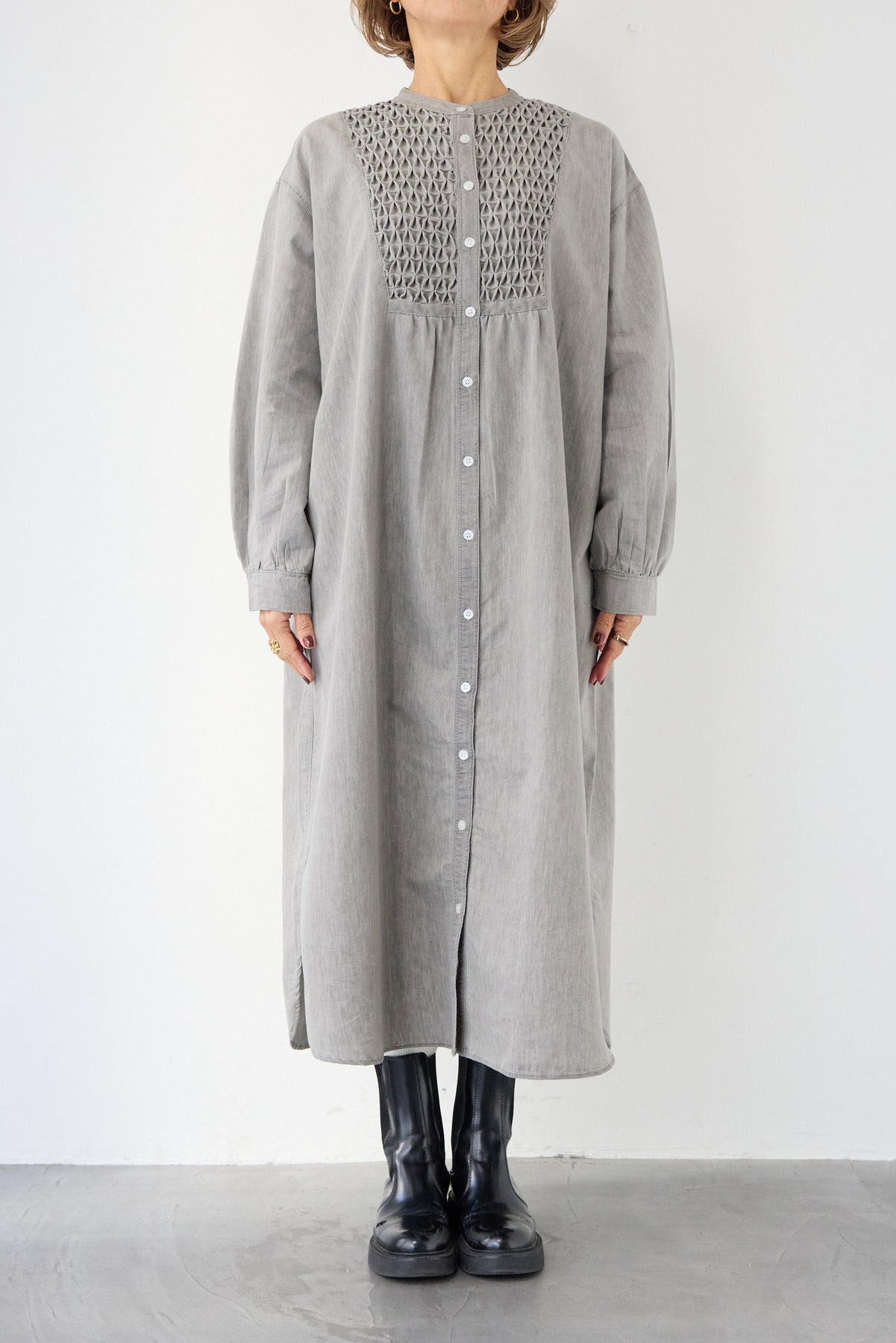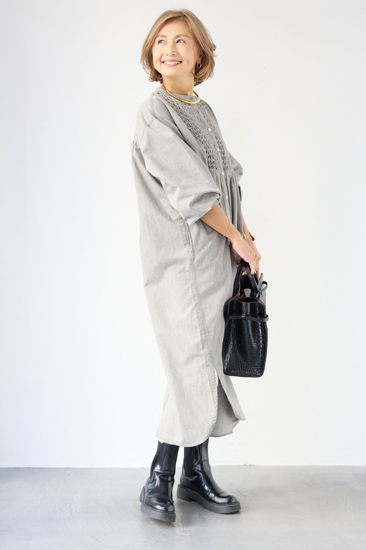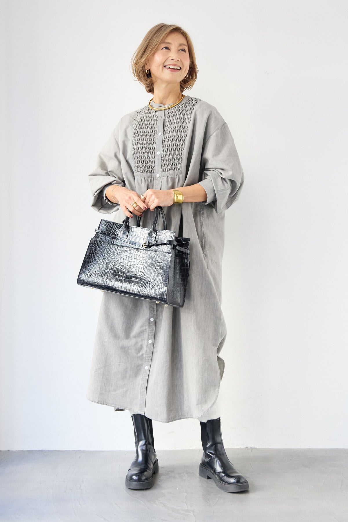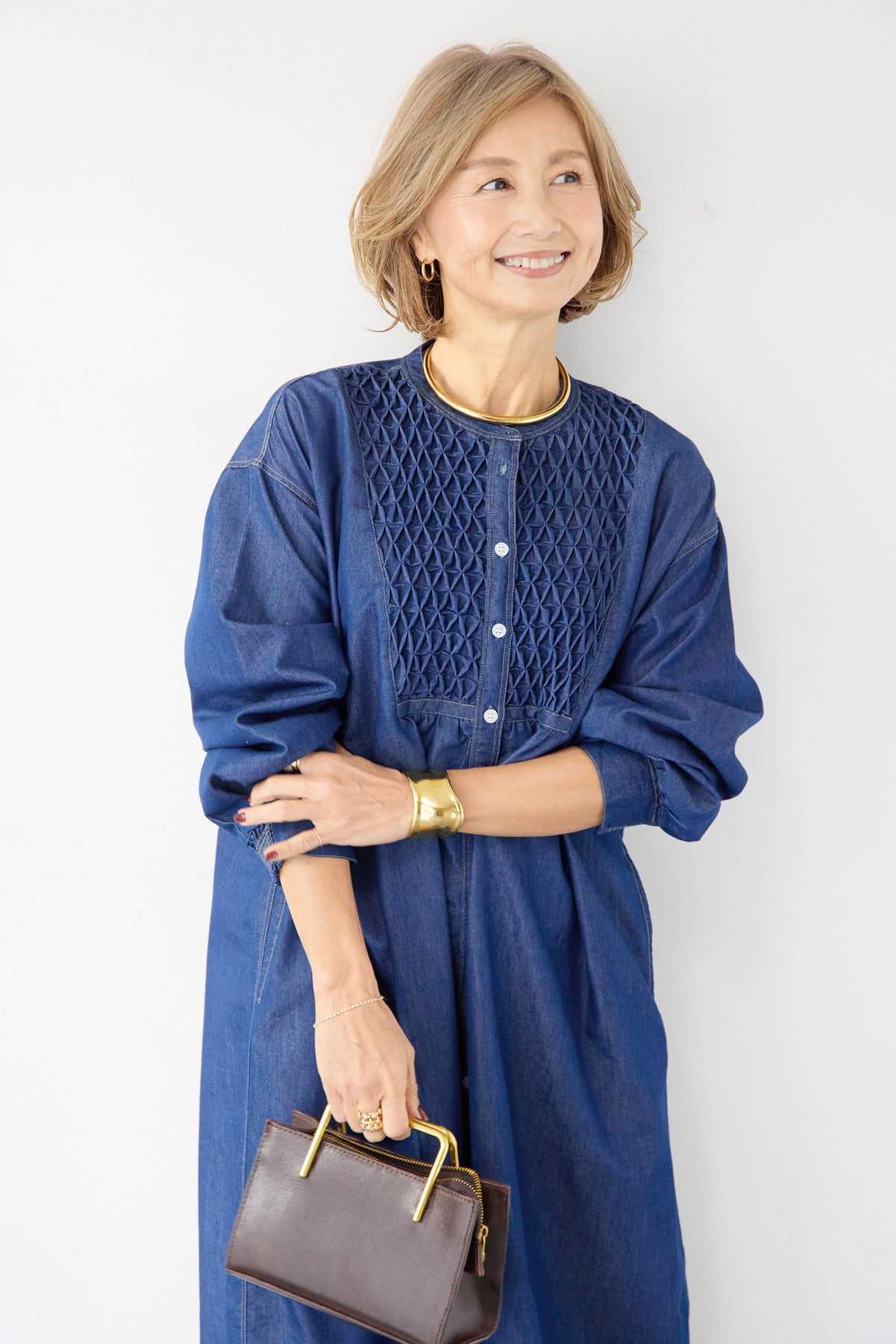 繊細な手仕事が映える、大人のためのデニムワンピース。胸元に施したハンドスモッキングが、シンプルなデニム素材に立体感と表情をプラスします。やや落ち感のあるデニム生地を使用し、身体のラインを拾いにくいゆったりとしたシルエットに。前開き仕様のため、ワンピースとしてはもちろん、軽い羽織としても着用可能です。袖口にはギャザーを入れ、さりげないボリューム感で女性らしさを演出。両サイドにはポケット付きで実用性も◎。ブーツやフラットシューズと合わせて、季節を問わず幅広いスタイリングを楽しめる一着です。