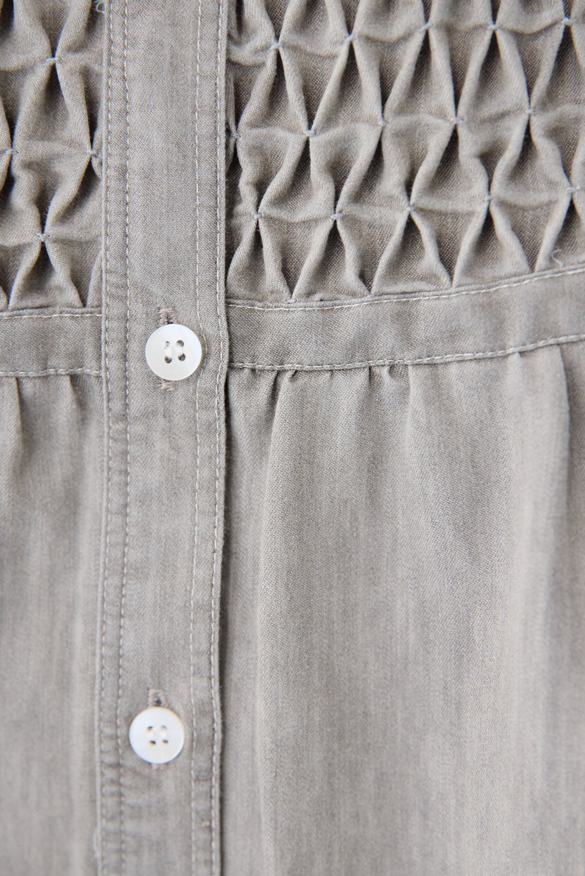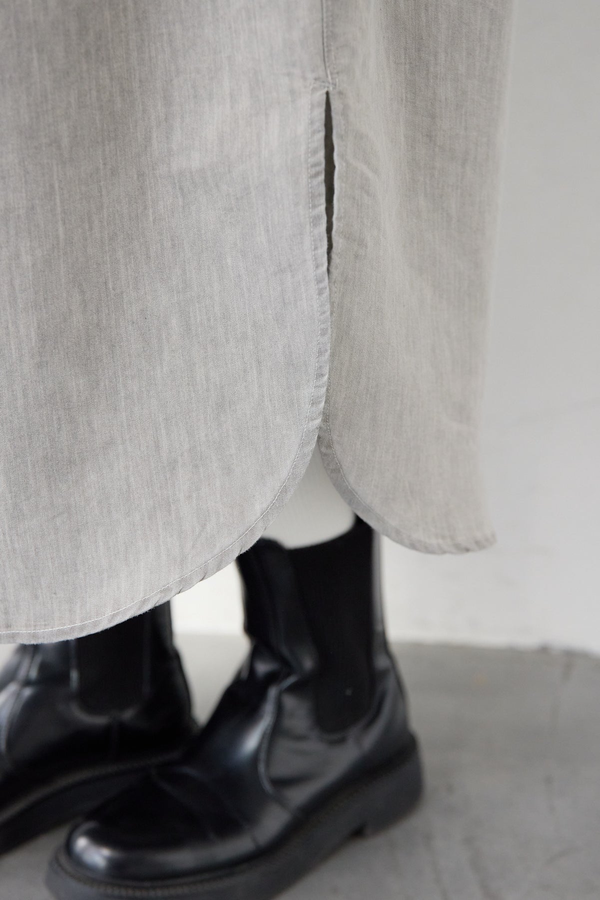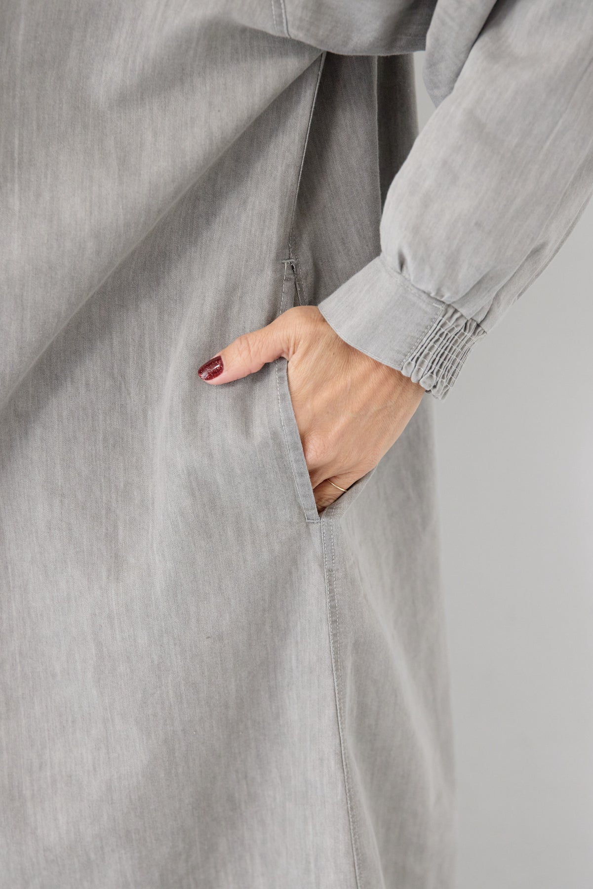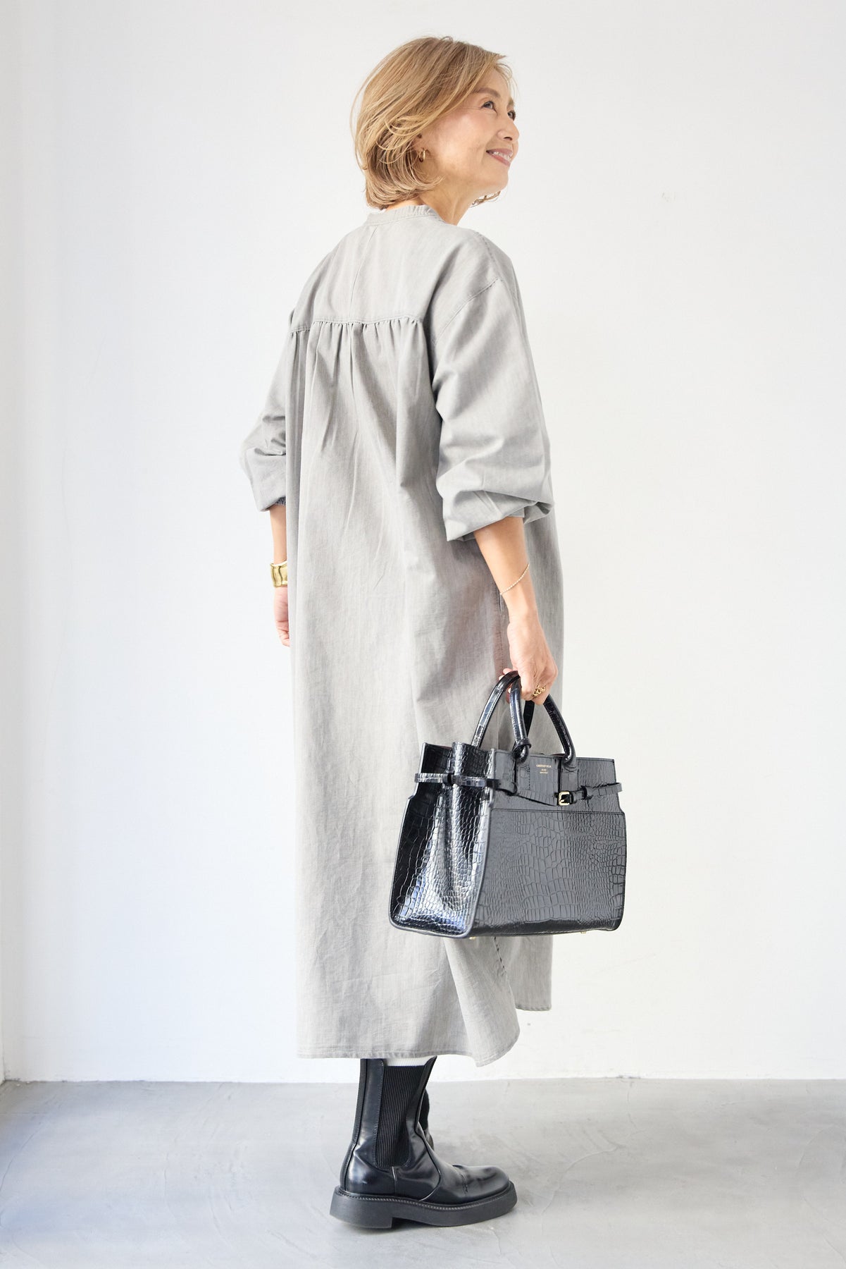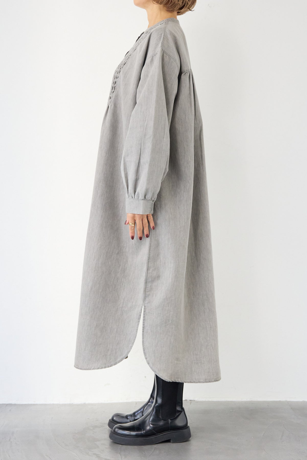 繊細な手仕事が映える、大人のためのデニムワンピース。胸元に施したハンドスモッキングが、シンプルなデニム素材に立体感と表情をプラスします。やや落ち感のあるデニム生地を使用し、身体のラインを拾いにくいゆったりとしたシルエットに。前開き仕様のため、ワンピースとしてはもちろん、軽い羽織としても着用可能です。袖口にはギャザーを入れ、さりげないボリューム感で女性らしさを演出。両サイドにはポケット付きで実用性も◎。ブーツやフラットシューズと合わせて、季節を問わず幅広いスタイリングを楽しめる一着です。