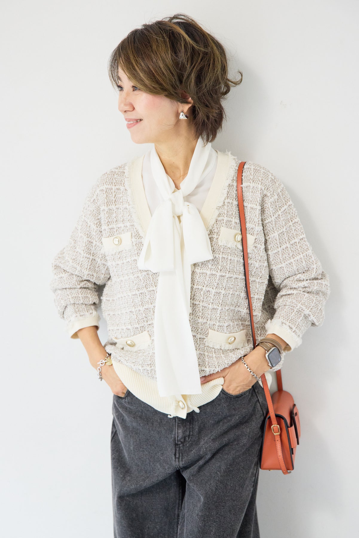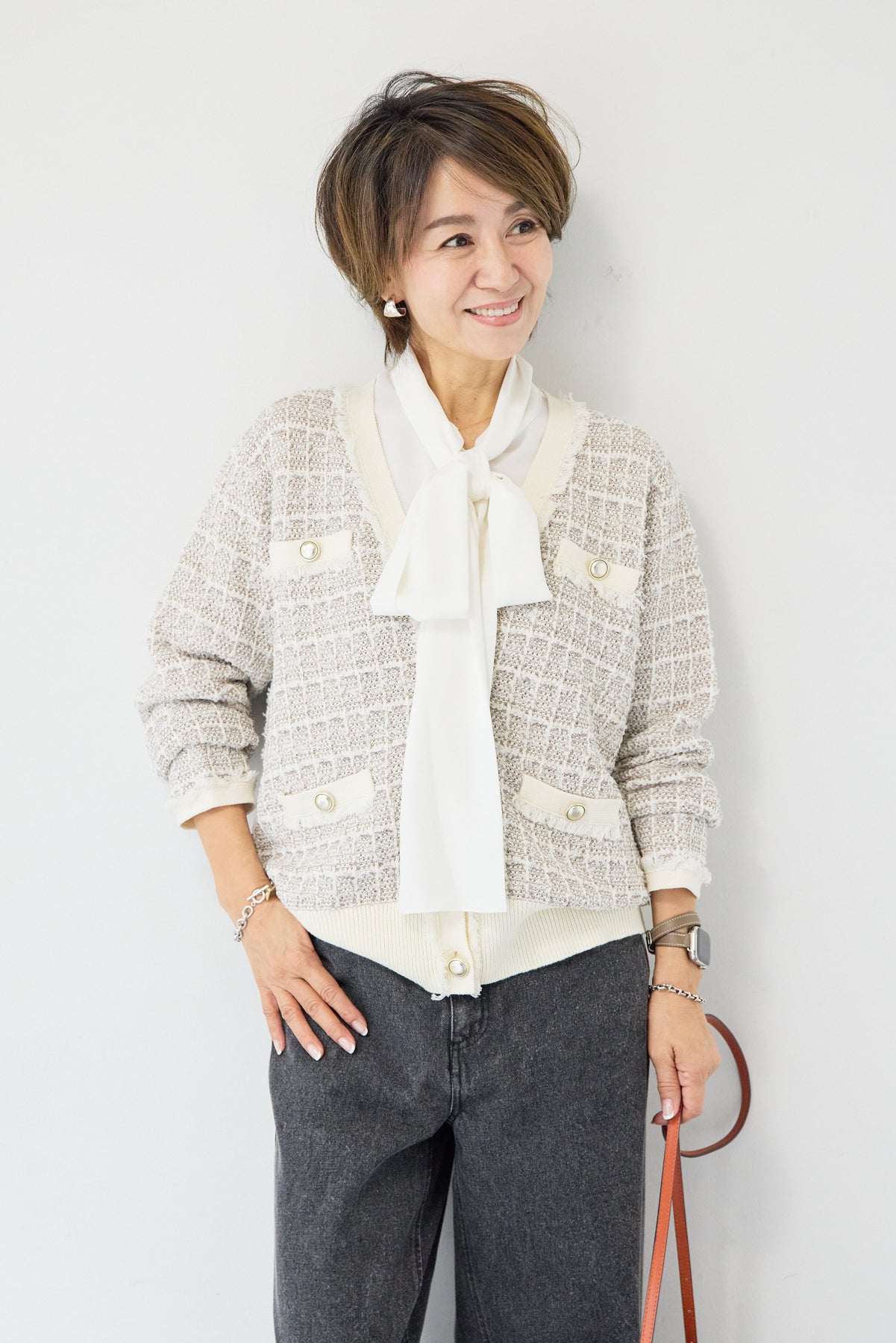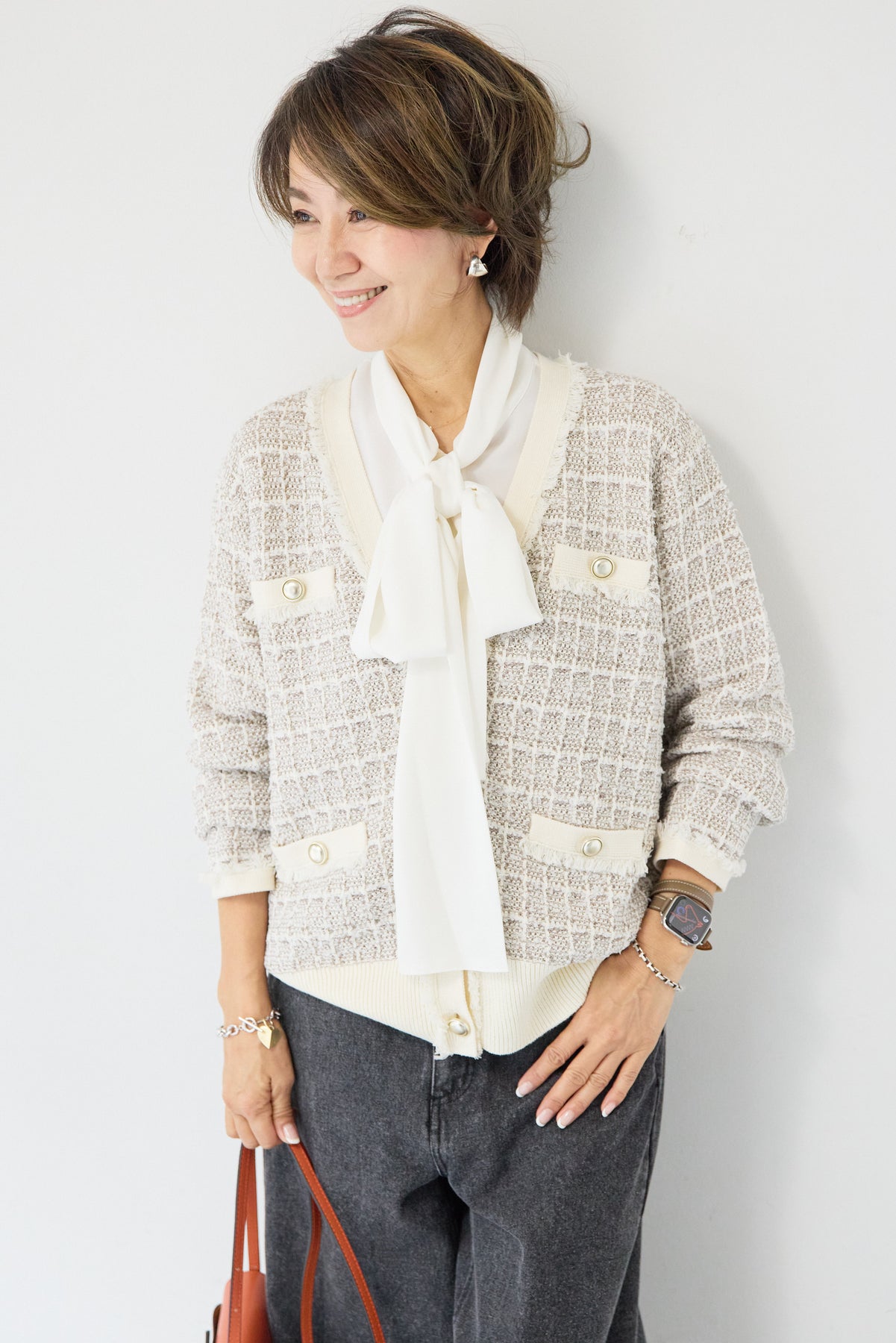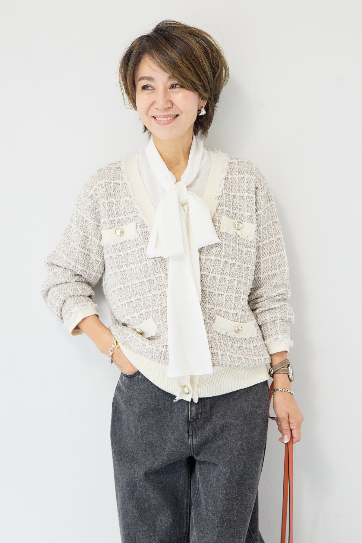 上品なツイード調の表情が目を惹く、ツイードジャガードニットカーディガン。ニット素材でツイードのような織り柄を表現したジャガード編みが、きちんと感と柔らかな着心地を両立します。Vネックデザインが首元をすっきりと見せ、インナーにブラウスやカットソーを合わせやすい仕様。フロントやポケット部分にはフリンジ風のディテールを施し、さりげない華やかさをプラスしています。上品な光沢感のあるメタル調ボタンが、クラシカルなアクセントに。 裾と袖口はリブ仕様で、程よくメリハリのあるシルエットに。ジャケットライクな見た目ながら、ニットならではの伸縮性でリラックスした着心地を叶えます。ボウタイブラウスと合わせたきれいめスタイルから、デニム合わせのカジュアルダウンまで幅広く活躍。
