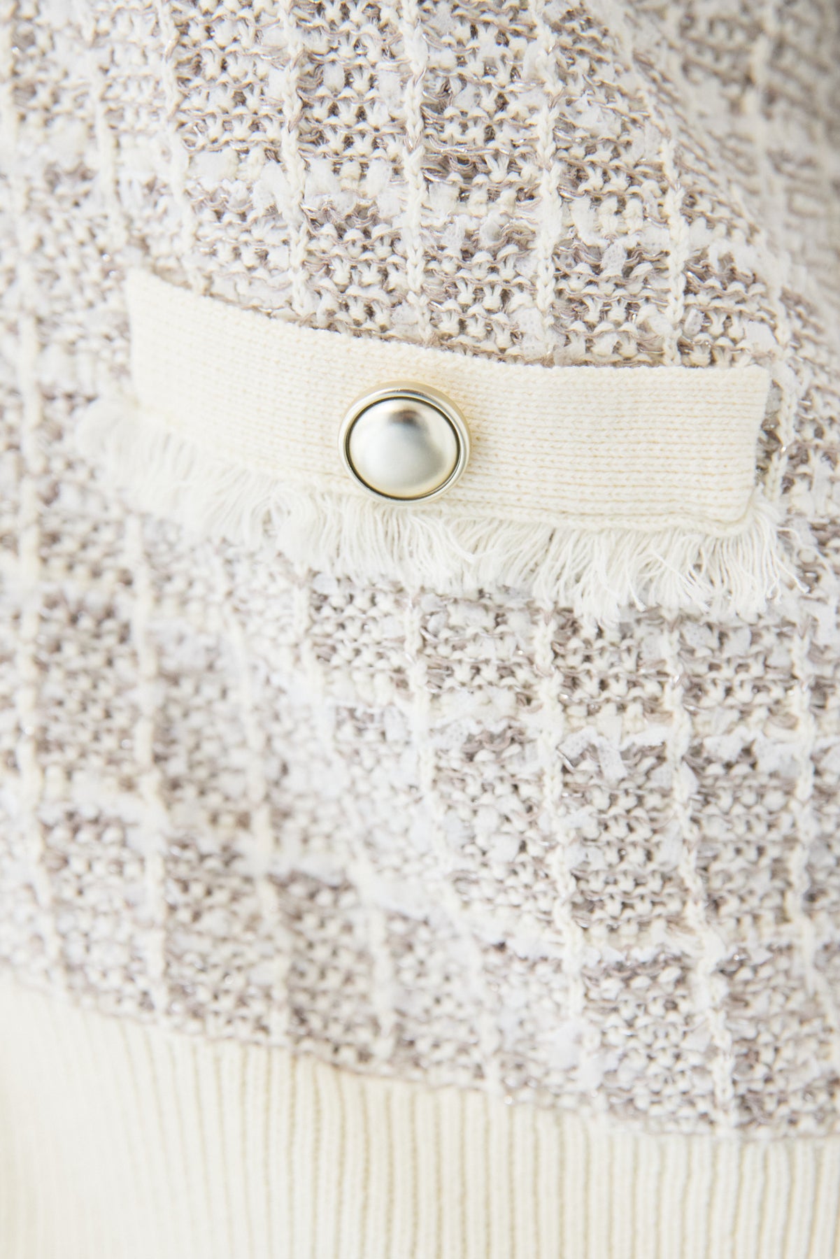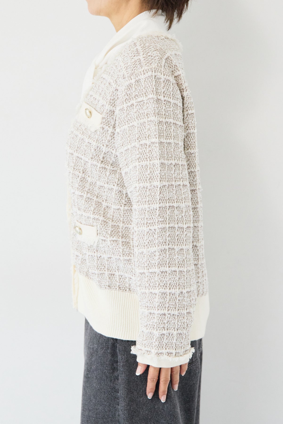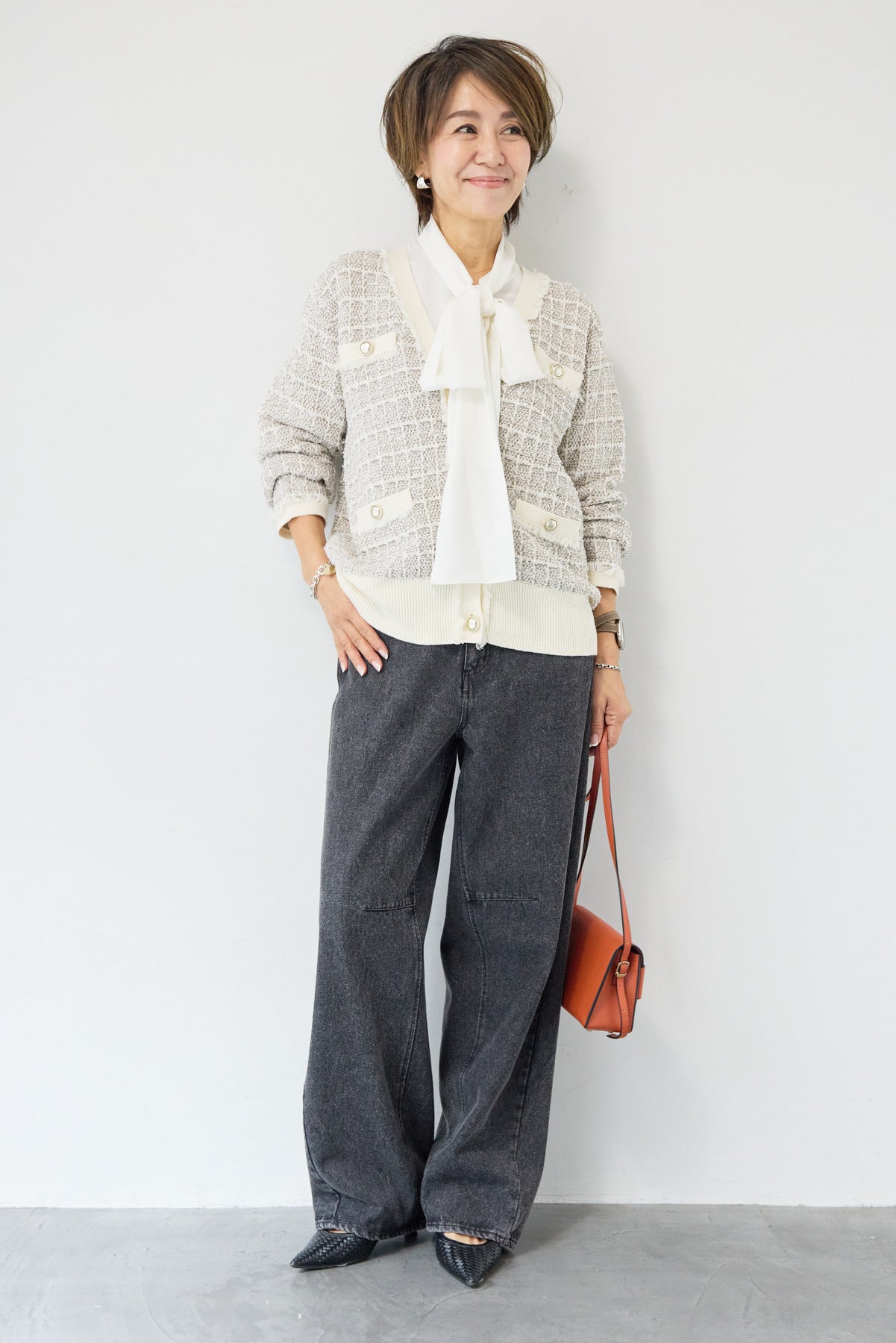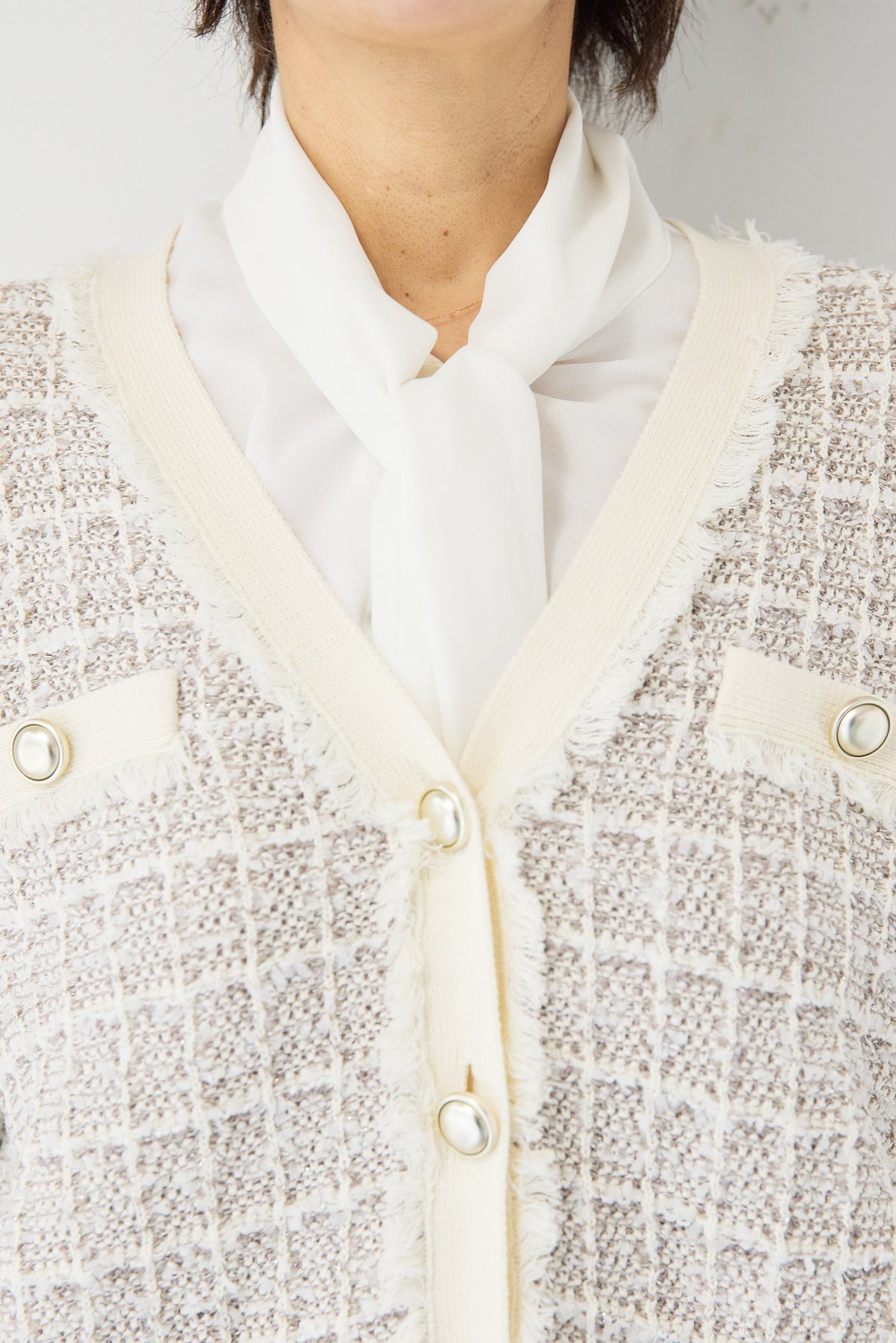 上品なツイード調の表情が目を惹く、ツイードジャガードニットカーディガン。ニット素材でツイードのような織り柄を表現したジャガード編みが、きちんと感と柔らかな着心地を両立します。Vネックデザインが首元をすっきりと見せ、インナーにブラウスやカットソーを合わせやすい仕様。フロントやポケット部分にはフリンジ風のディテールを施し、さりげない華やかさをプラスしています。上品な光沢感のあるメタル調ボタンが、クラシカルなアクセントに。 裾と袖口はリブ仕様で、程よくメリハリのあるシルエットに。ジャケットライクな見た目ながら、ニットならではの伸縮性でリラックスした着心地を叶えます。ボウタイブラウスと合わせたきれいめスタイルから、デニム合わせのカジュアルダウンまで幅広く活躍。