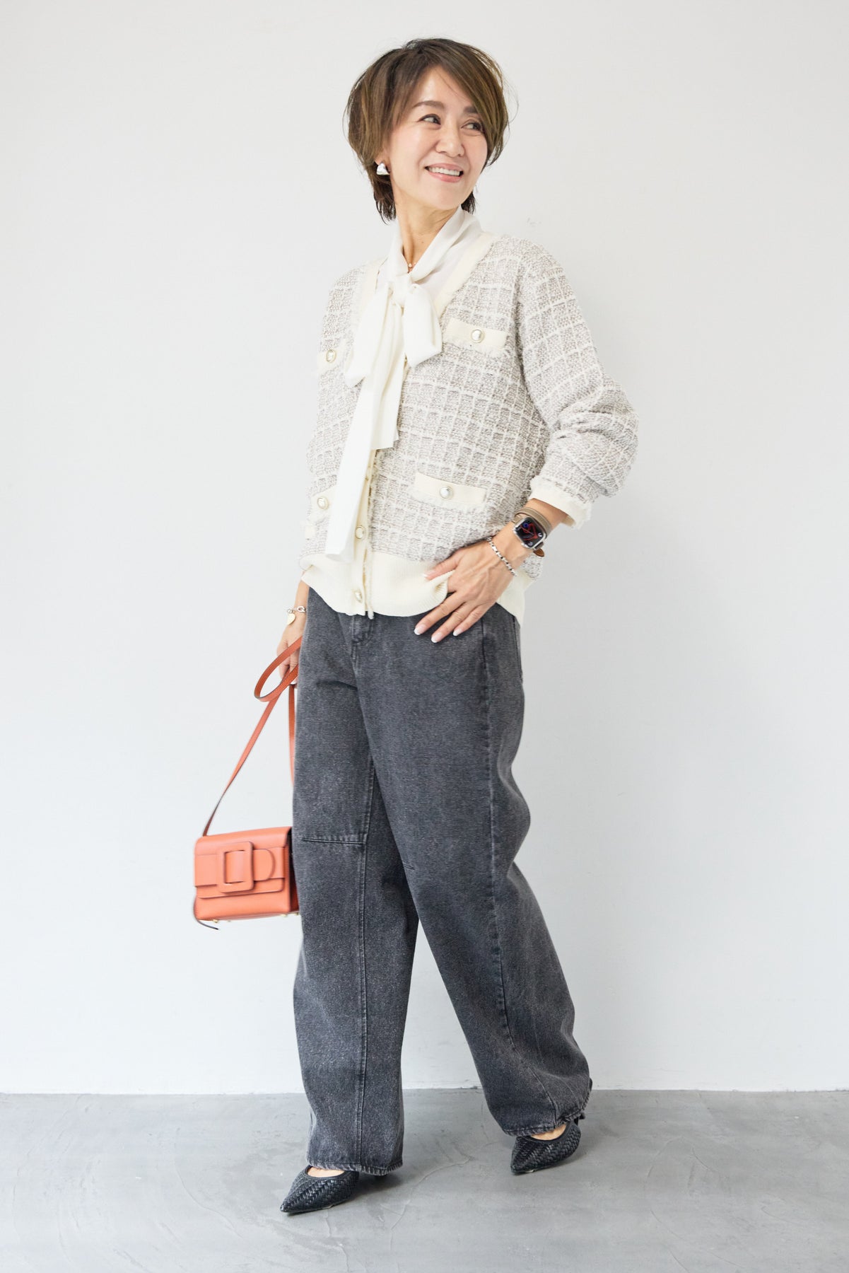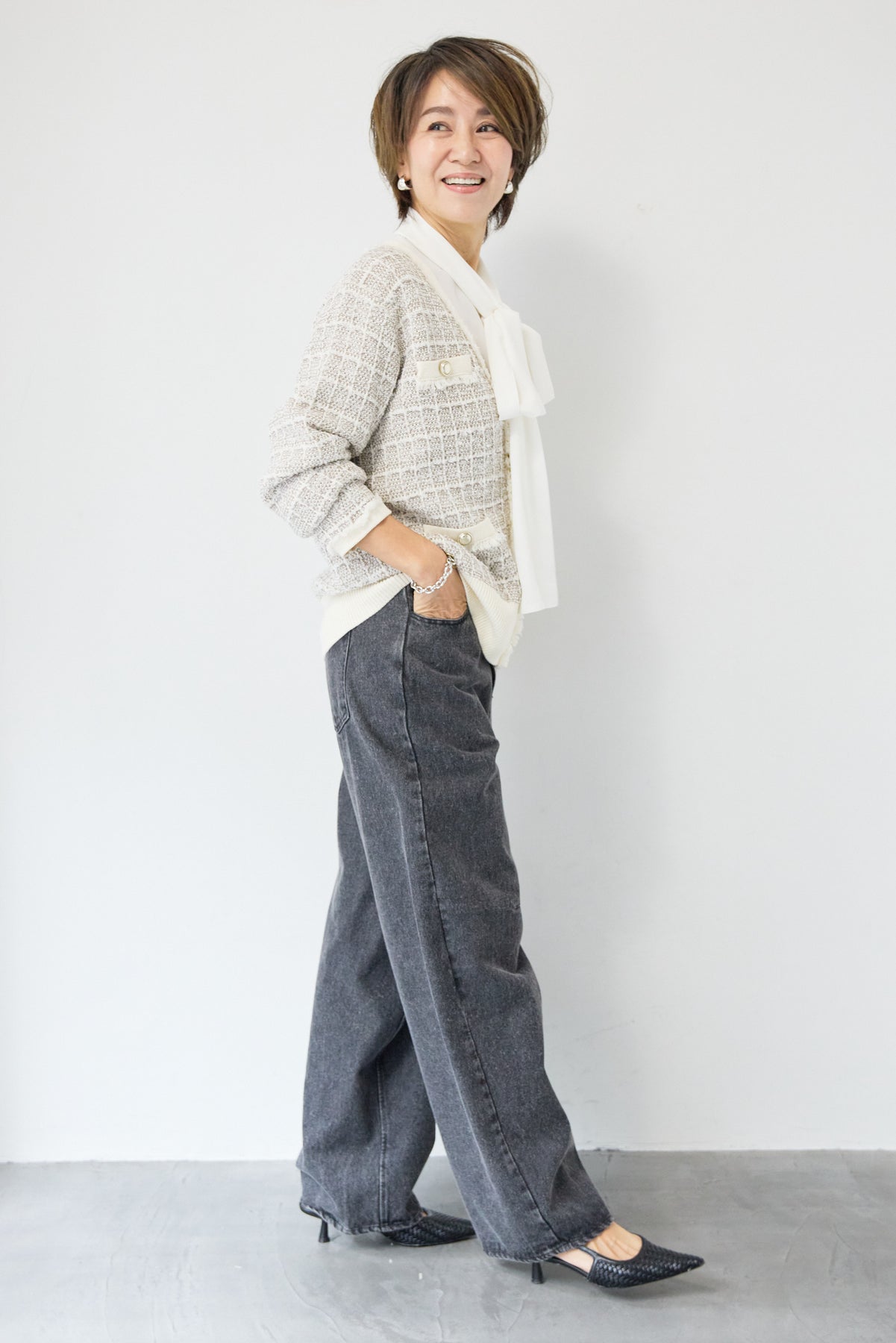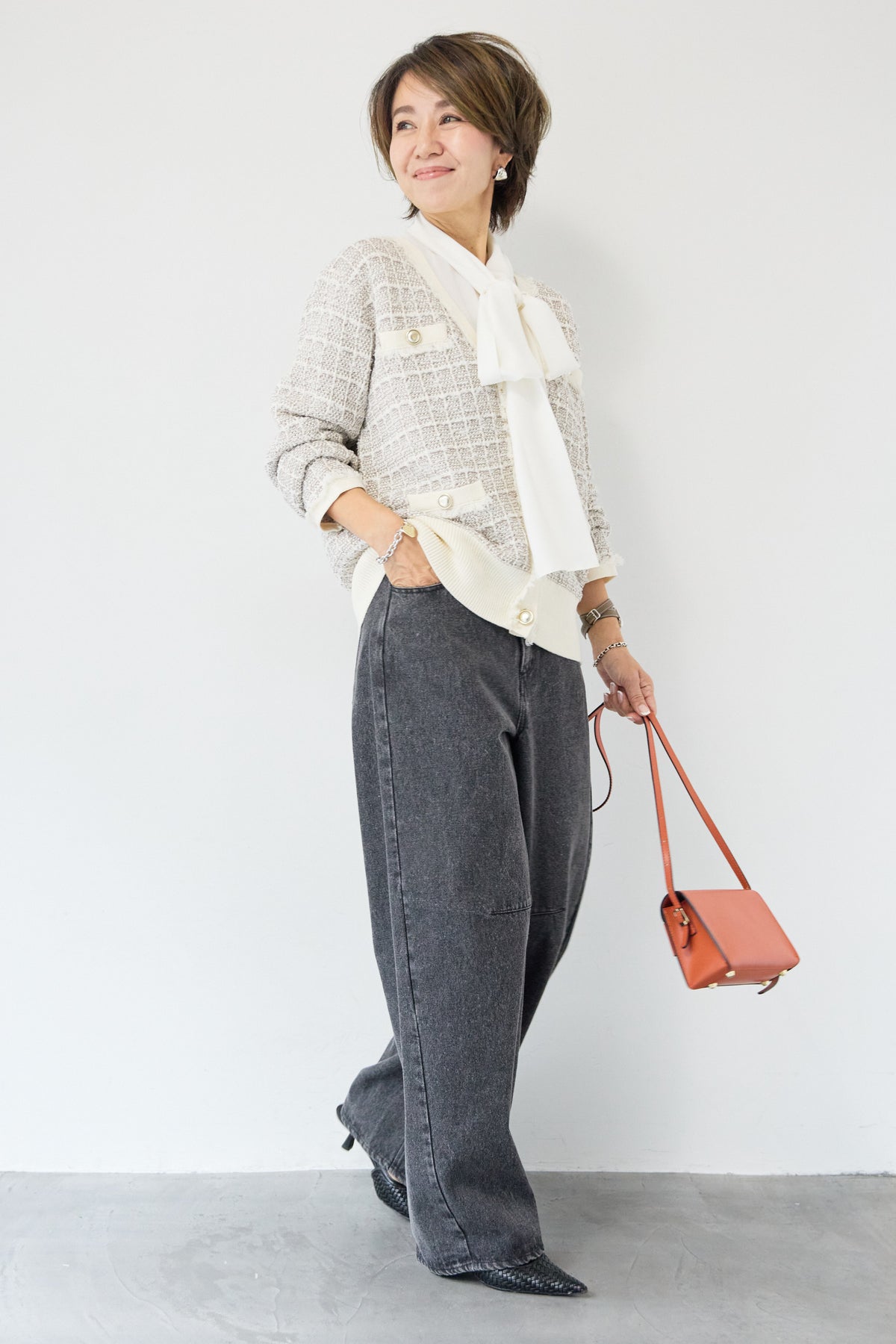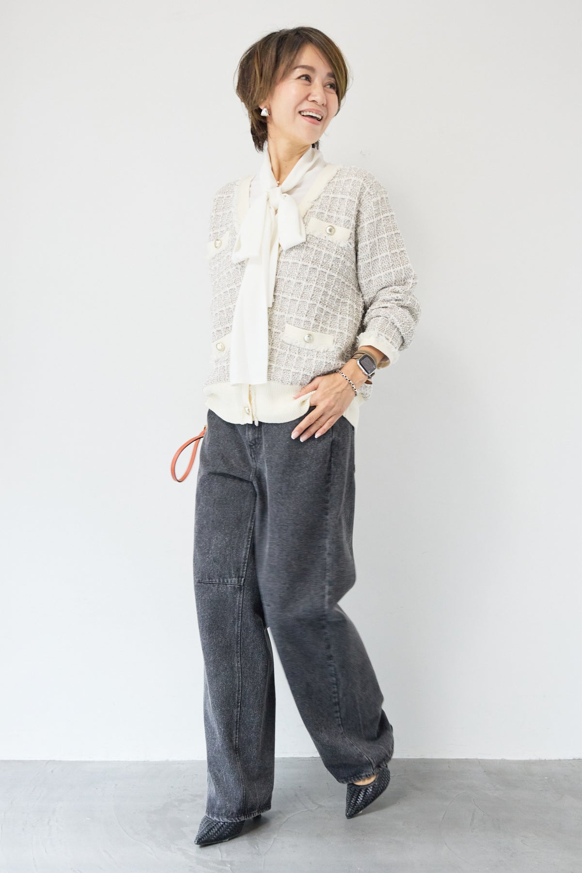 上品なツイード調の表情が目を惹く、ツイードジャガードニットカーディガン。ニット素材でツイードのような織り柄を表現したジャガード編みが、きちんと感と柔らかな着心地を両立します。Vネックデザインが首元をすっきりと見せ、インナーにブラウスやカットソーを合わせやすい仕様。フロントやポケット部分にはフリンジ風のディテールを施し、さりげない華やかさをプラスしています。上品な光沢感のあるメタル調ボタンが、クラシカルなアクセントに。 裾と袖口はリブ仕様で、程よくメリハリのあるシルエットに。ジャケットライクな見た目ながら、ニットならではの伸縮性でリラックスした着心地を叶えます。ボウタイブラウスと合わせたきれいめスタイルから、デニム合わせのカジュアルダウンまで幅広く活躍。
