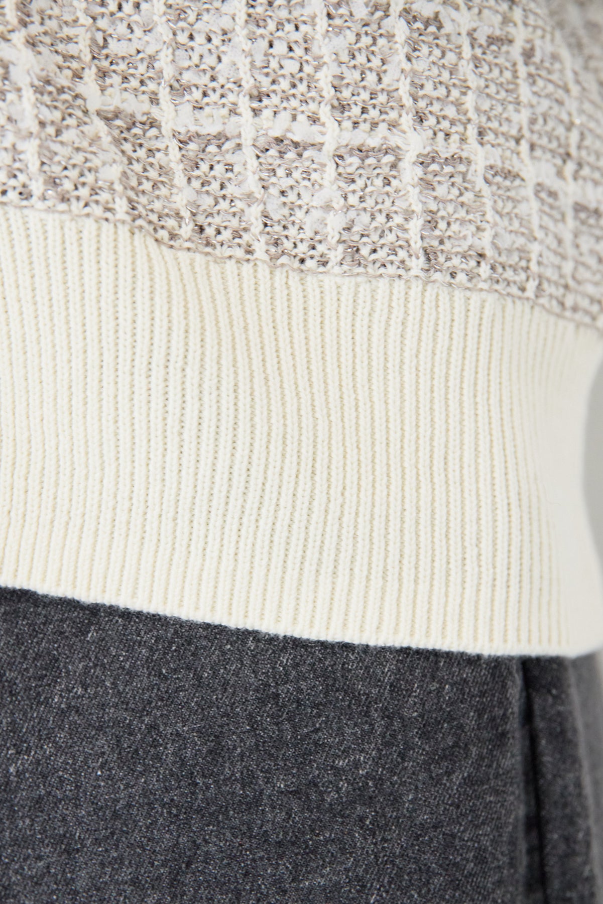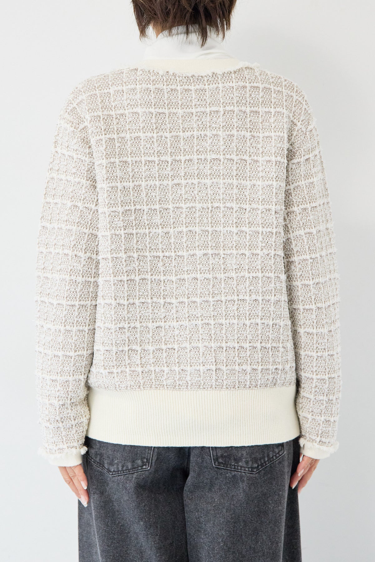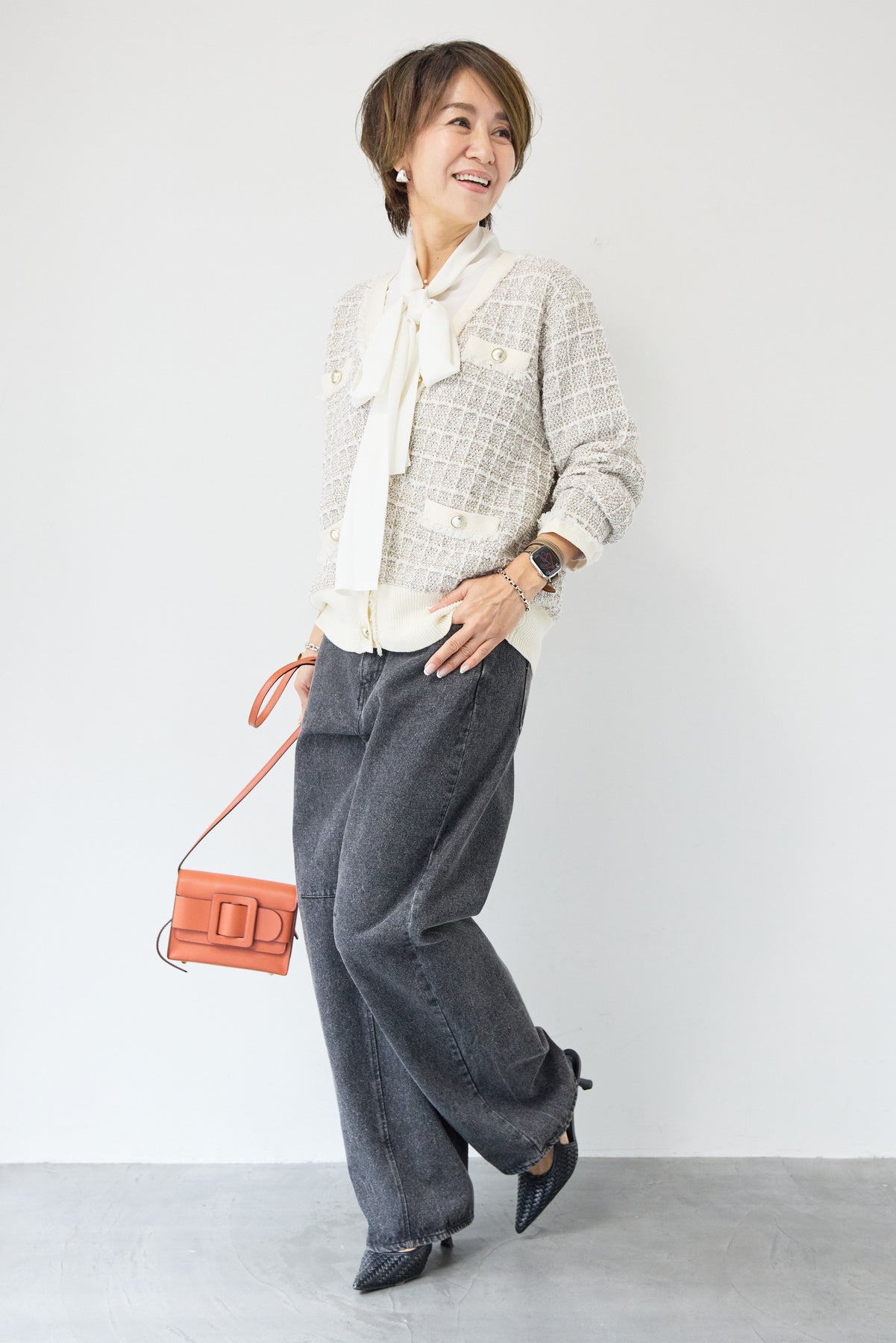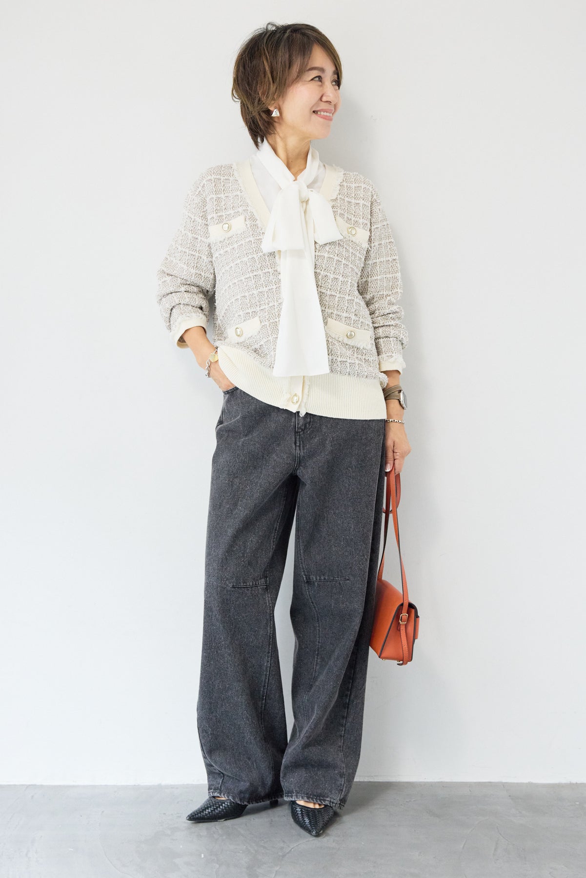 上品なツイード調の表情が目を惹く、ツイードジャガードニットカーディガン。ニット素材でツイードのような織り柄を表現したジャガード編みが、きちんと感と柔らかな着心地を両立します。Vネックデザインが首元をすっきりと見せ、インナーにブラウスやカットソーを合わせやすい仕様。フロントやポケット部分にはフリンジ風のディテールを施し、さりげない華やかさをプラスしています。上品な光沢感のあるメタル調ボタンが、クラシカルなアクセントに。 裾と袖口はリブ仕様で、程よくメリハリのあるシルエットに。ジャケットライクな見た目ながら、ニットならではの伸縮性でリラックスした着心地を叶えます。ボウタイブラウスと合わせたきれいめスタイルから、デニム合わせのカジュアルダウンまで幅広く活躍。