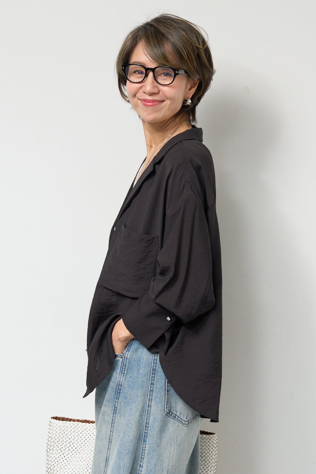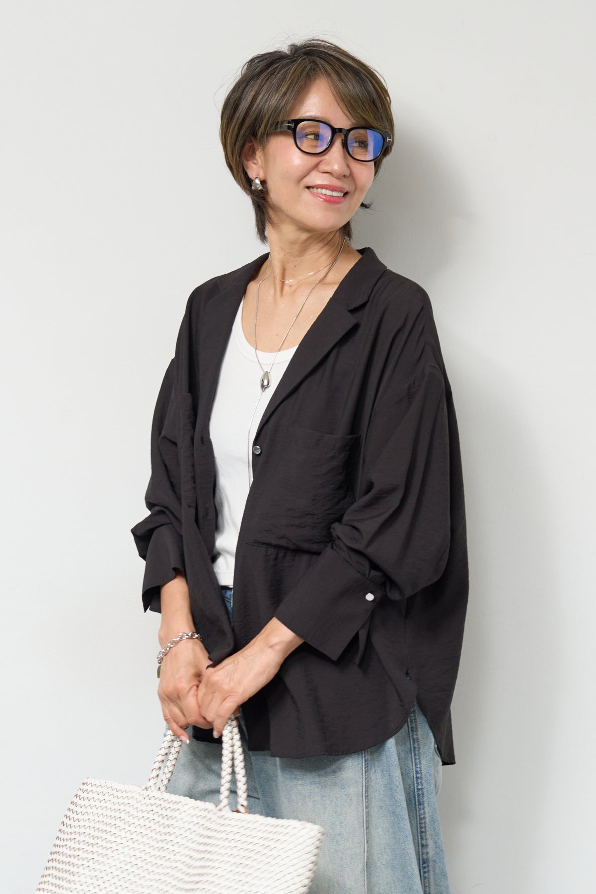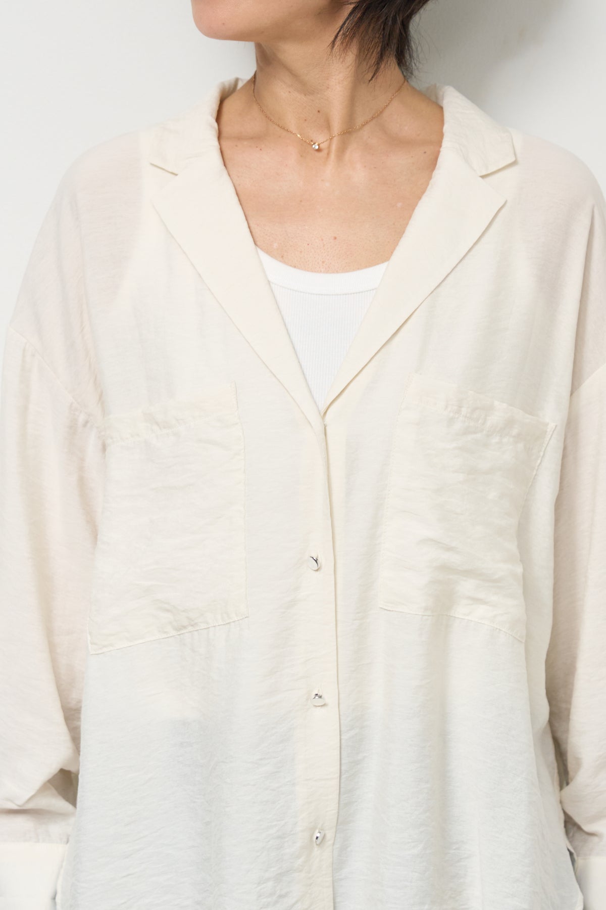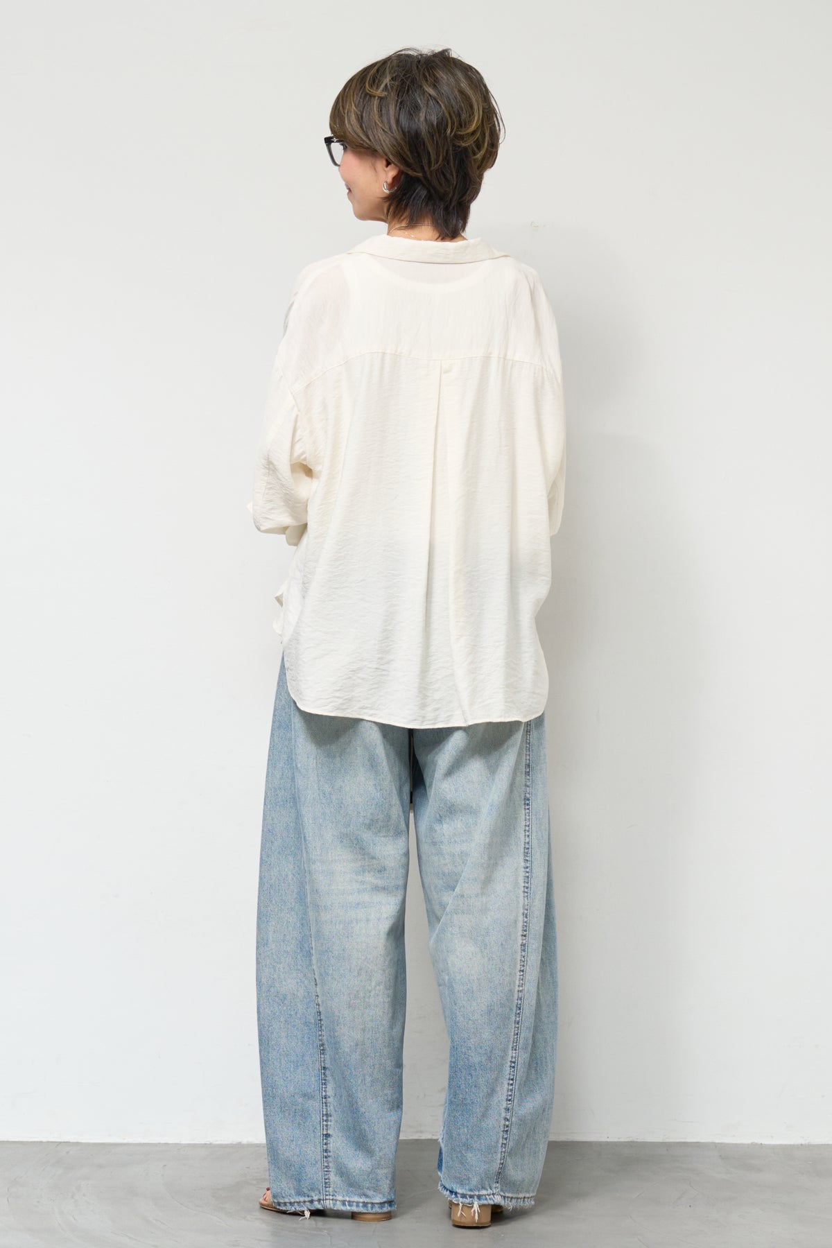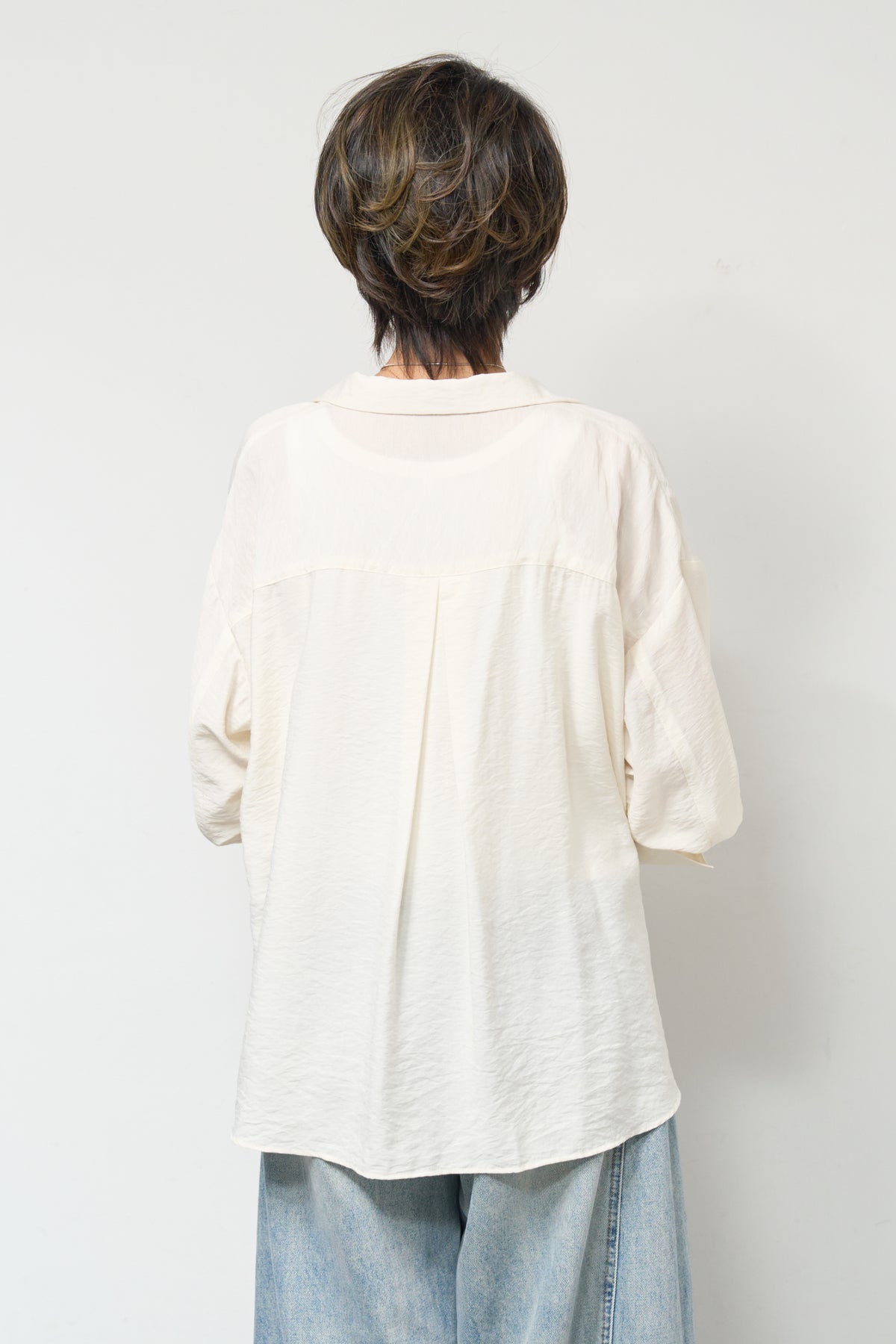 軽やかな透け感が魅力のシアーシャツジャケット。ほんのりと光沢のある柔らかな素材が、羽織るだけで上品で涼しげな印象に仕上げてくれます。ゆったりとしたシルエットとドロップショルダーで体のラインを拾いにくく、さりげなく体型カバーも叶う一枚。ヒップにかかる前後差のある着丈で、どの角度から見てもバランス良く決まります。大きめのフロントポケットや華奢なボタンが程よいアクセントになり、シンプルながらもこなれた雰囲気に。袖口は広めのカフスデザインで、折り返して着こなしのアレンジも楽しめます。インナー次第でロングシーズン活躍し、Tシャツやタンクトップの上からさらっと羽織るだけで、抜け感のある大人カジュアルスタイルが完成します。