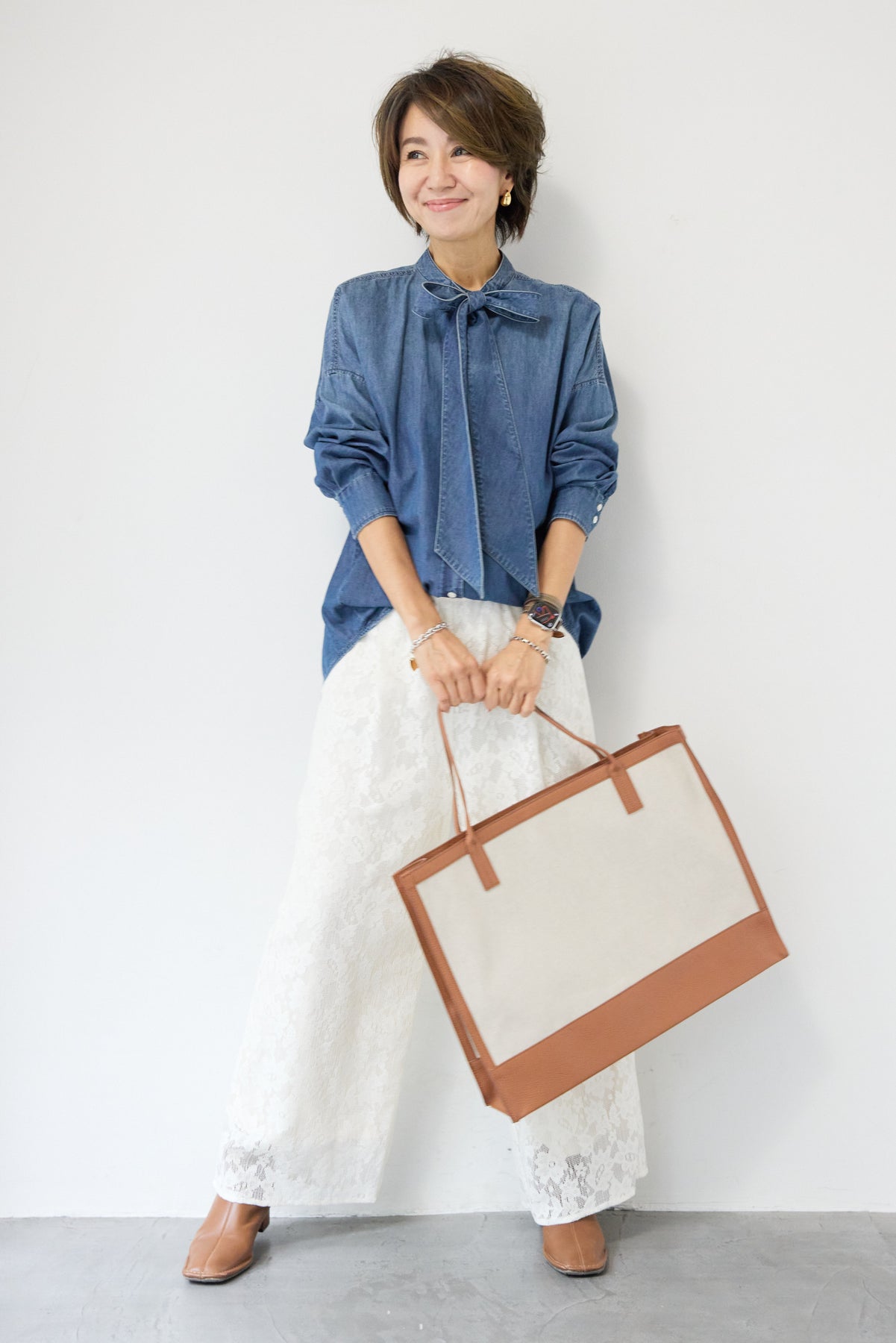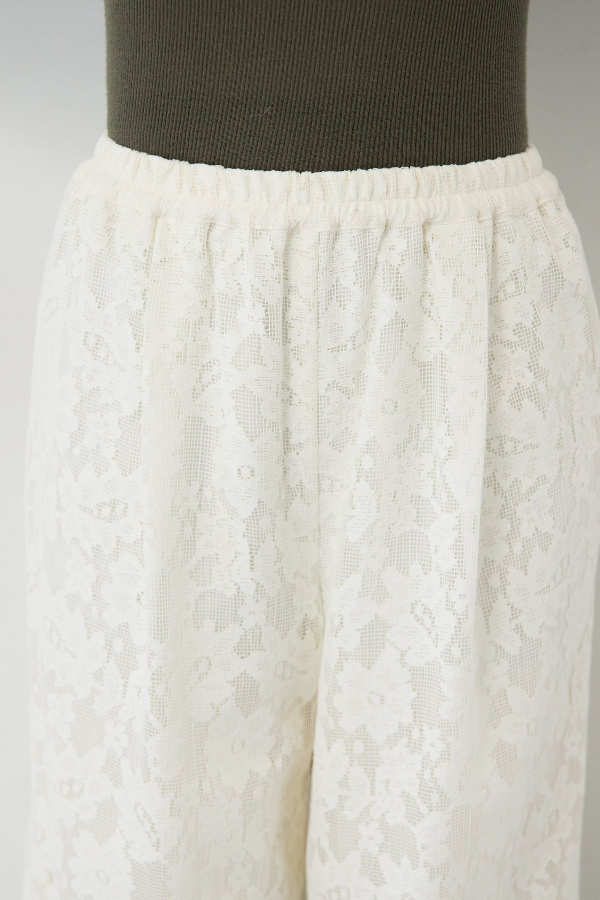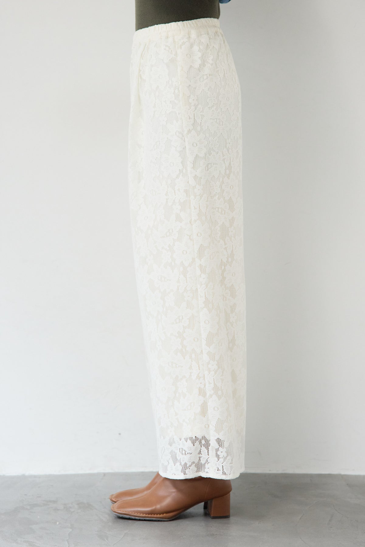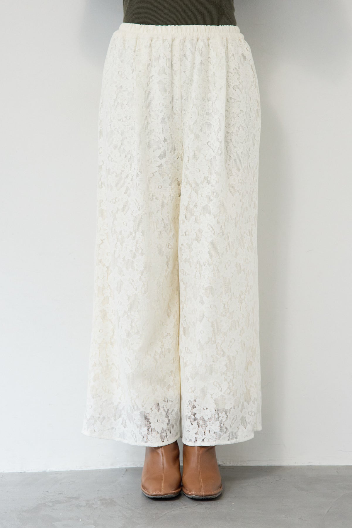繊細なフラワーレースが上品な存在感を放つワイドパンツ。全面に施された花柄のエンブロイダリーが、コーディネートにやさしい華やかさを添えます。シルエットは程よくゆとりのあるワイドタイプで、脚のラインを拾いにくく、リラックス感のある履き心地。ウエストは総ゴム仕様のため、締め付け感が少なくデイリーに着用しやすいのもポイントです。裾にかけてレースの透け感が楽しめ、重くなりがちなワイドパンツスタイルも軽やかな印象に。シンプルなニットやカットソーと合わせるだけで、季節感のある大人フェミニンなスタイリングが完成します。