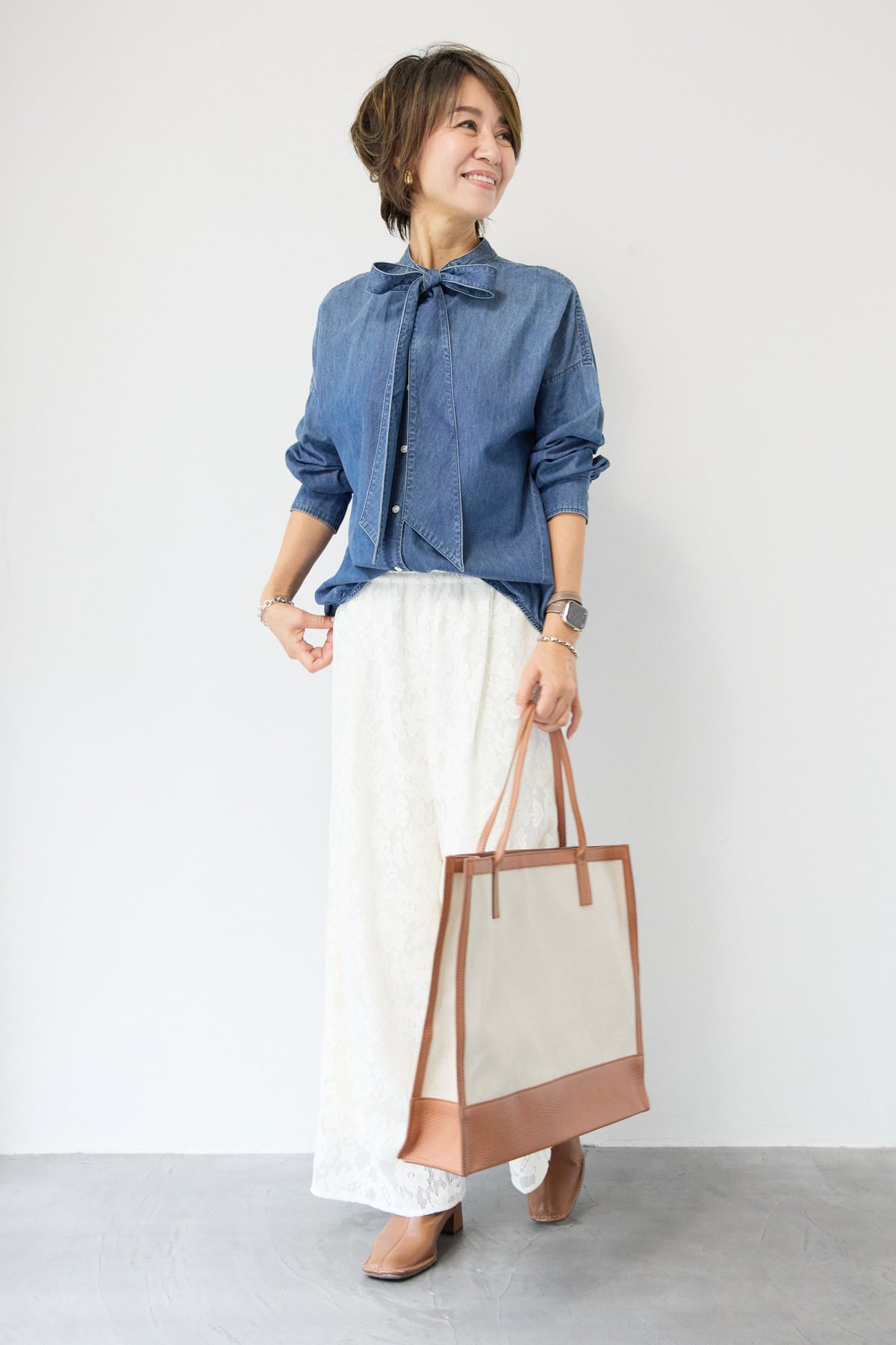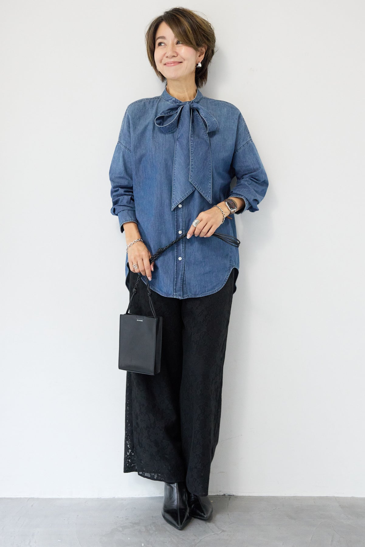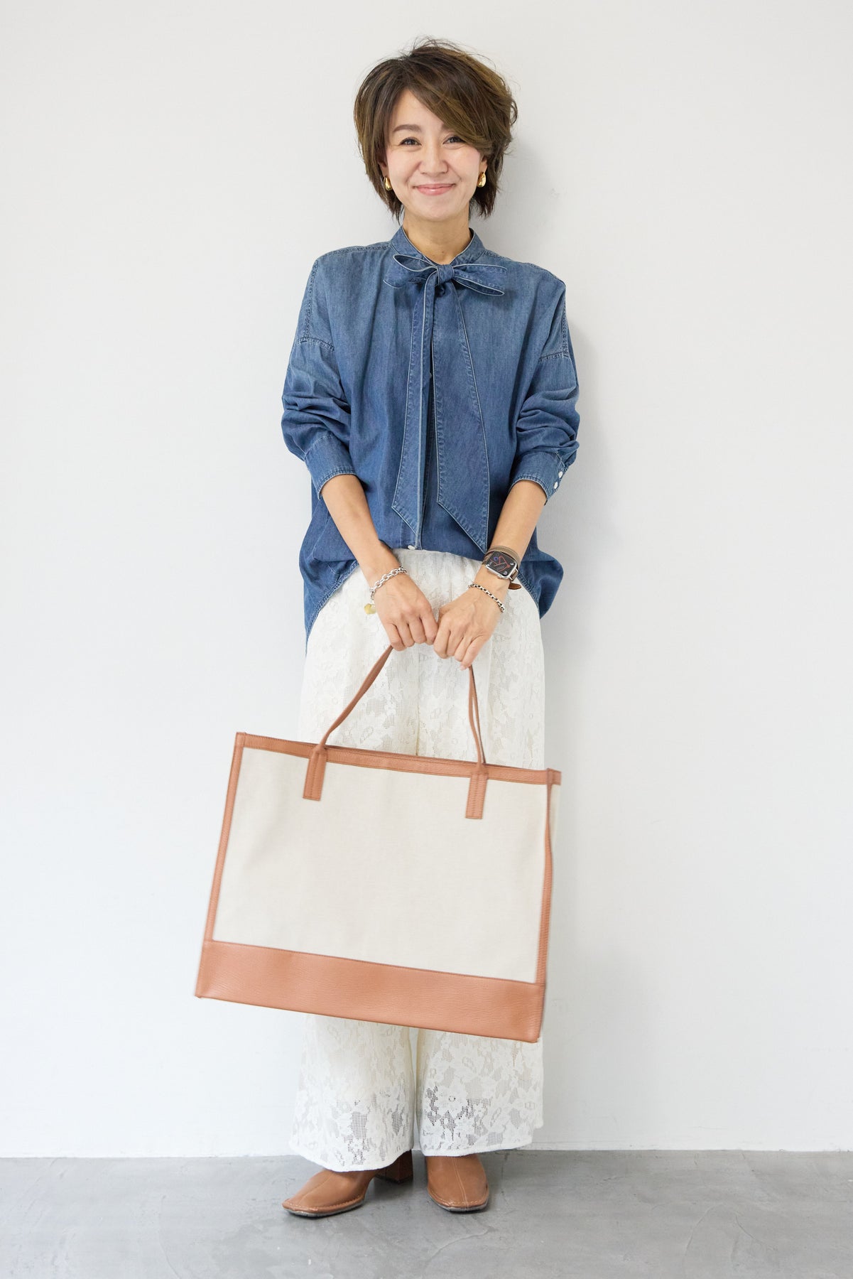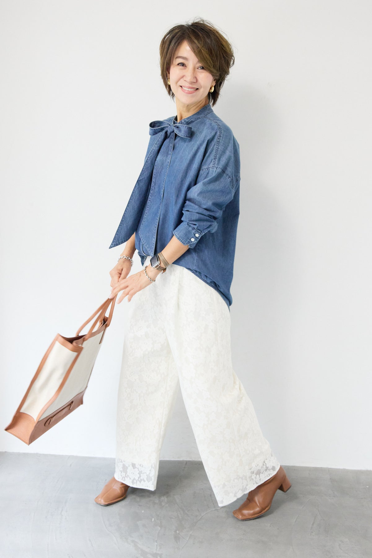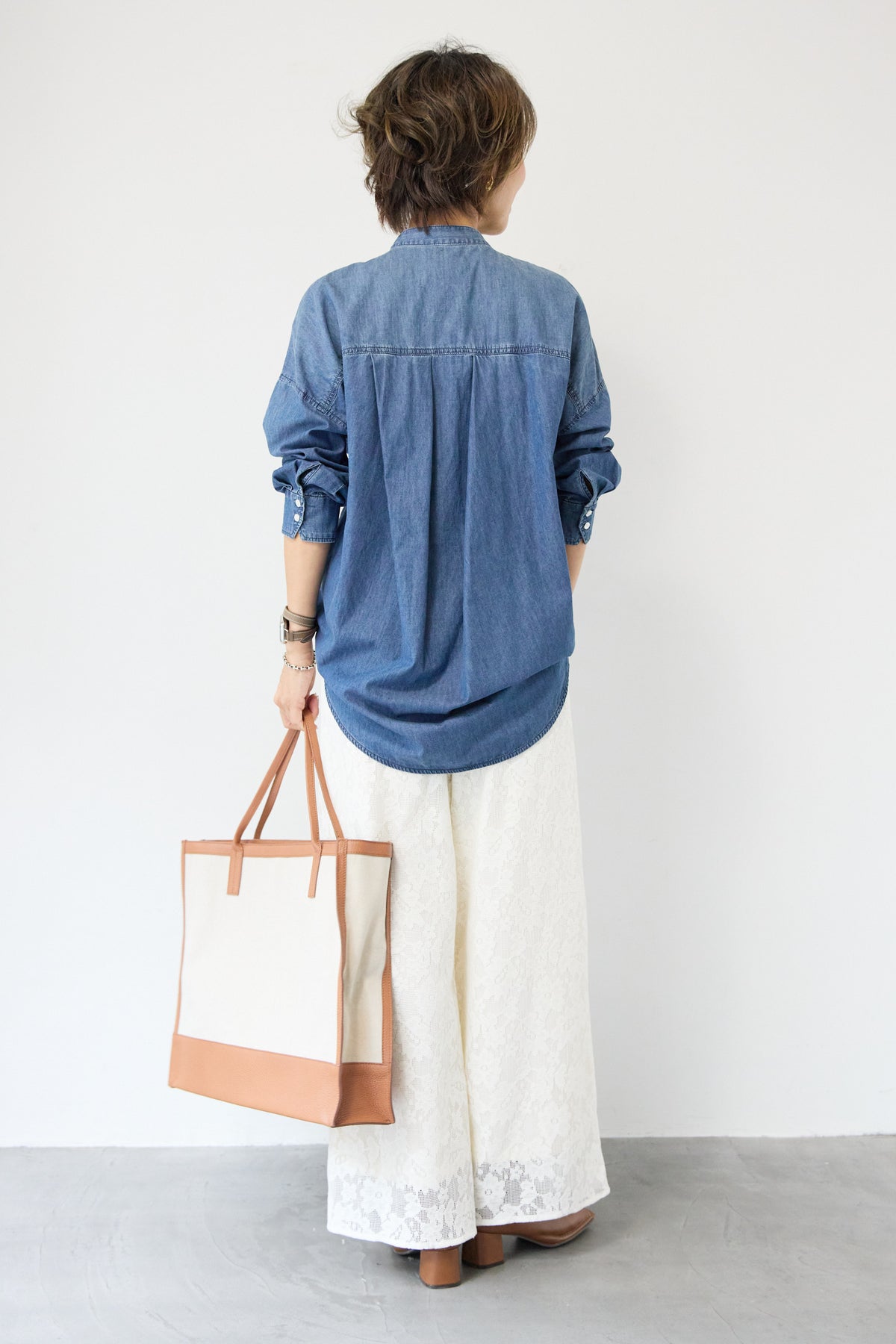 繊細なフラワーレースが上品な存在感を放つワイドパンツ。全面に施された花柄のエンブロイダリーが、コーディネートにやさしい華やかさを添えます。シルエットは程よくゆとりのあるワイドタイプで、脚のラインを拾いにくく、リラックス感のある履き心地。ウエストは総ゴム仕様のため、締め付け感が少なくデイリーに着用しやすいのもポイントです。裾にかけてレースの透け感が楽しめ、重くなりがちなワイドパンツスタイルも軽やかな印象に。シンプルなニットやカットソーと合わせるだけで、季節感のある大人フェミニンなスタイリングが完成します。