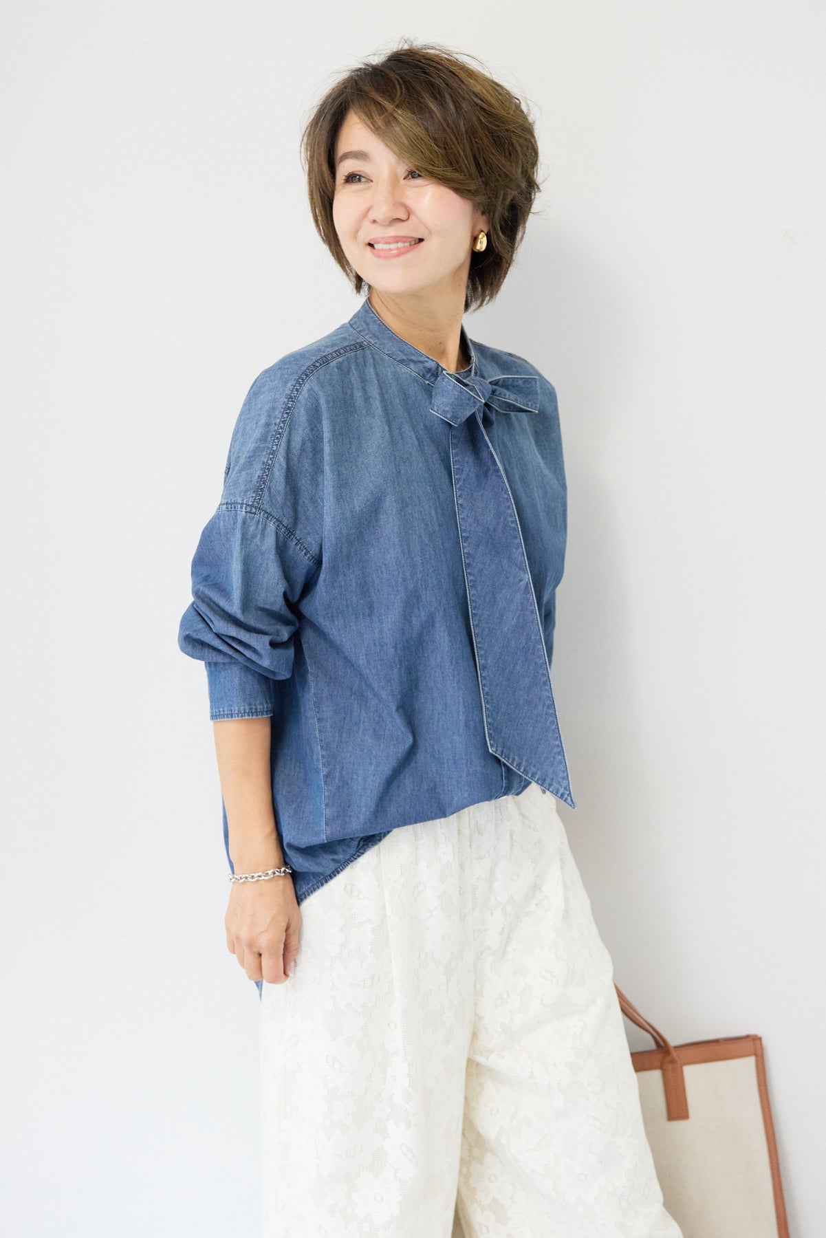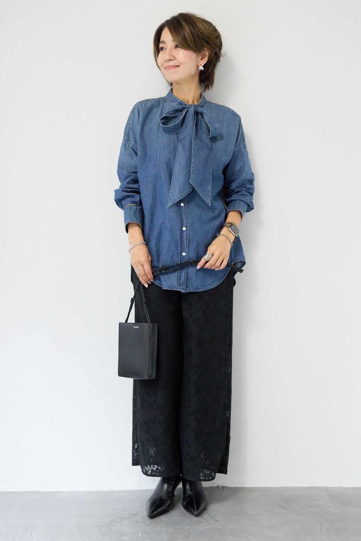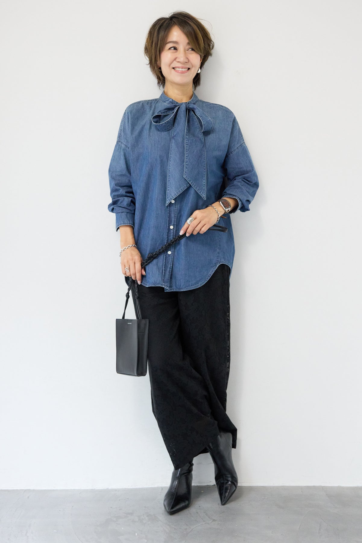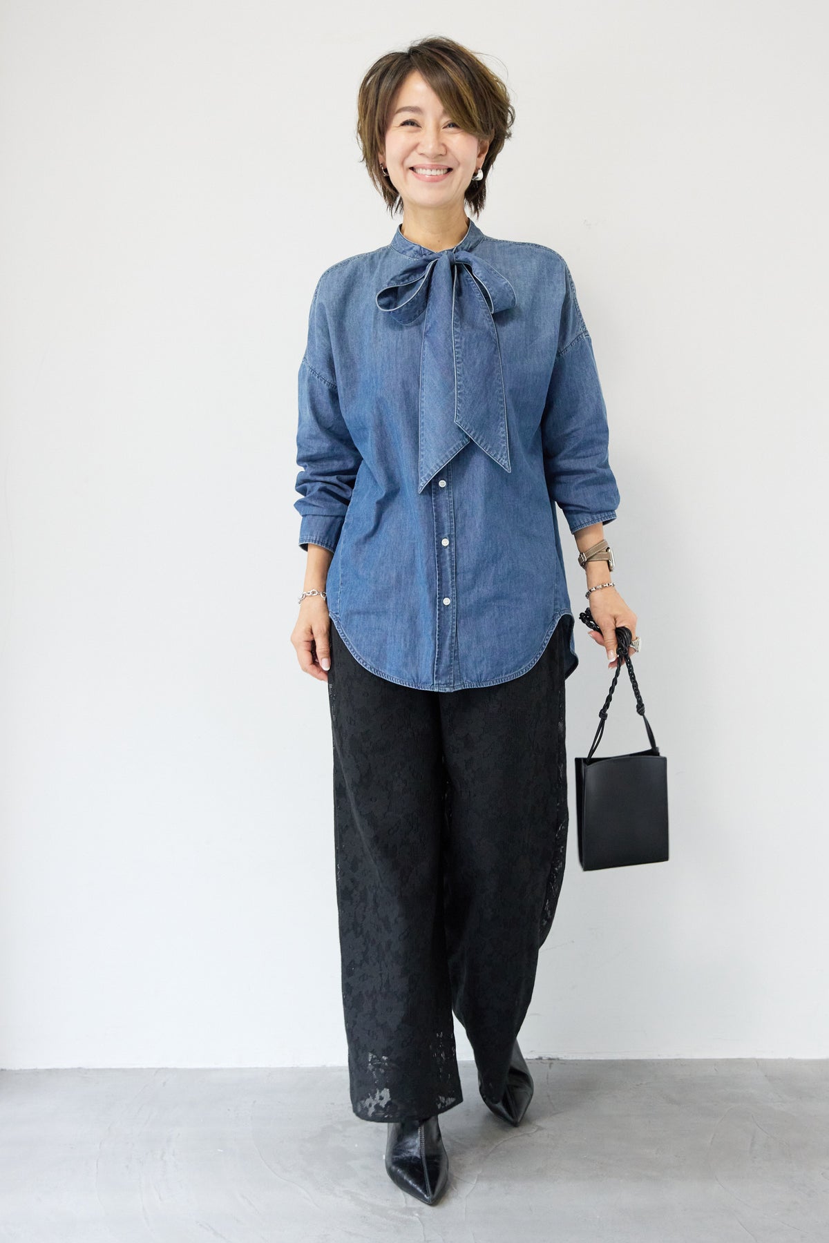 ボウタイデニムシャツ/フラワーエンブロイダリーワイドパンツ